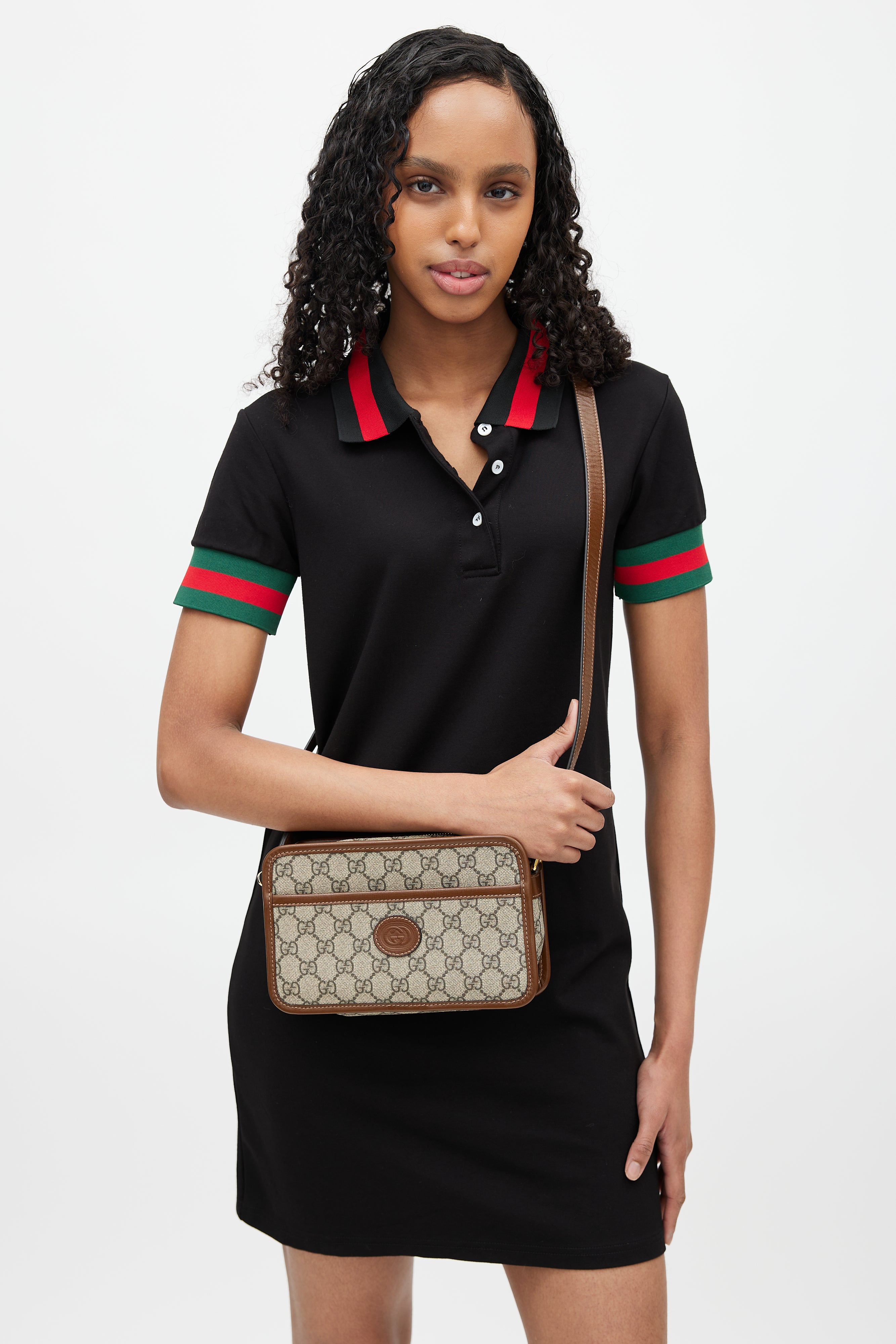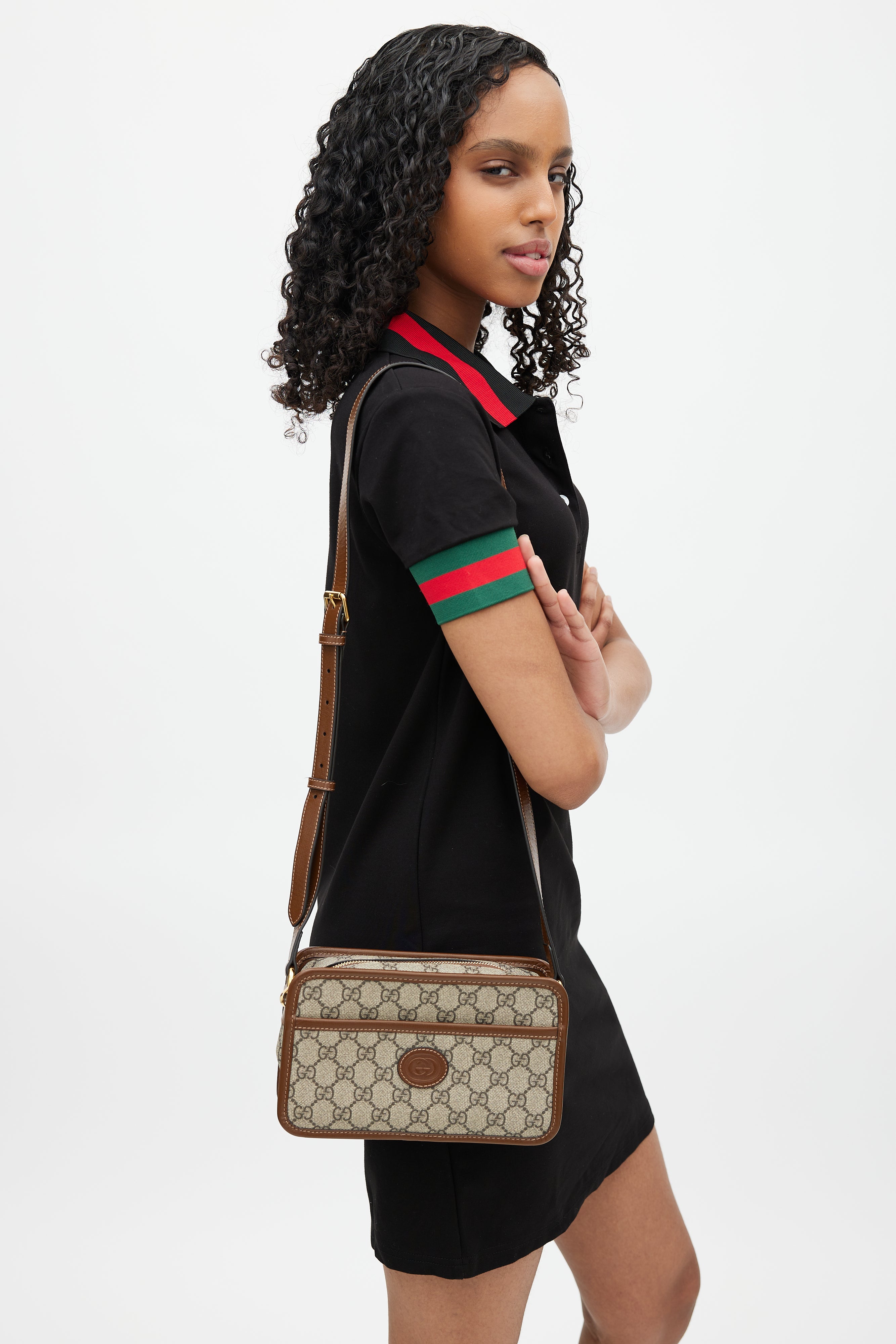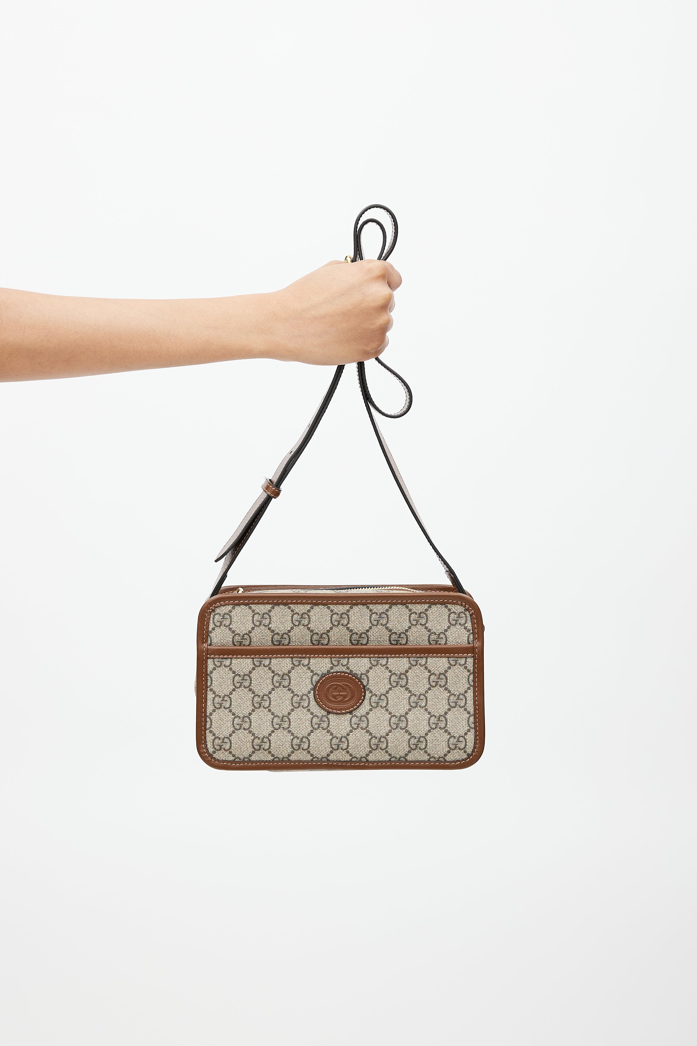 Pre-owned Gucci brown mini bag in GG Supreme monogram coated canvas featuring GG logo patch at front, leather trim, one main compartment with one slip pocket, adjustable shoulder strap, and top zip closure. Comes with original dust bag.