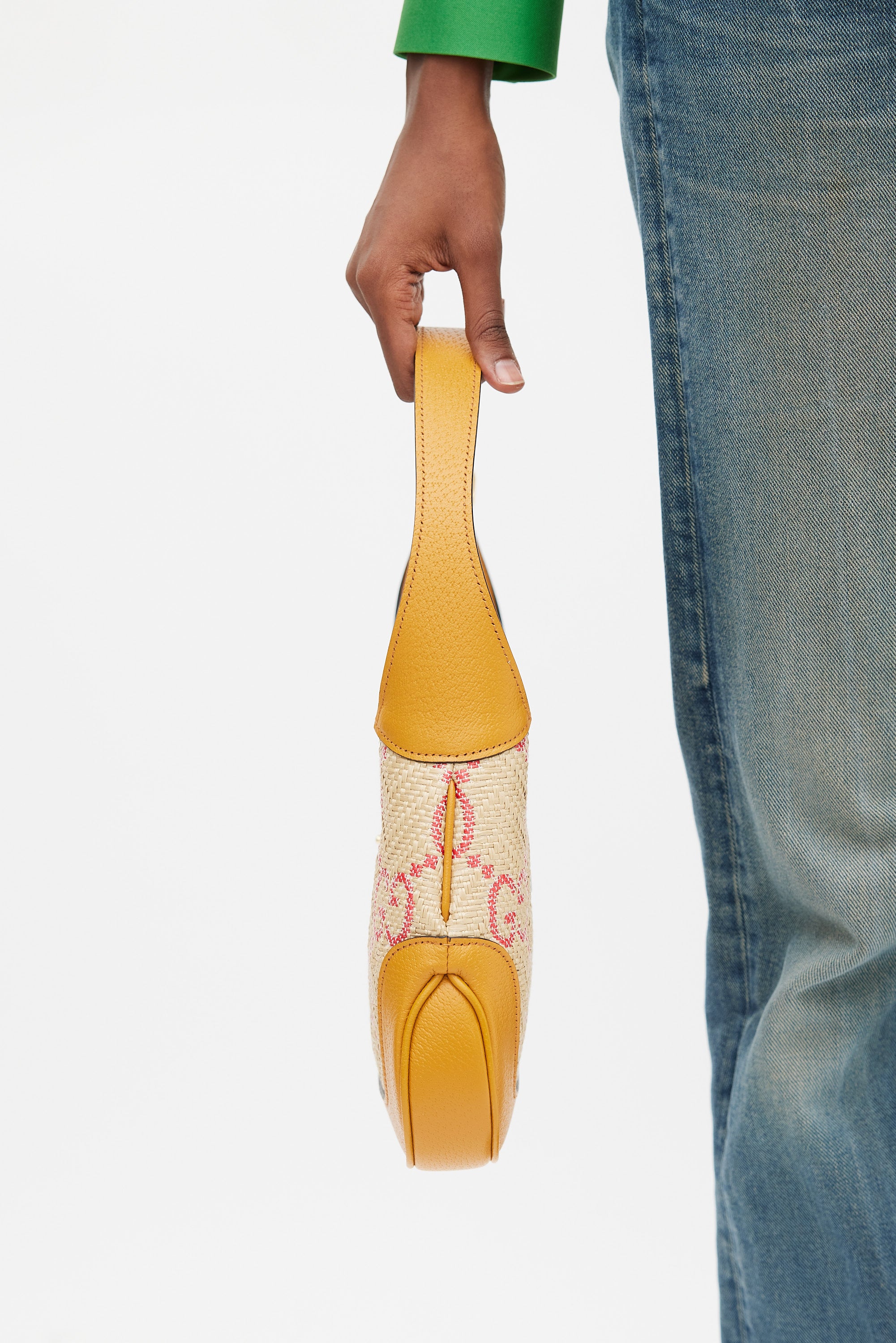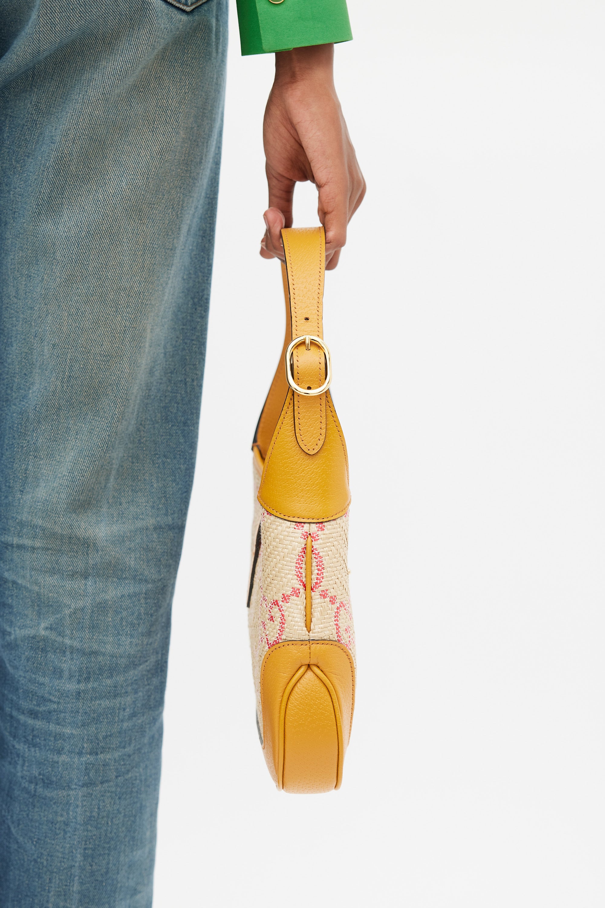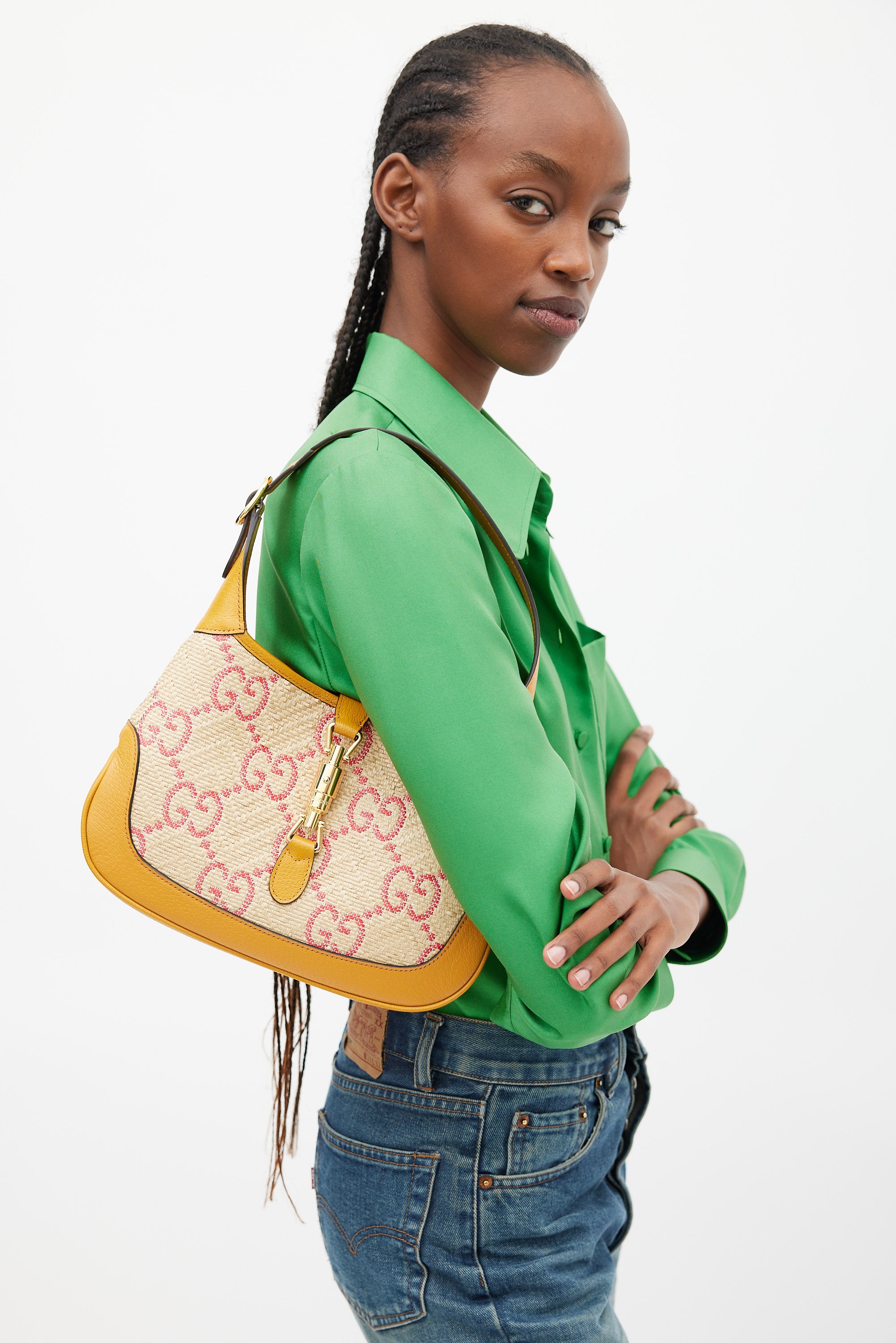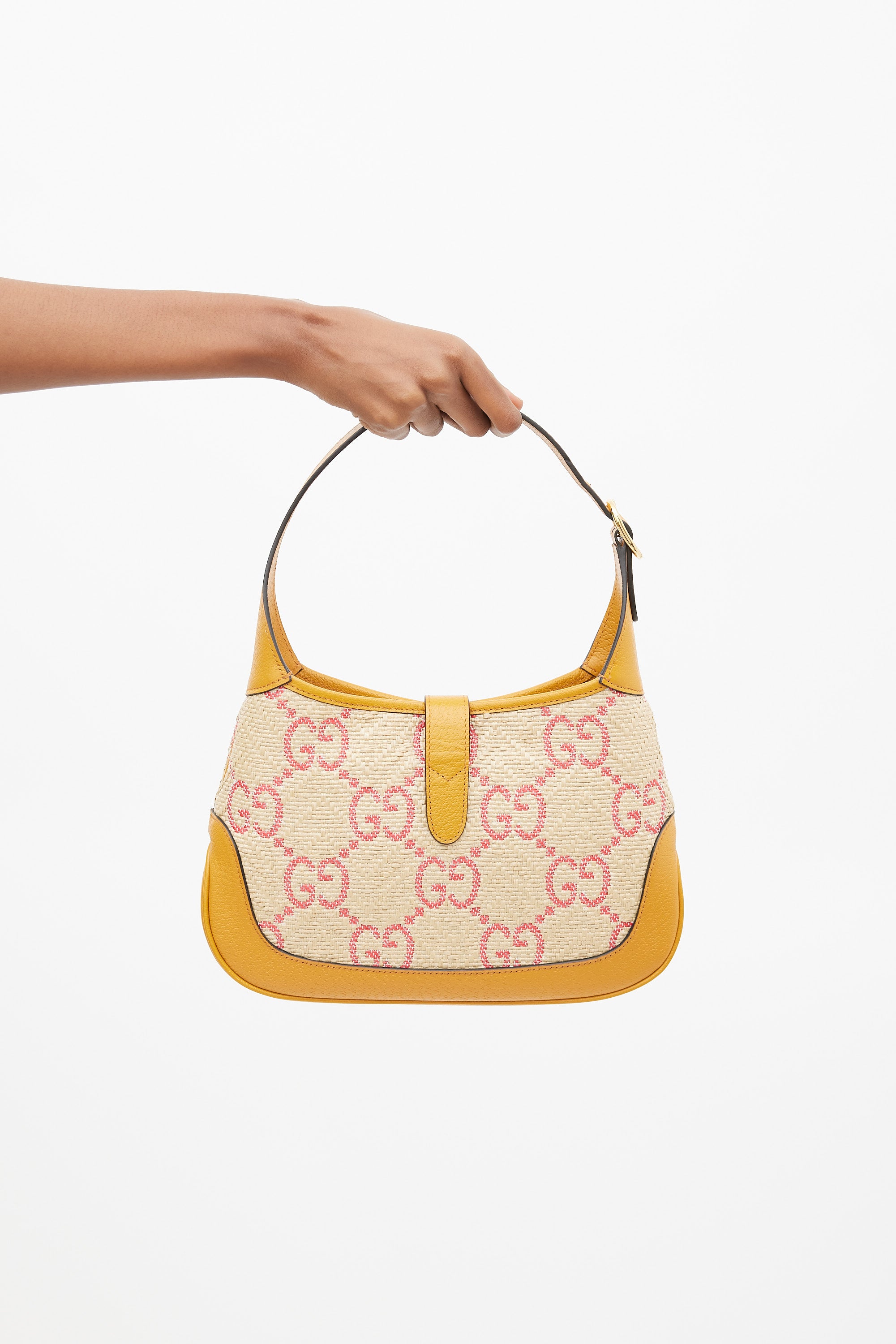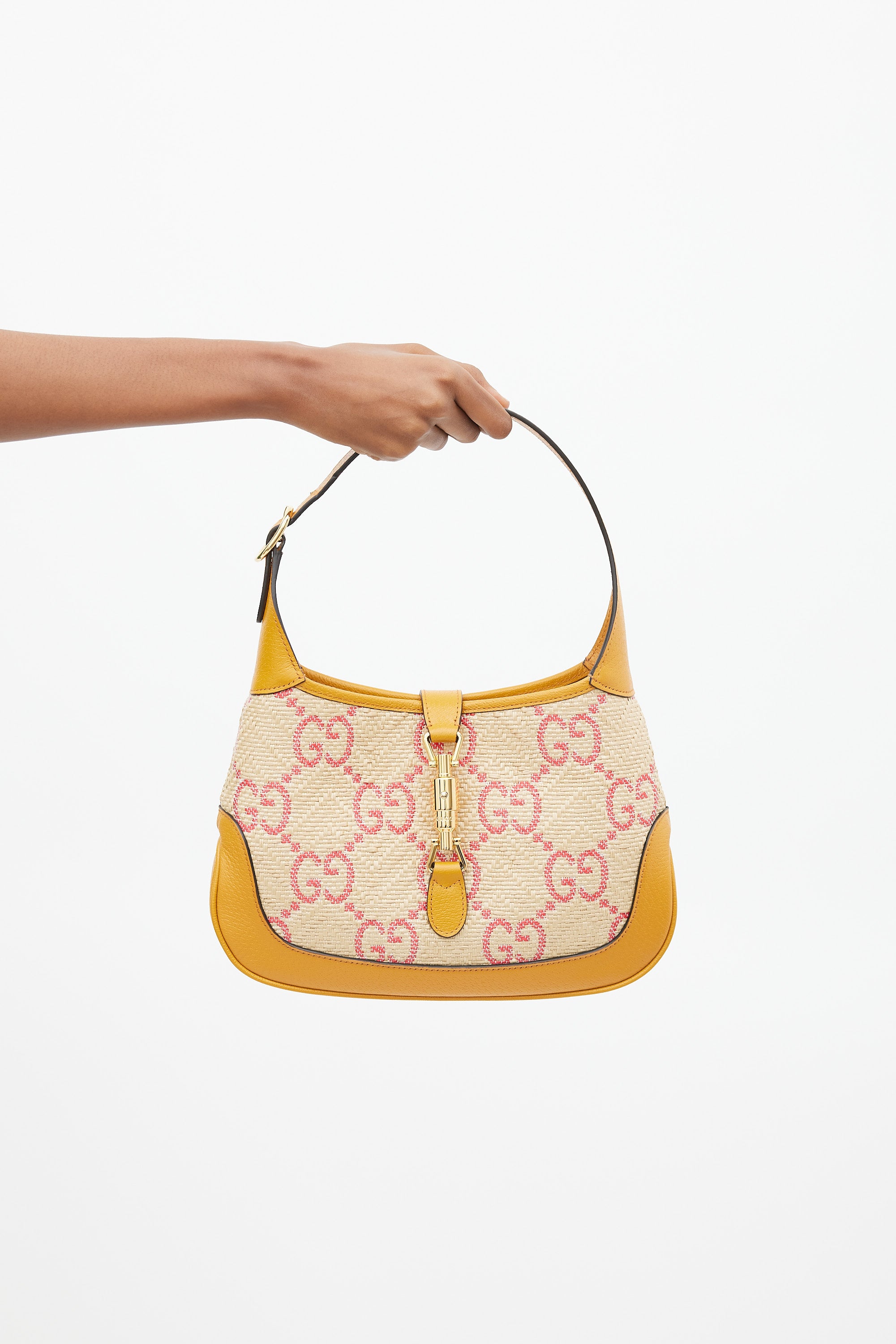 Pre-owned Gucci small Jackie 1961 bag featuring a woven raffia body with pink GG monogram throughout, brown leather panelling, gold tone hardware, single flat adjustable top handle with detachable extender, strap across top with front push lock fastening, and one lined main compartment with single zip pocket. Comes with original dust bag.