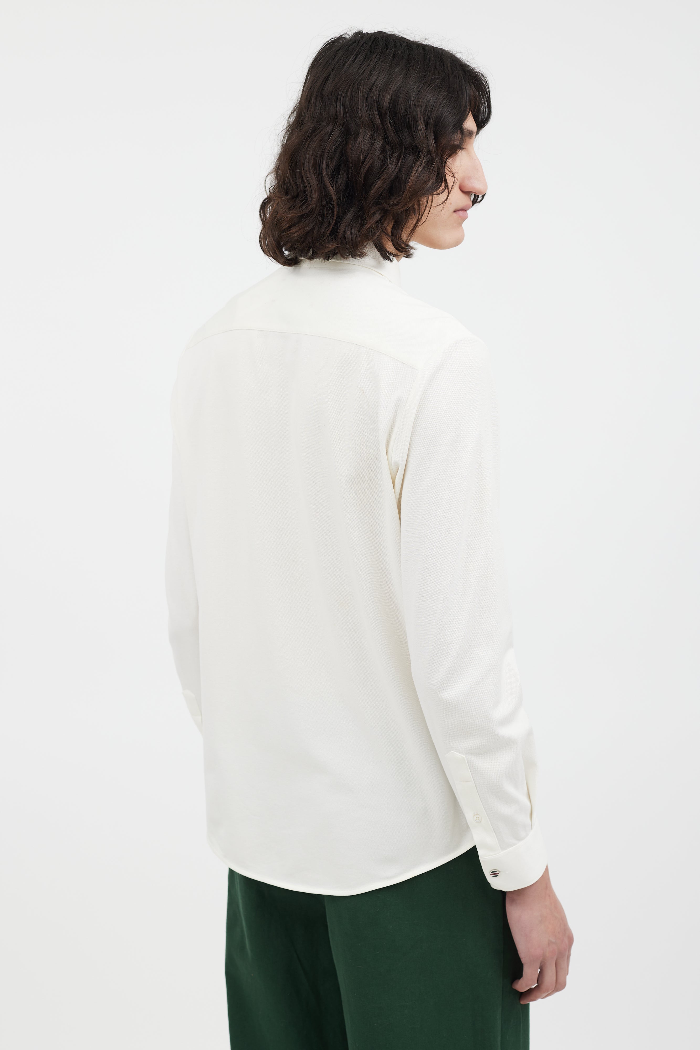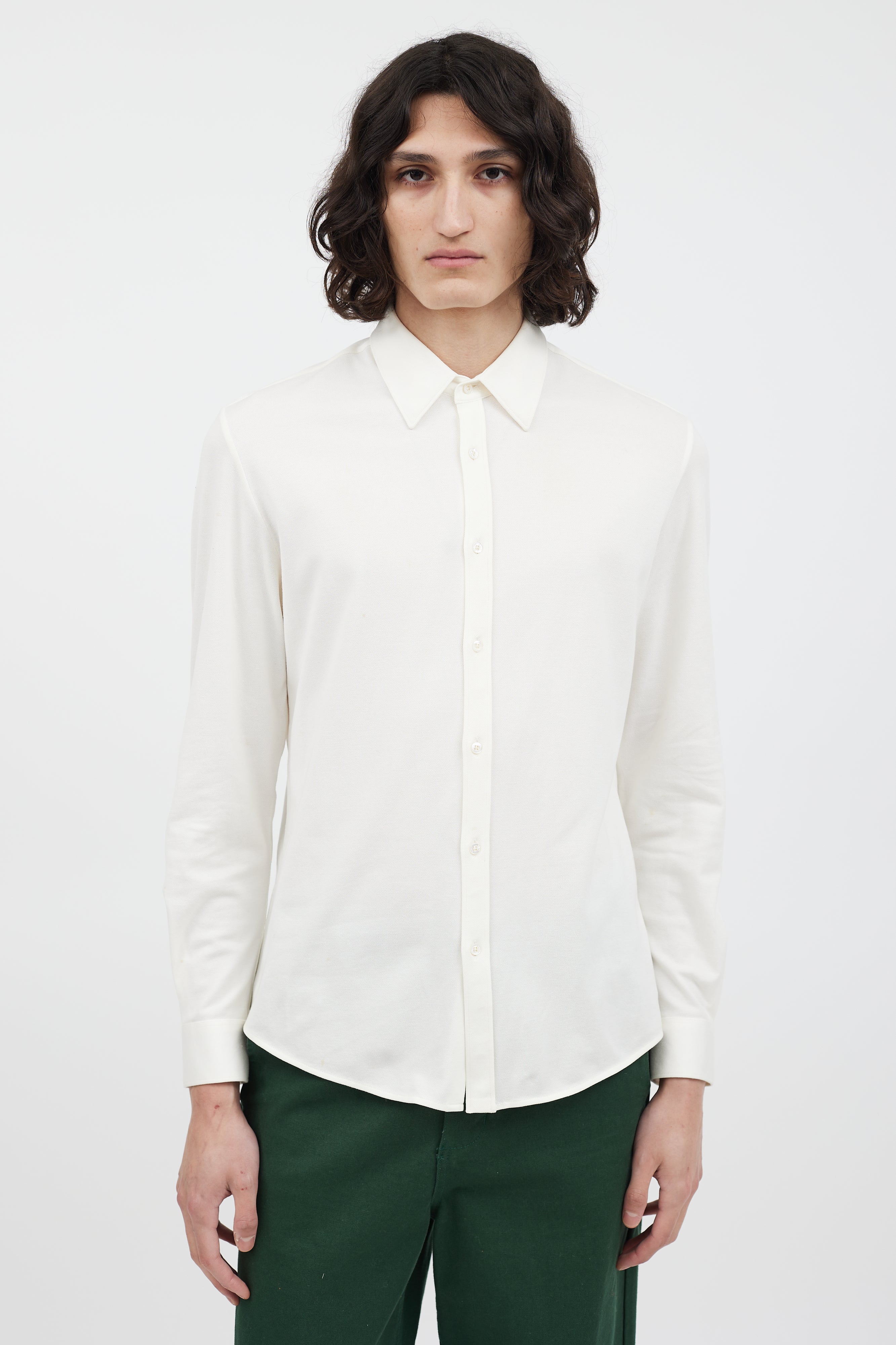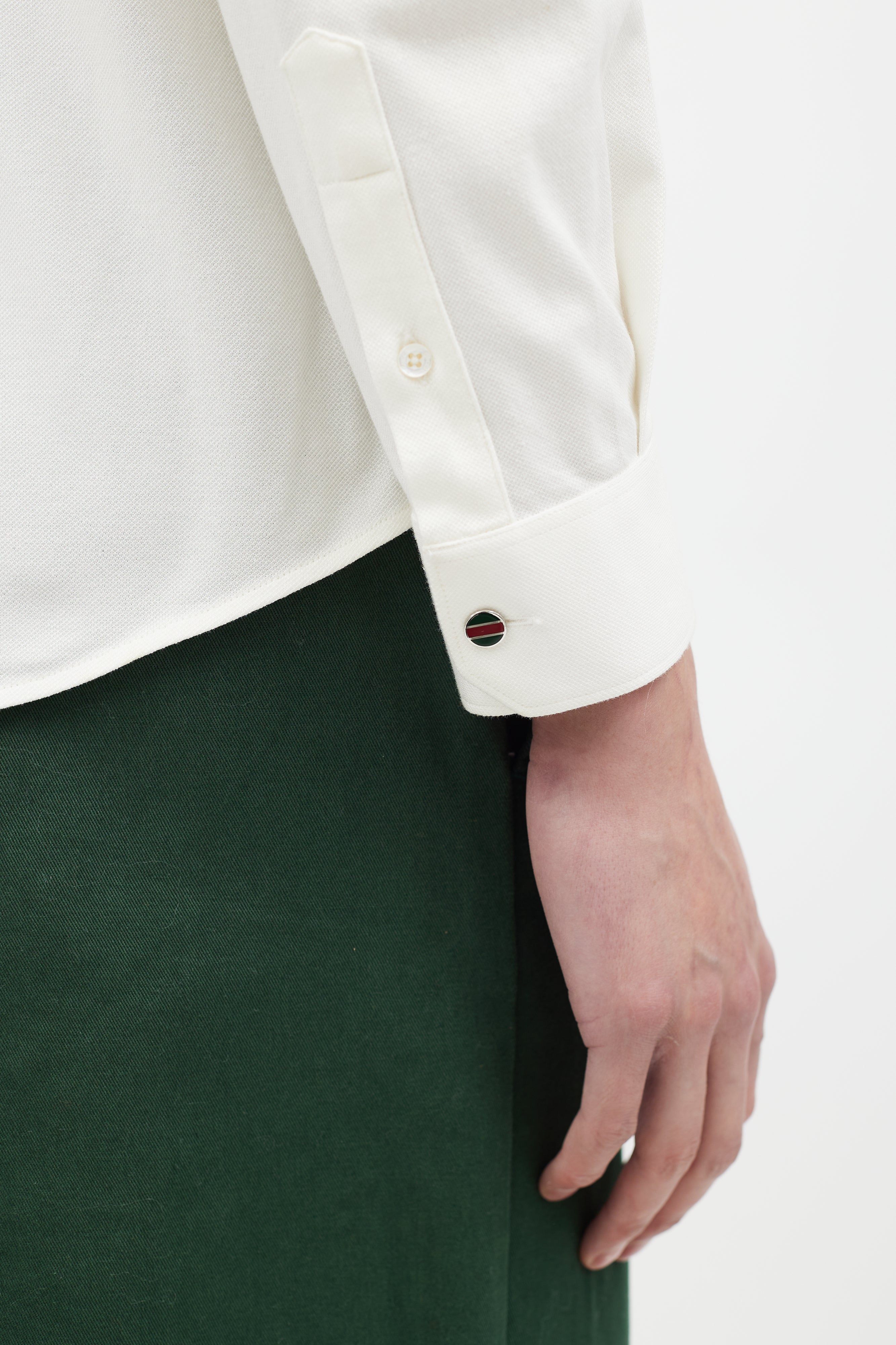 Pre-owned Gucci cream knit shirt featuring classic collar, button up front, and buttoned cuffs with green and red buttons.