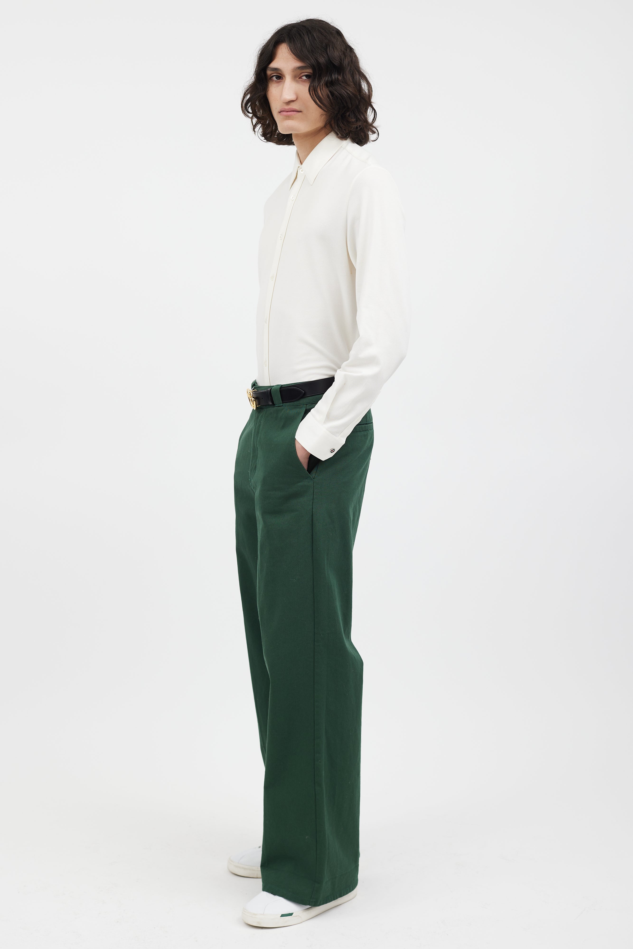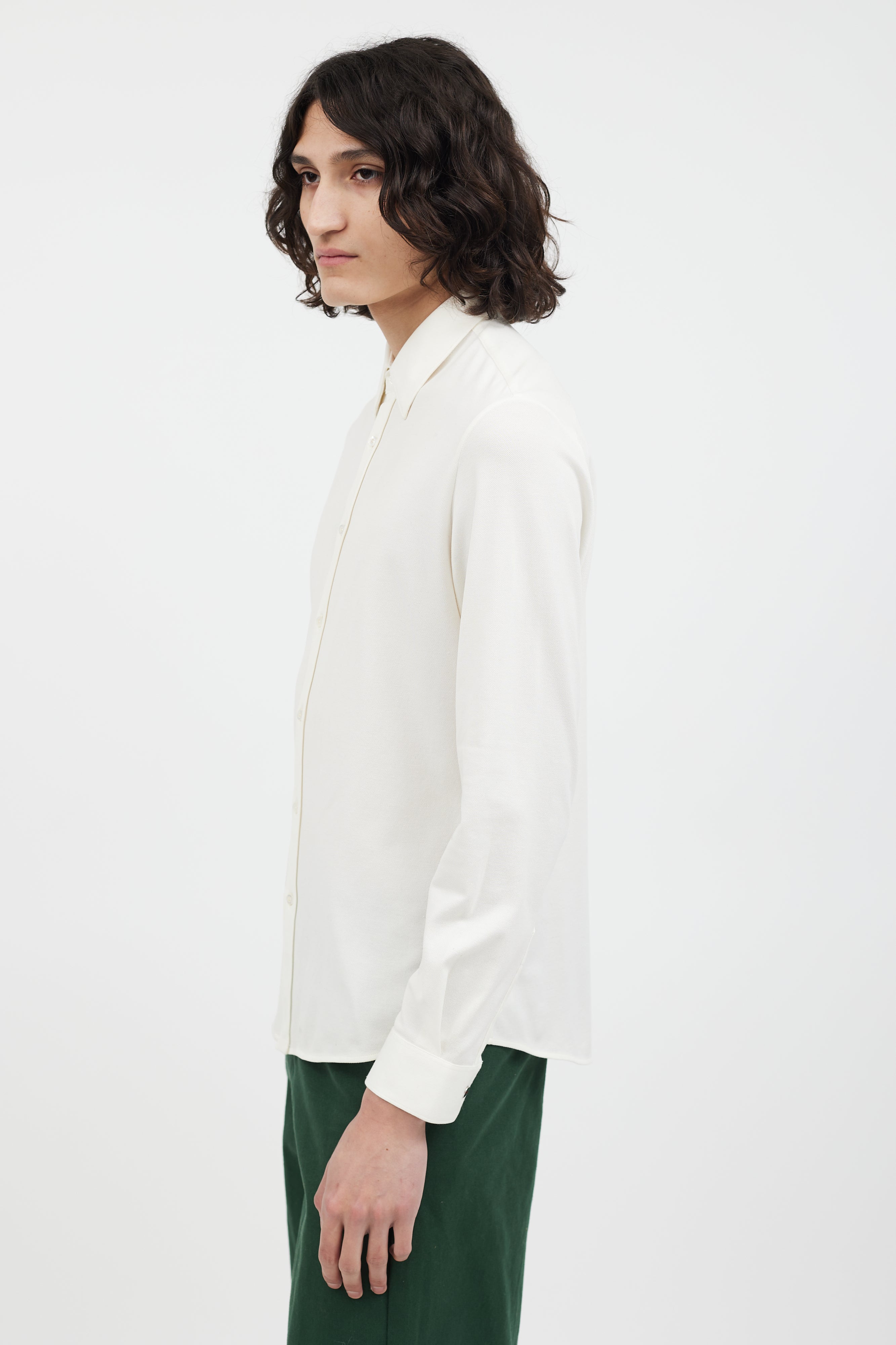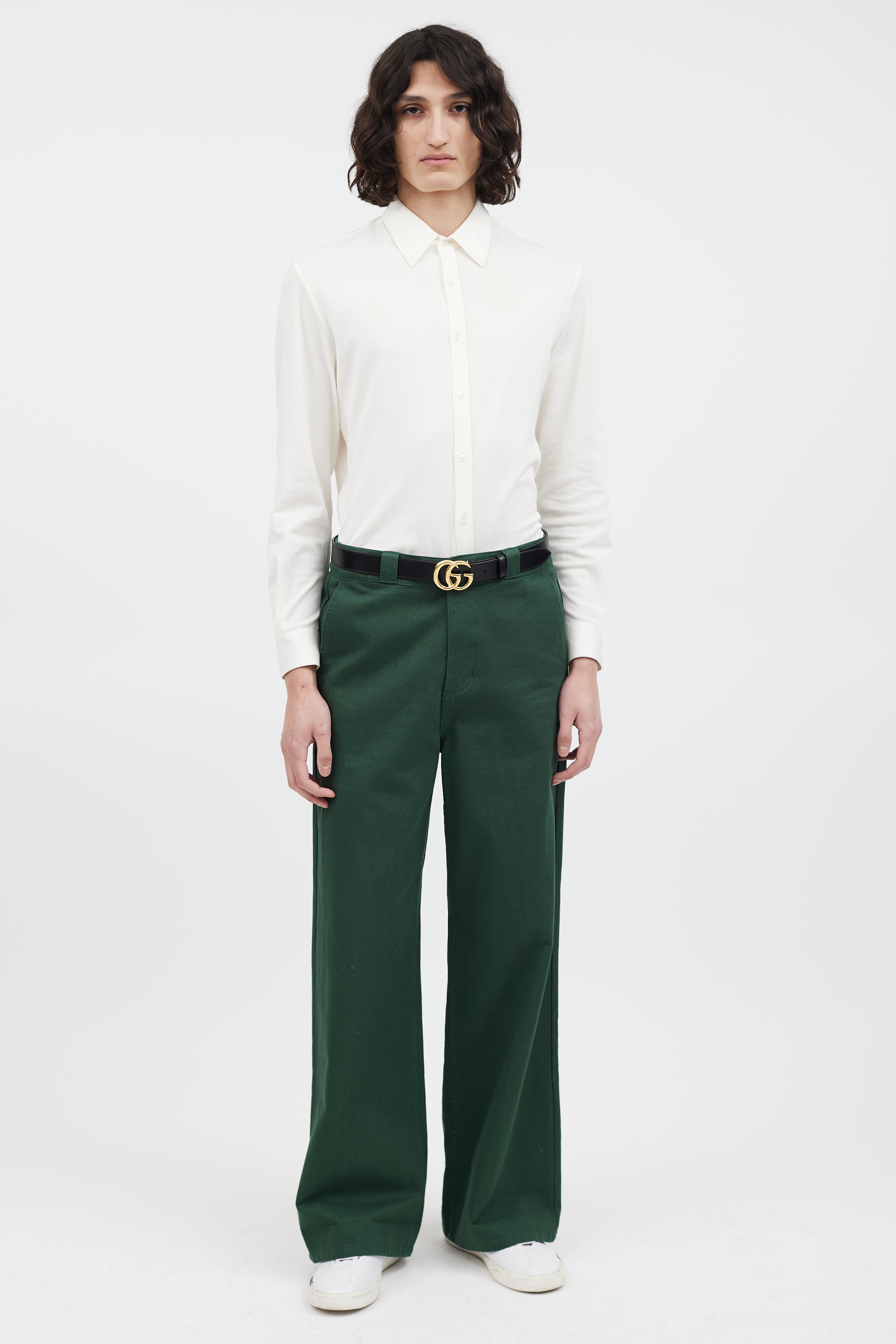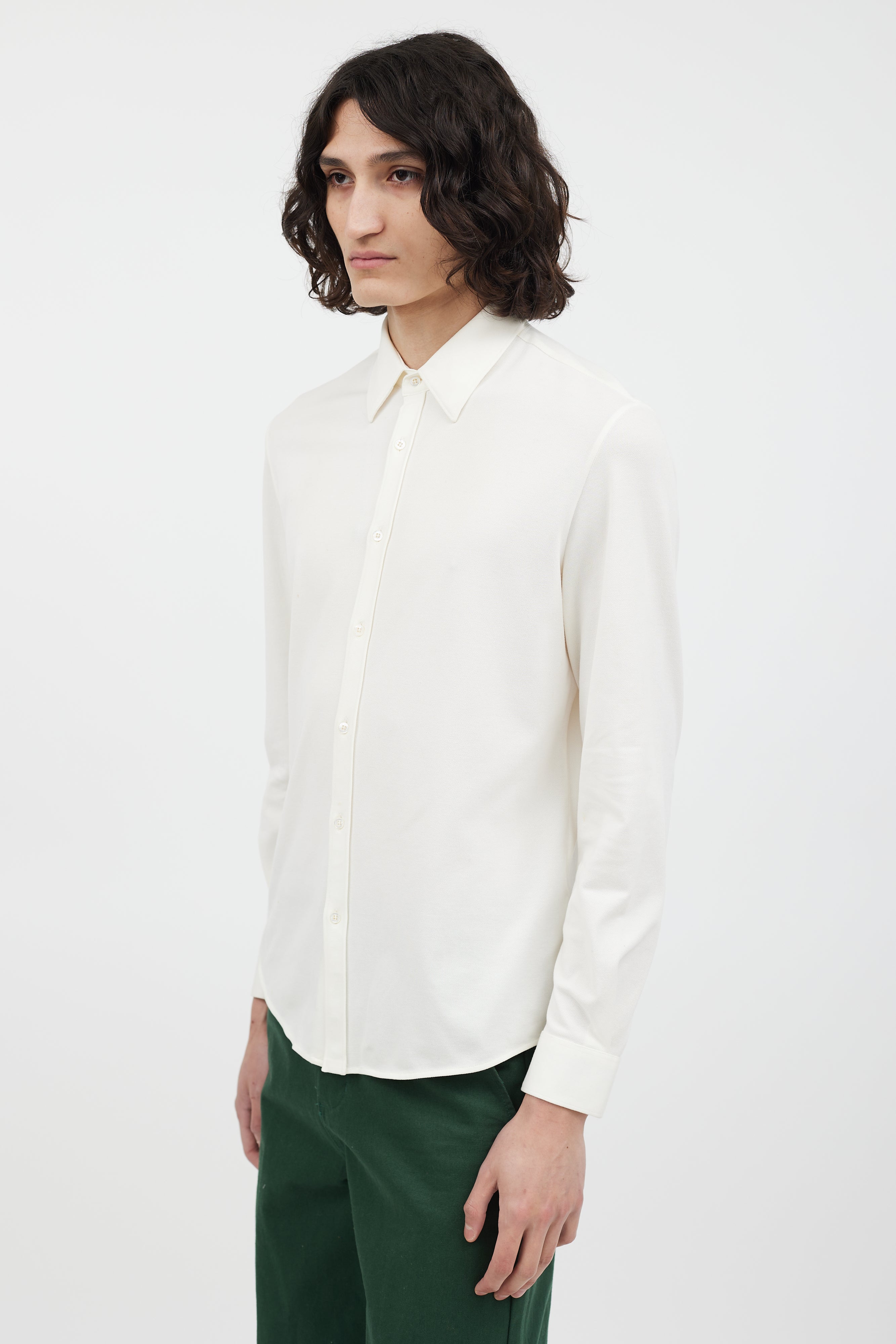 Pre-owned Gucci cream knit shirt featuring classic collar, button up front, and buttoned cuffs with green and red buttons.
