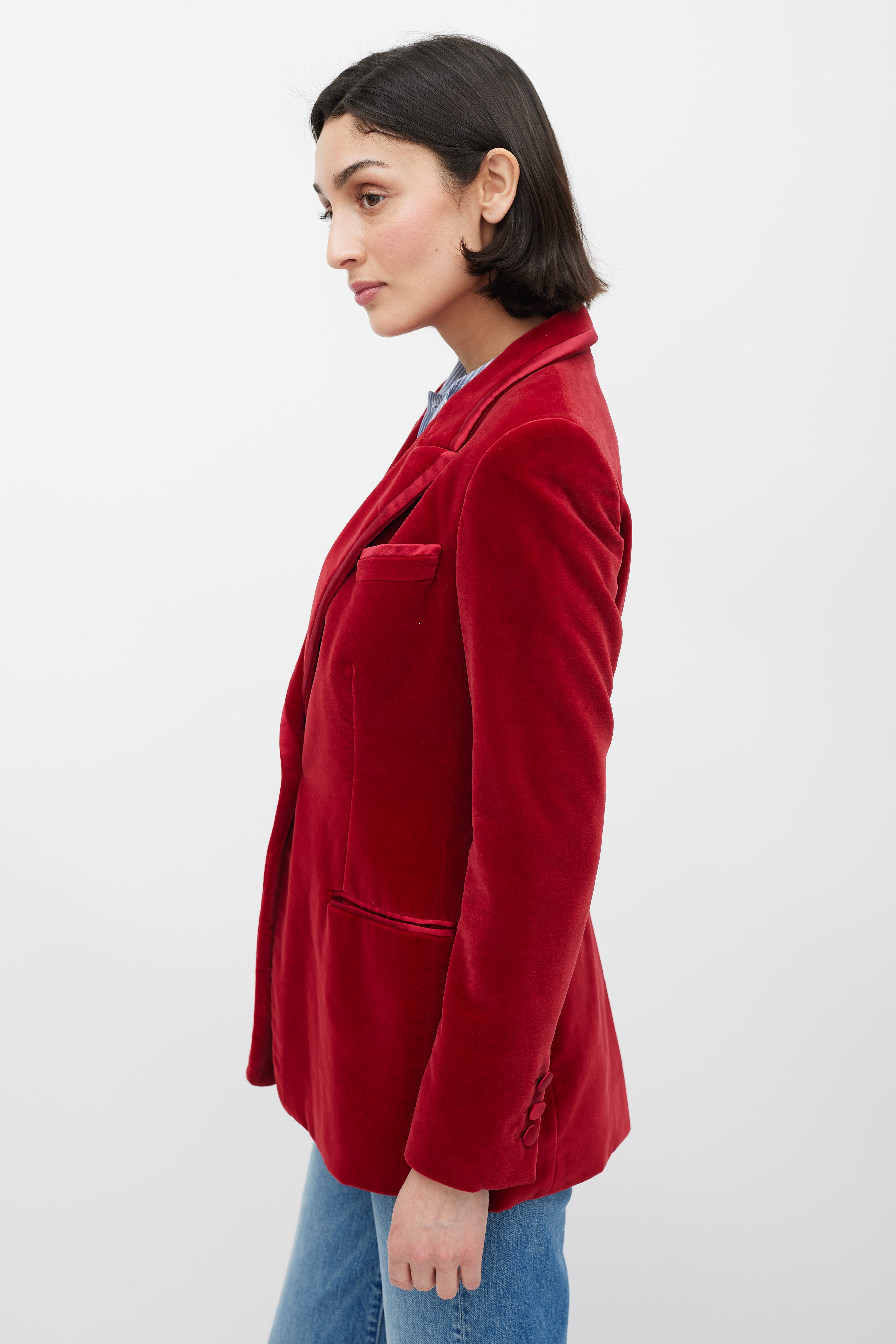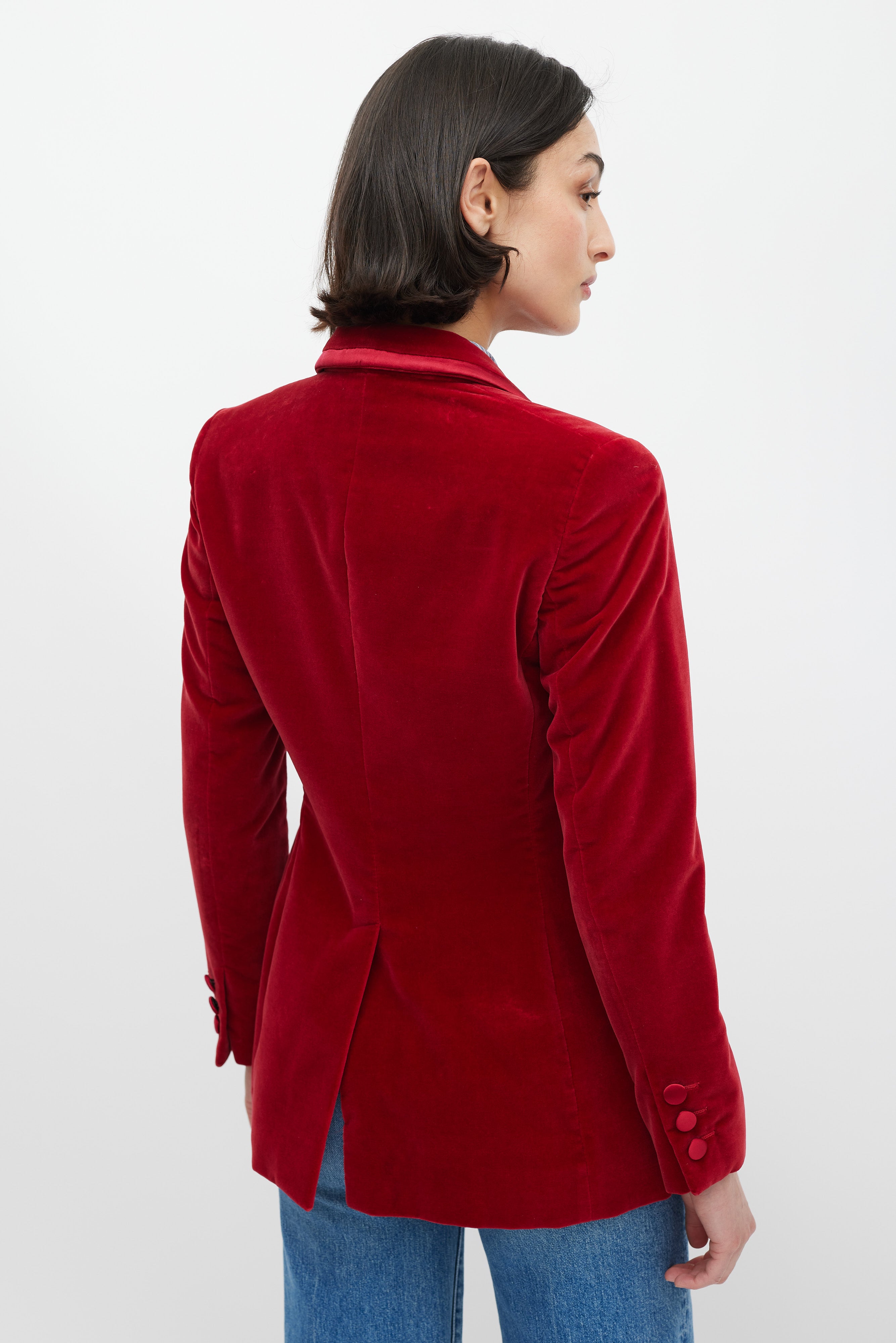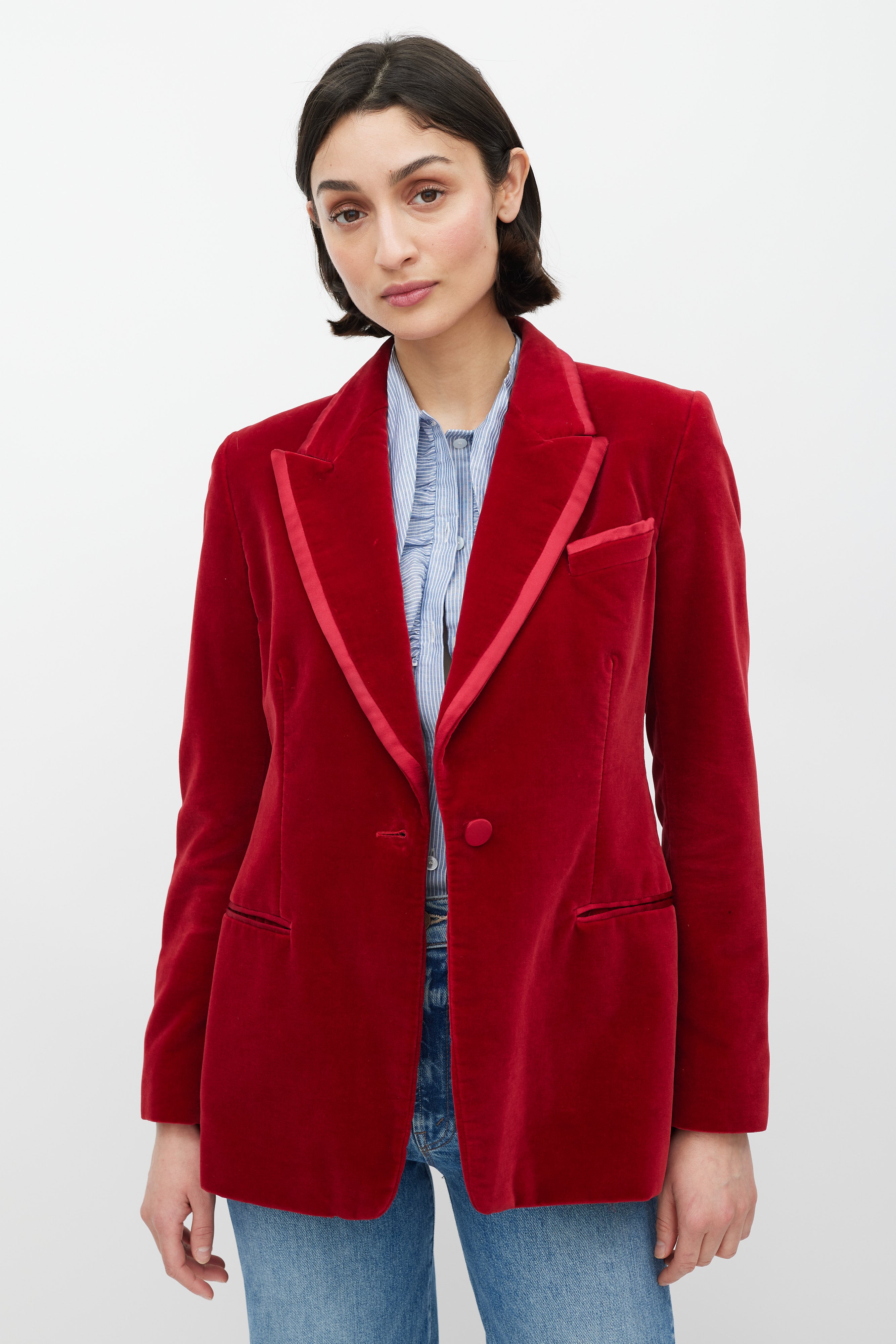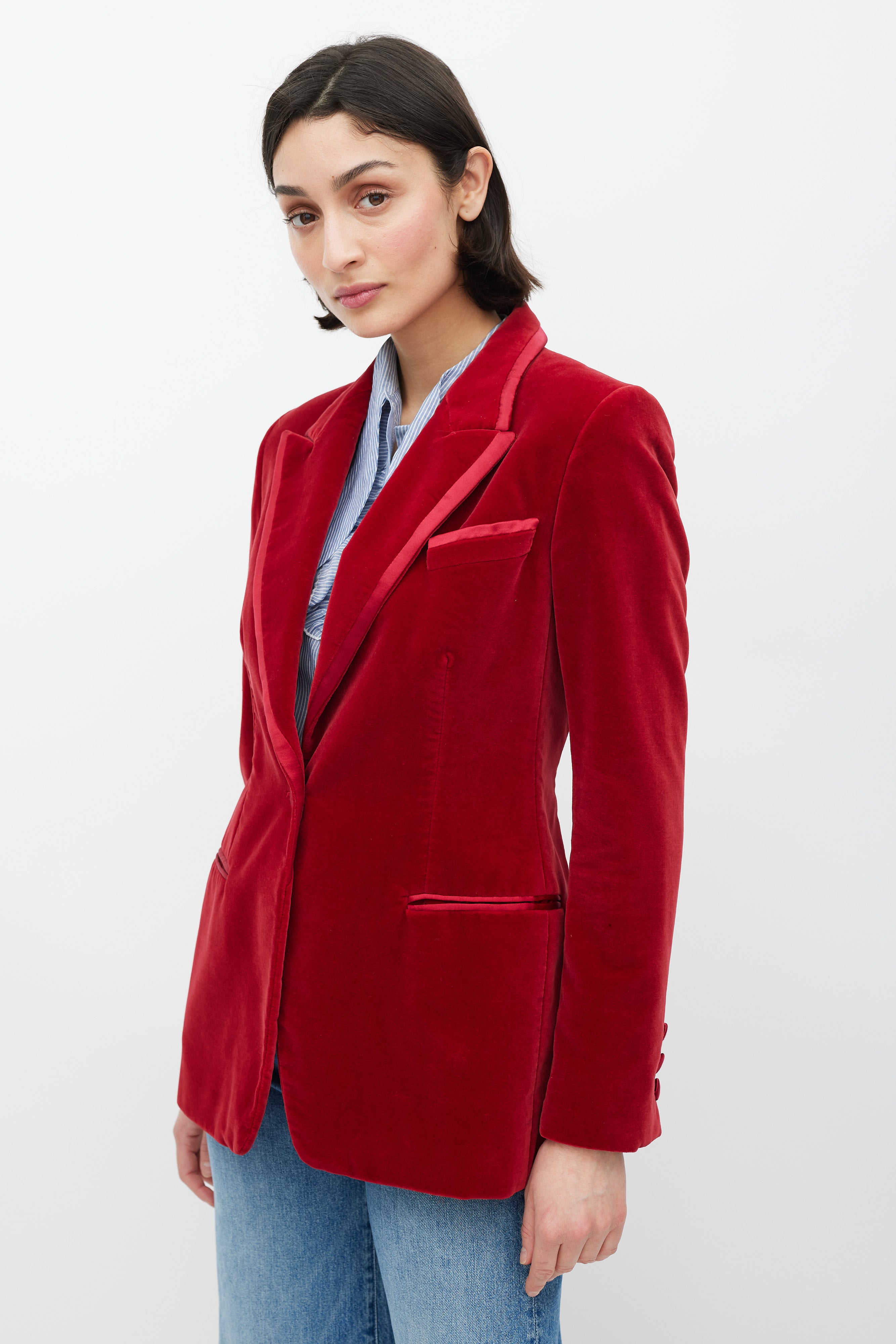 Pre-owned FW 1996 Gucci red velvet blazer featuring a peak lapel with contrast fabric trim, single front button closure, two welt pockets at waist, one slip pocket at left chest, long sleeves with buttoned cuffs, and a back vent. Lined. Tom Ford era design.
