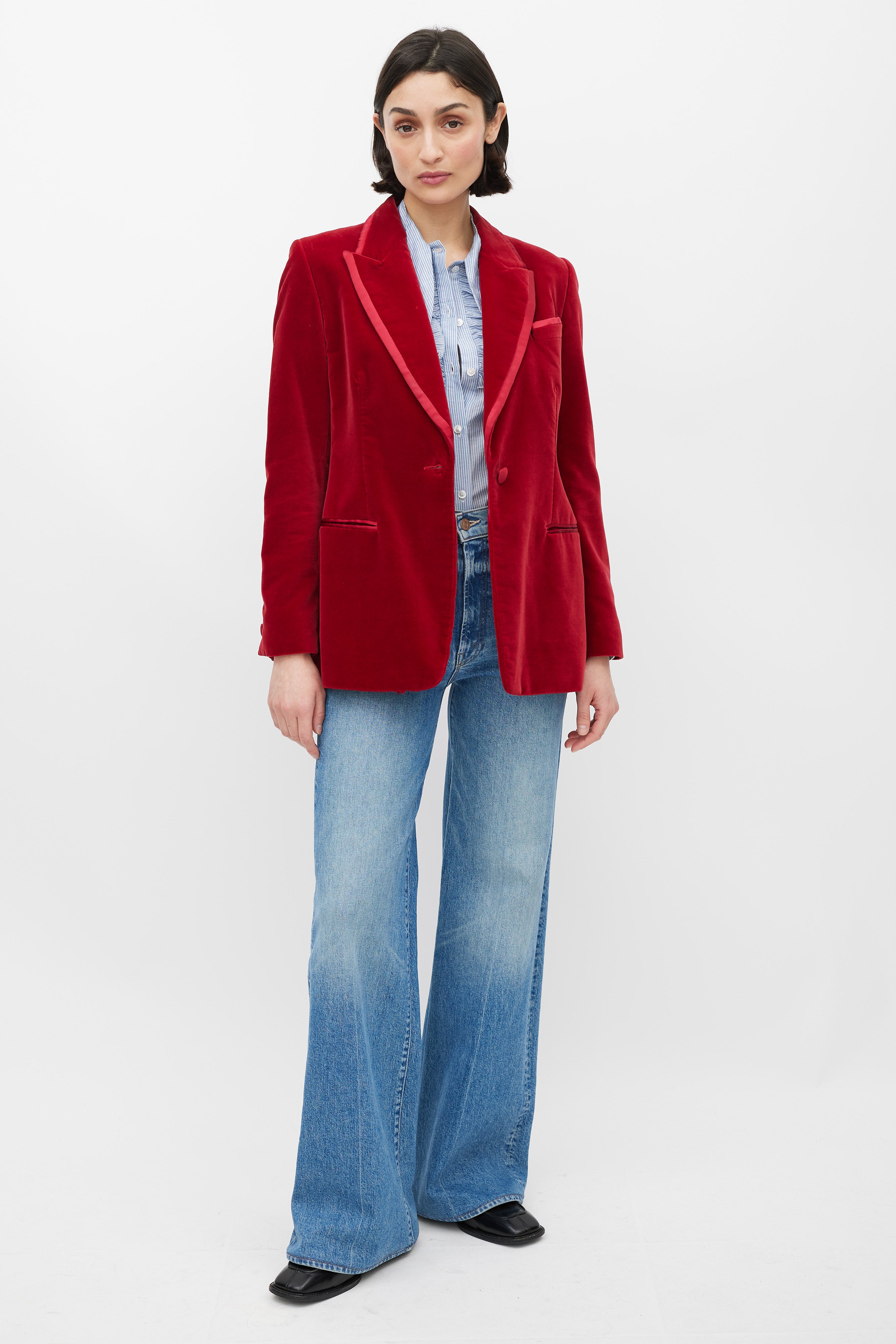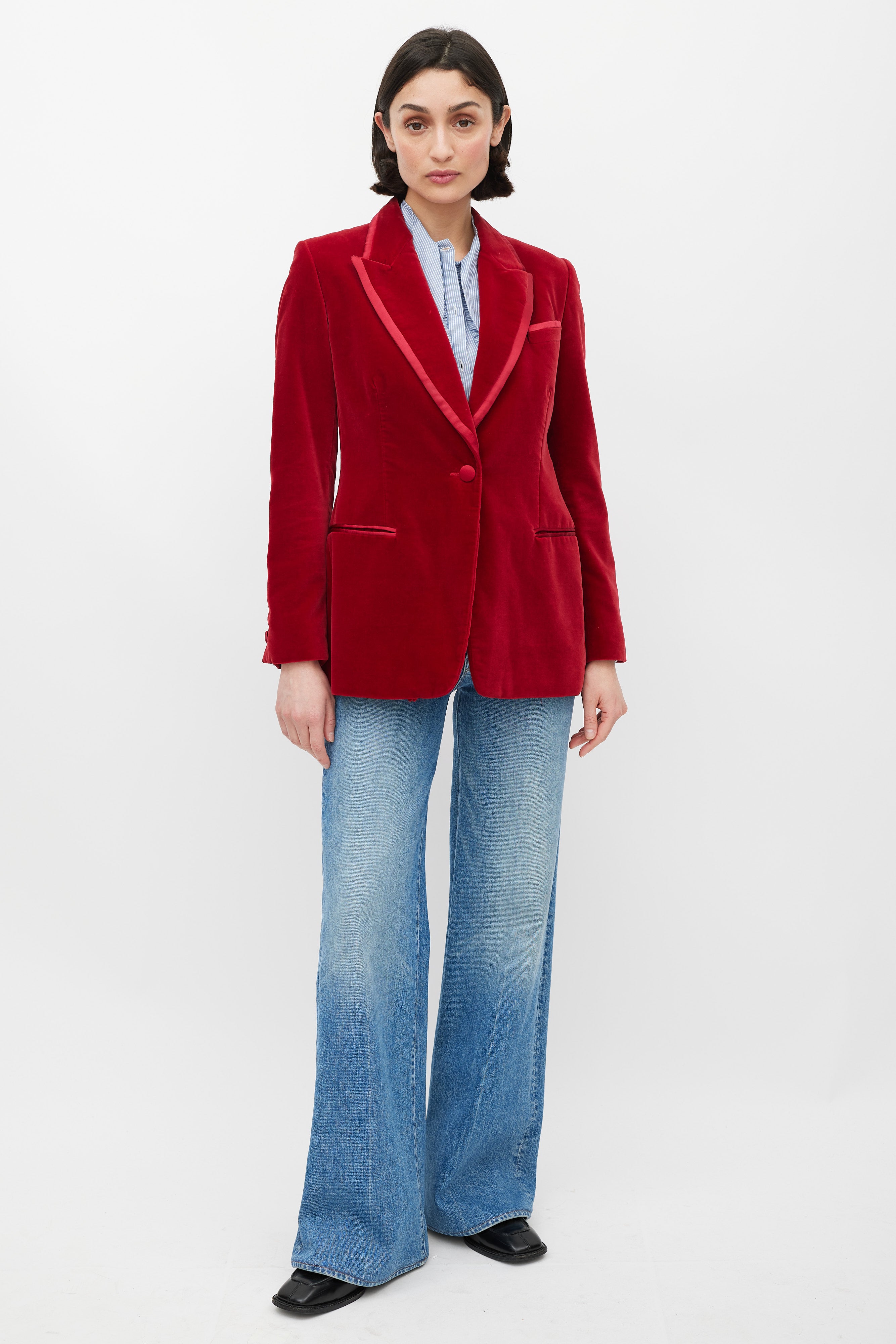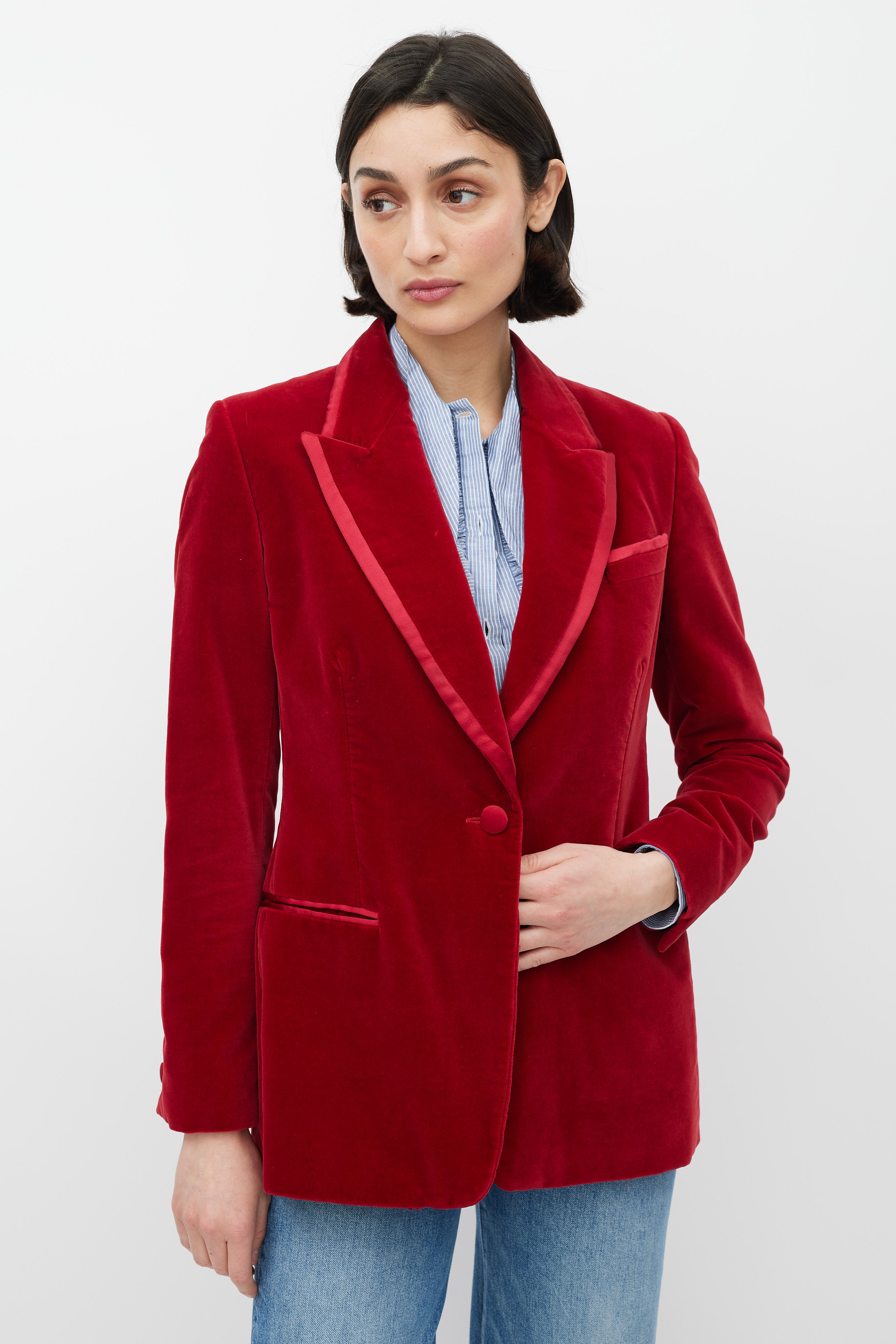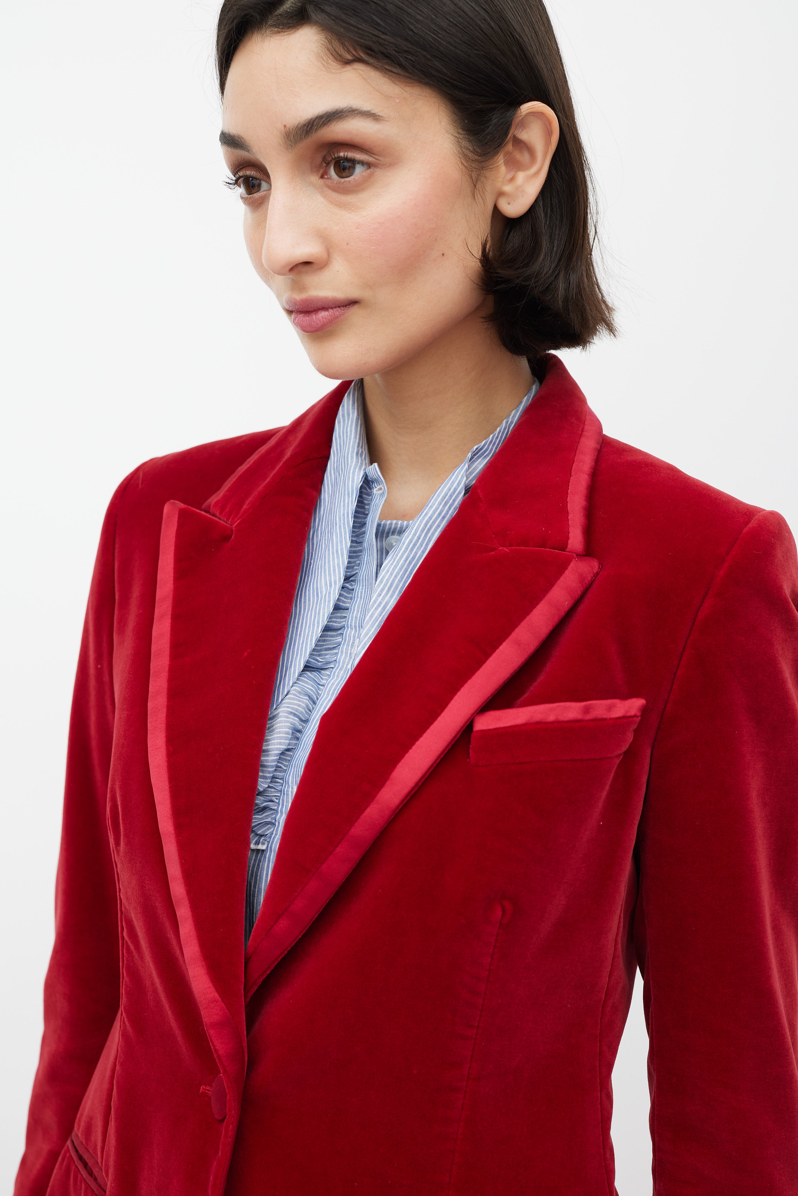 Pre-owned FW 1996 Gucci red velvet blazer featuring a peak lapel with contrast fabric trim, single front button closure, two welt pockets at waist, one slip pocket at left chest, long sleeves with buttoned cuffs, and a back vent. Lined. Tom Ford era design.