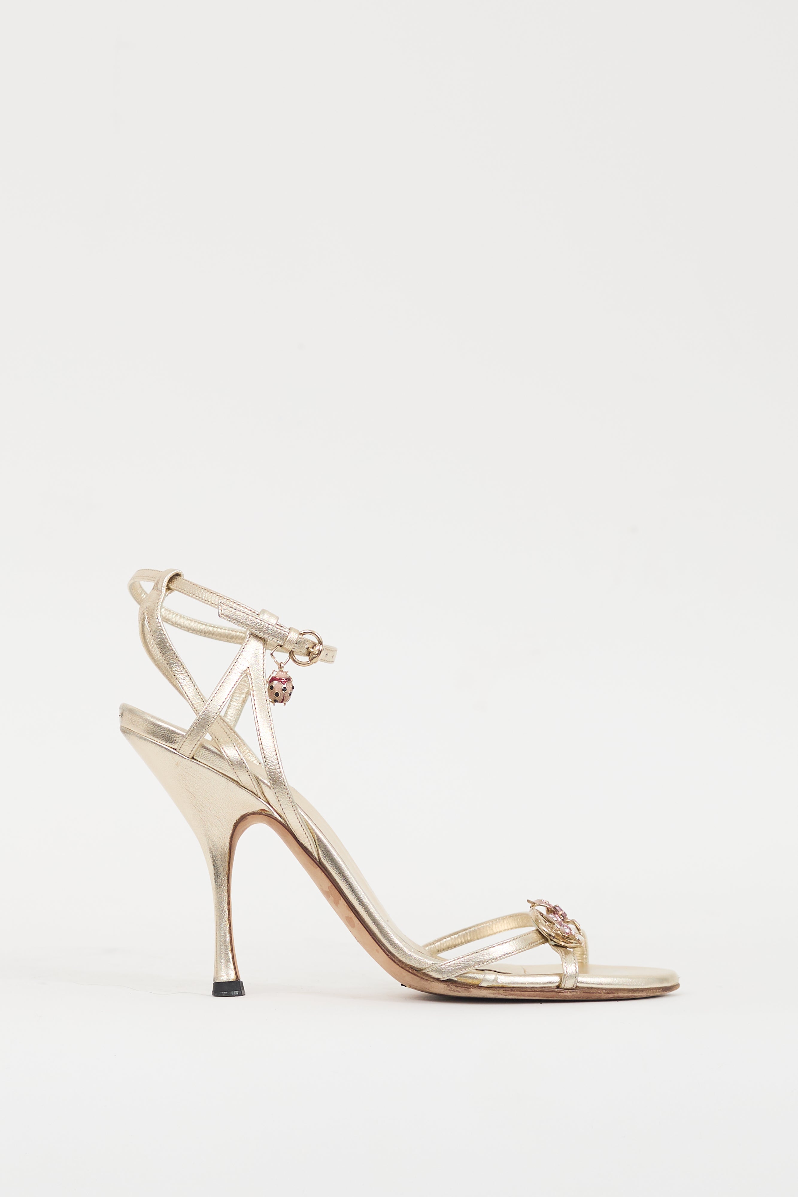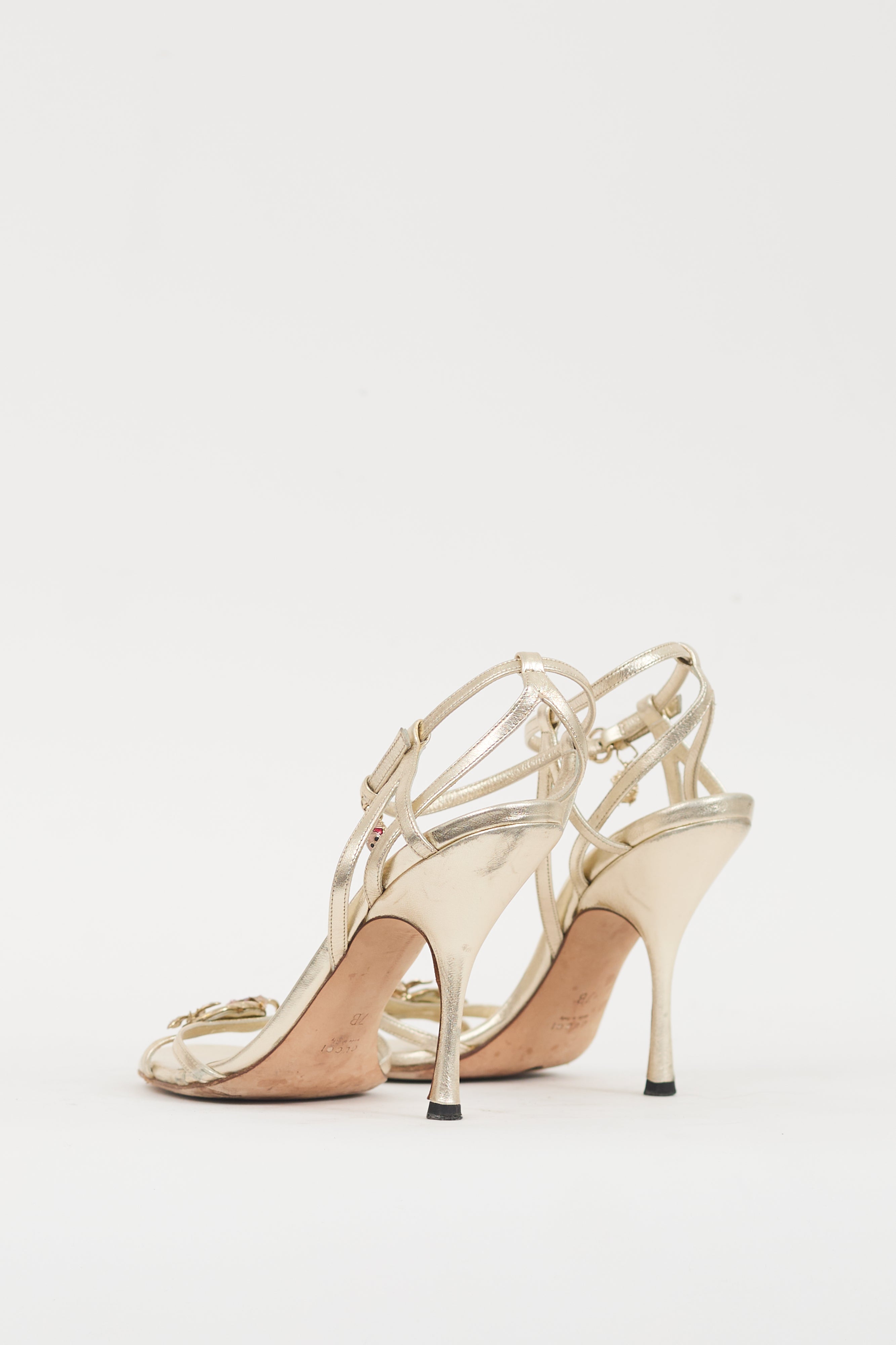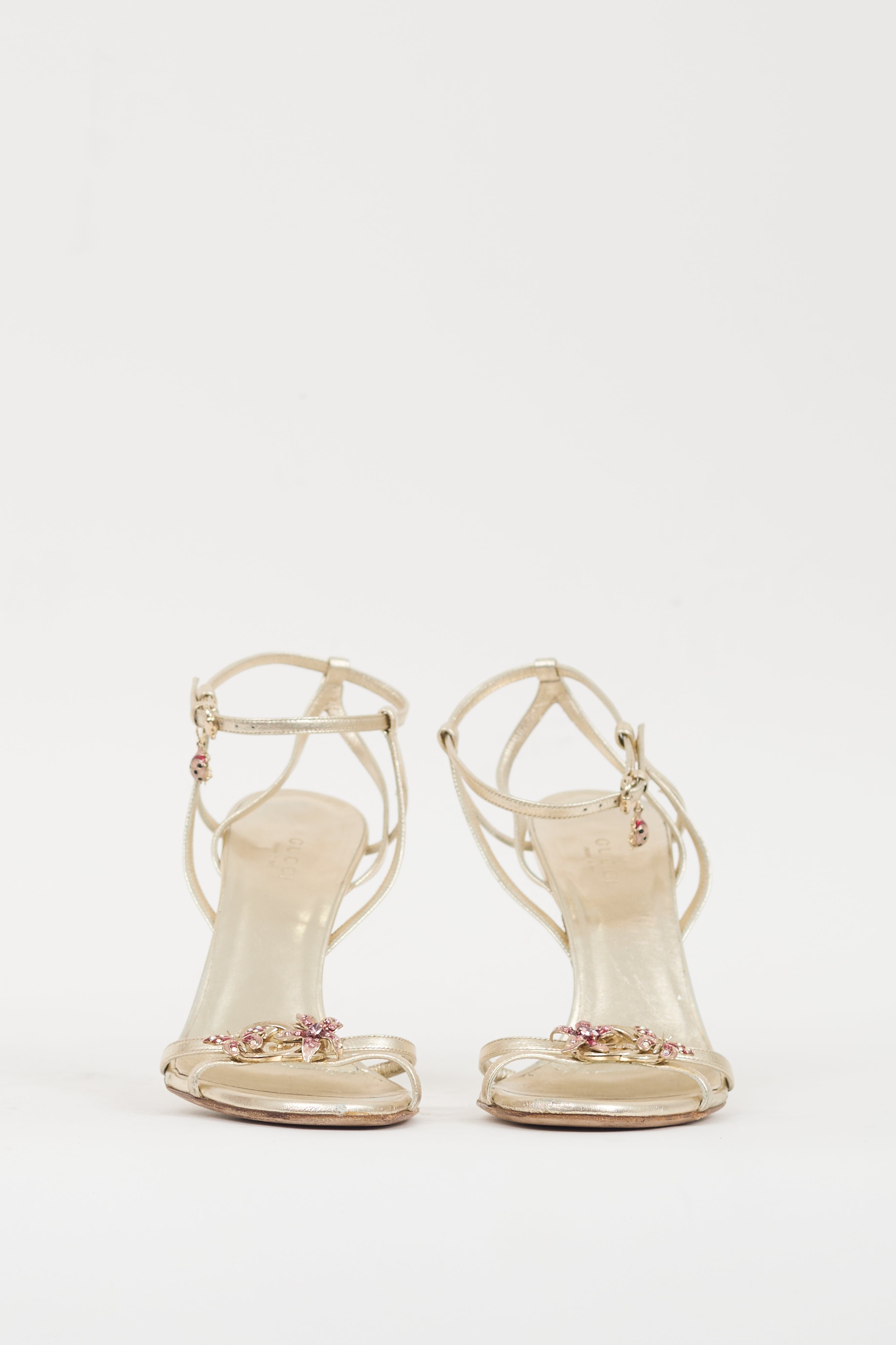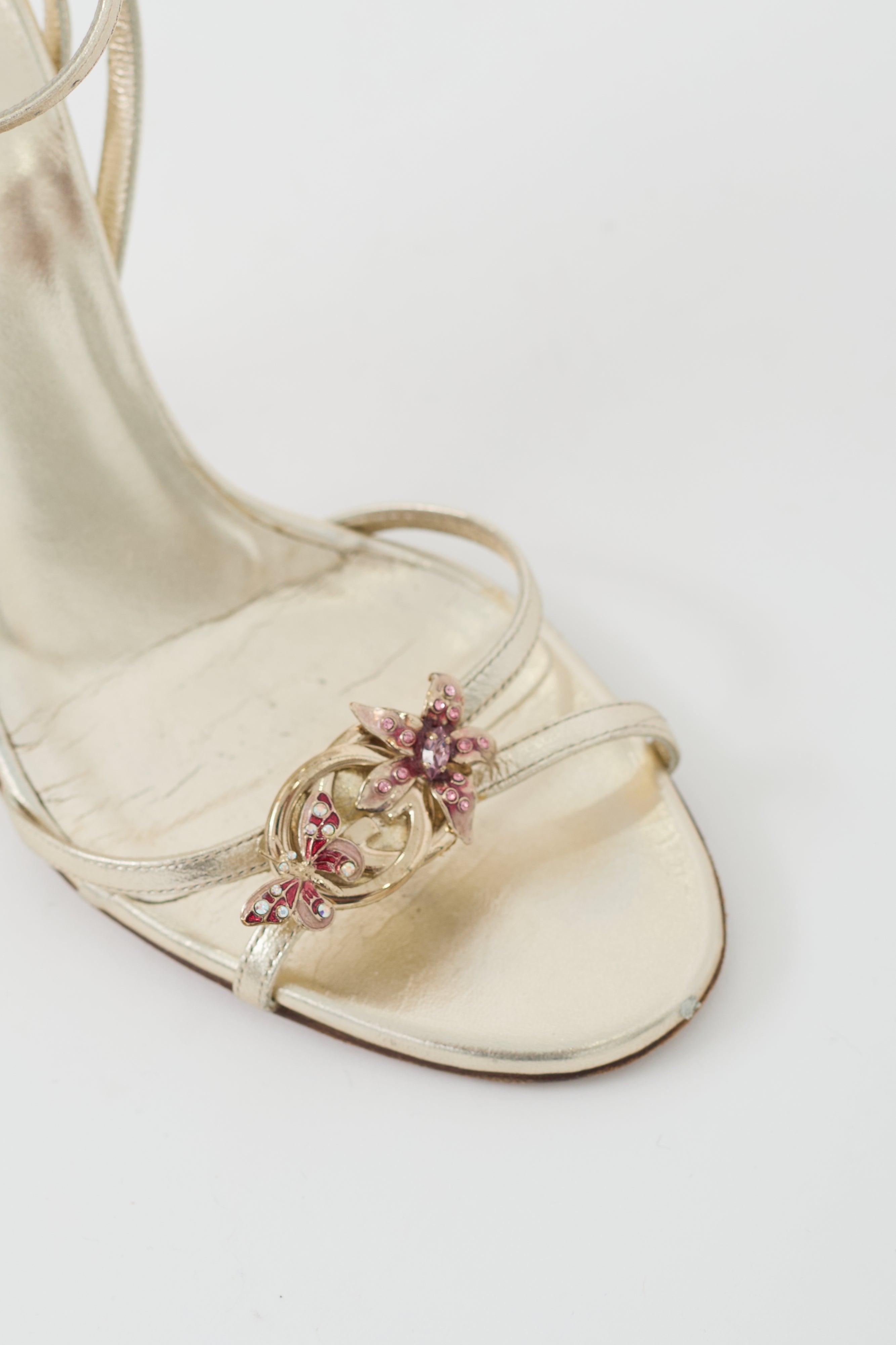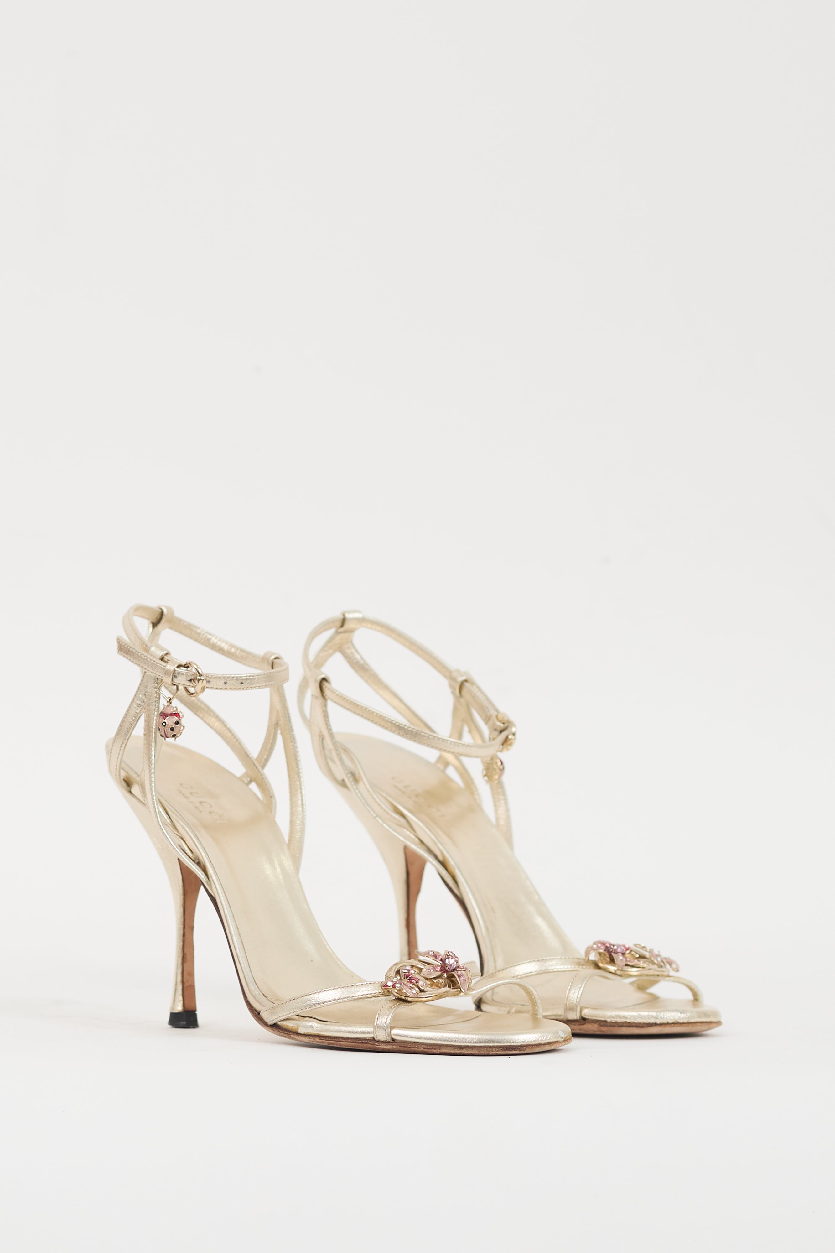 Pre-owned Gucci gold metallic leather sandals featuring an open round toe, straps at vamp with multicolour GG floral jewel embellishment, wrapped stiletto heel, and adjustable straps at ankle with jewel embellished pendant.