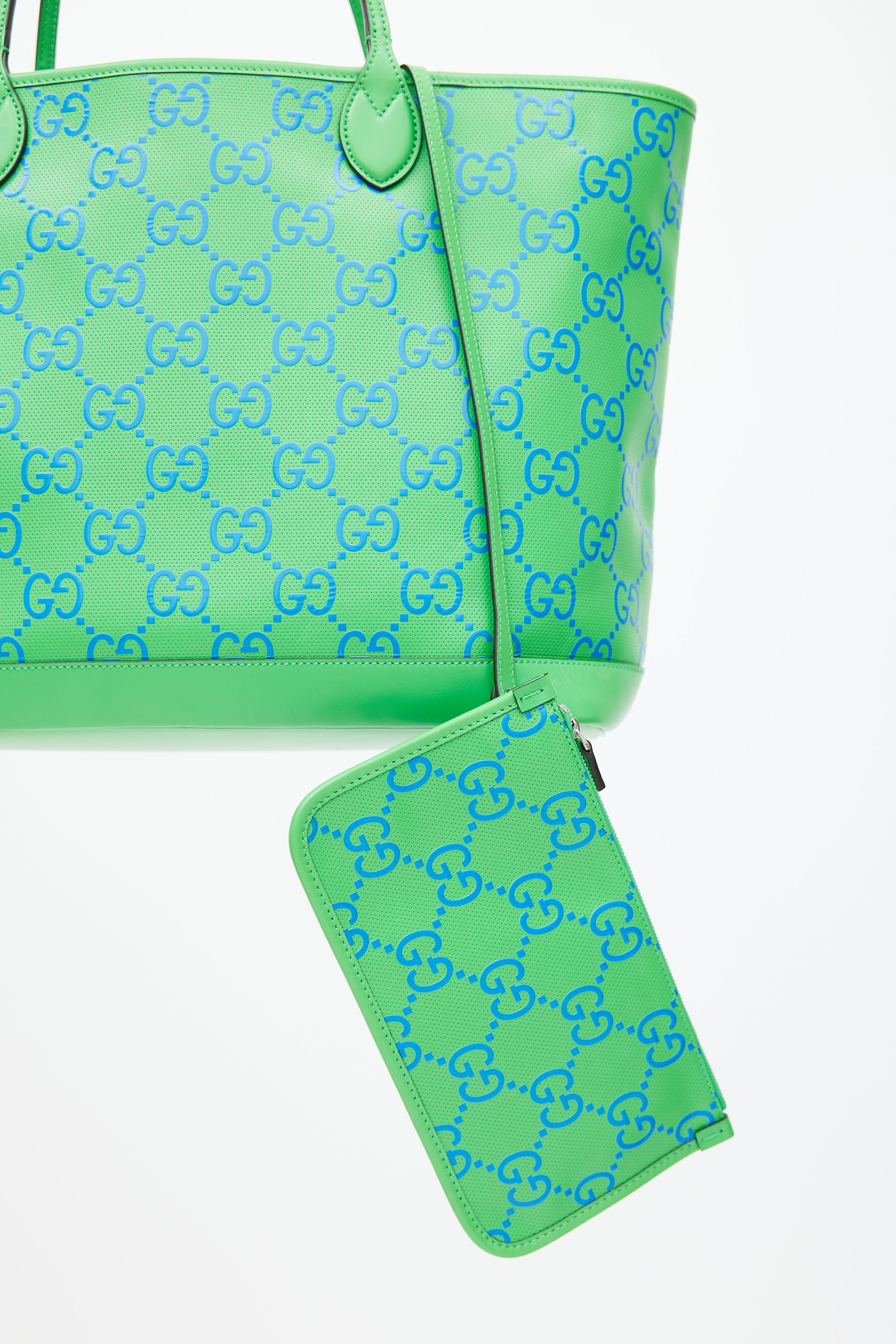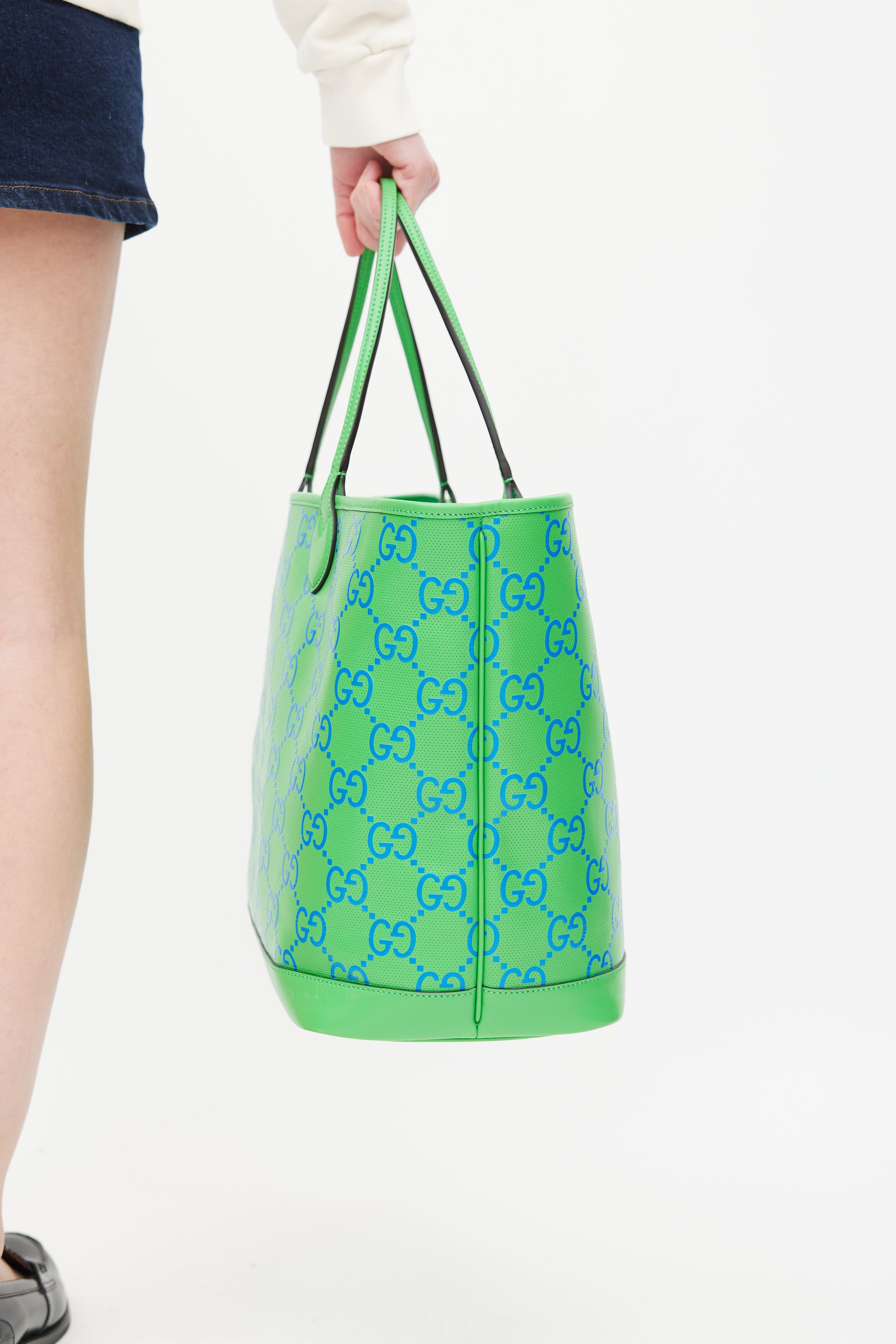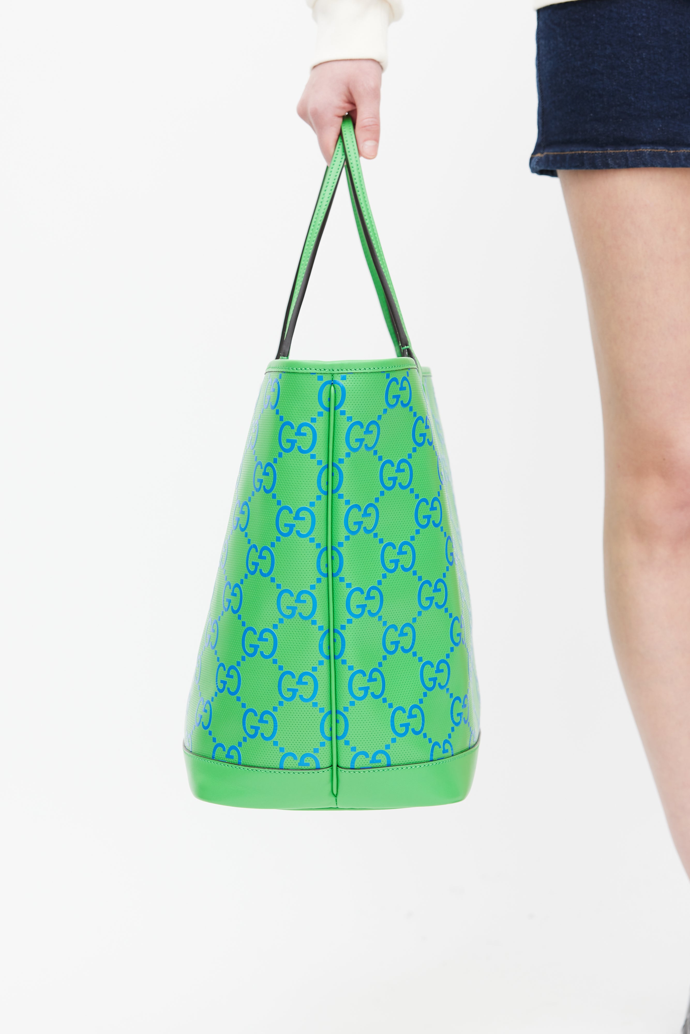 Pre-owned Gucci large green leather tote bag featuring embossed blue GG monogram and perforation throughout body, dual top handles, open top construction, one lined main compartment, and detachable zip pouch.