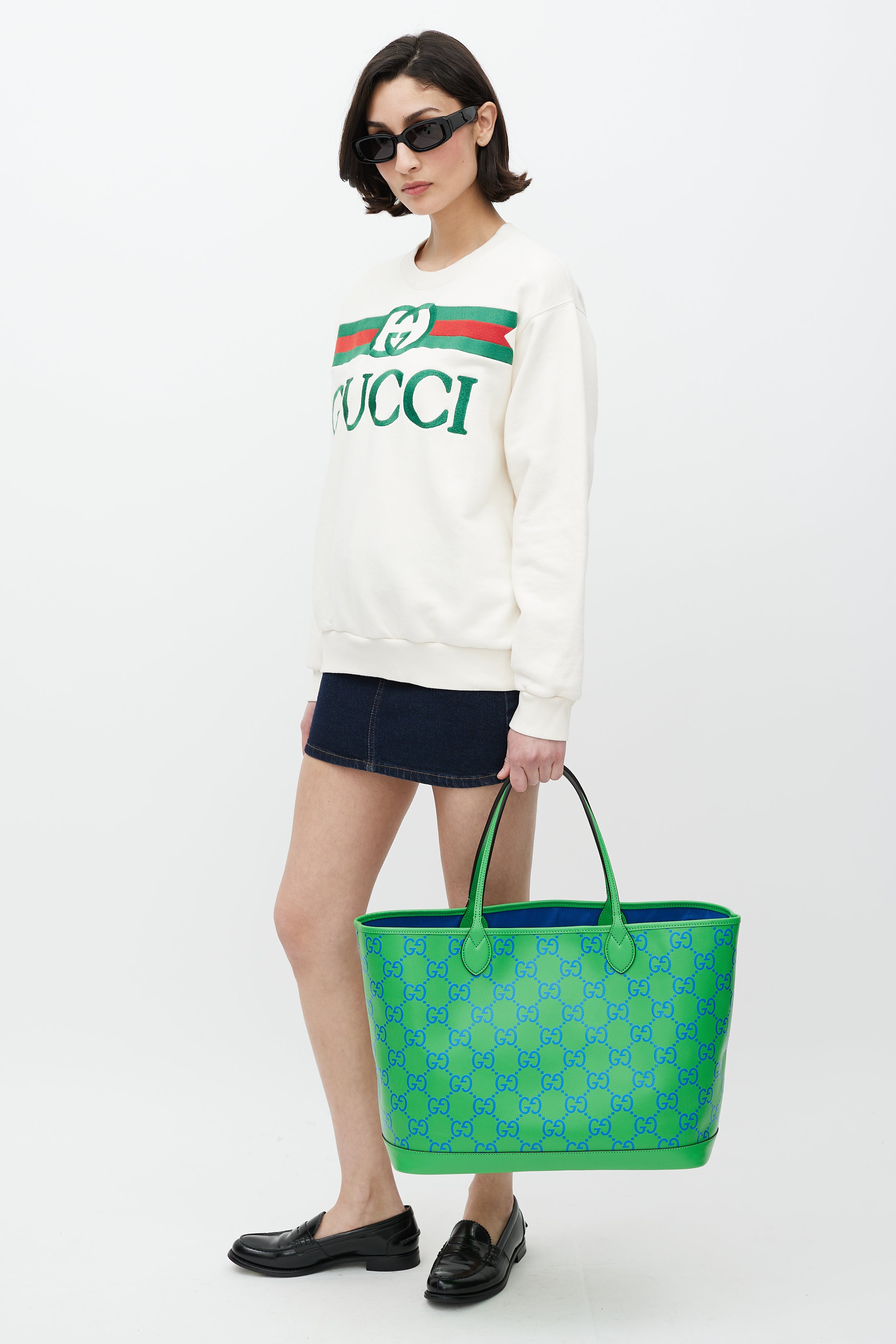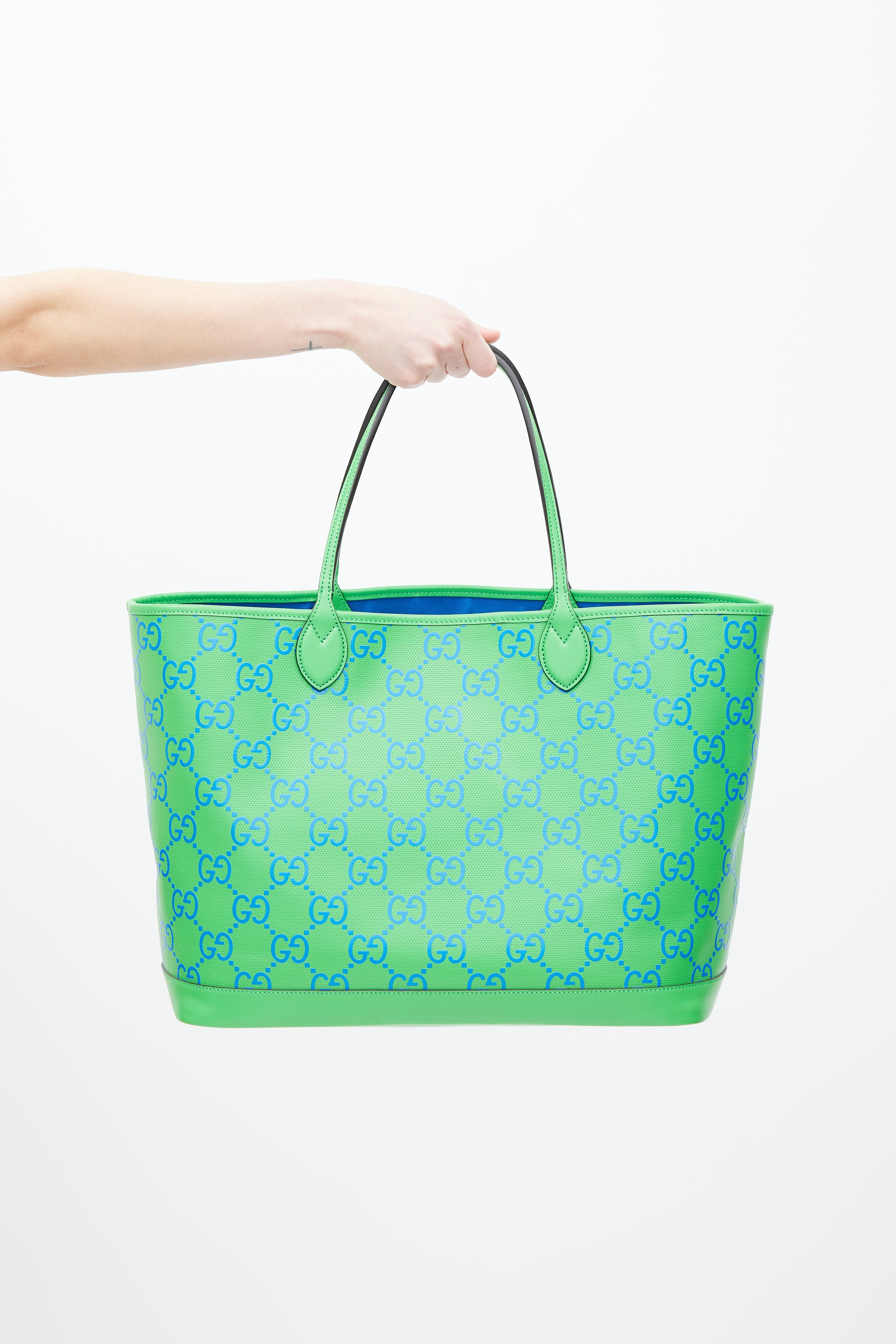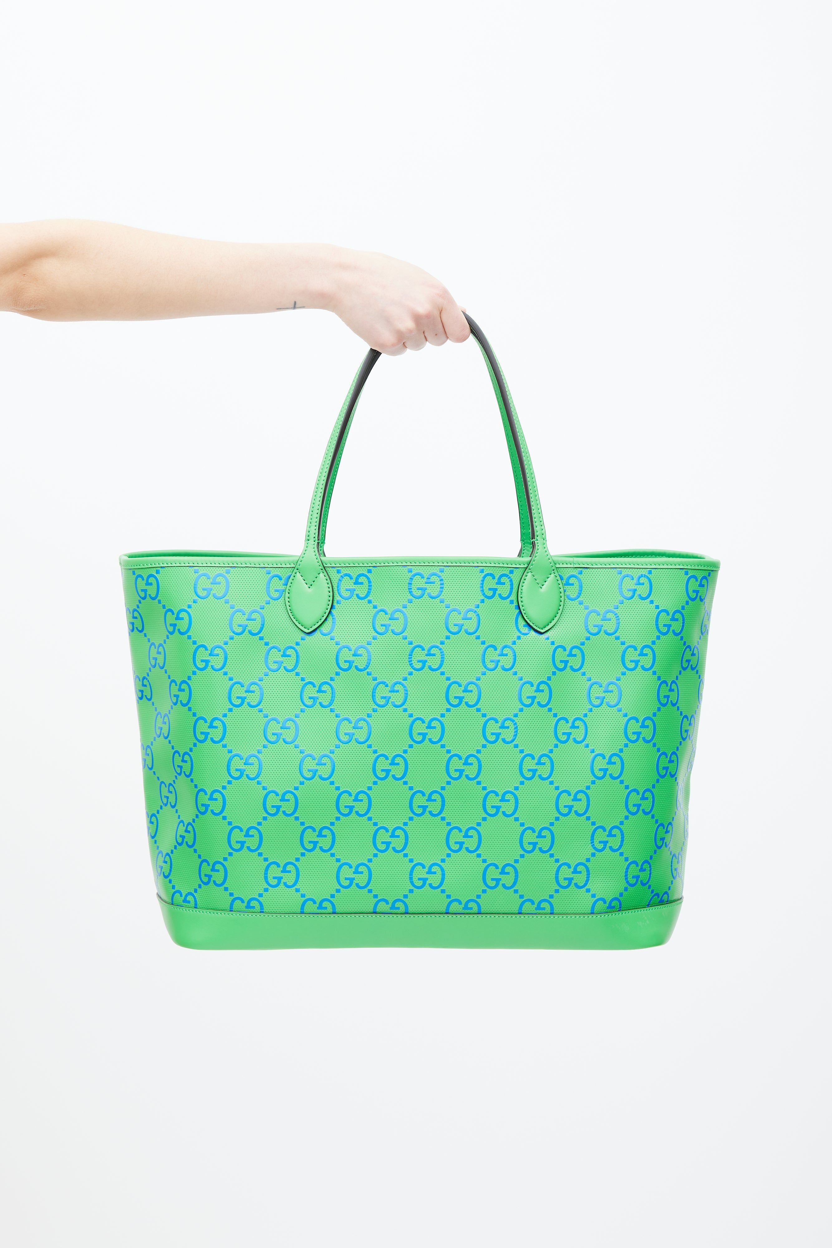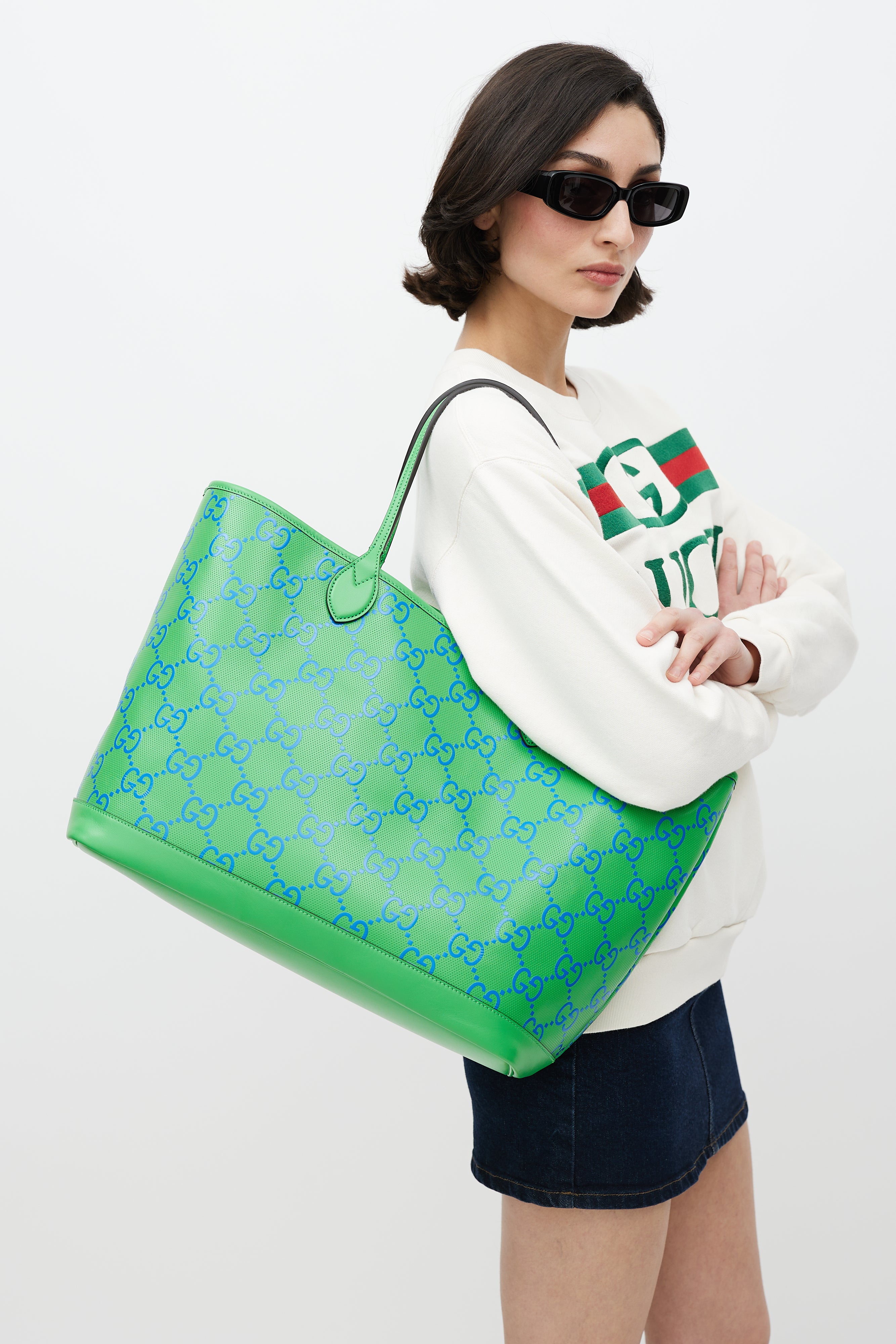 Pre-owned Gucci large green leather tote bag featuring embossed blue GG monogram and perforation throughout body, dual top handles, open top construction, one lined main compartment, and detachable zip pouch.