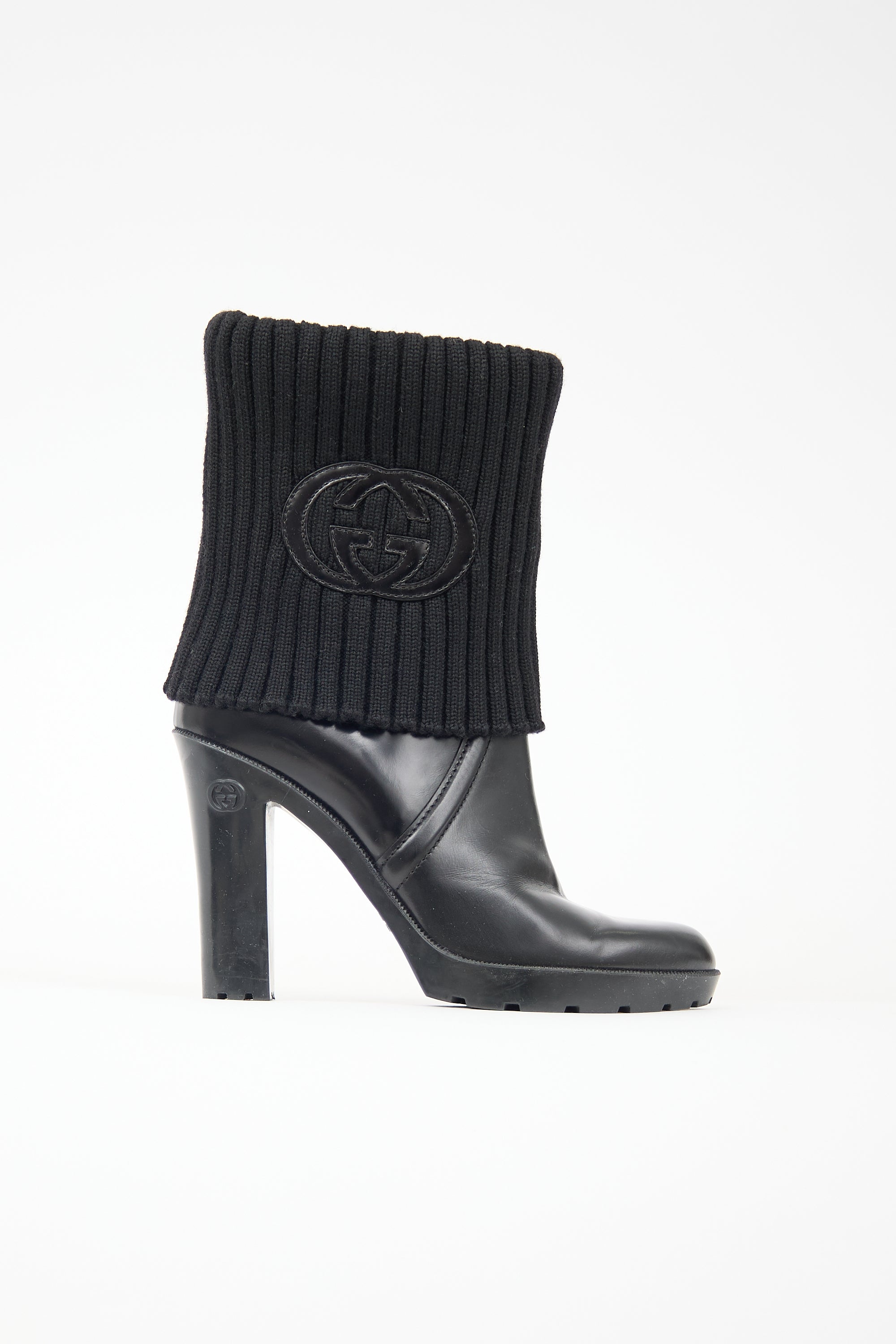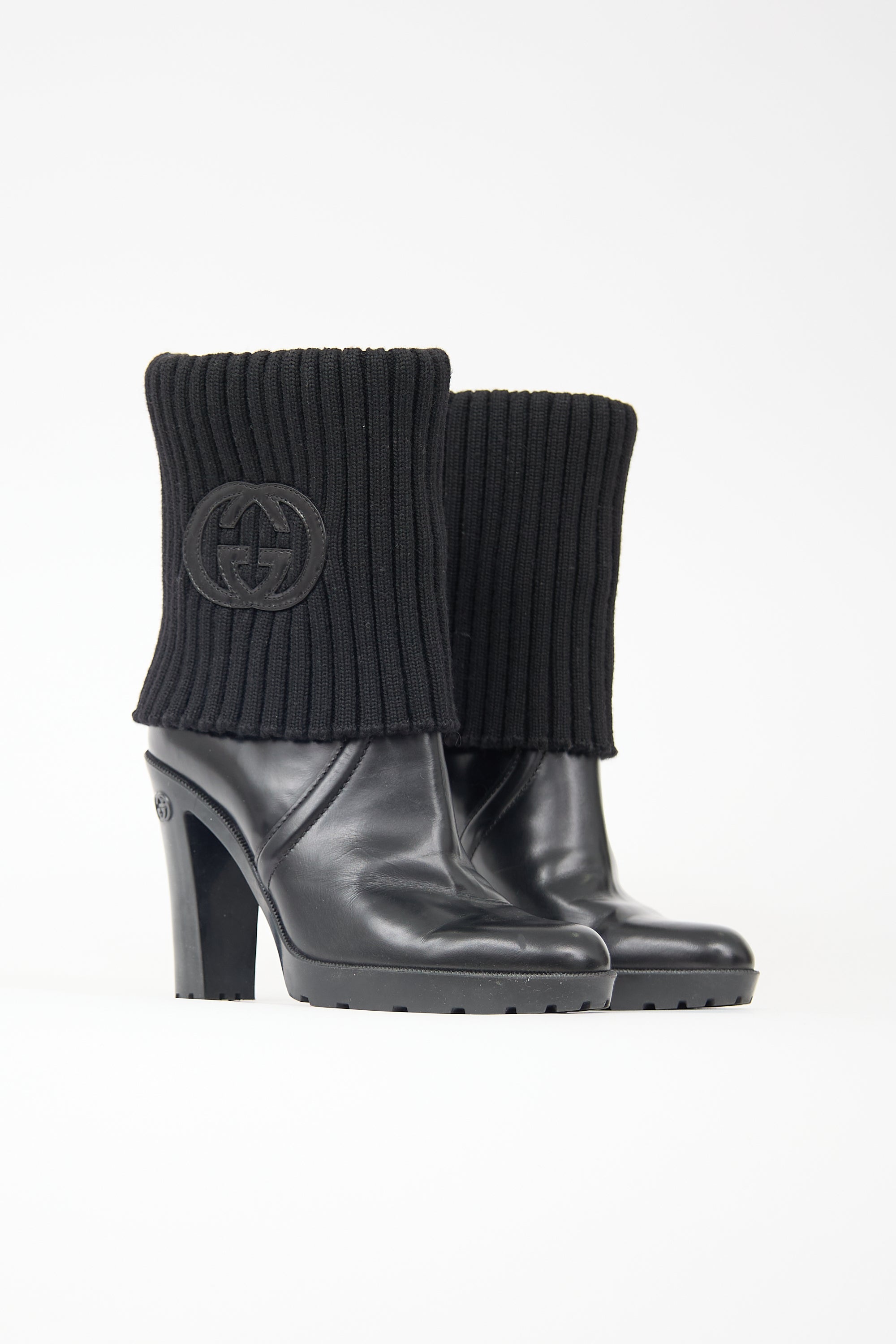 Pre-owned Gucci black leather boots featuring an almond toe, ribbed knit foldover collar with interlocking GG leather patch, rubber block heel, and treaded outsole.