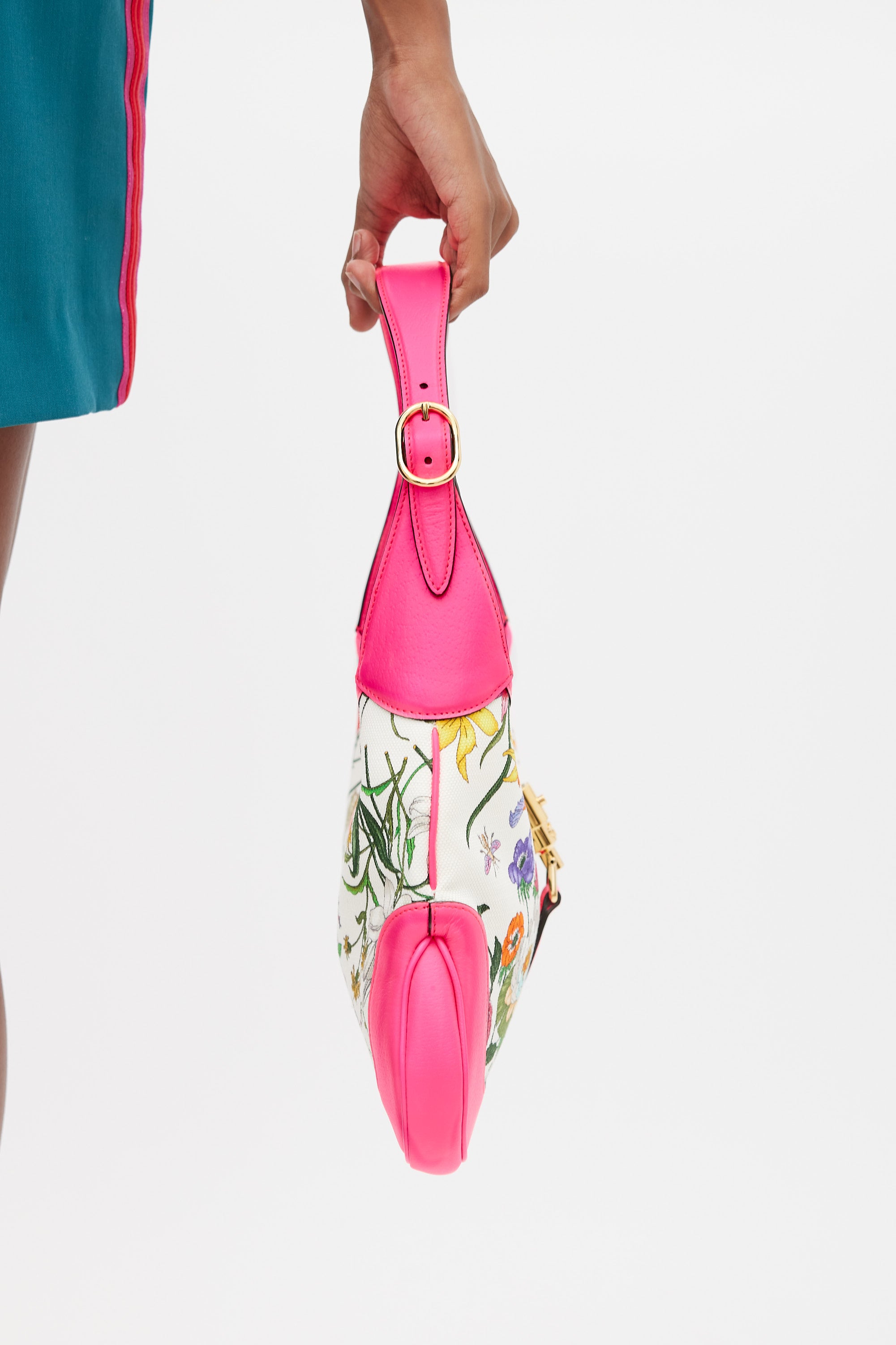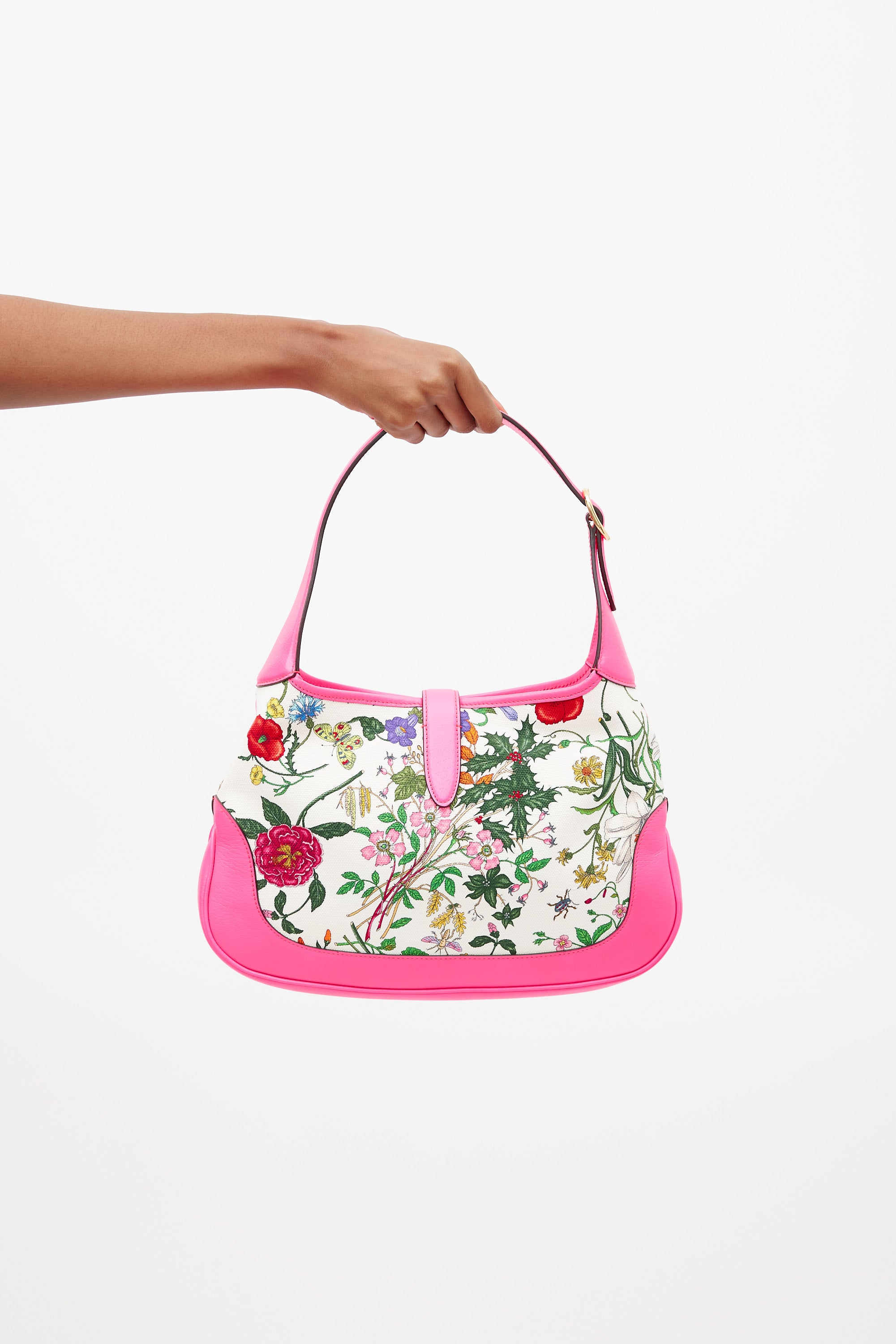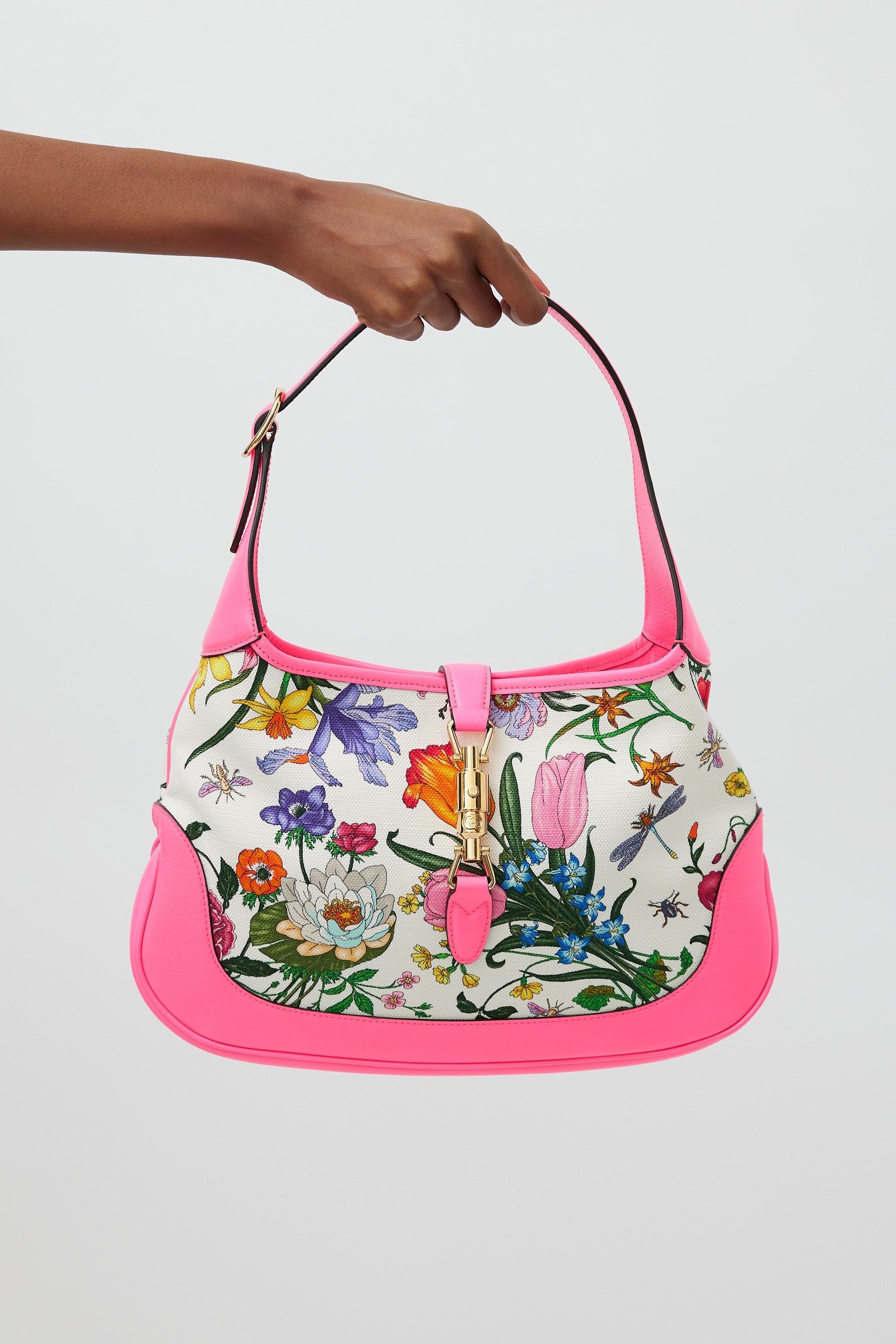 Pre-owned Gucci medium Jackie 1961 bag featuring a canvas body with multicolour floral print throughout, neon pink leather panelling, gold tone hardware, single flat adjustable top handle, strap across top with front push lock fastening, and one lined main compartment with single zip pocket. Comes with original dust bag. Neon pink leather panelling is more vibrant in person.