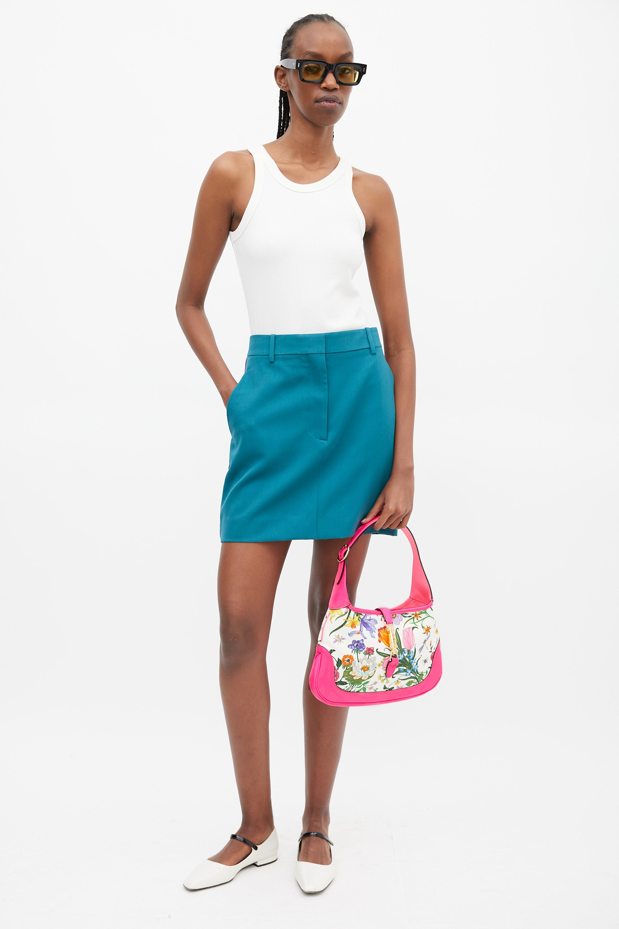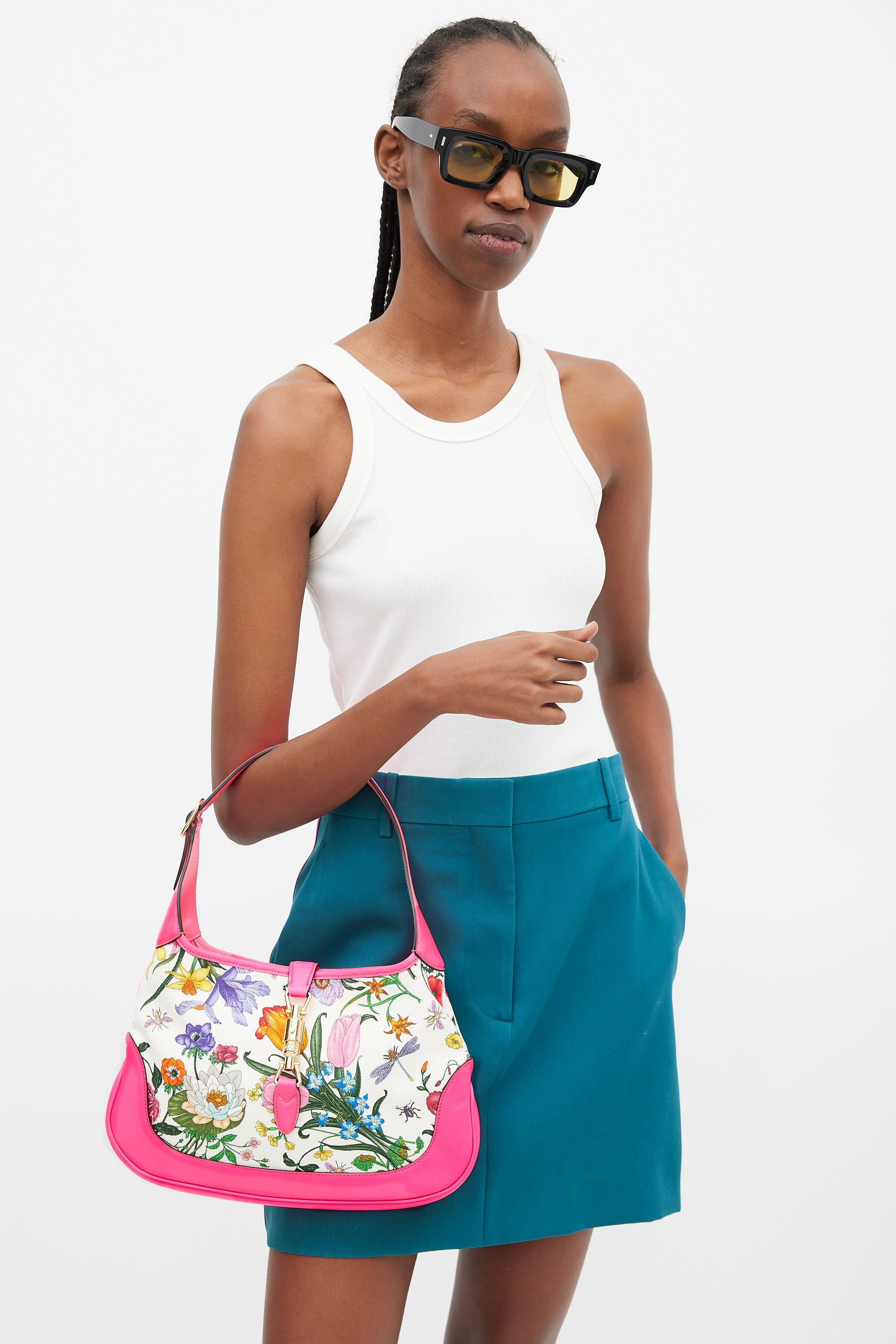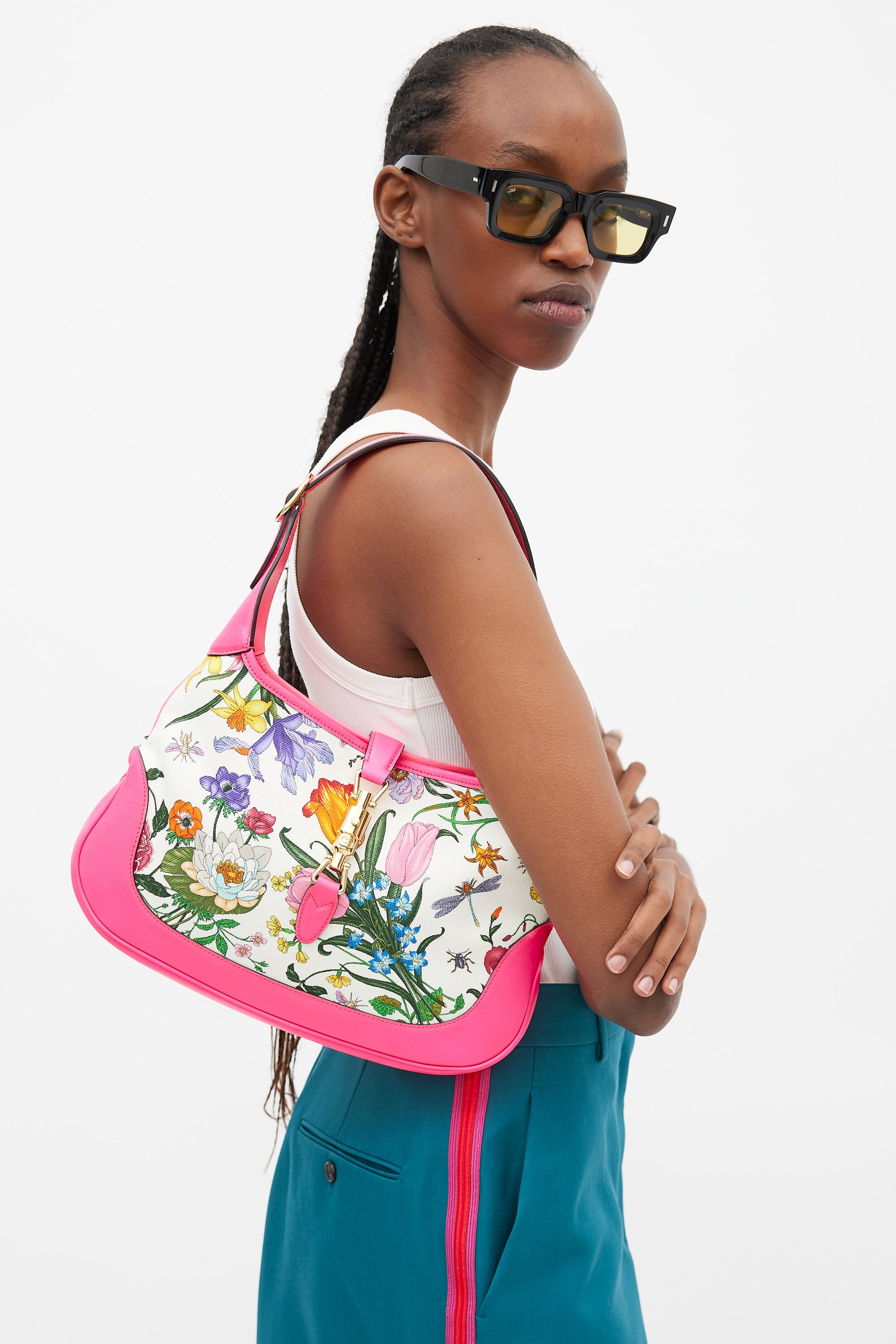 Pre-owned Gucci medium Jackie 1961 bag featuring a canvas body with multicolour floral print throughout, neon pink leather panelling, gold tone hardware, single flat adjustable top handle, strap across top with front push lock fastening, and one lined main compartment with single zip pocket. Comes with original dust bag. Neon pink leather panelling is more vibrant in person.