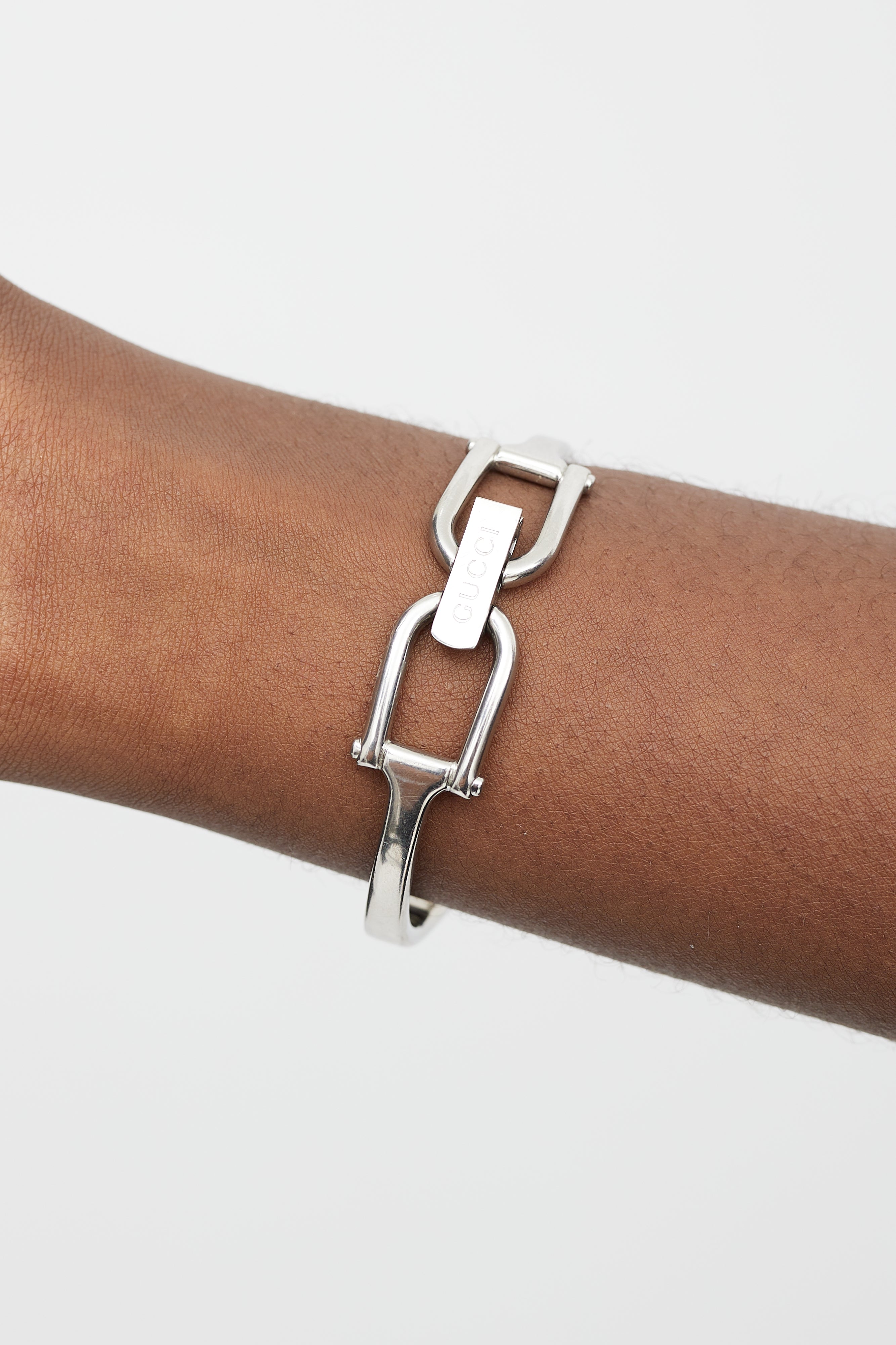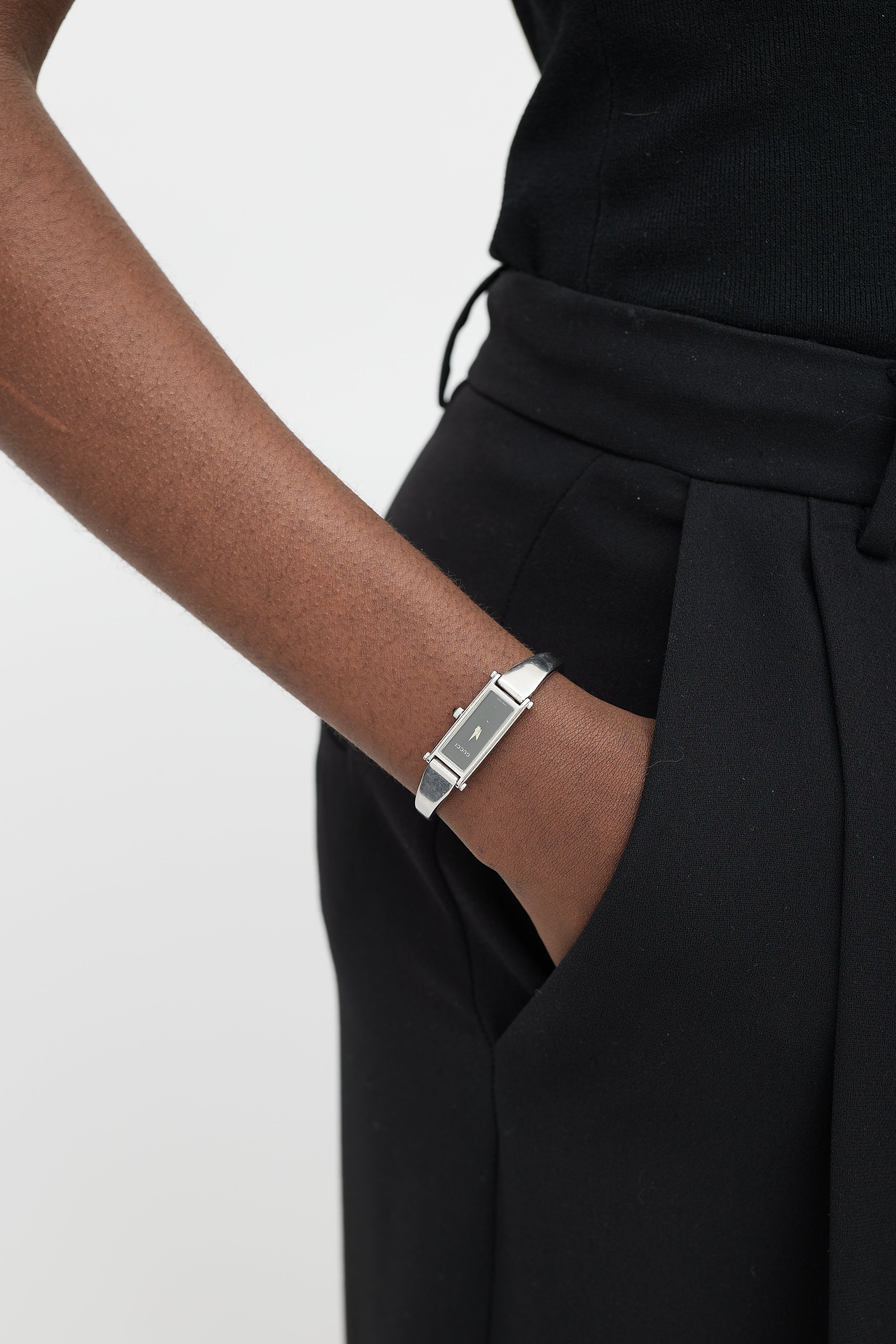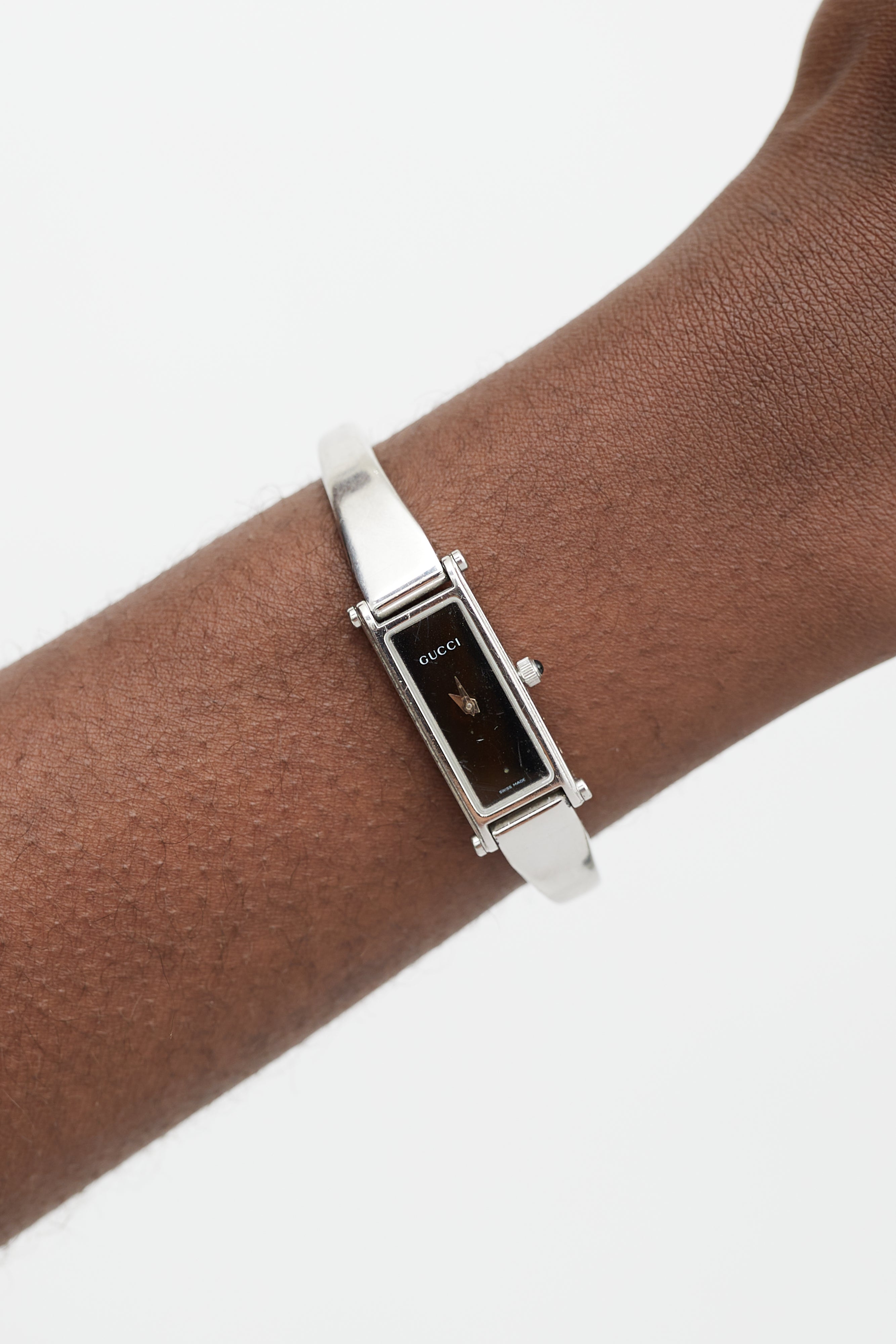 Pre-owned Gucci silver 1500L watch featuring black watch face, Horsebit clasp closure, engraved logo at back, and siler tone hand.