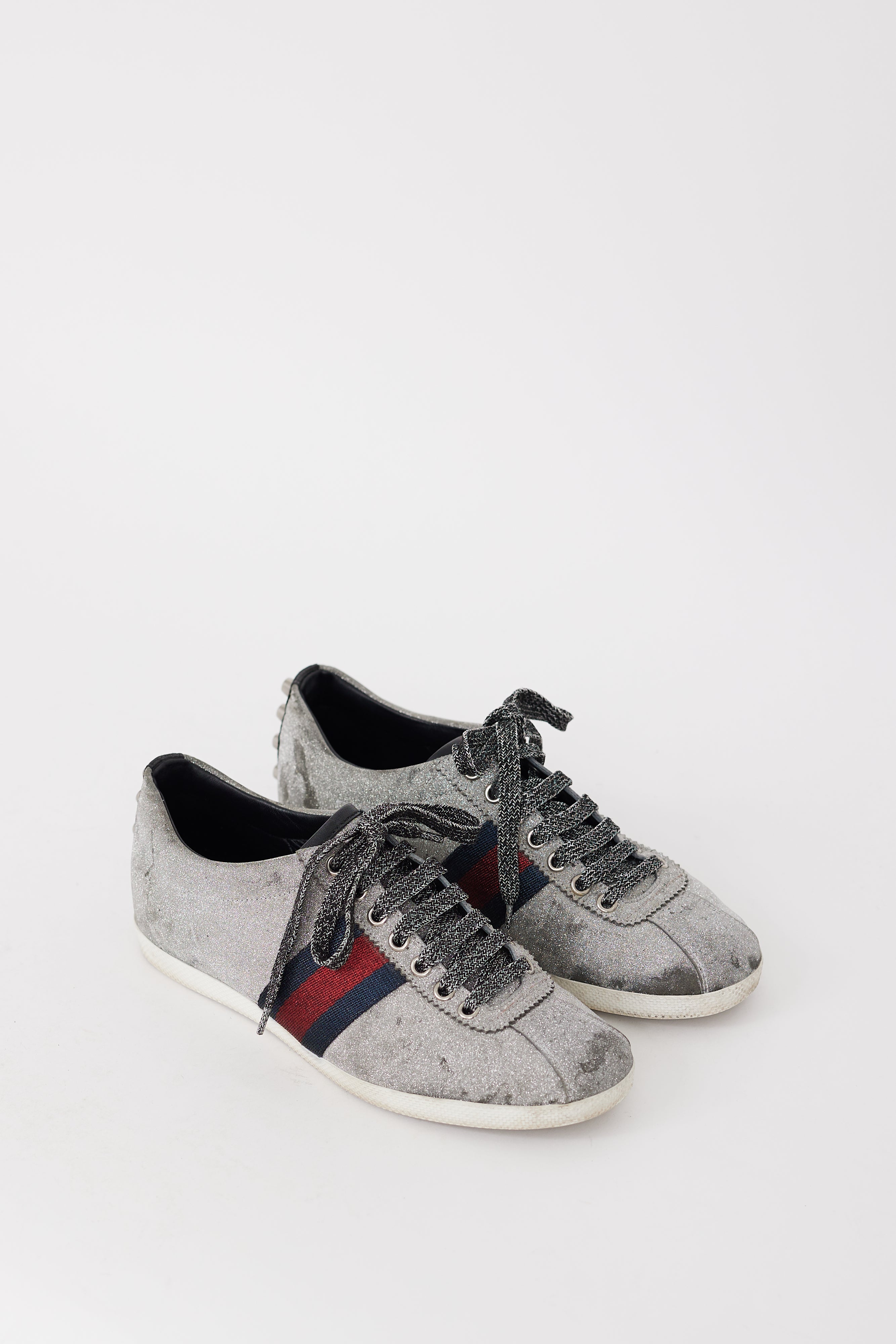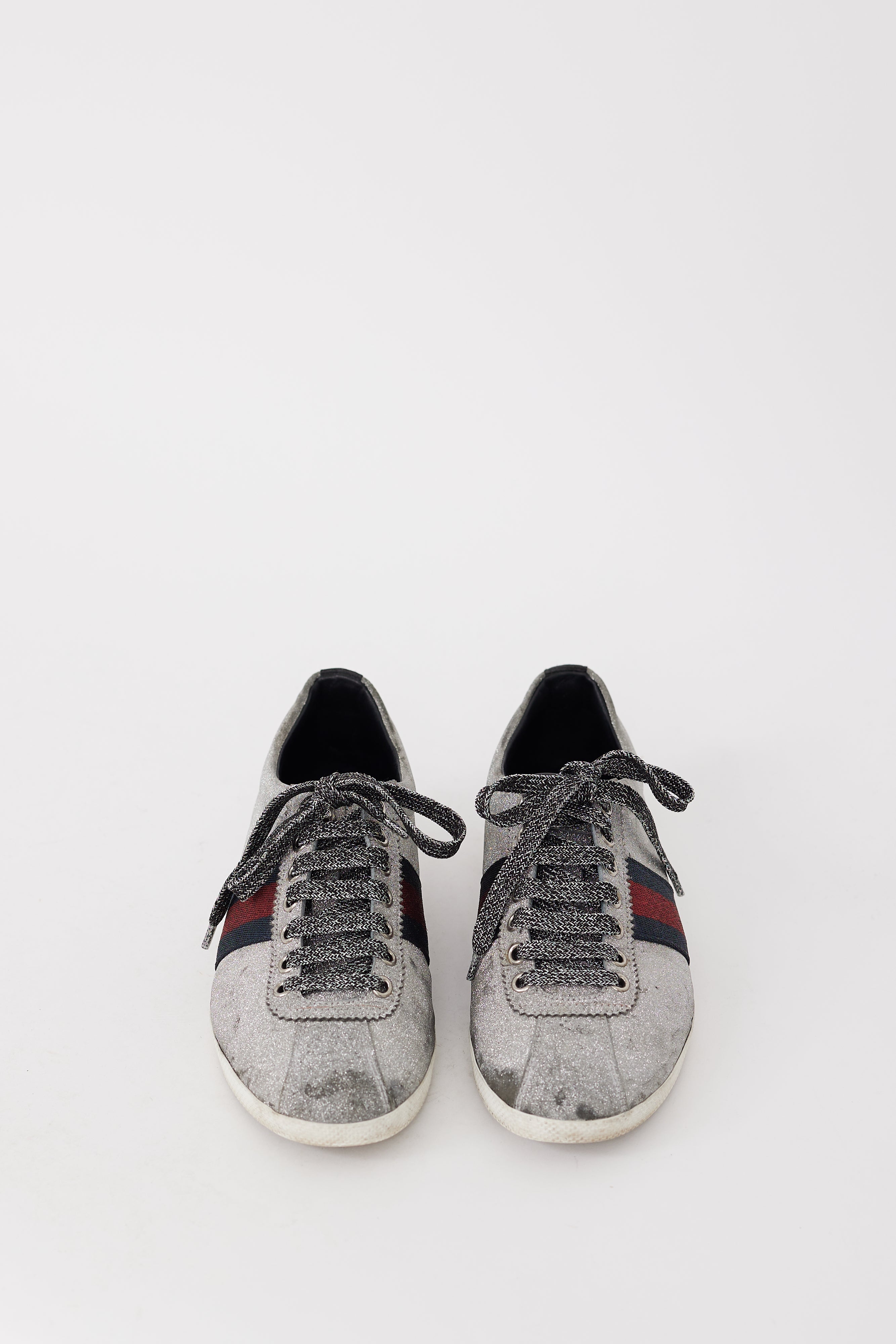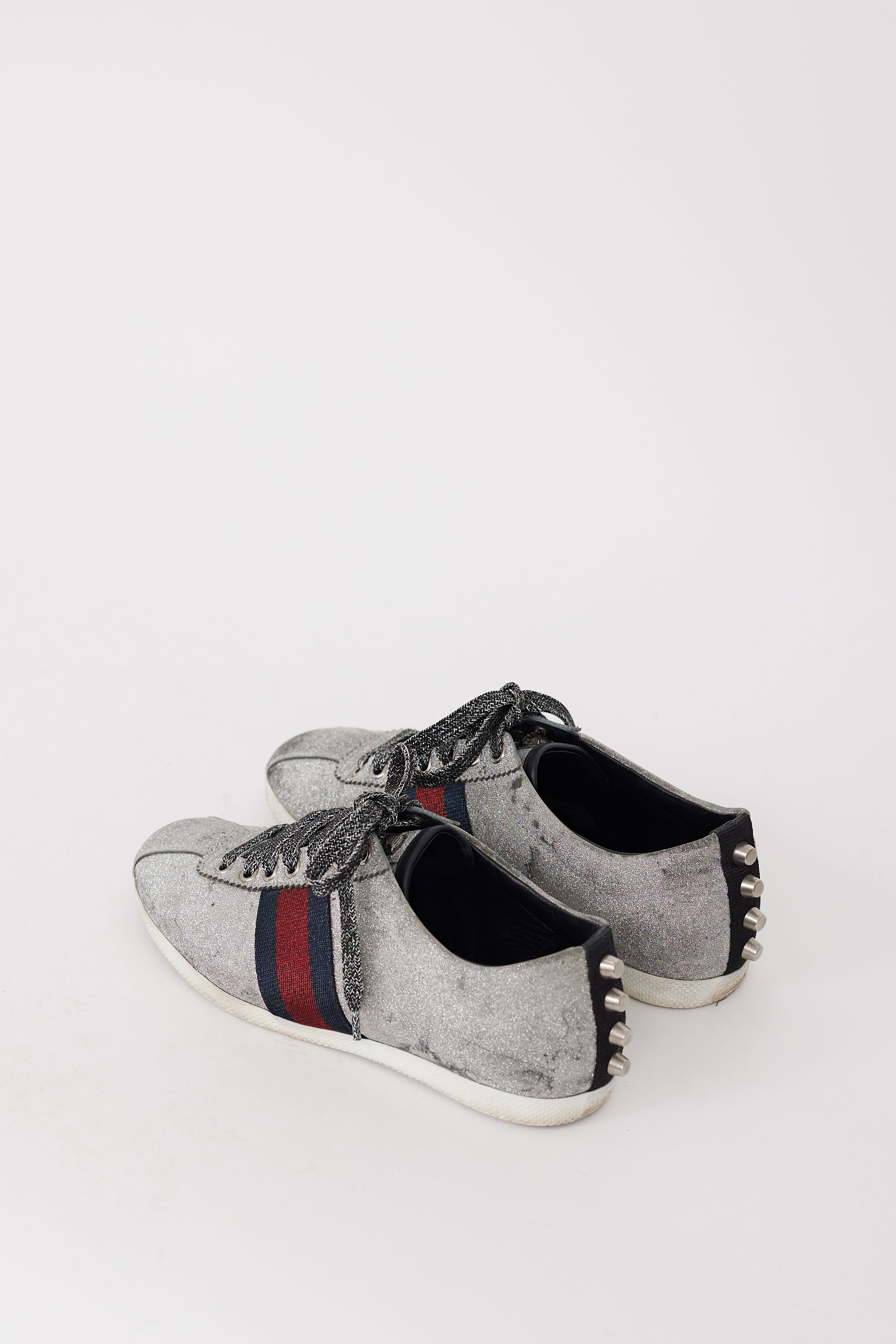 Pre-owned Gucci Falacer sneakers featuring a rounded toe, silver glitter upper, lace up front, navy and red grosgrain ribbon at sides, silver tone feline head embellishment at tongue, four silver tone studs at counter, and white rubber sole with embossed logo at heel.
