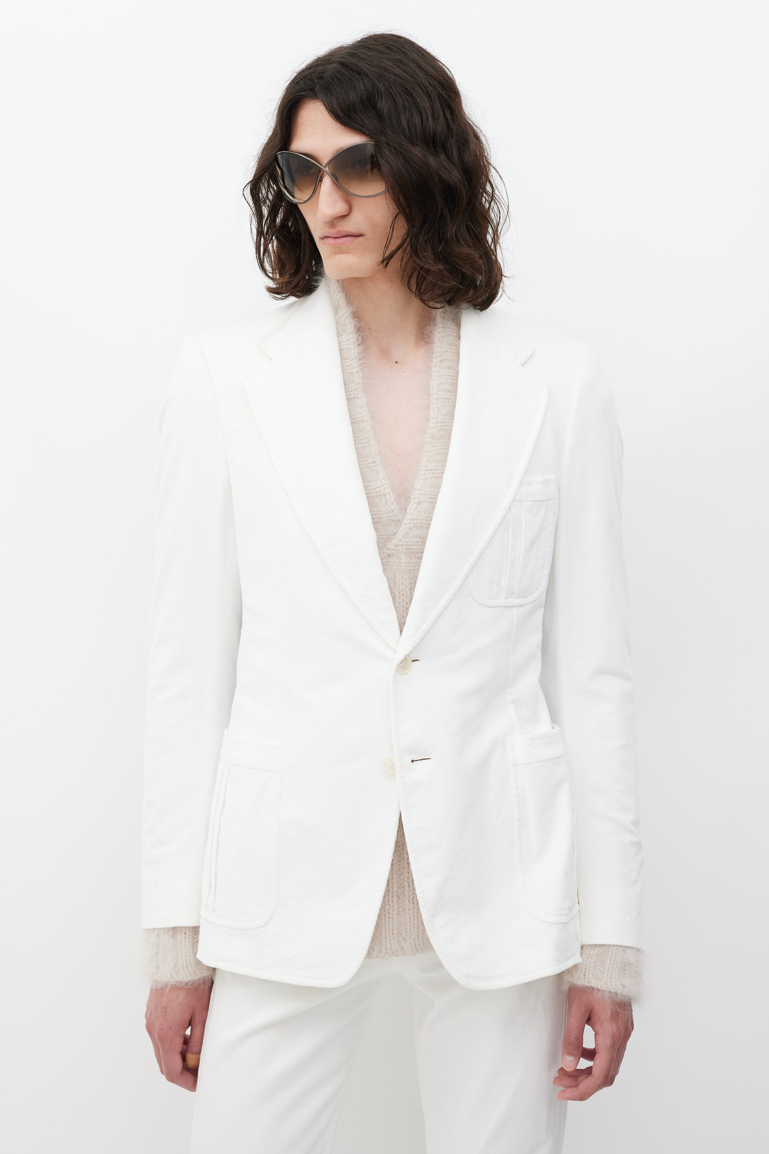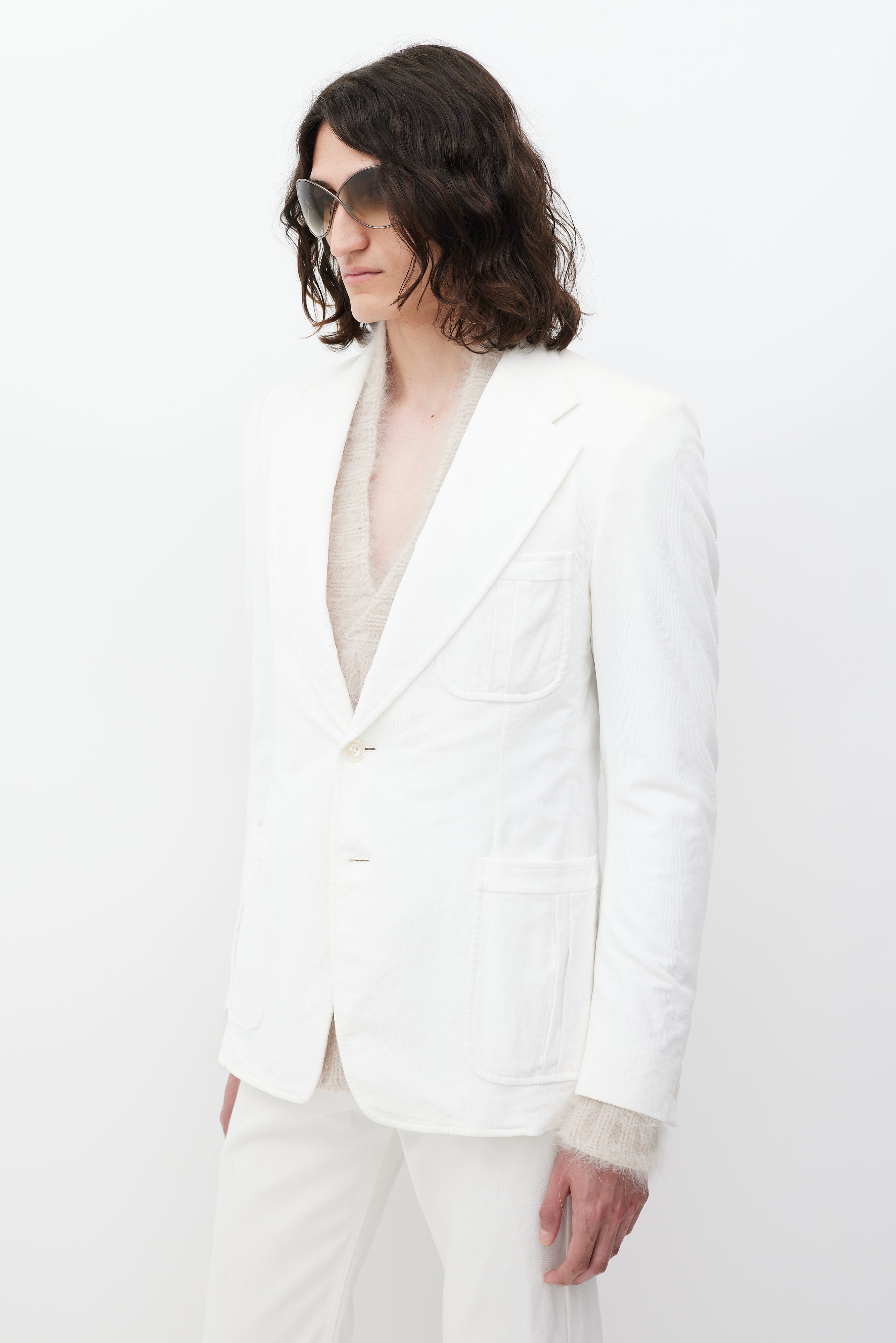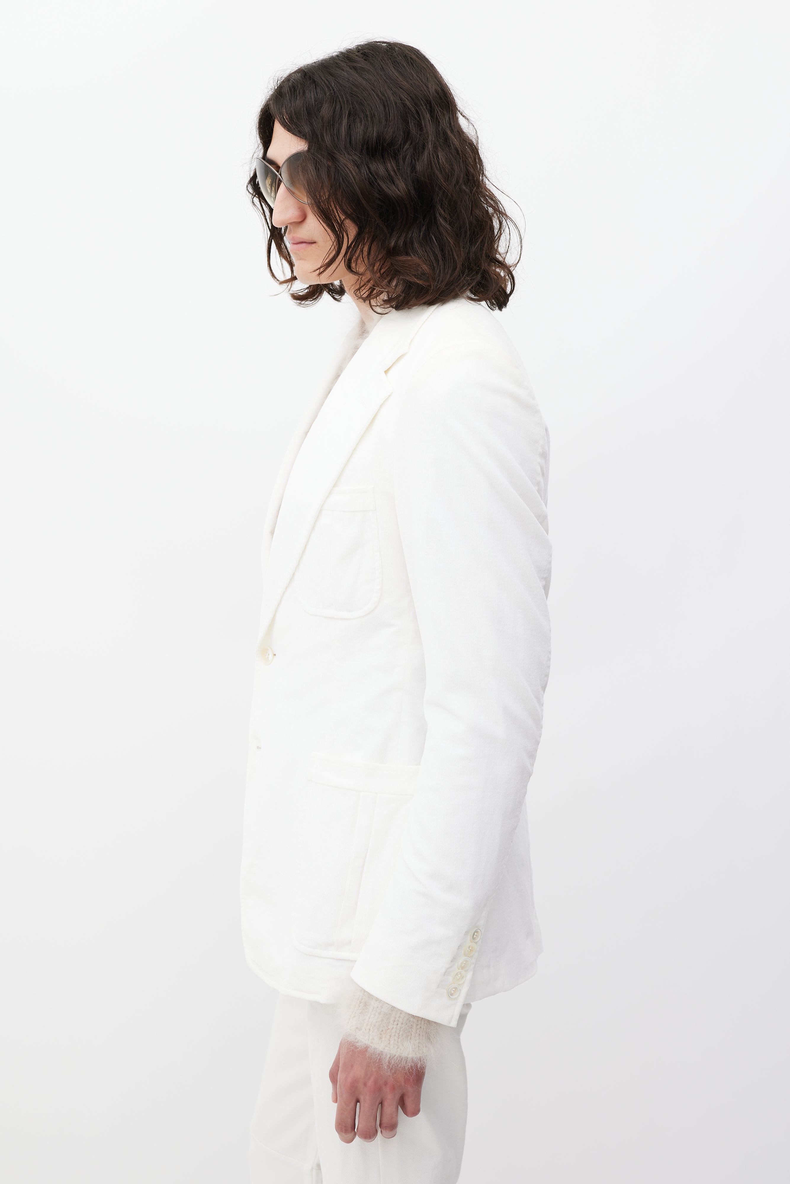 Pre-owned Gucci white corduroy blazer featuring a notched lapel, long sleeves with buttoned cuffs, one patch pocket at chest, two patch pockets at hip, and button up closure. Lined.