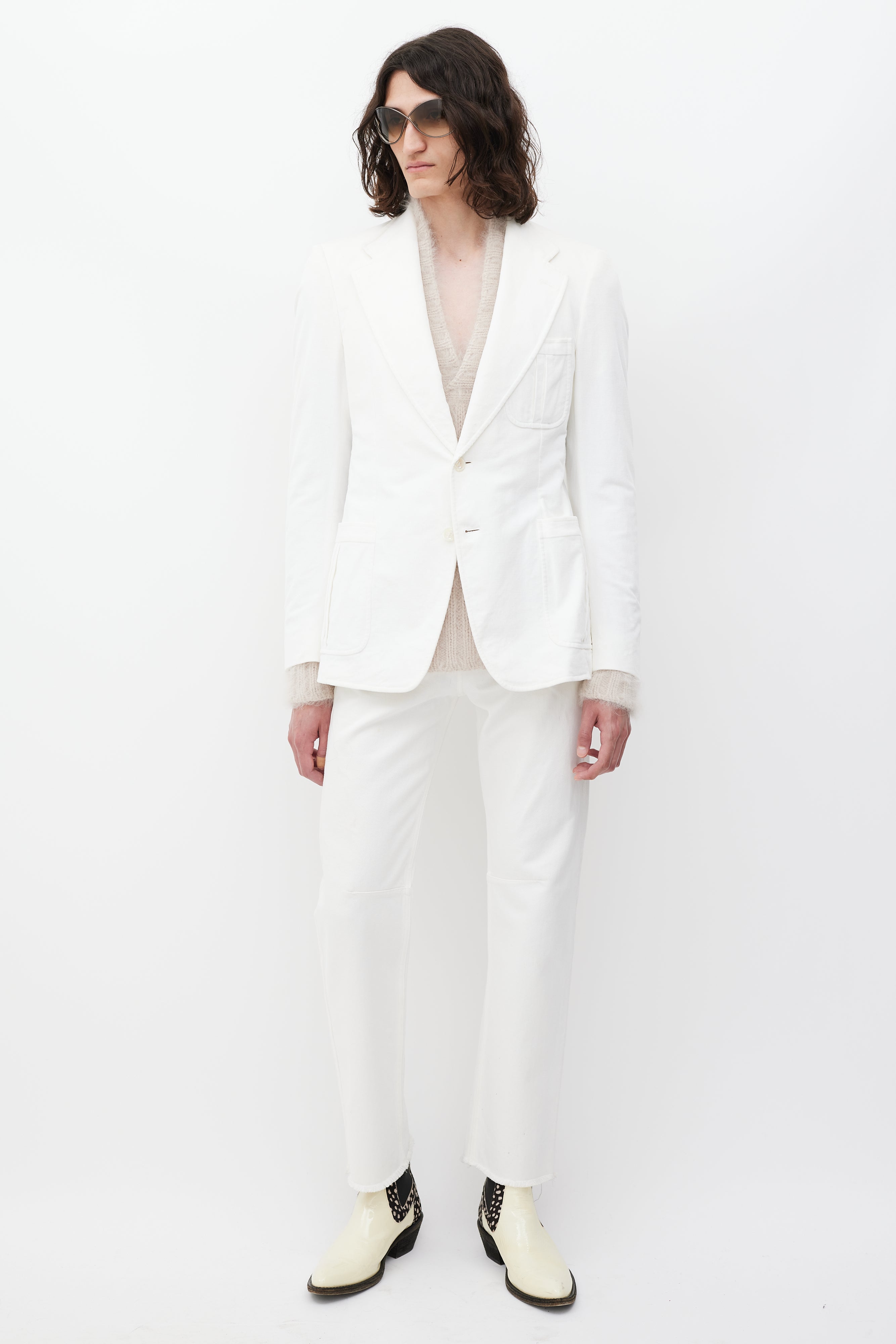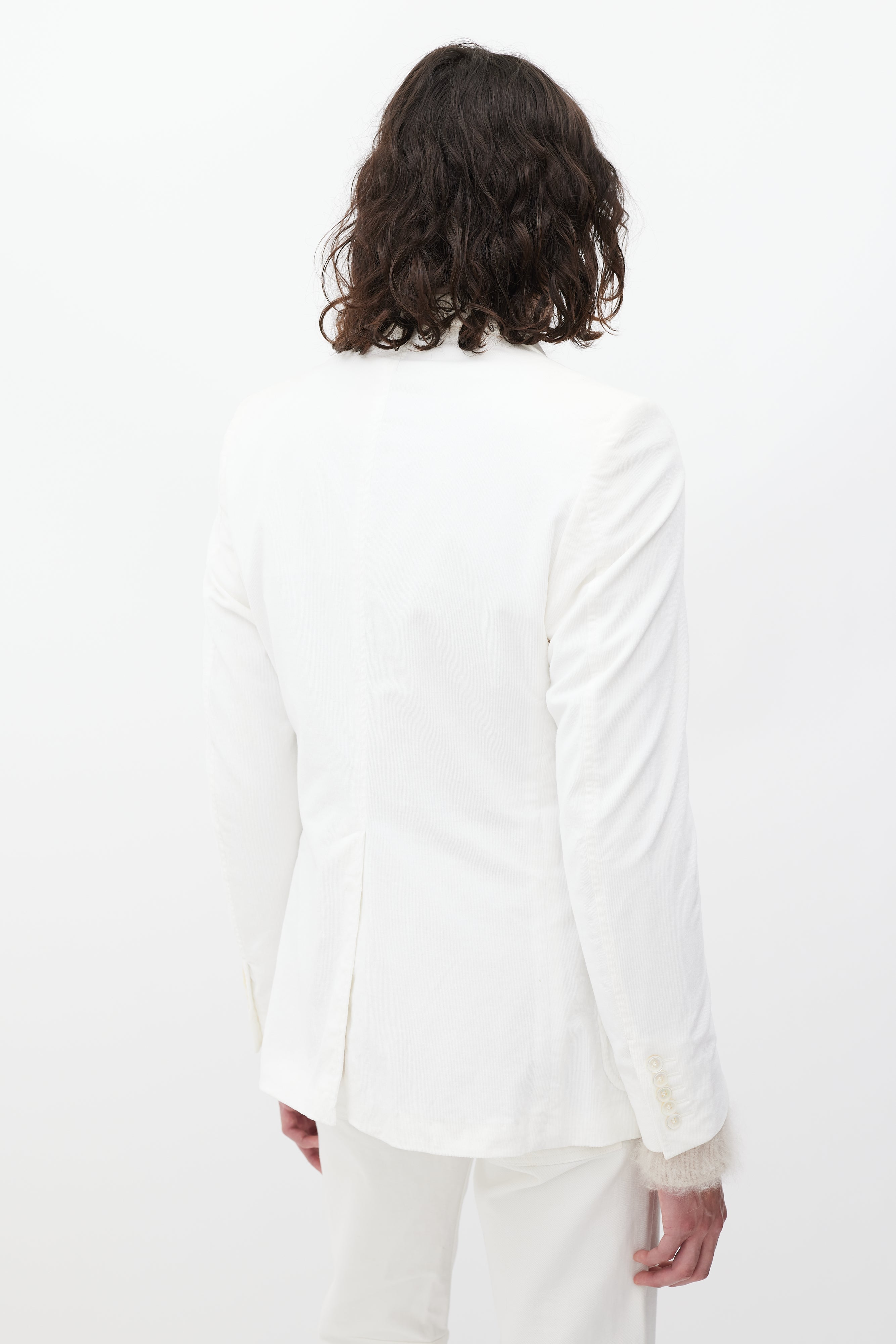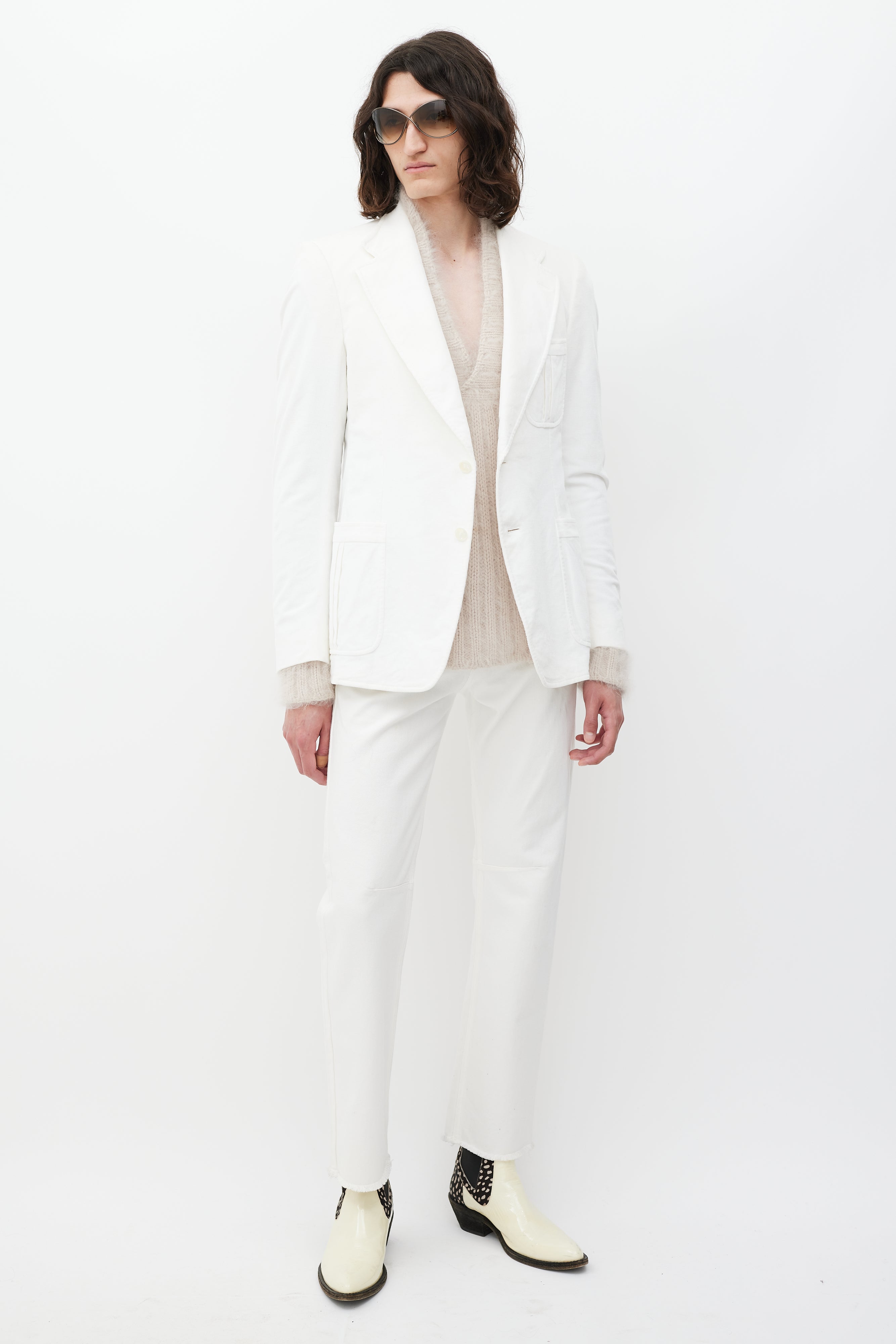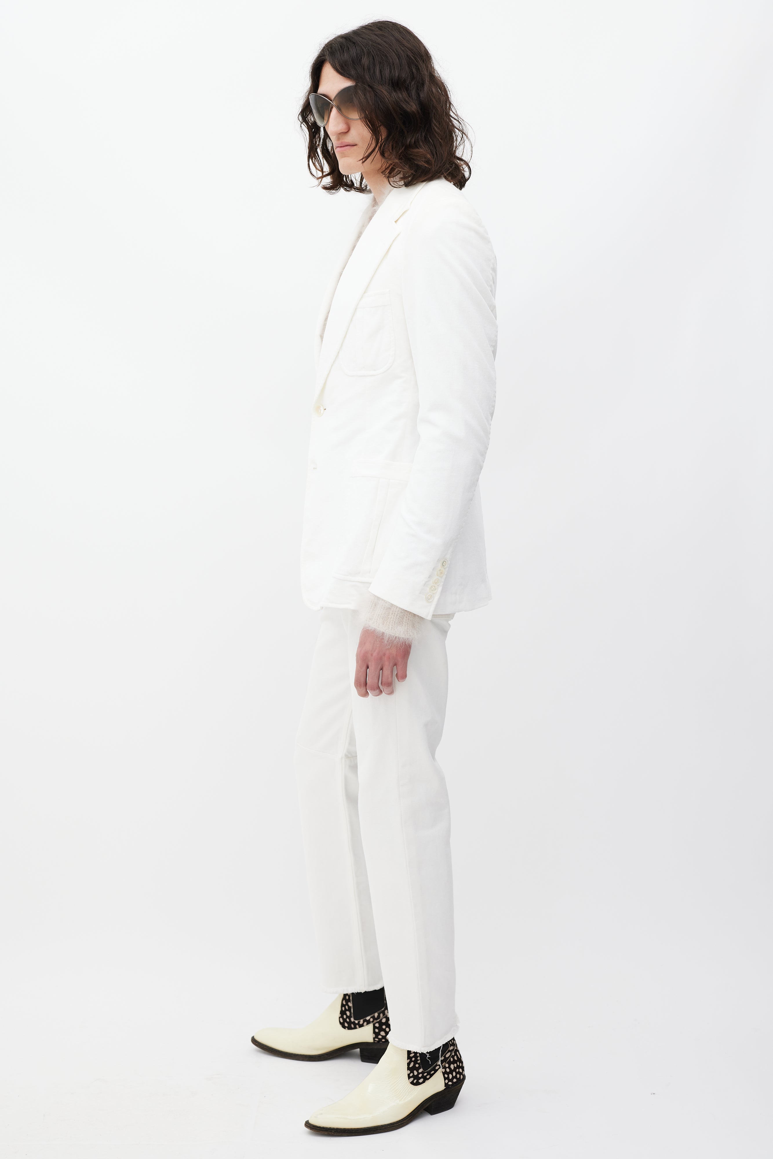 Pre-owned Gucci white corduroy blazer featuring a notched lapel, long sleeves with buttoned cuffs, one patch pocket at chest, two patch pockets at hip, and button up closure. Lined.
