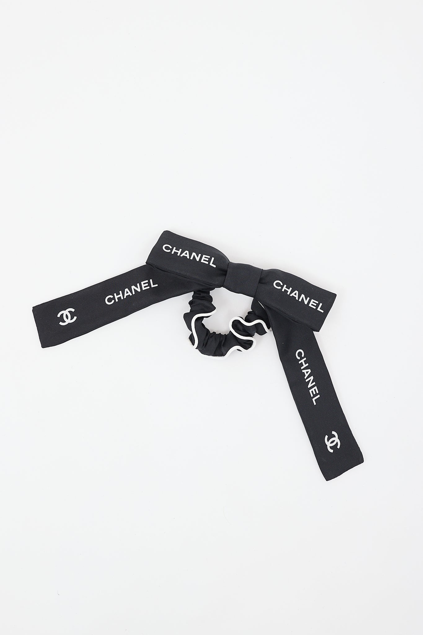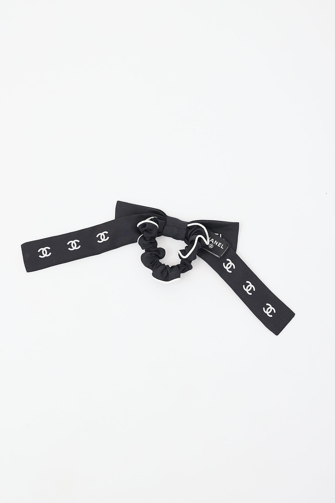 Pre-owned Chanel black and white silk hair accessory featuring scrunchie, attached bow, elasticized band, white piping trim, and CC and letter logo print. Comes with original box.