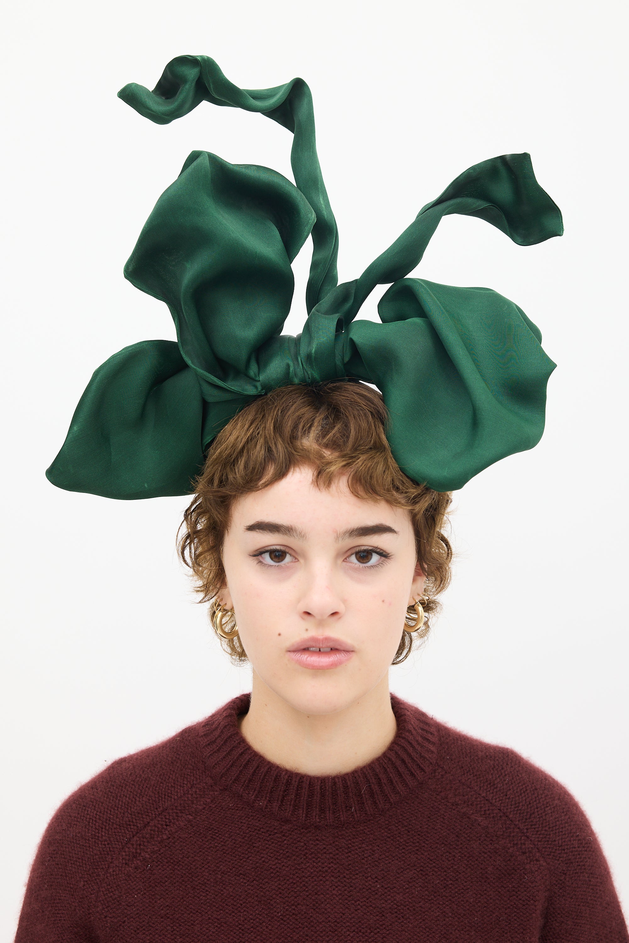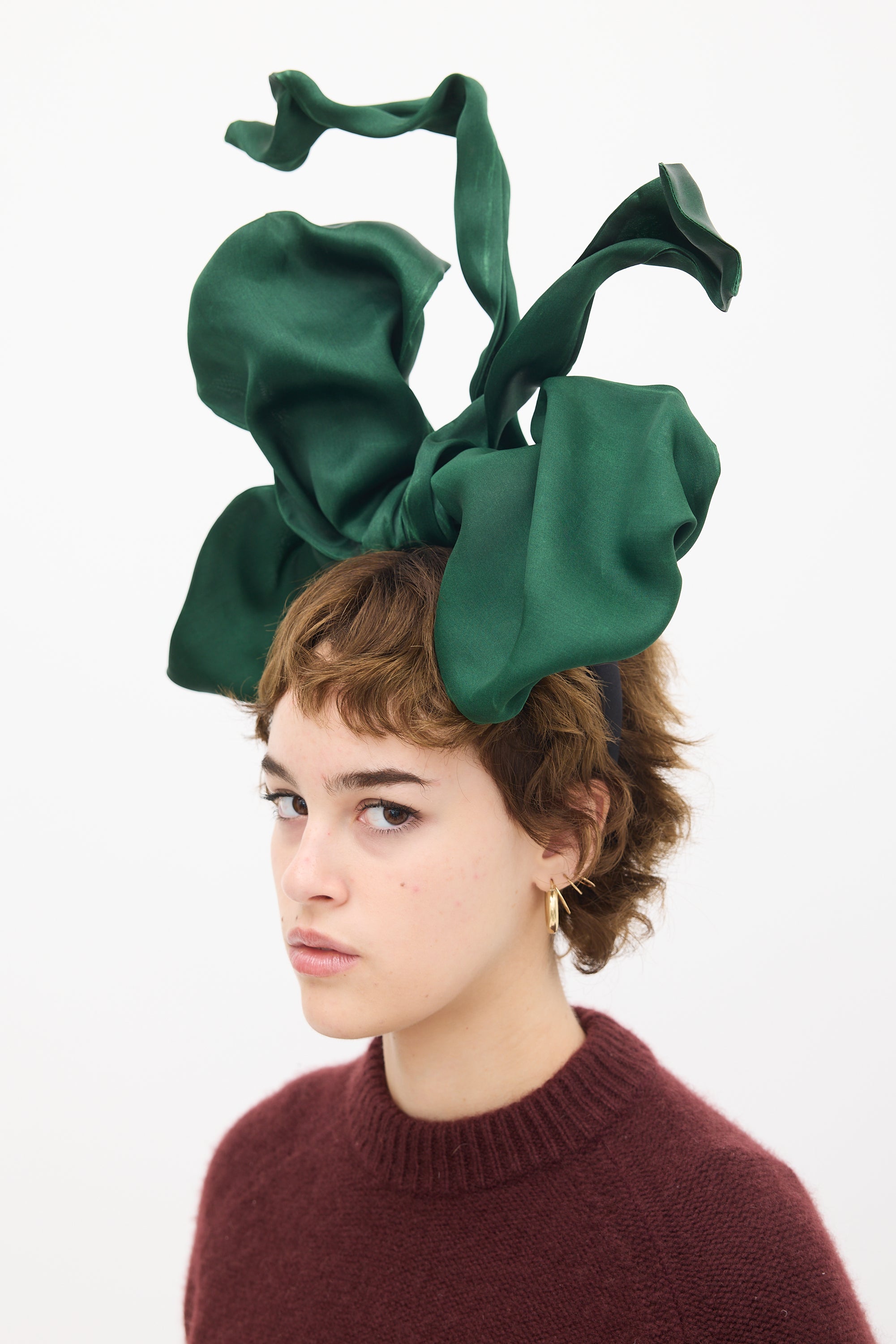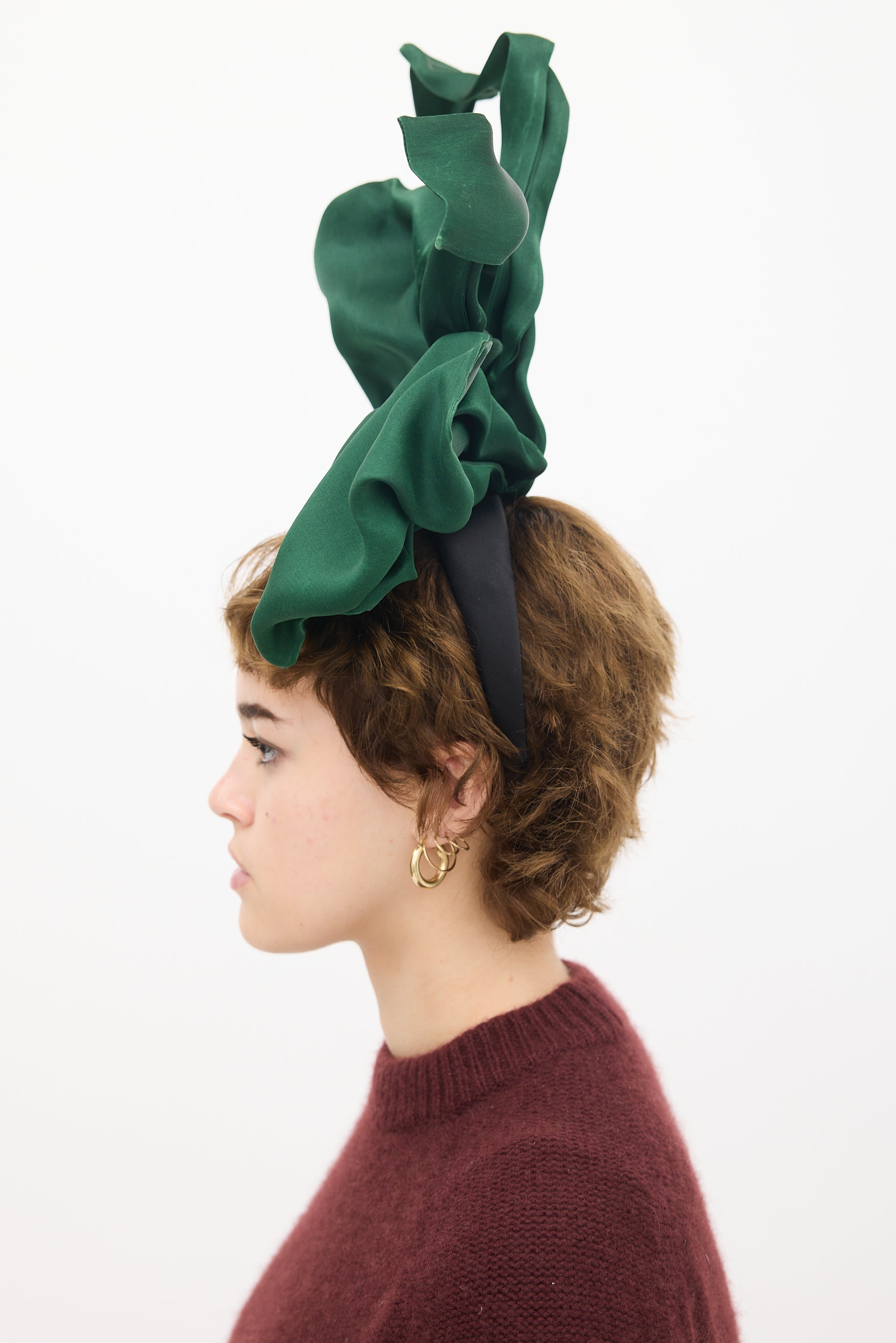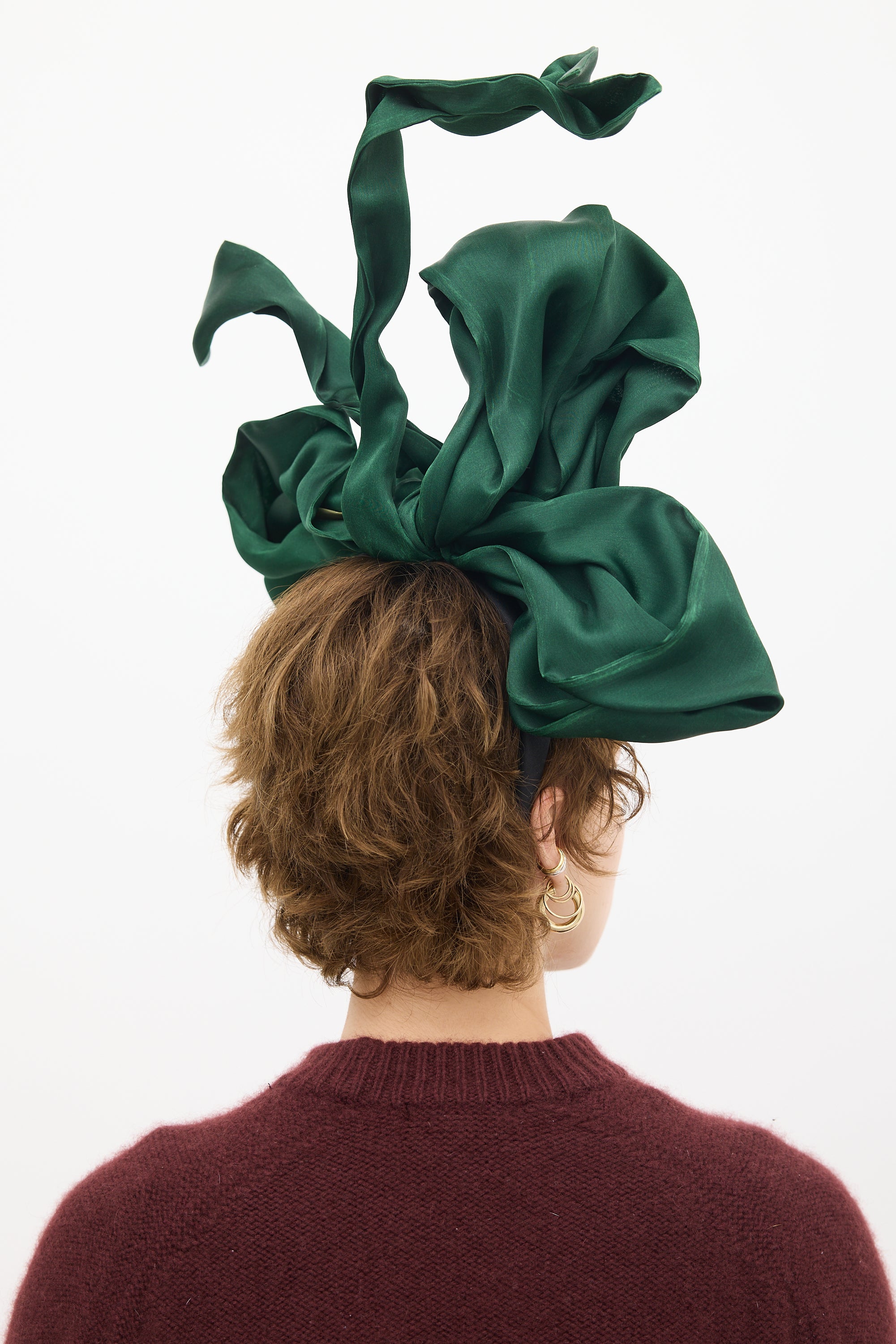 Pre-owned Dolce & Gabbana black satin headband featuring a green structured bow, satin band, and woven grosgrain interior.