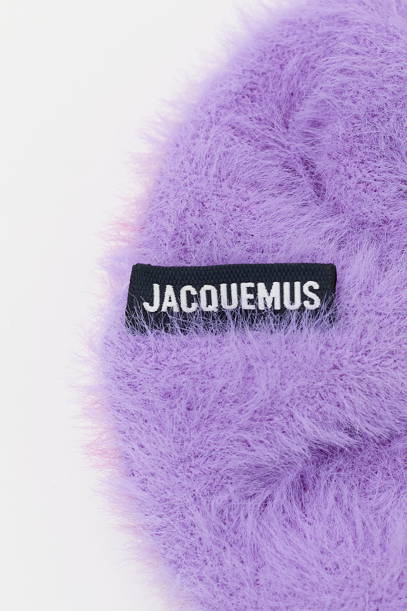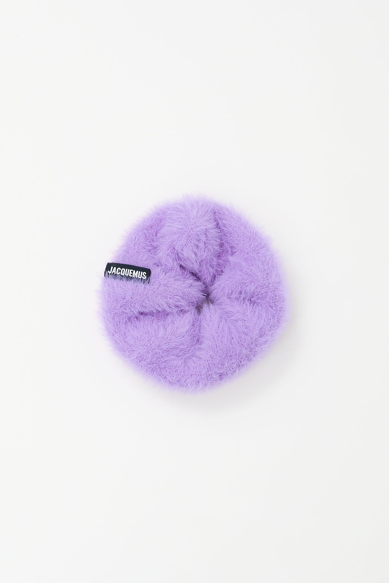 Pre-owned Jacquemus purple LeChouChou scrunchie featuring purple striped middle, extra wide band, and logo tag at back.