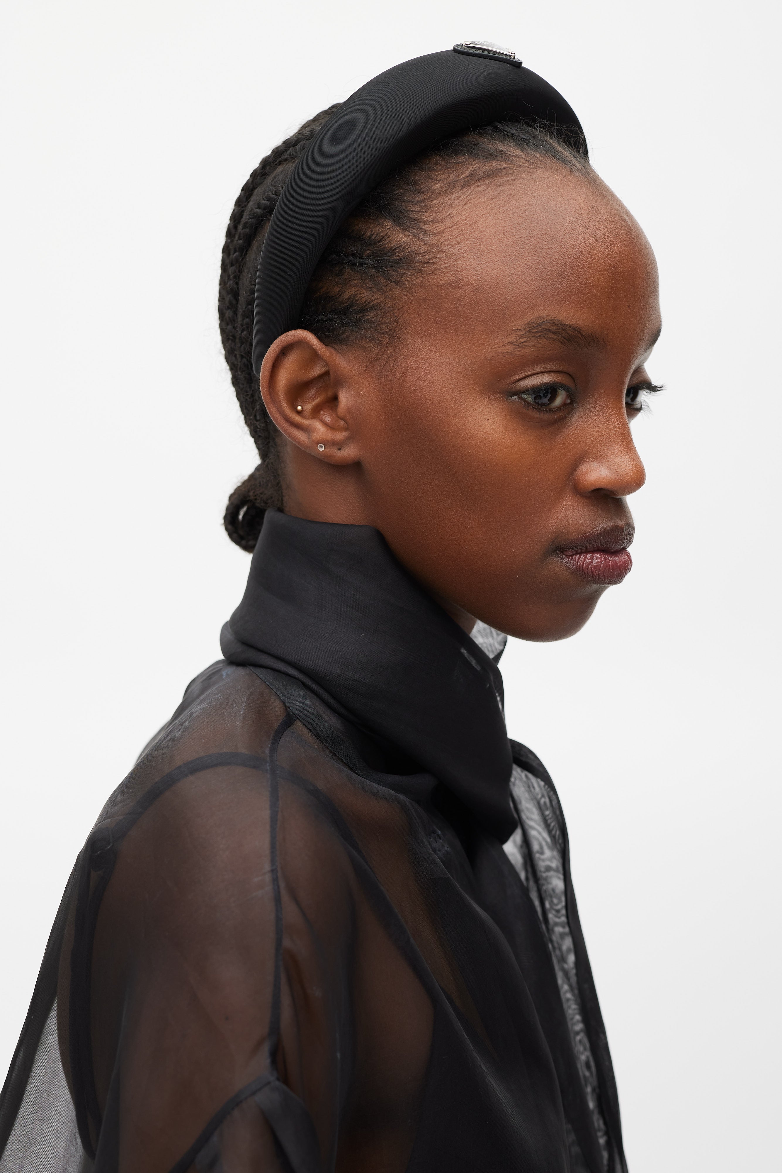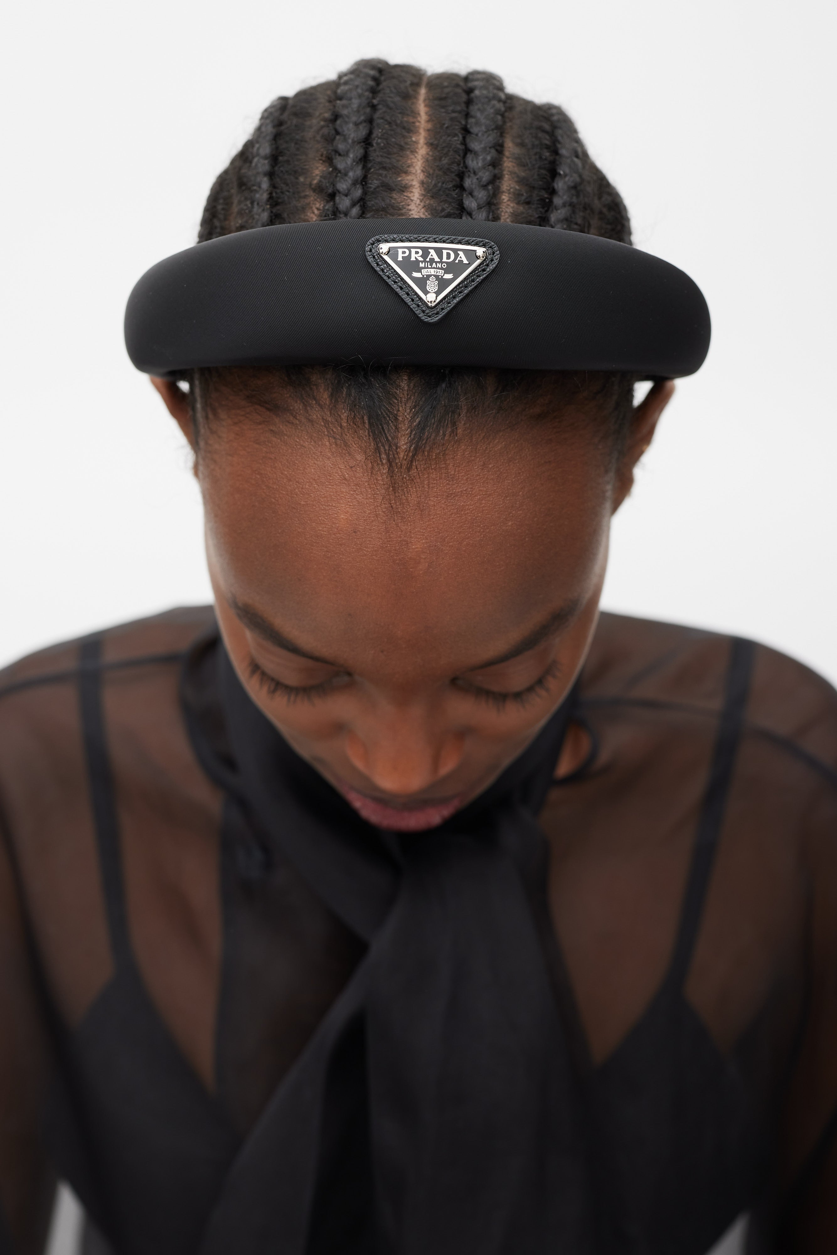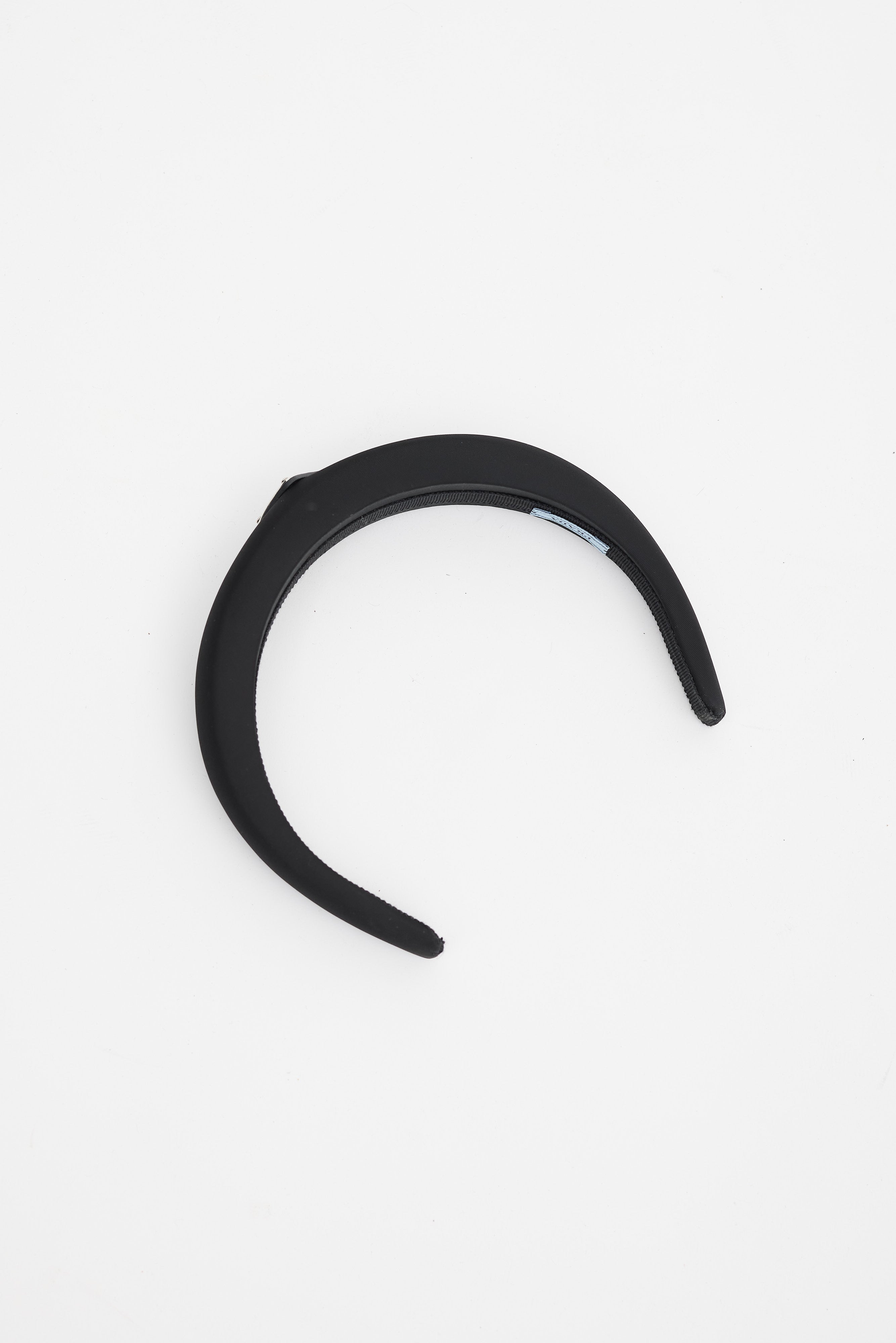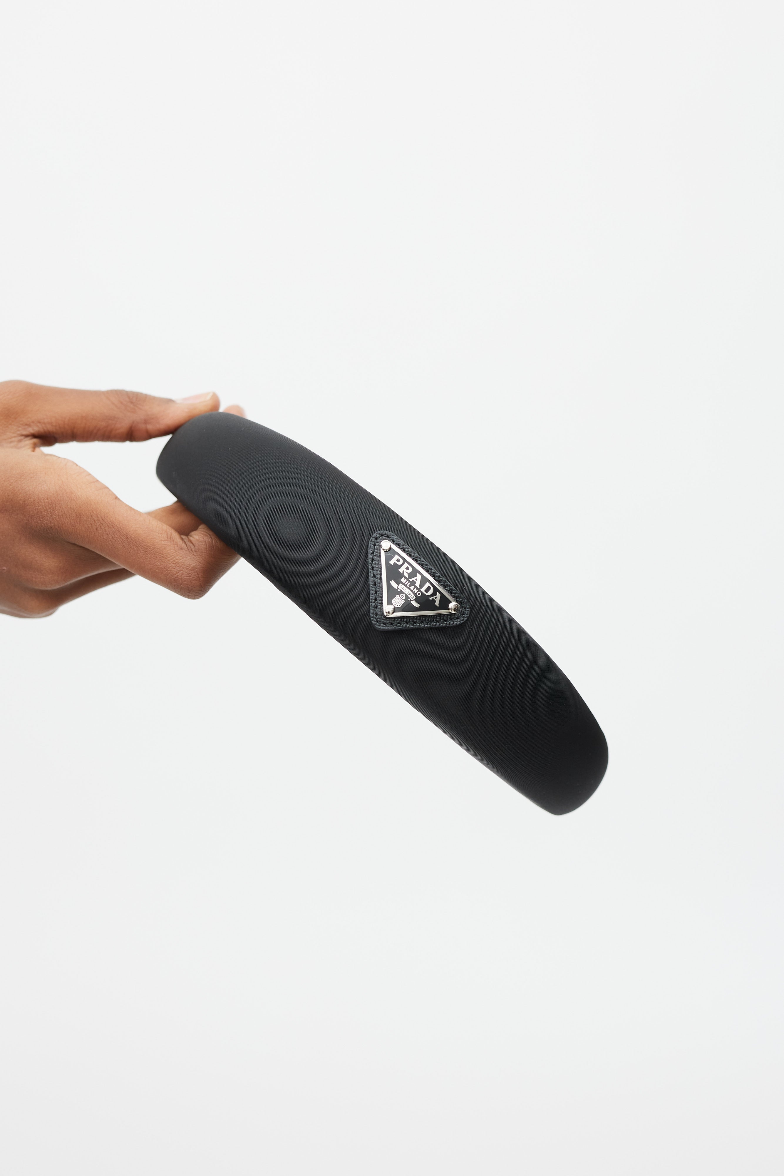 Pre-owned Prada black Re-Nylon headband featuring an enameled triangular metal logo on saffiano leather at top, and webbed trim at interior. Comes with original dust bag.