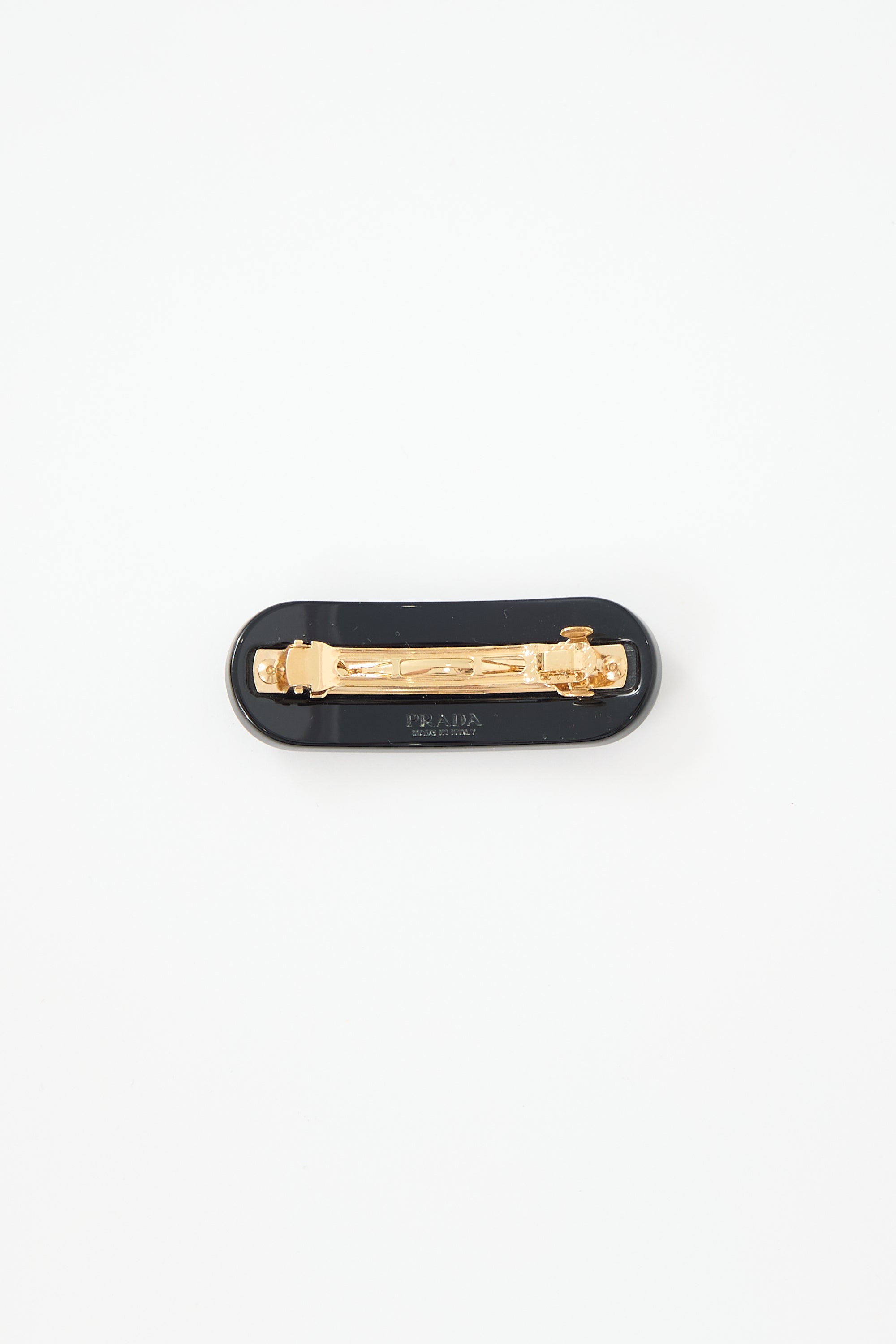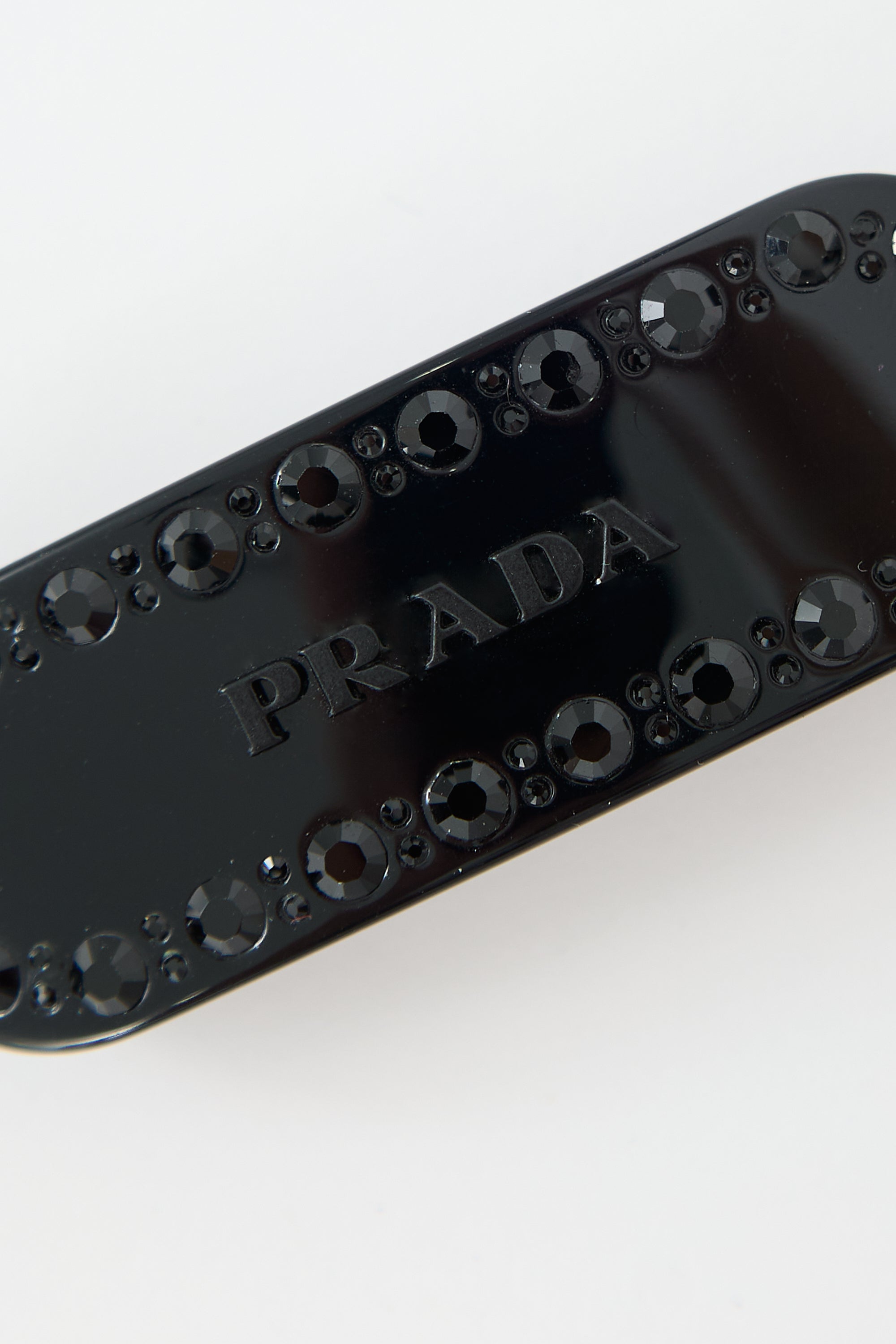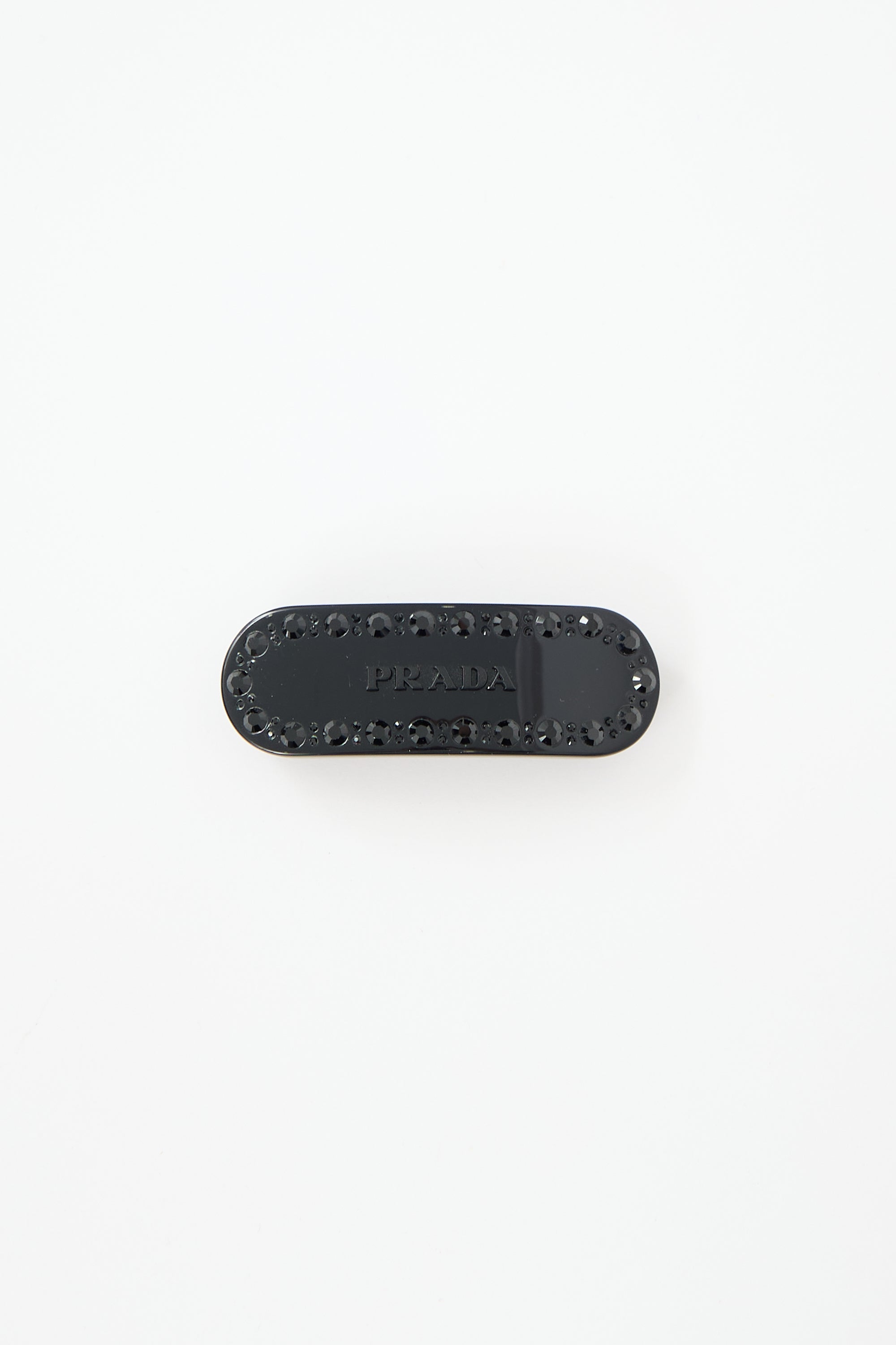 Pre-owned Prada black plexiglass hair clip featuring a rectangular circle shape, tonal crystal embellishments, tonal metal embossed logo, and a gold tone spring barrette closure.