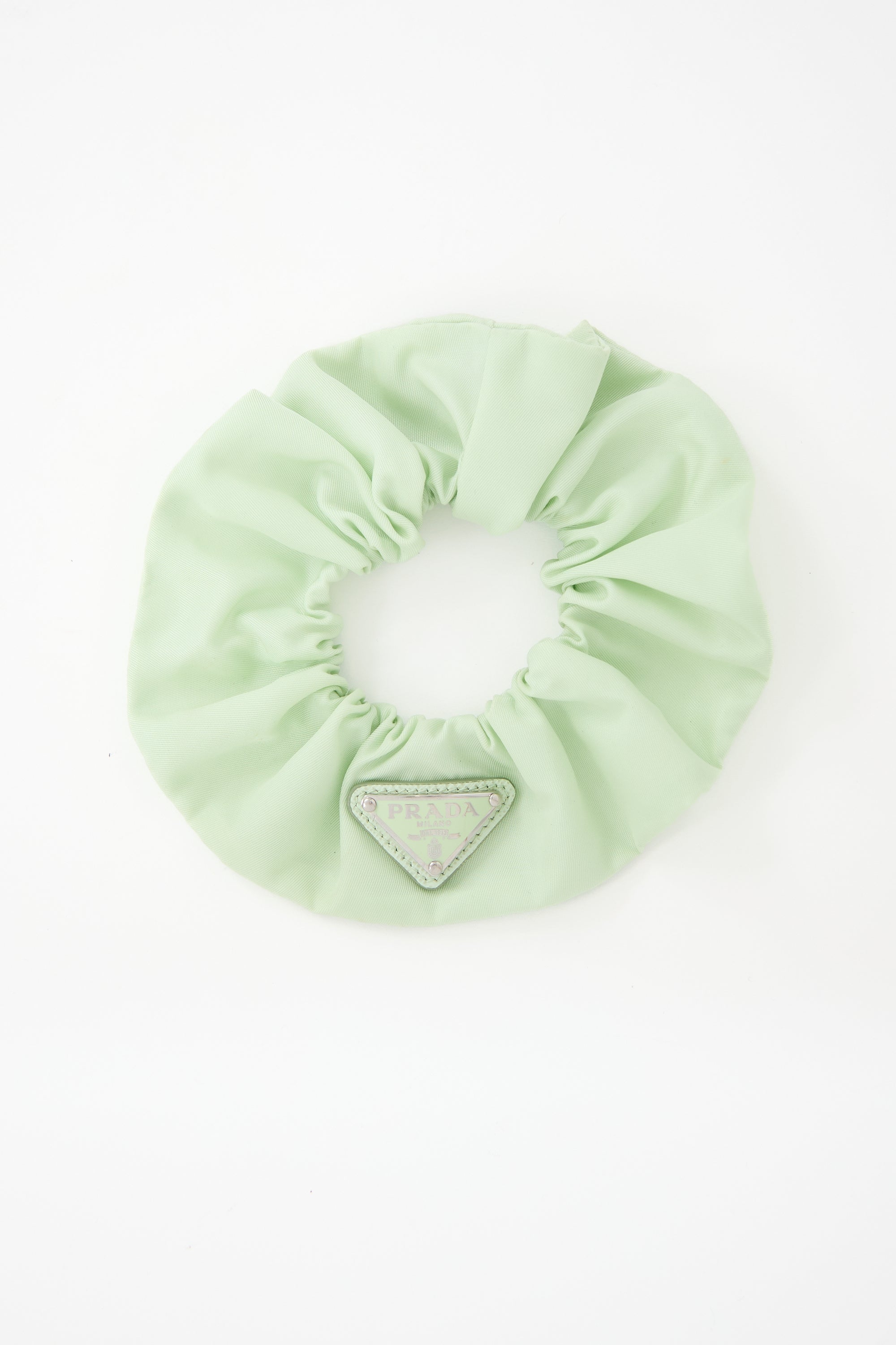 Pre-owned Prada green Re-Nylon scrunchie featuring signature triangle logo plaque and logo tab at reverse.
