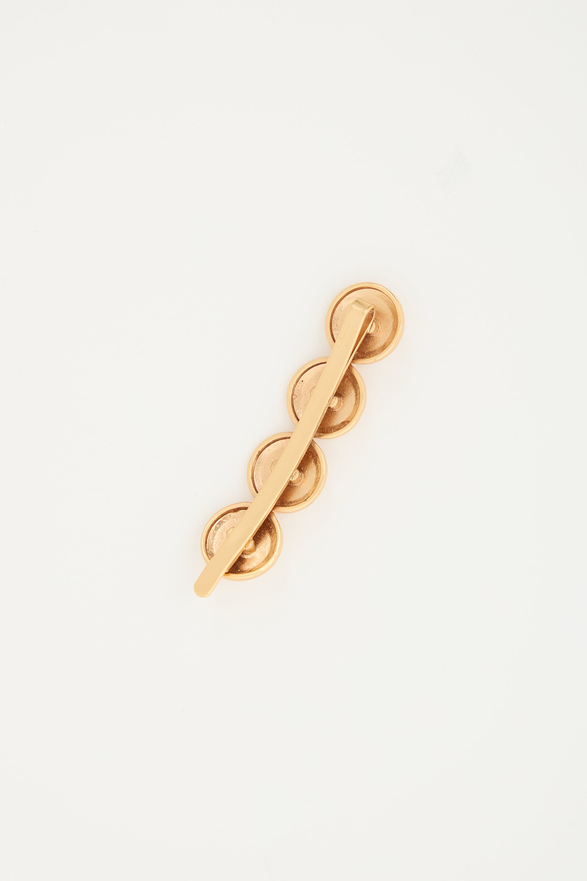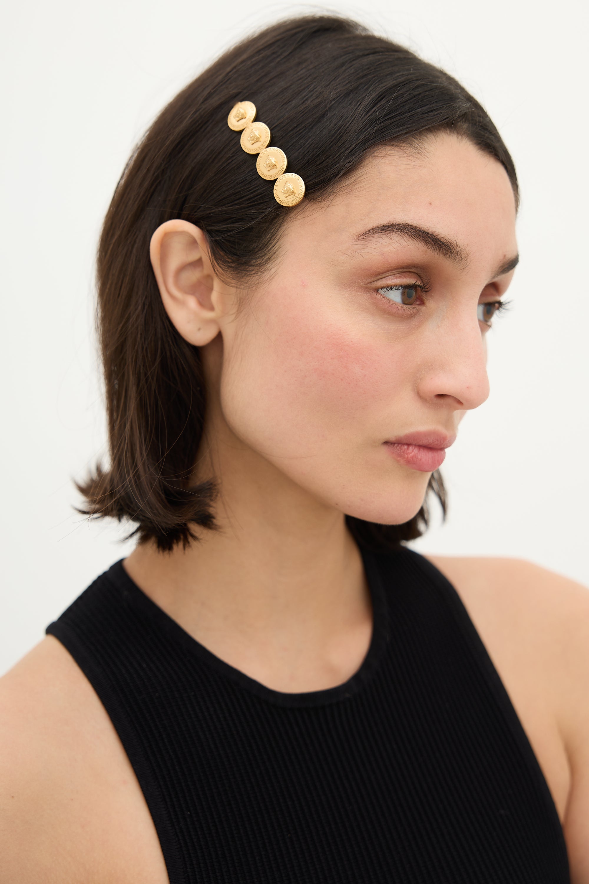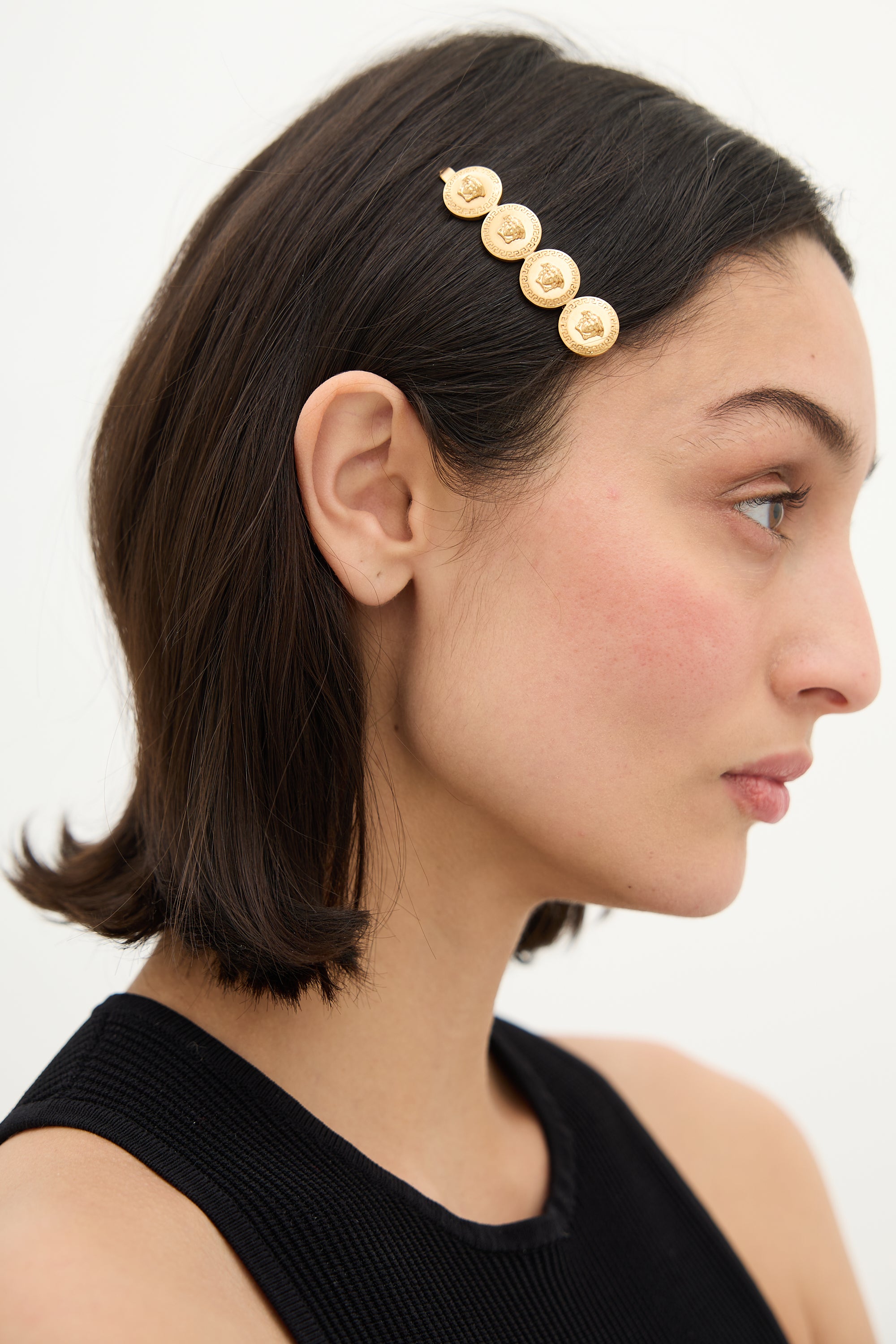 Pre-owned Versace hair clip featuring four gold tone Medusa Tribute medallions and slide clip fastening.