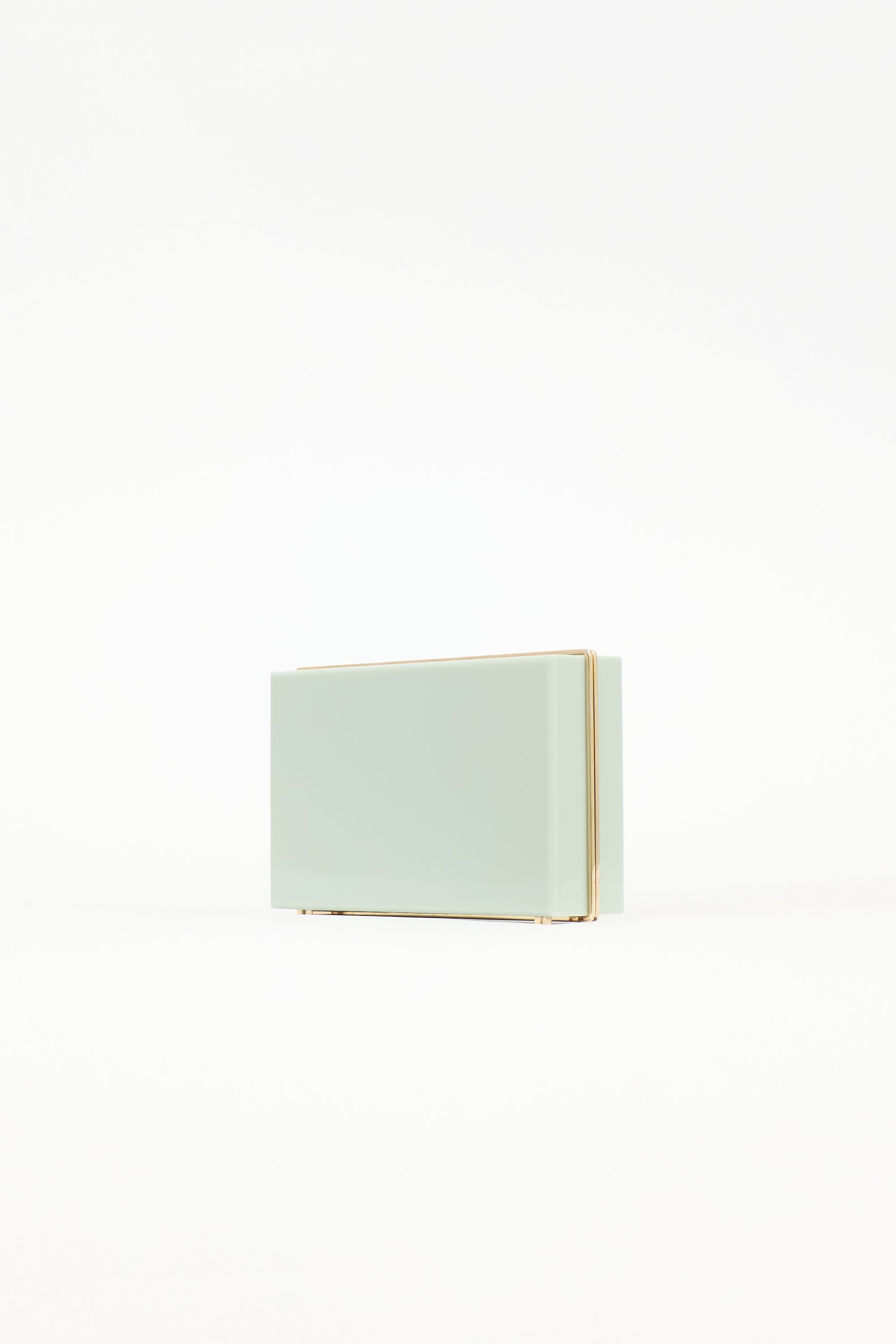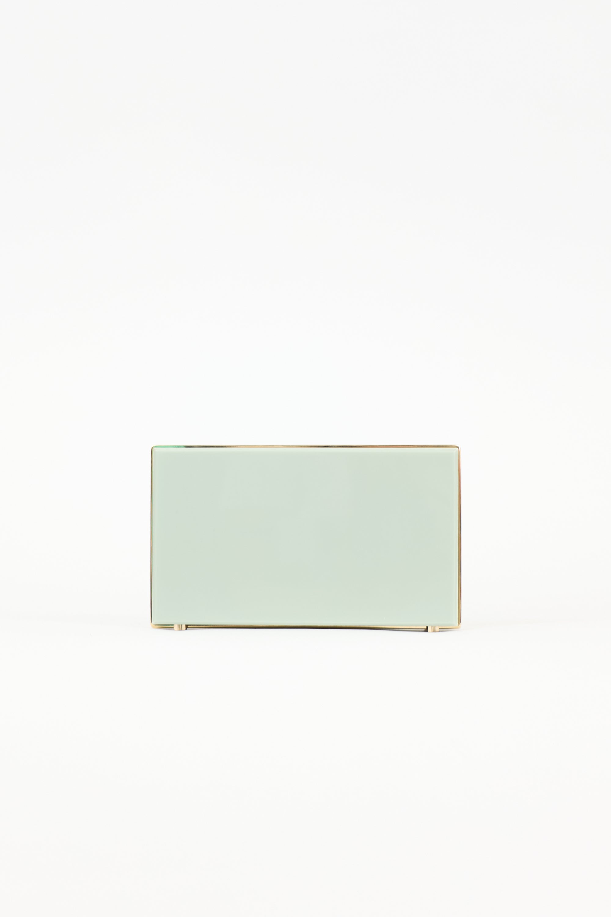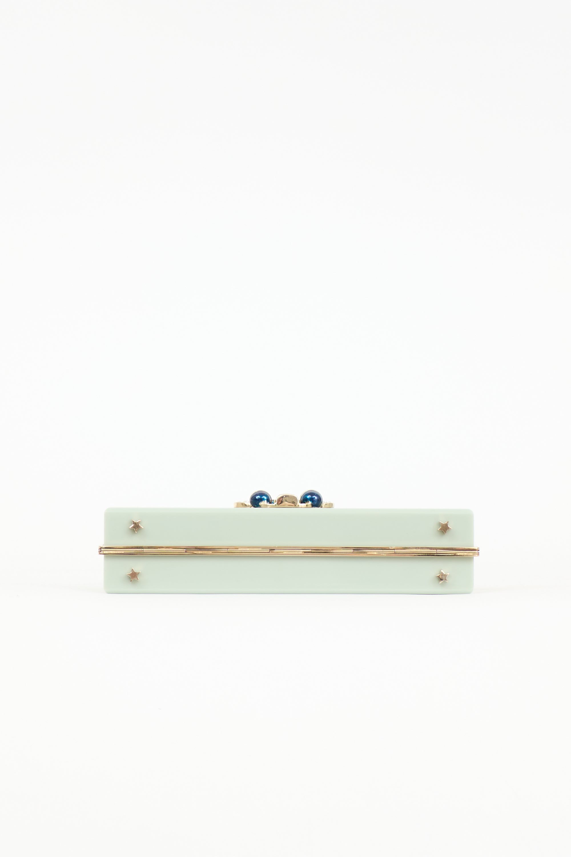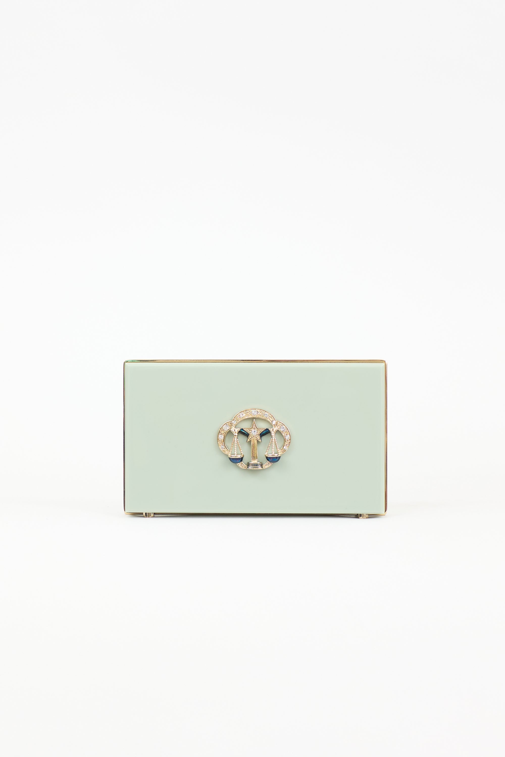 Pre-owned Charlotte Olympia green Libra clutch featuring gold tone hardware, metal protective feet in star motif, crystal embellished Libra hardware, magnetic top closure, and detachable gold zip pouch.