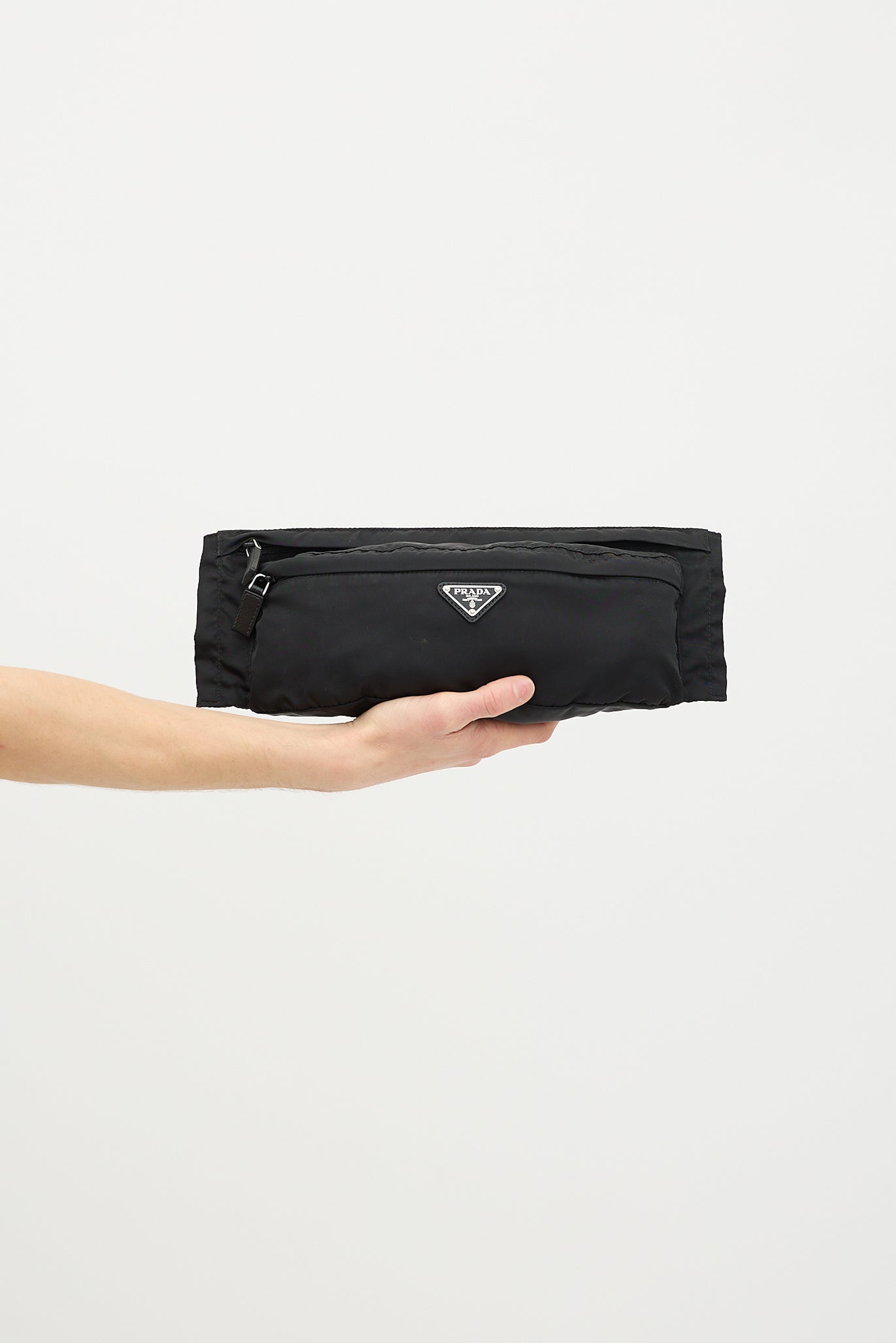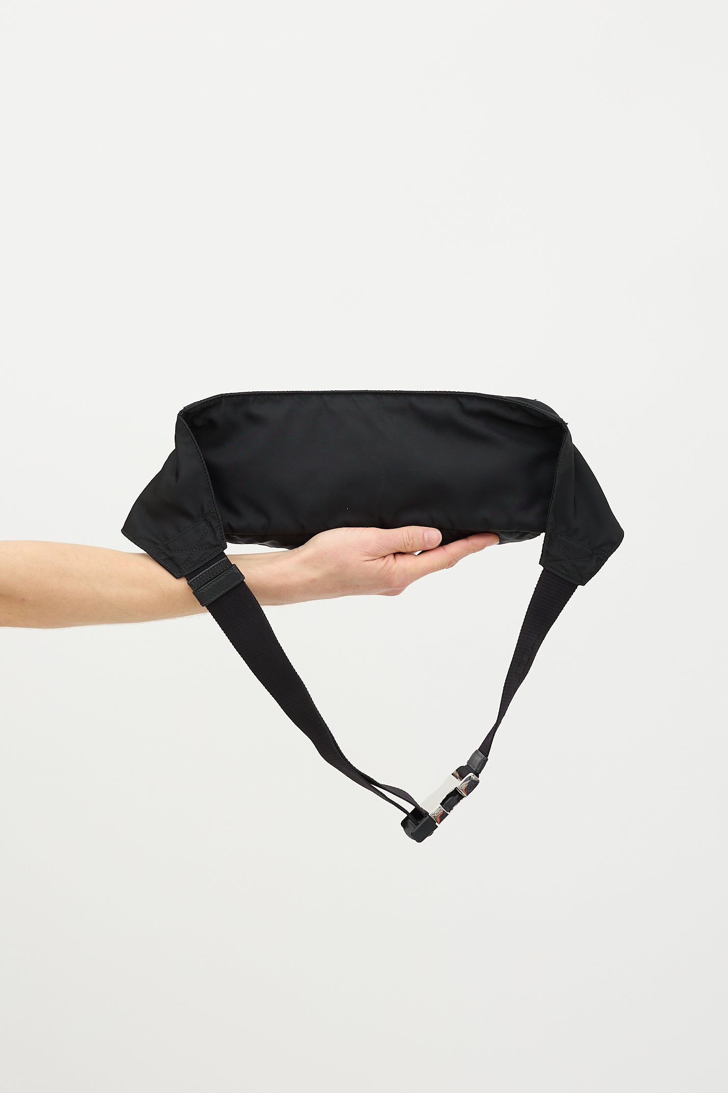 Pre-owned Prada black Re-Nylon belt bag featuring triangle logo plaque at front, adjustable logo strap, back zip compartment, and one lined main compartment with zip closure. Comes with original dust bag.
