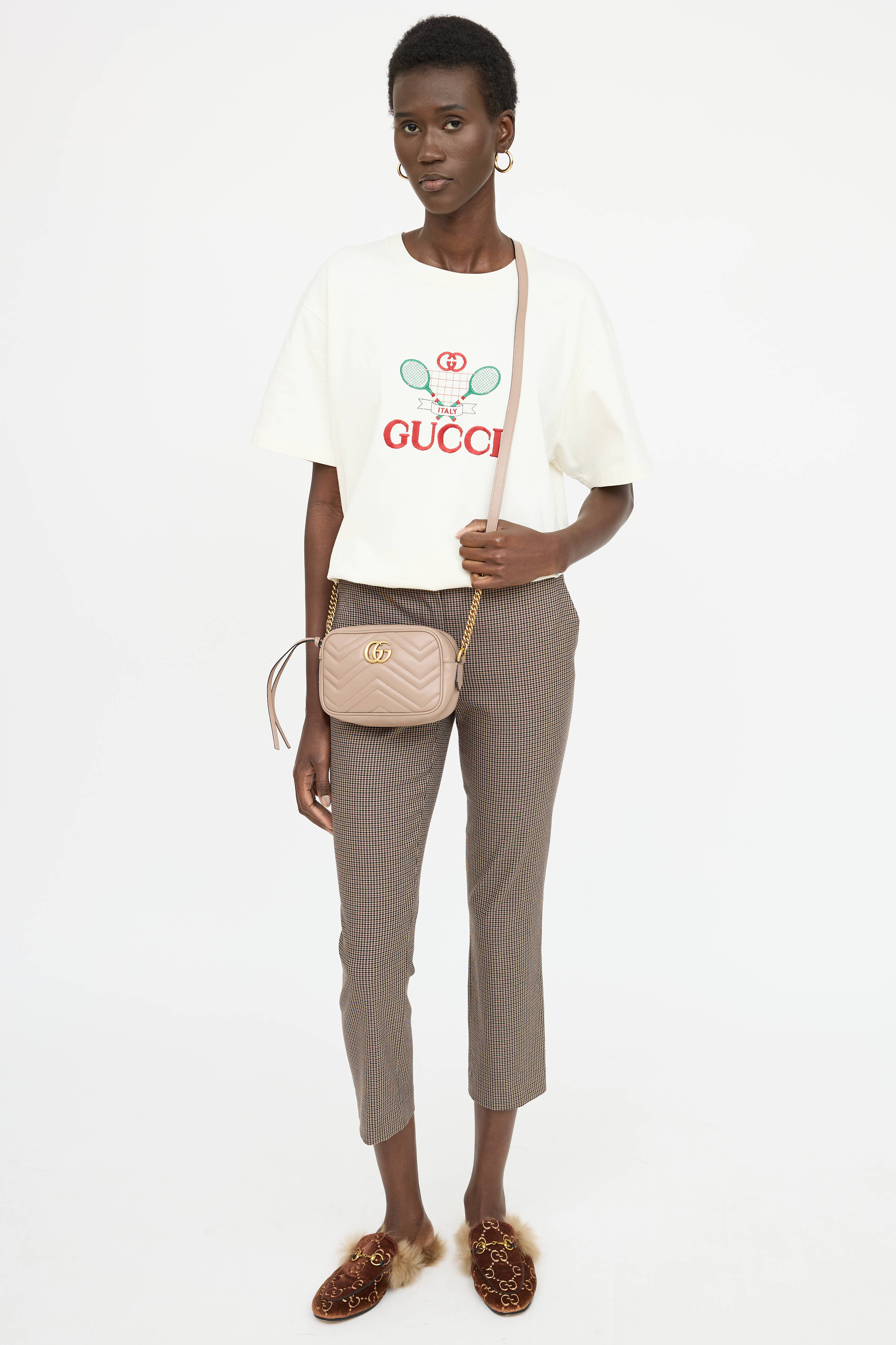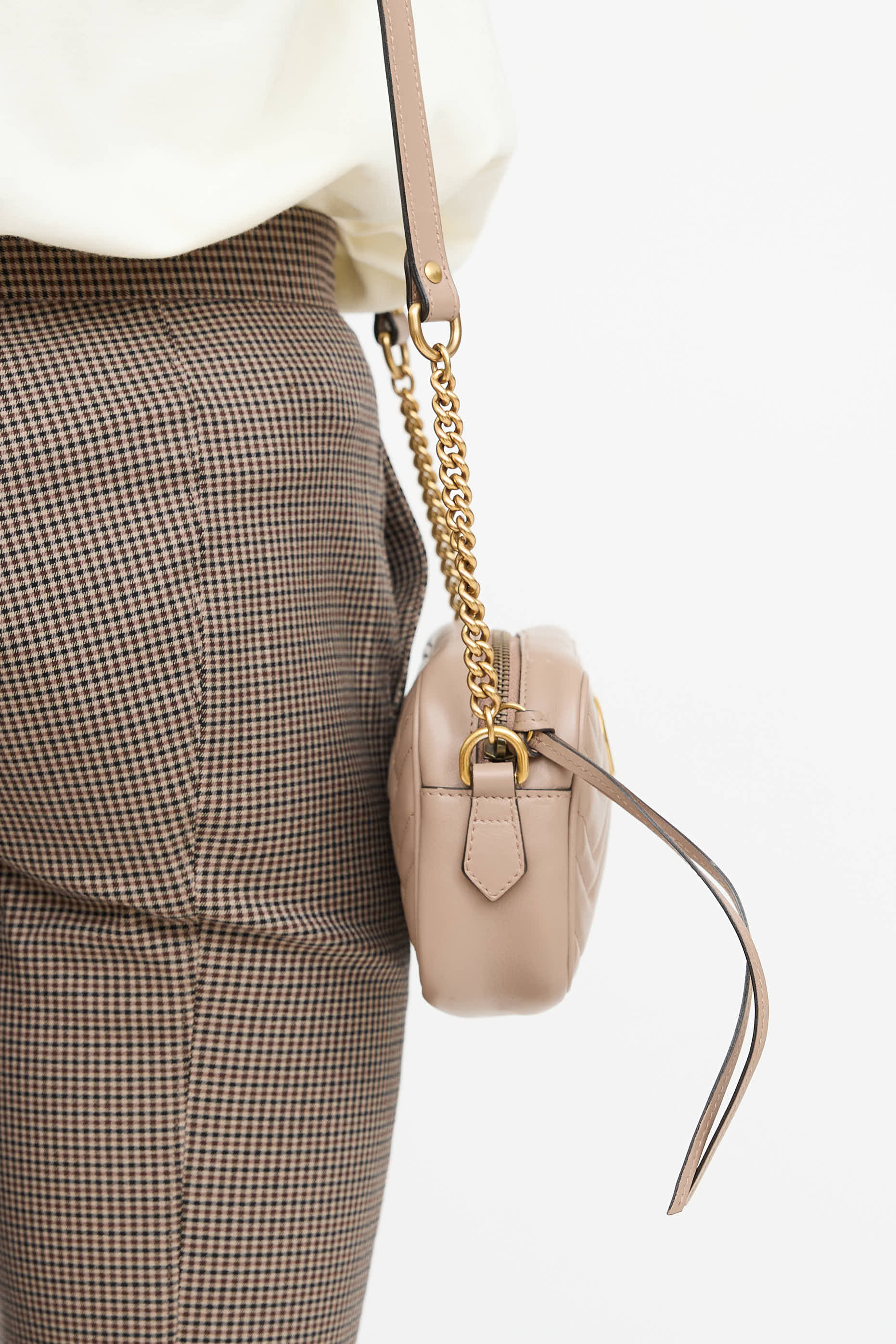 Pre-owned Gucci taupe GG Marmont mini camera bag featuring quilted chevron matelassé technique on front and back, GG logo at front, quilted GG design at back, zip closure at top, adjustable chain-link and leather shoulder strap and gold tone hardware, and one main compartment with one leather slip pocket.