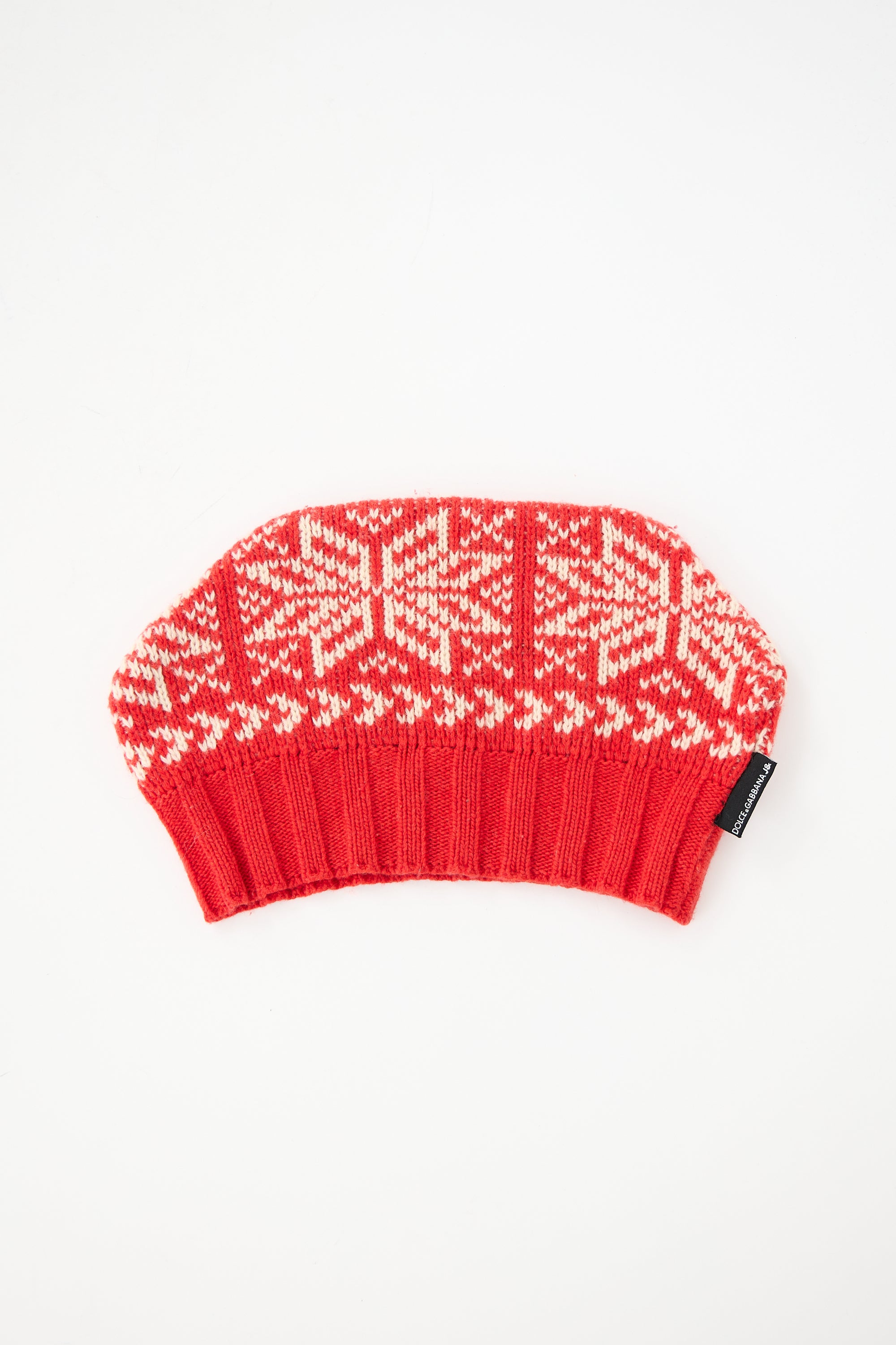 Pre-owned Dolce & Gabbana J&ANS red and white knit beanie featuring Fairisle pattern, ribbed brim, and logo tab at side.