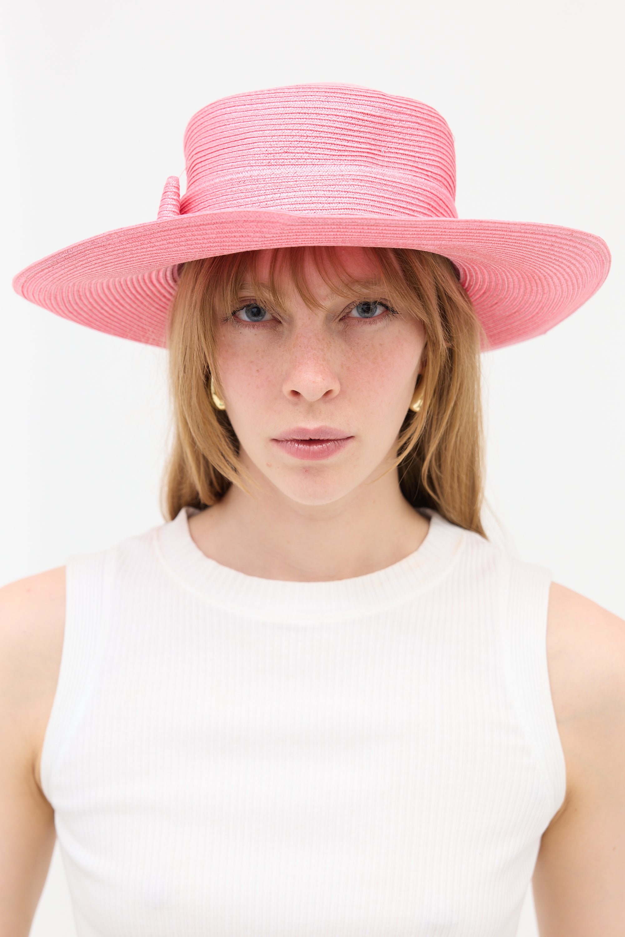 Pre-owned Gucci pink woven hat featuring a wide brim, tonal band with knotted bow, gold tone GG logo hardware, and interior grosgrain trim.