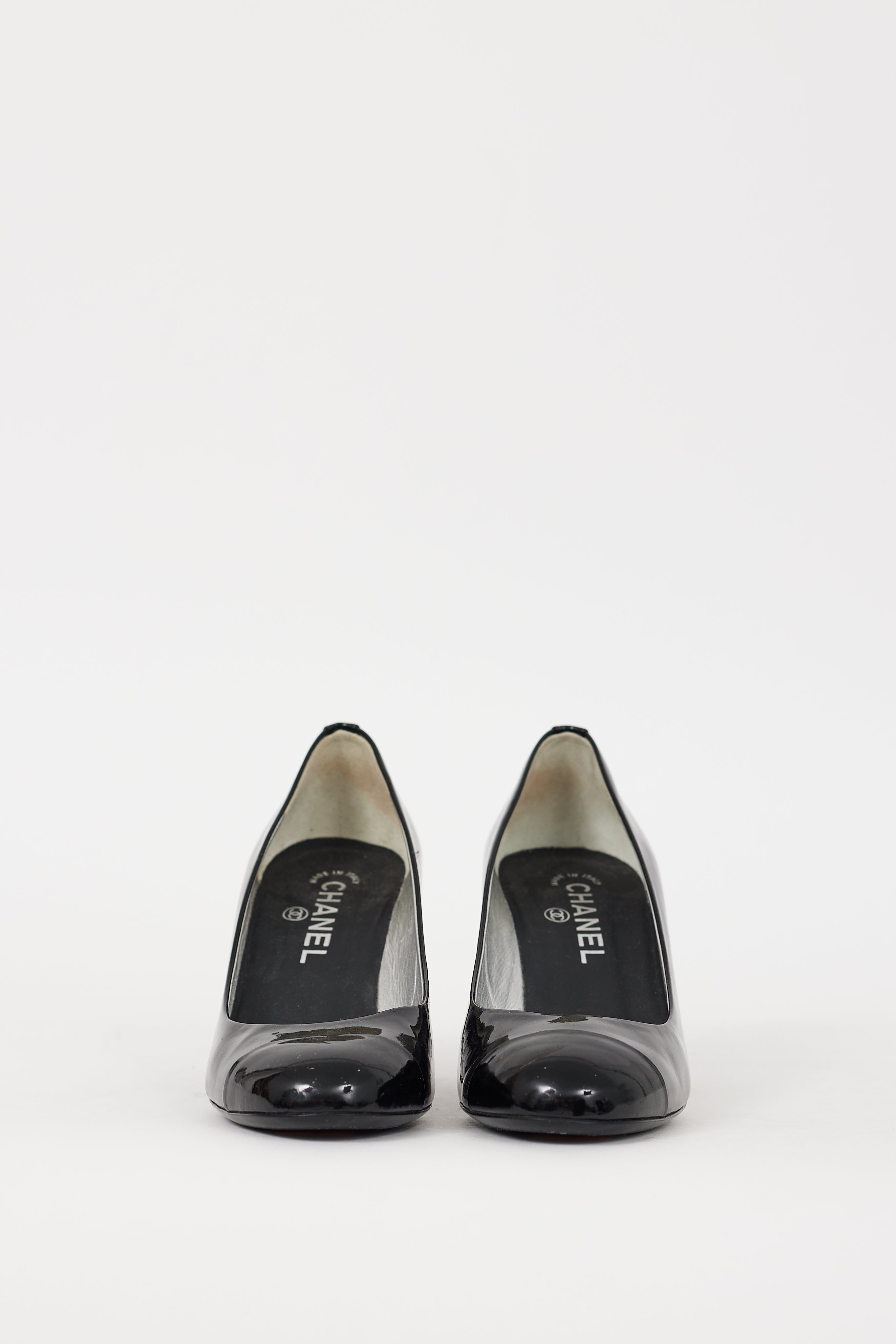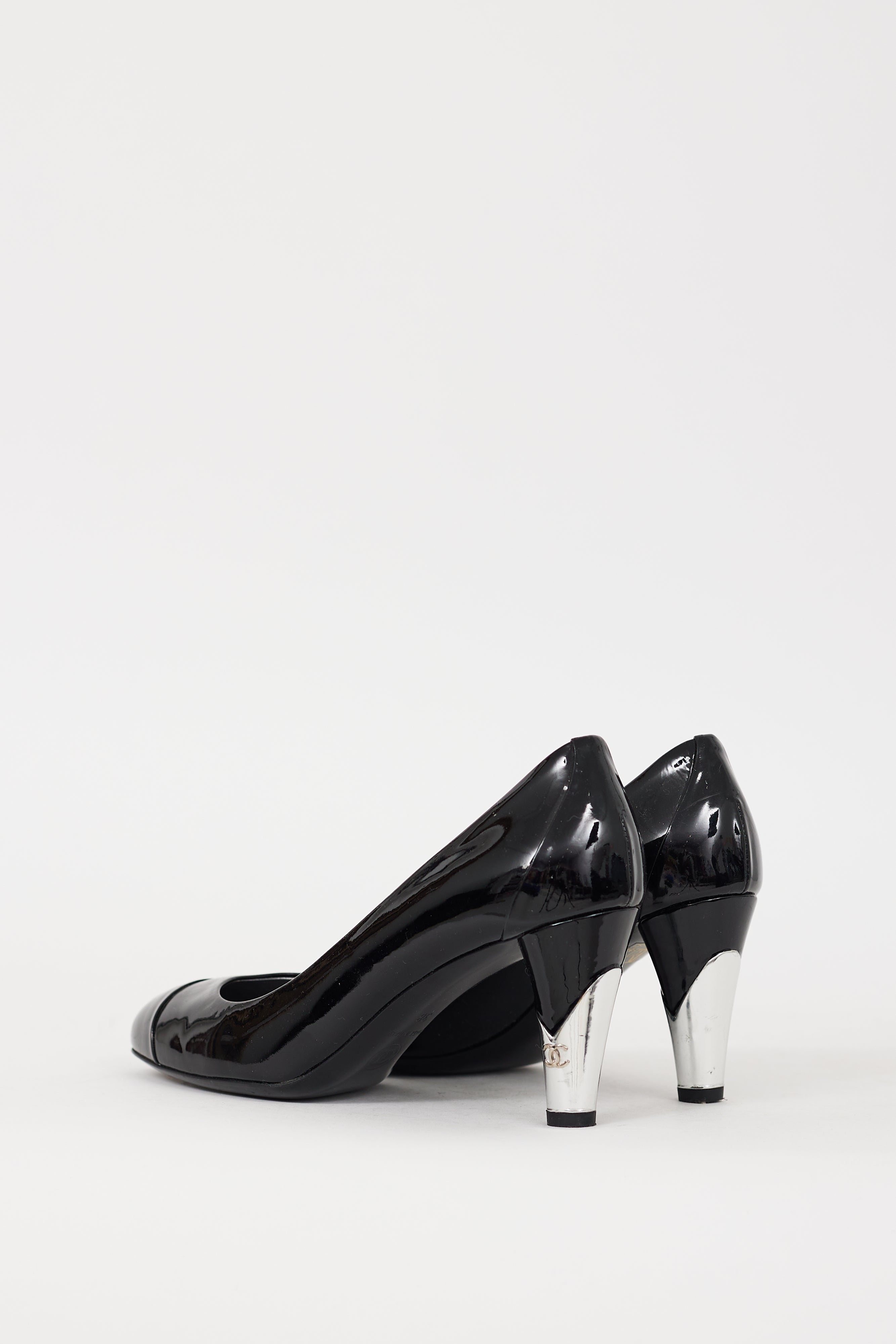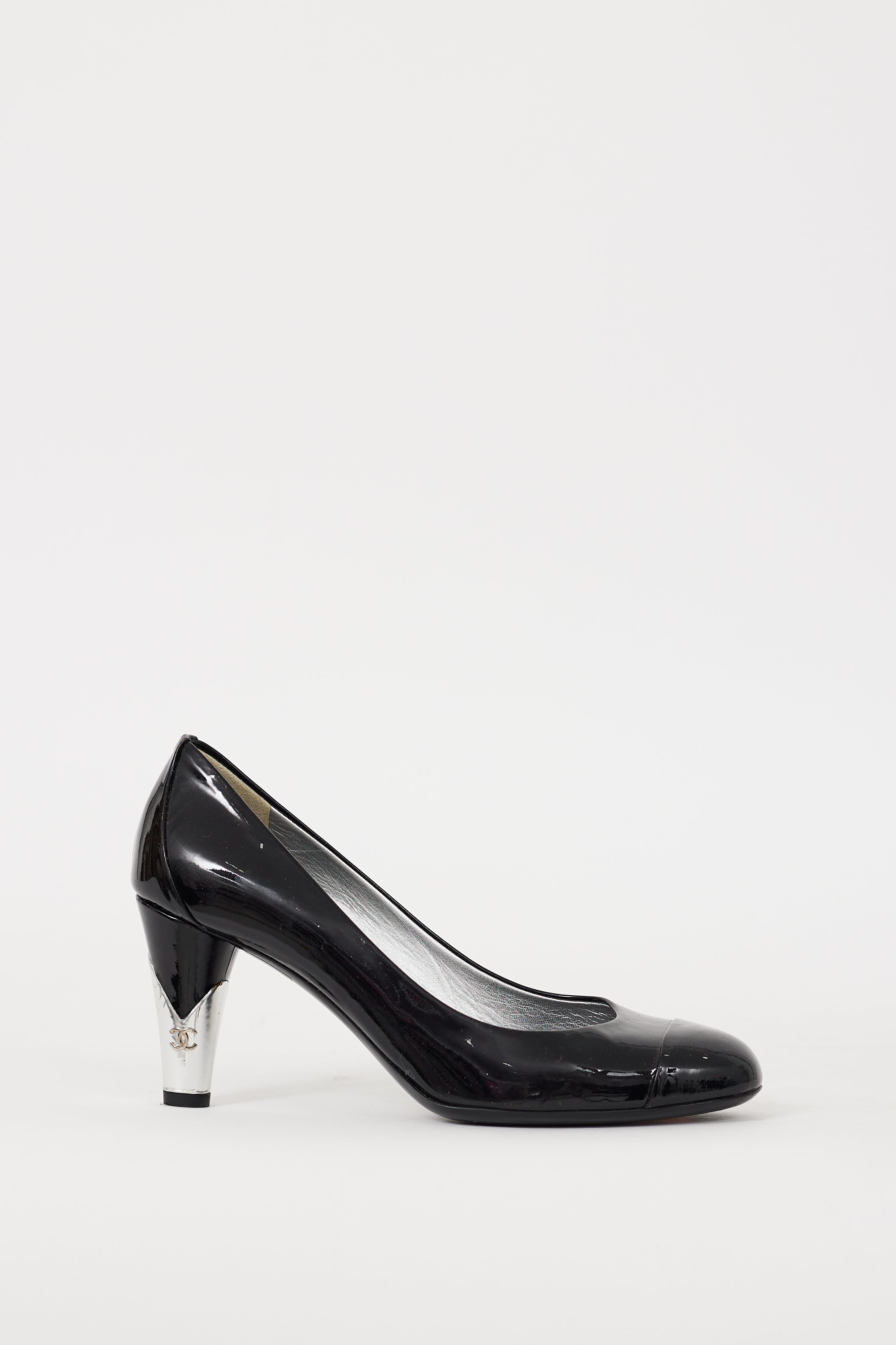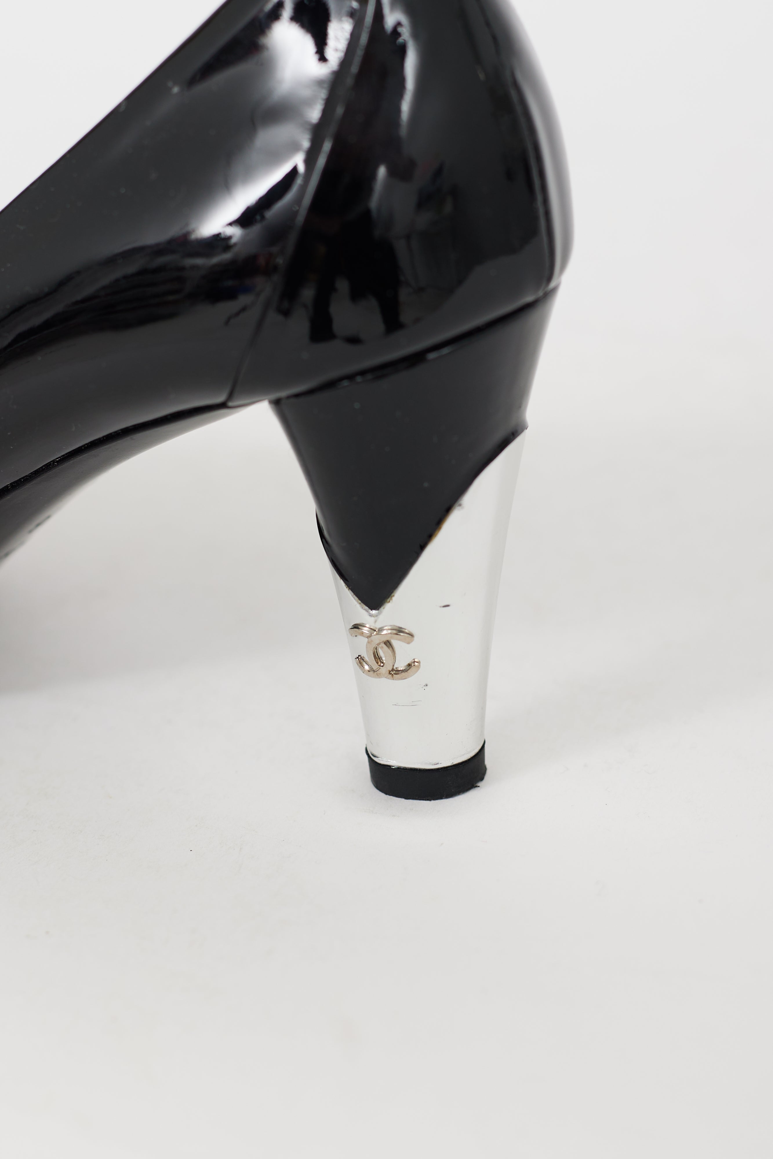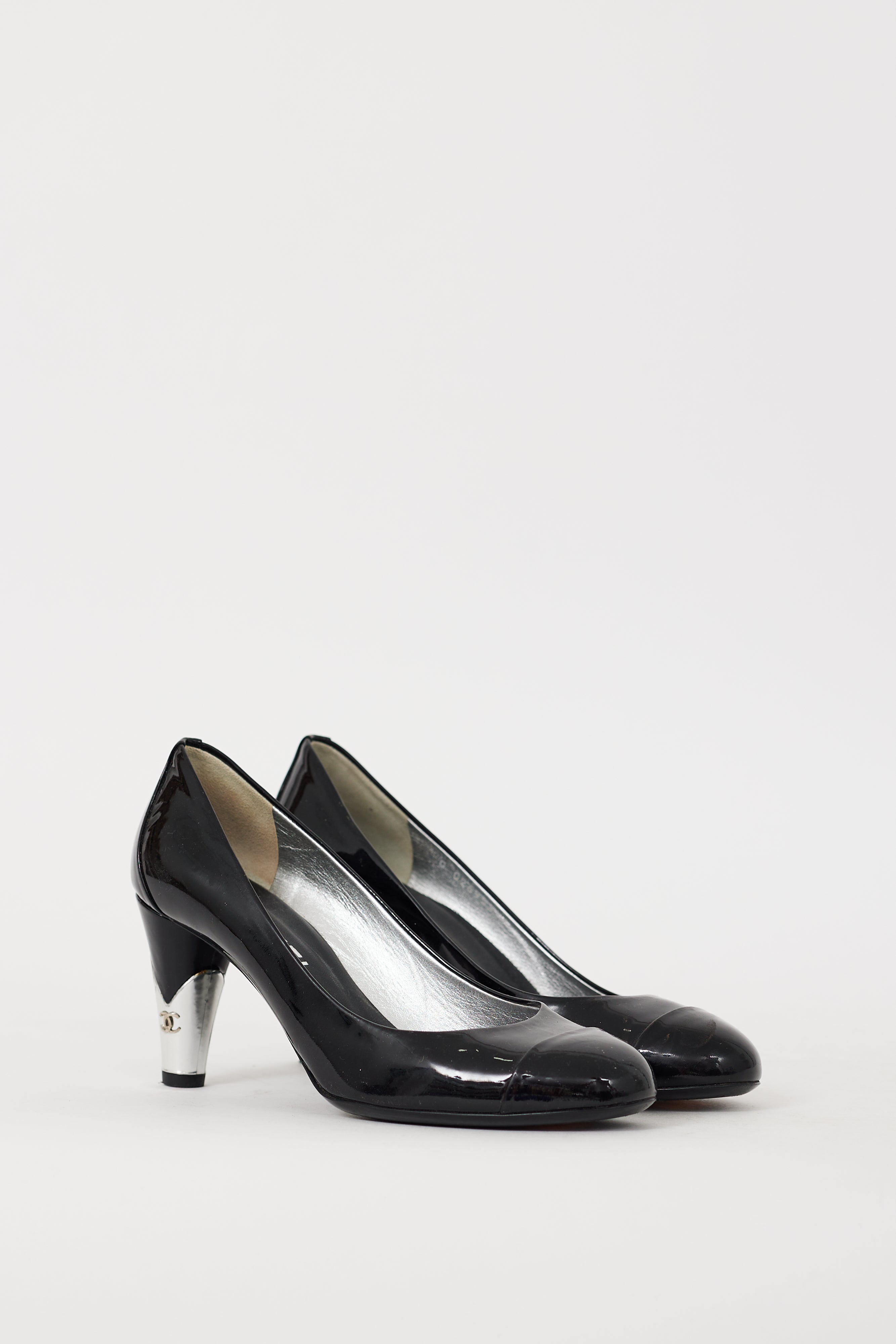 Pre-owned Chanel 2010 black patent leather pumps featuring a round toe, wrapped silver tone heel with tonal CC logo hardware, and slip on entry.