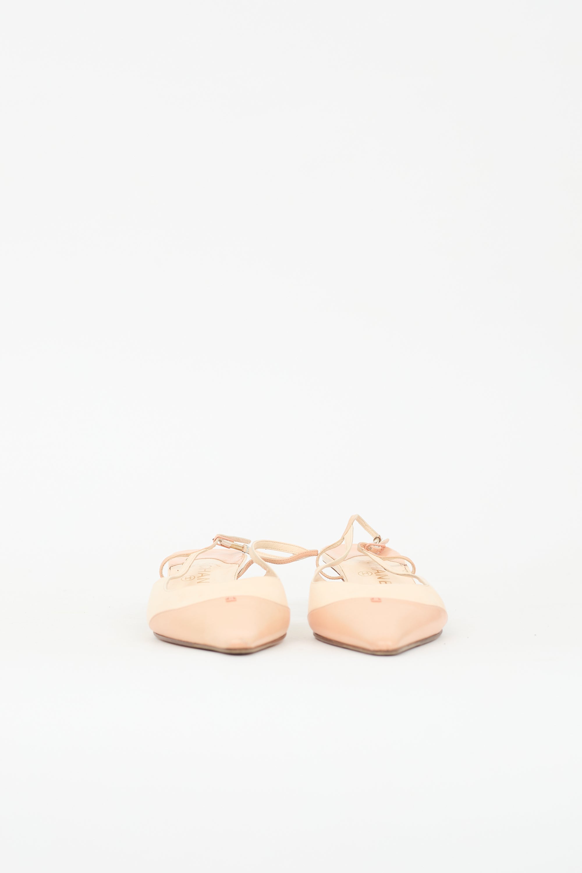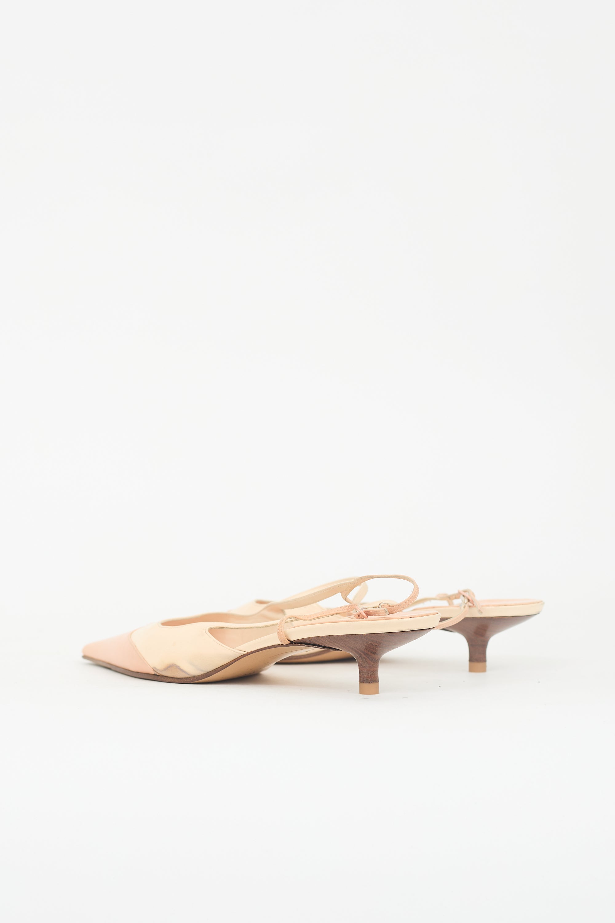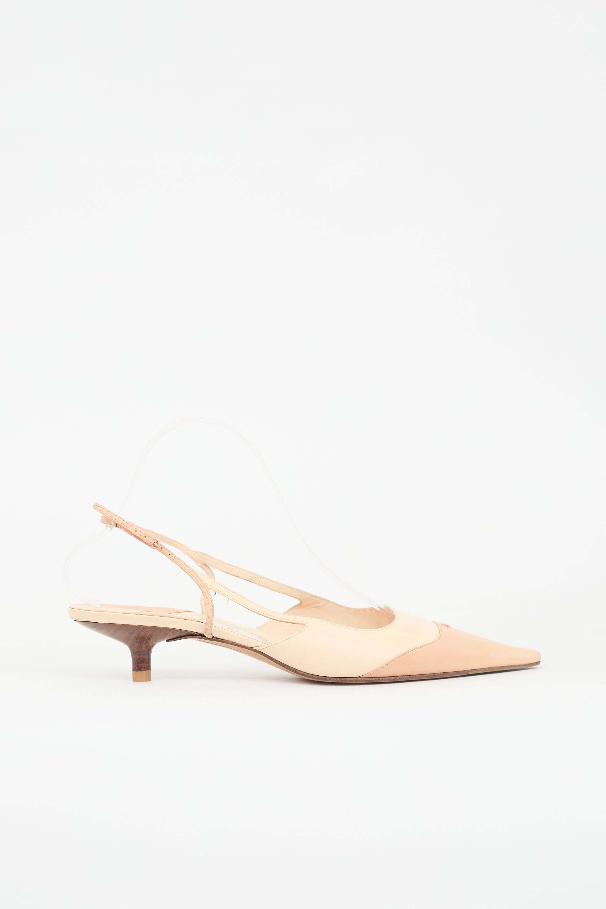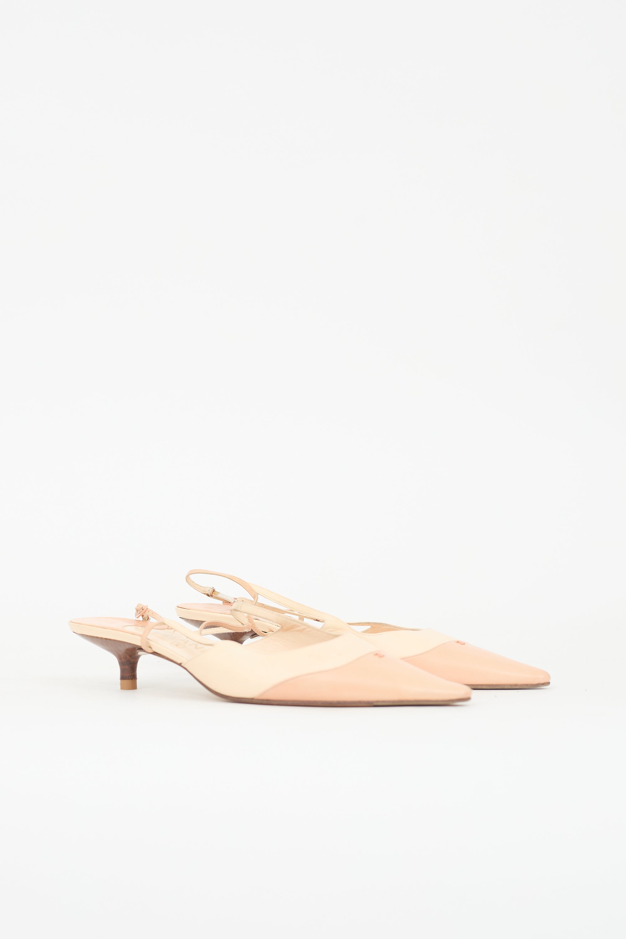 Pre-owned Chanel pink and beige leather heels featuring a pointed toe with tonal CC logo embellishment, adjustable slingback strap, and kitten heel.