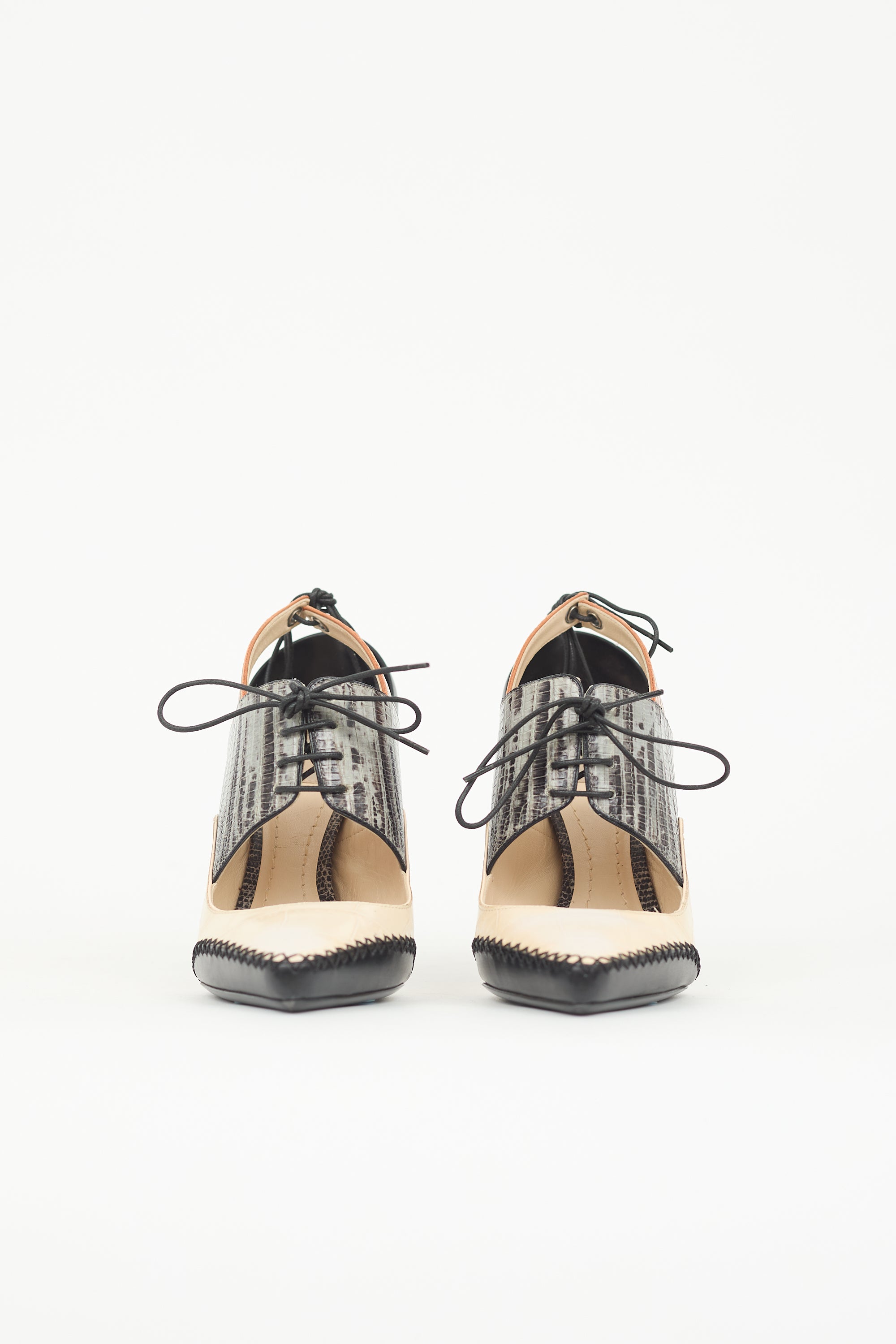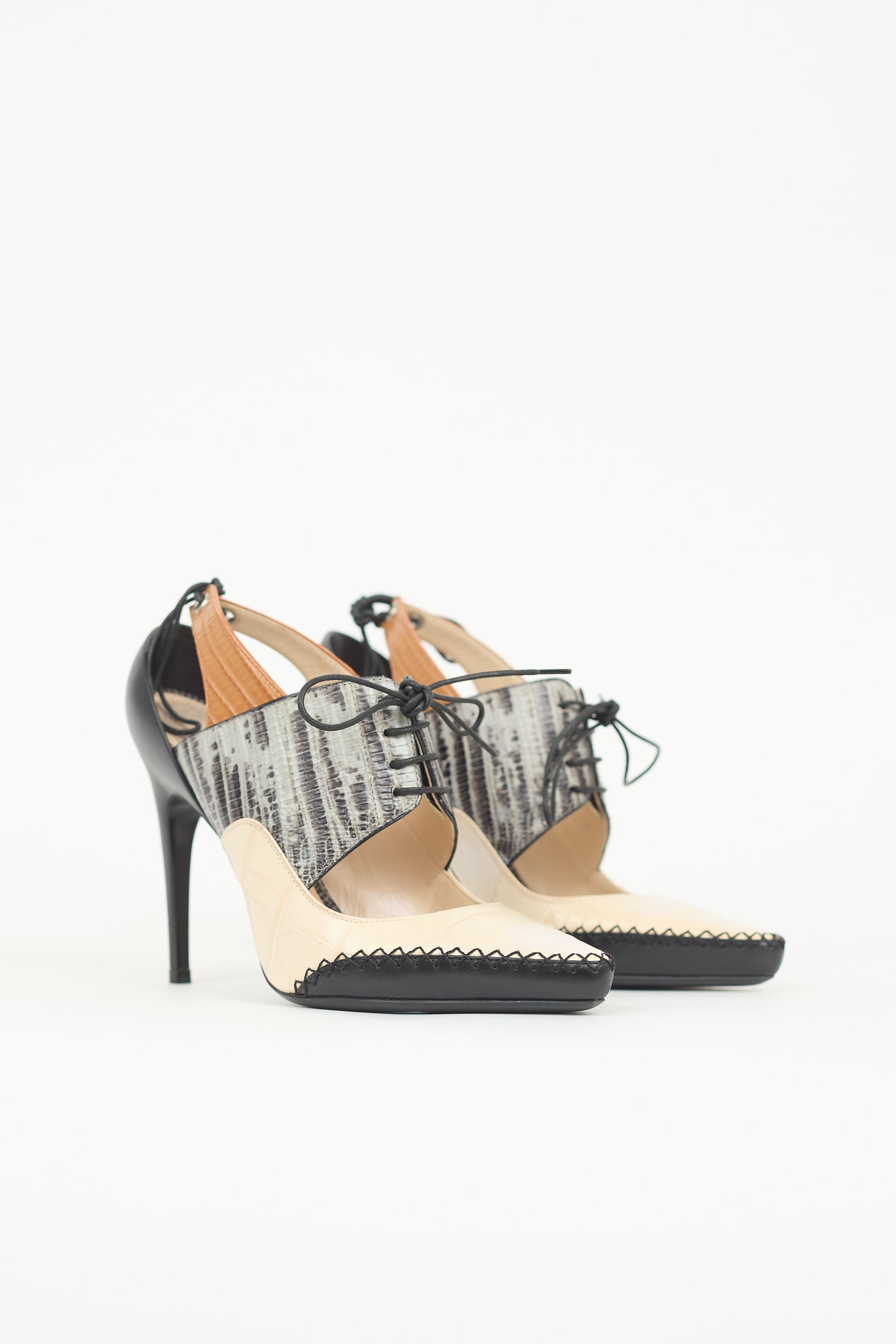 Pre-owned Dior Fall Winter 2016 cream and black crocodile embossed leather Nomade heels featuring a pointed toe with topstitching, grey strap across vamp with lace up front, brown strap at ankle with self-tie fastening, and a covered counter and stiletto heel.