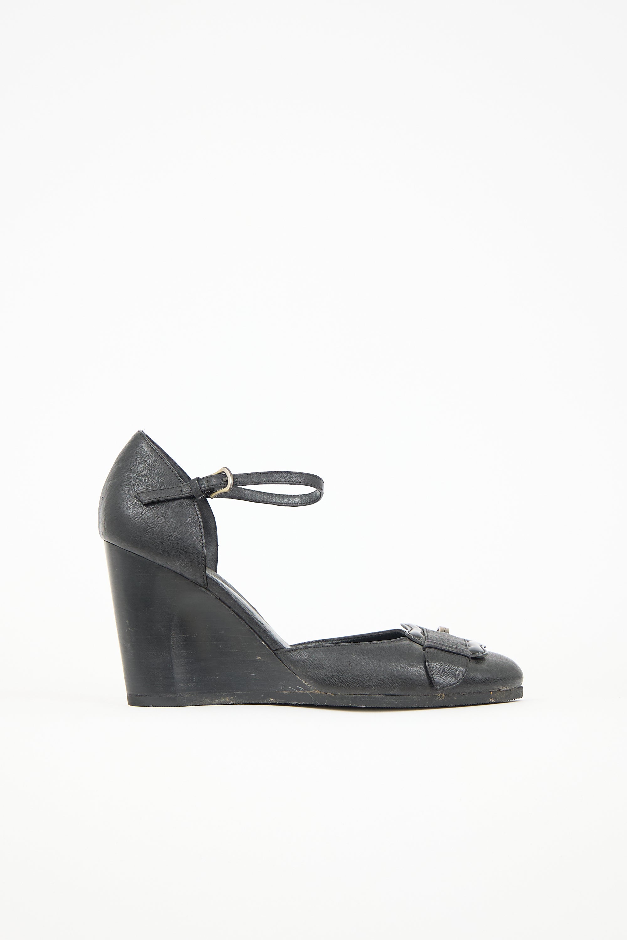 Pre-owned Fendi black leather D'orsay heels featuring a rounded toe, patent leather buckle at vamp with logo cutout at pin, covered counter, adjustable ankle strap with buckle closure, and a stacked wedge heel.