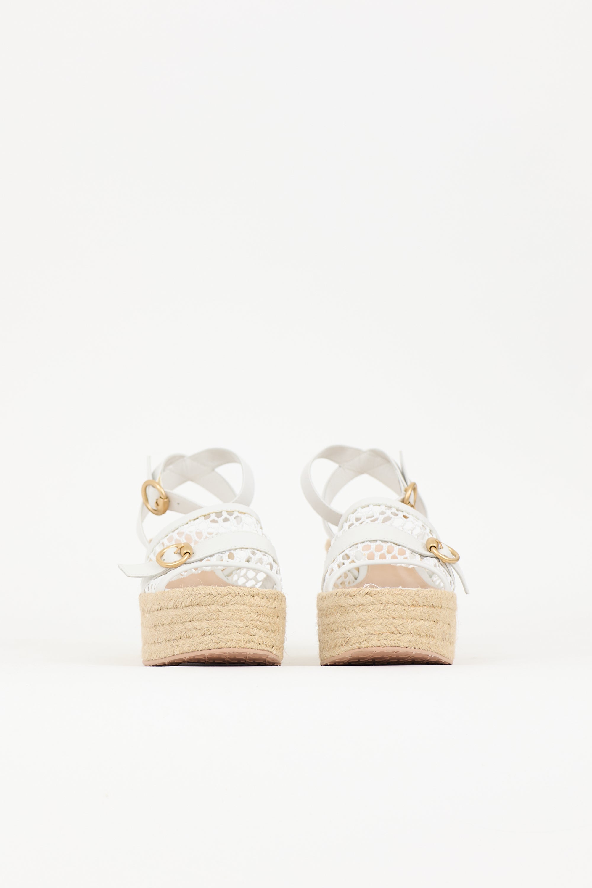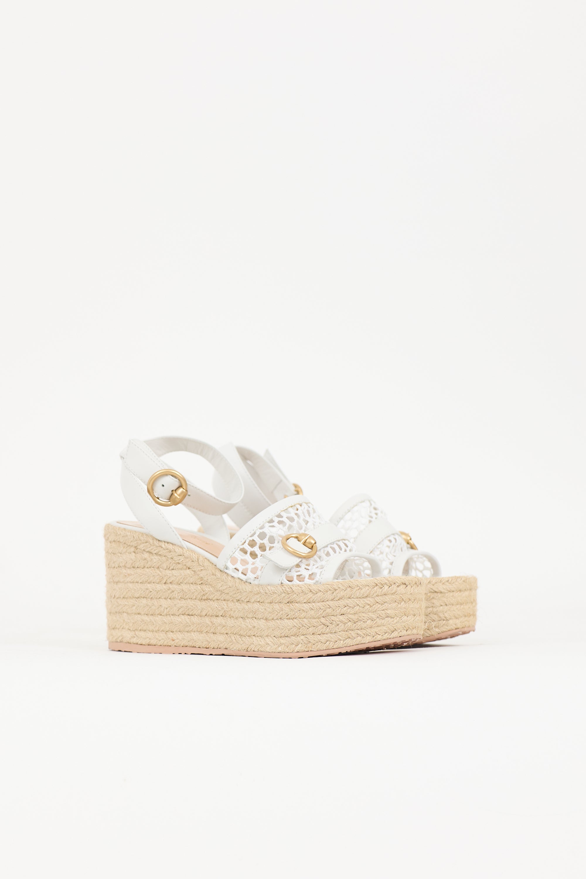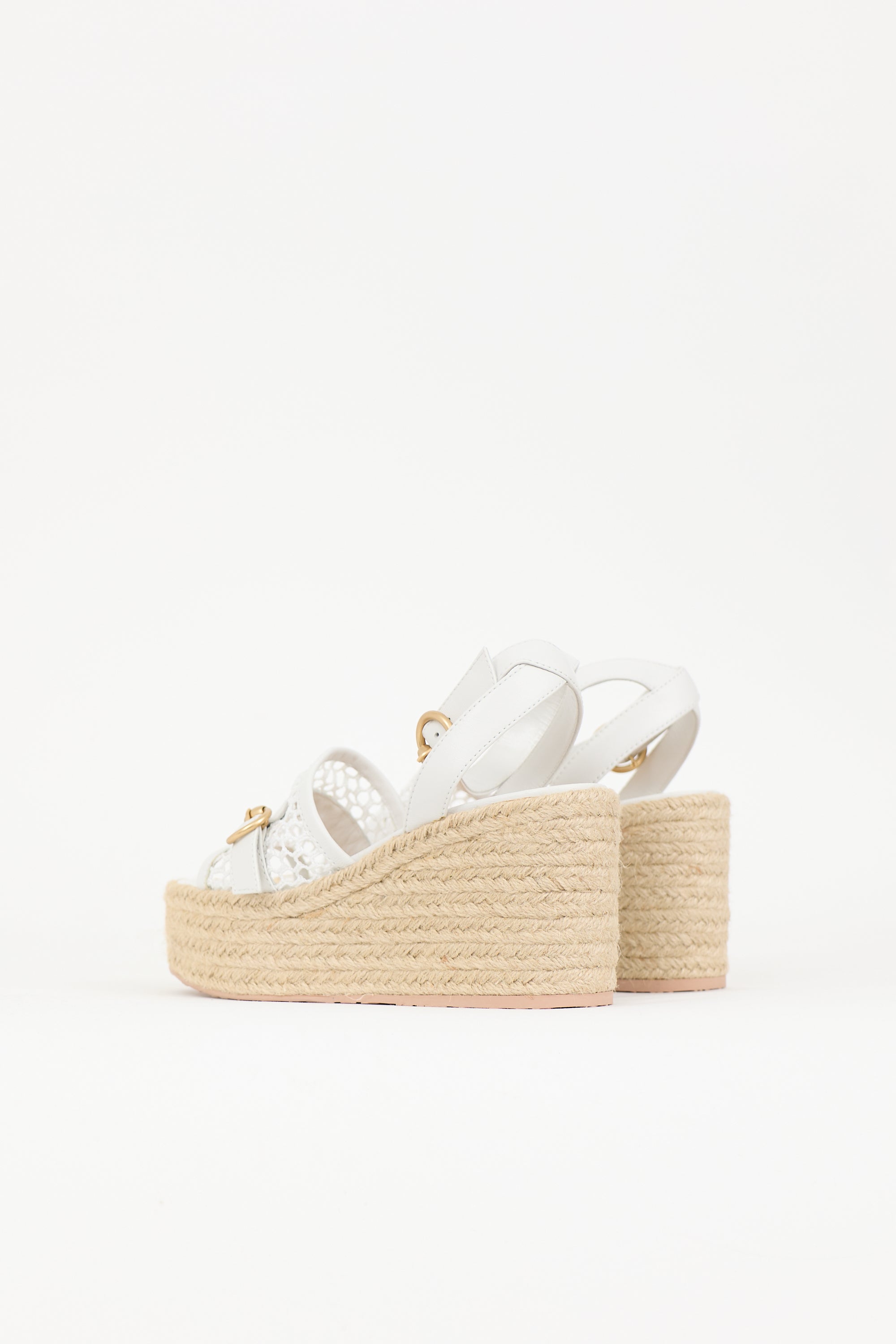 Pre-owned Gianvito Rossi white leather Solana wedge heels featuring open rounded toe, mesh vamp with decorative buckle, adjustable ankle strap, and espadrille wedge.