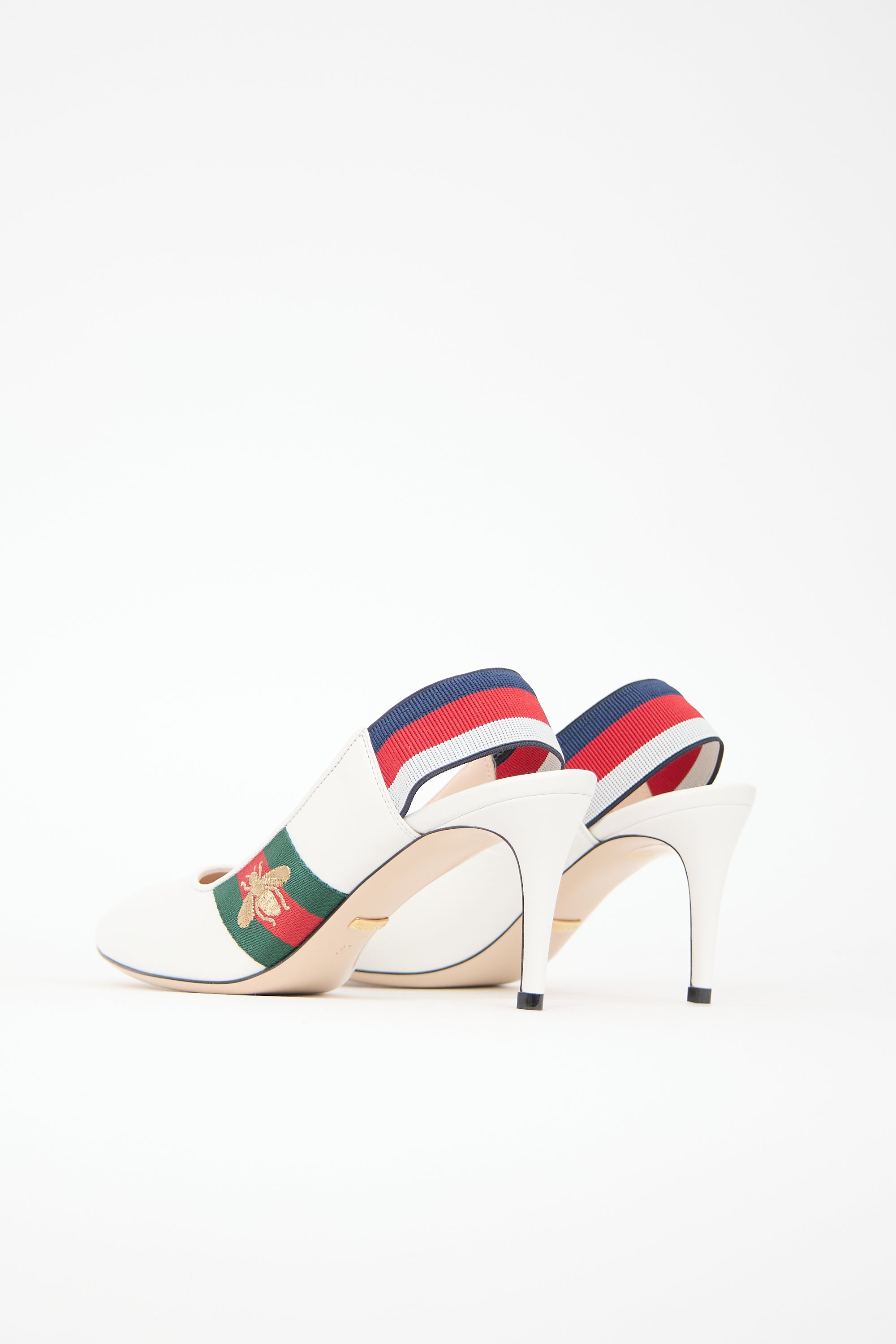 Pre-owned Gucci white leather Sylvie heels featuring pointed toe, signature red and green web strap at side with gold embroidered bee, tricolour web slingback strap, and short slim heel.