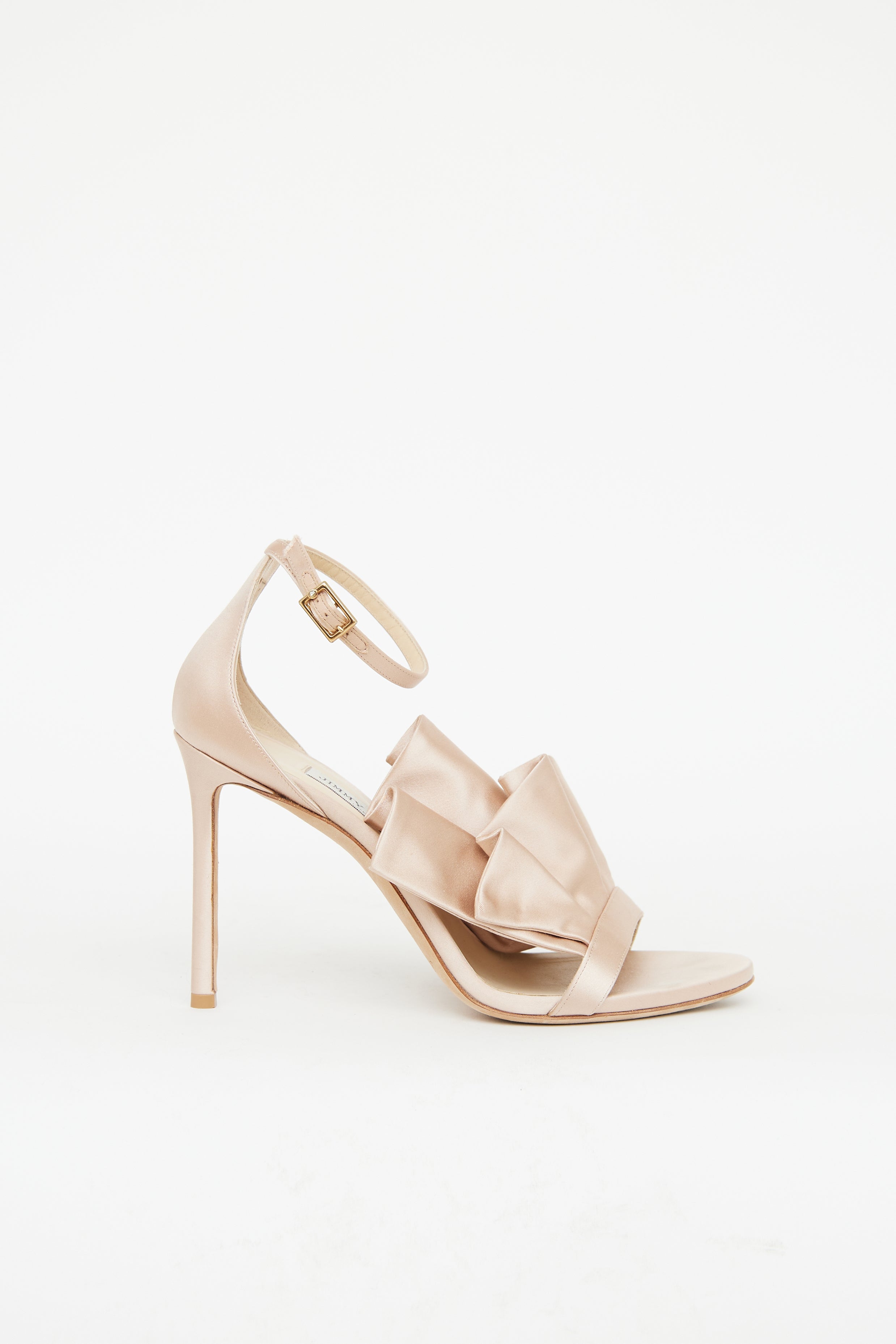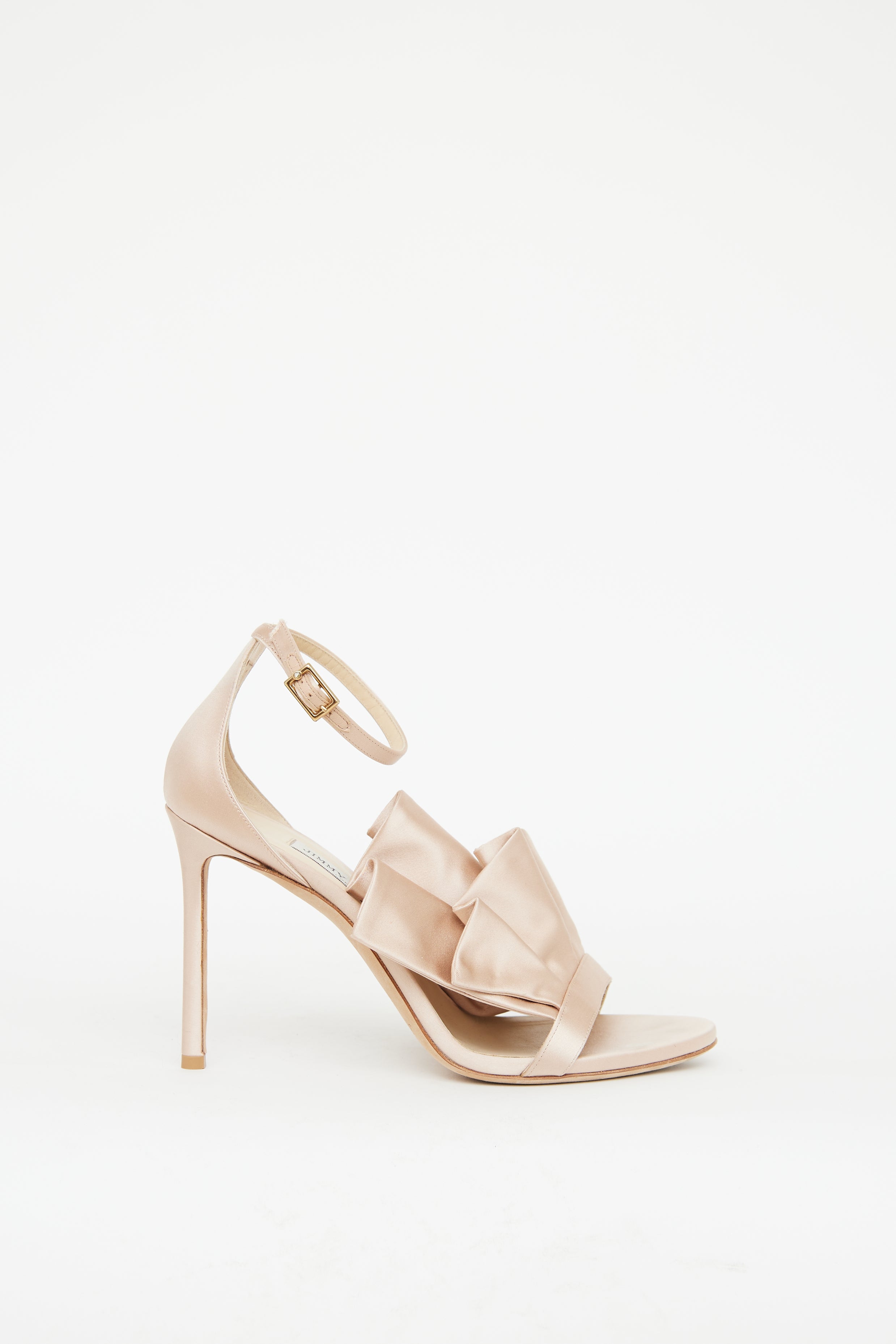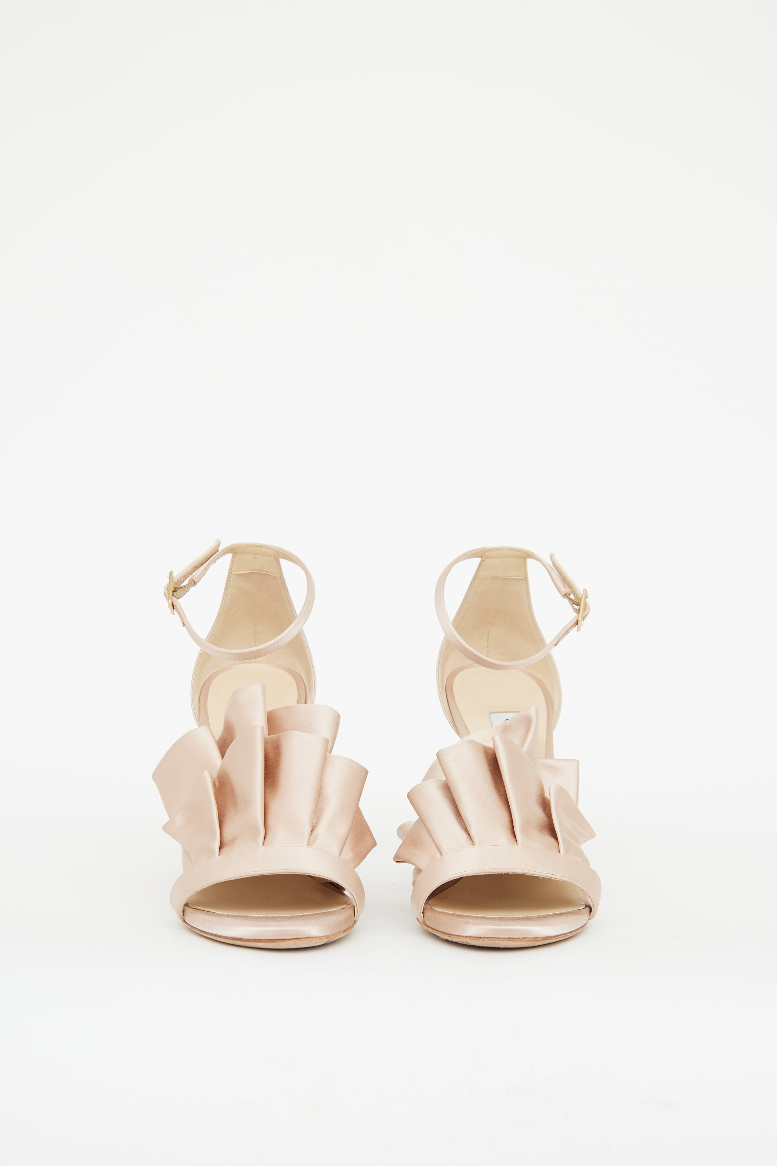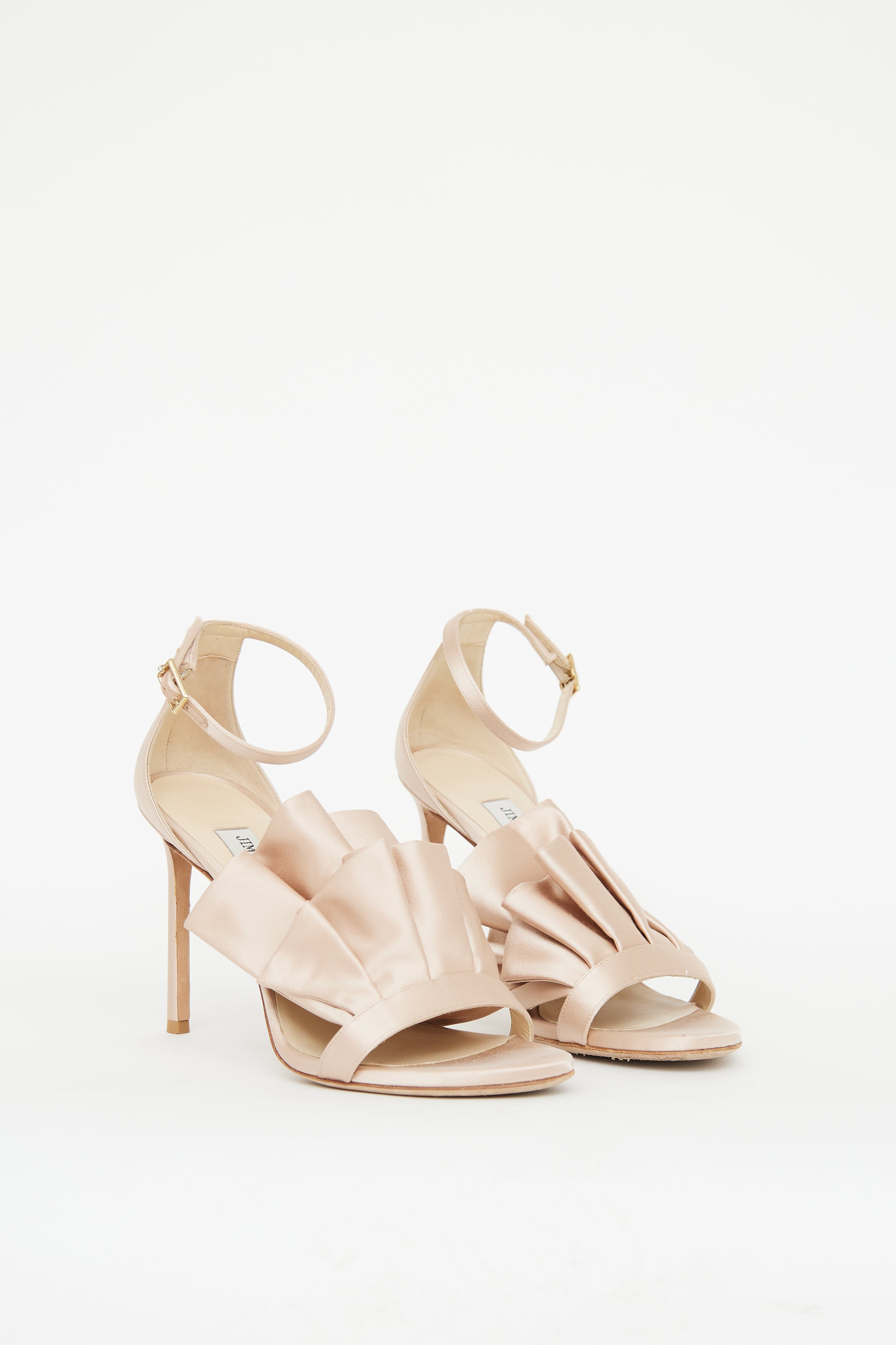 Pre-owned Jimmy Choo pink Kami pumps featuring a round open toe, strap with ruffle detail on upper, adjustable ankle strap and covered stiletto heel.