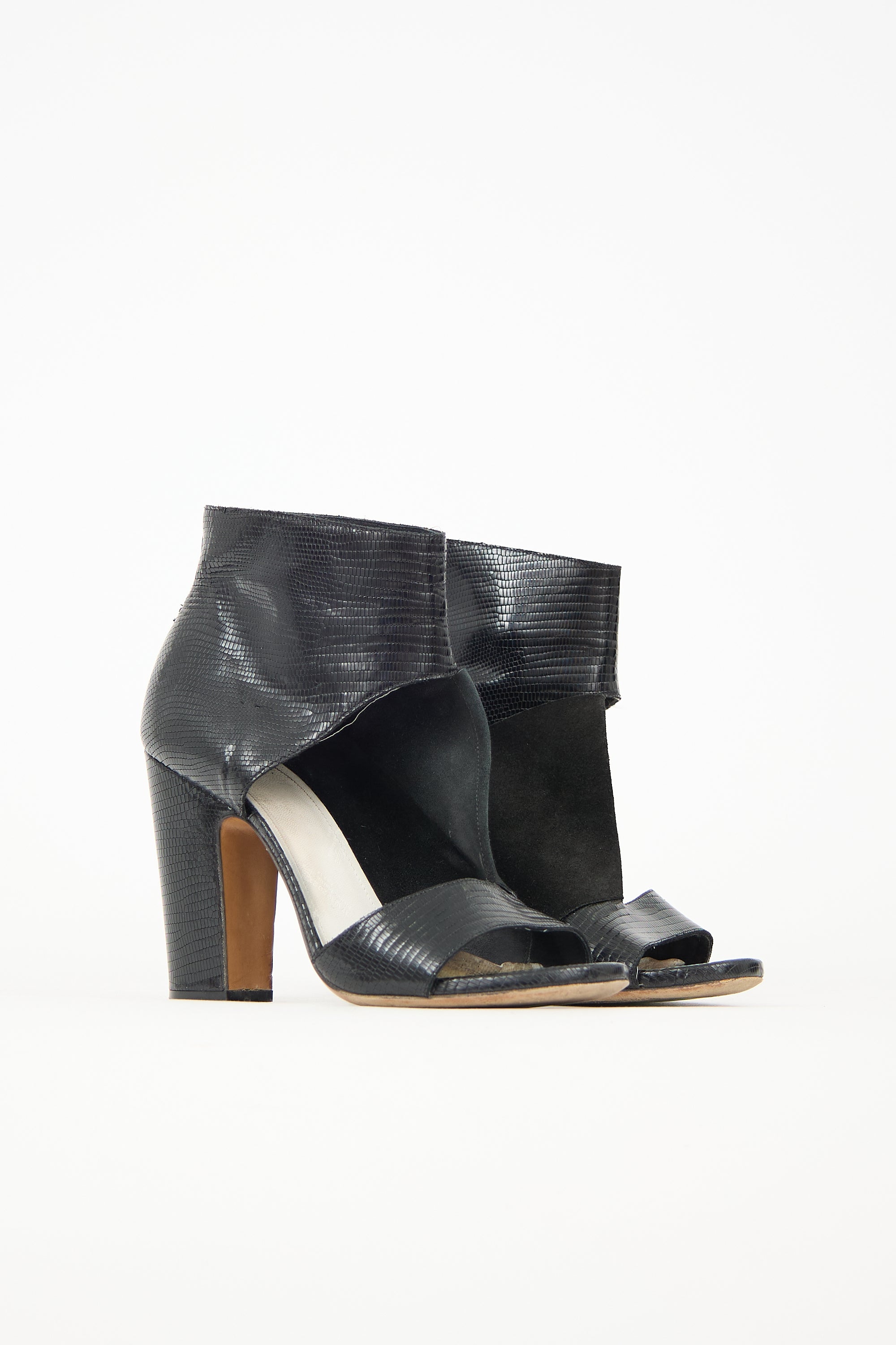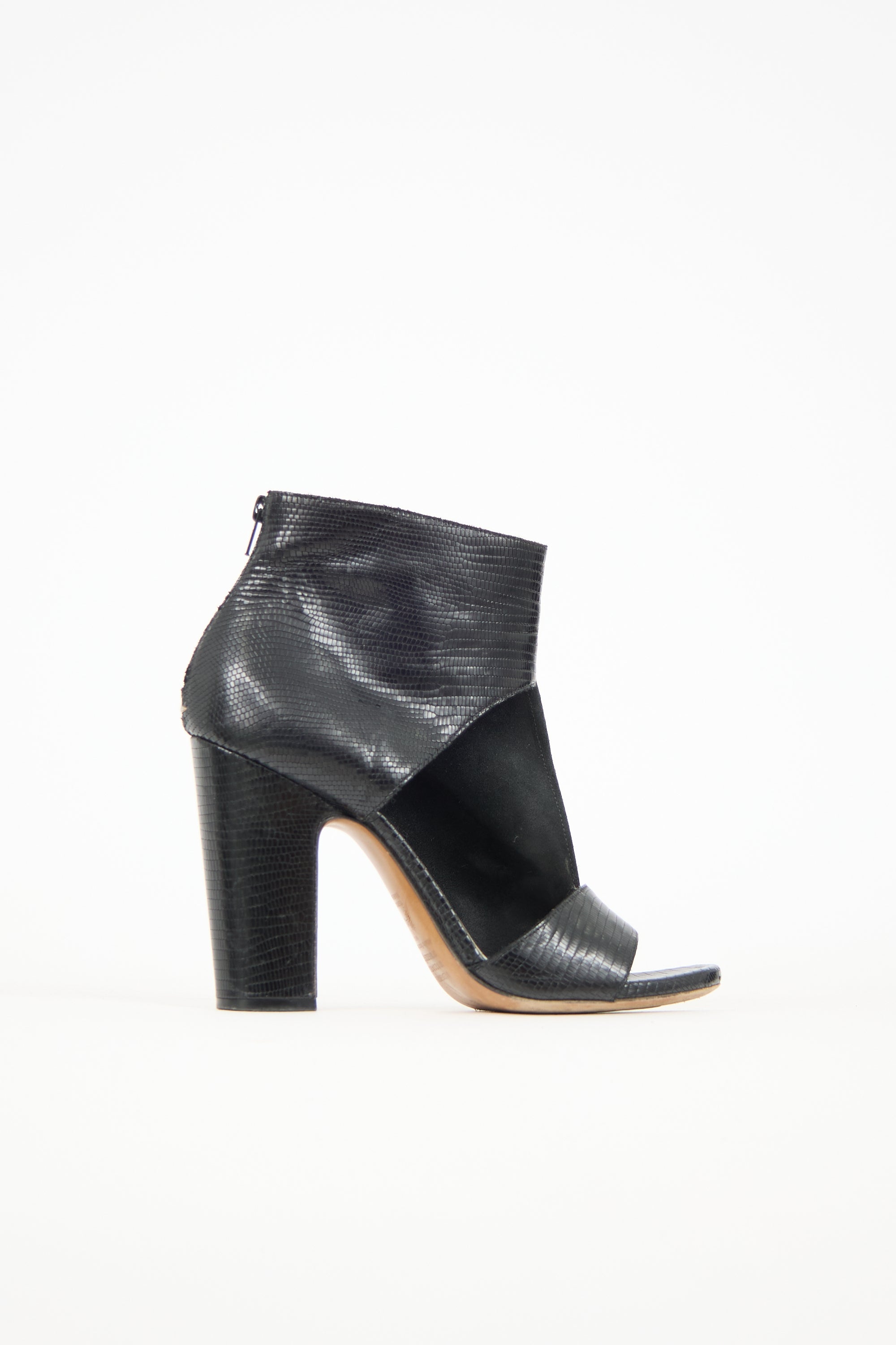 Pre-owned Maison Margiela black leather booties featuring reptile skin textured leather uppers, an open rounded toe, cutout at instep with suede foldover side panel, back zip closure, and a covered block heel.