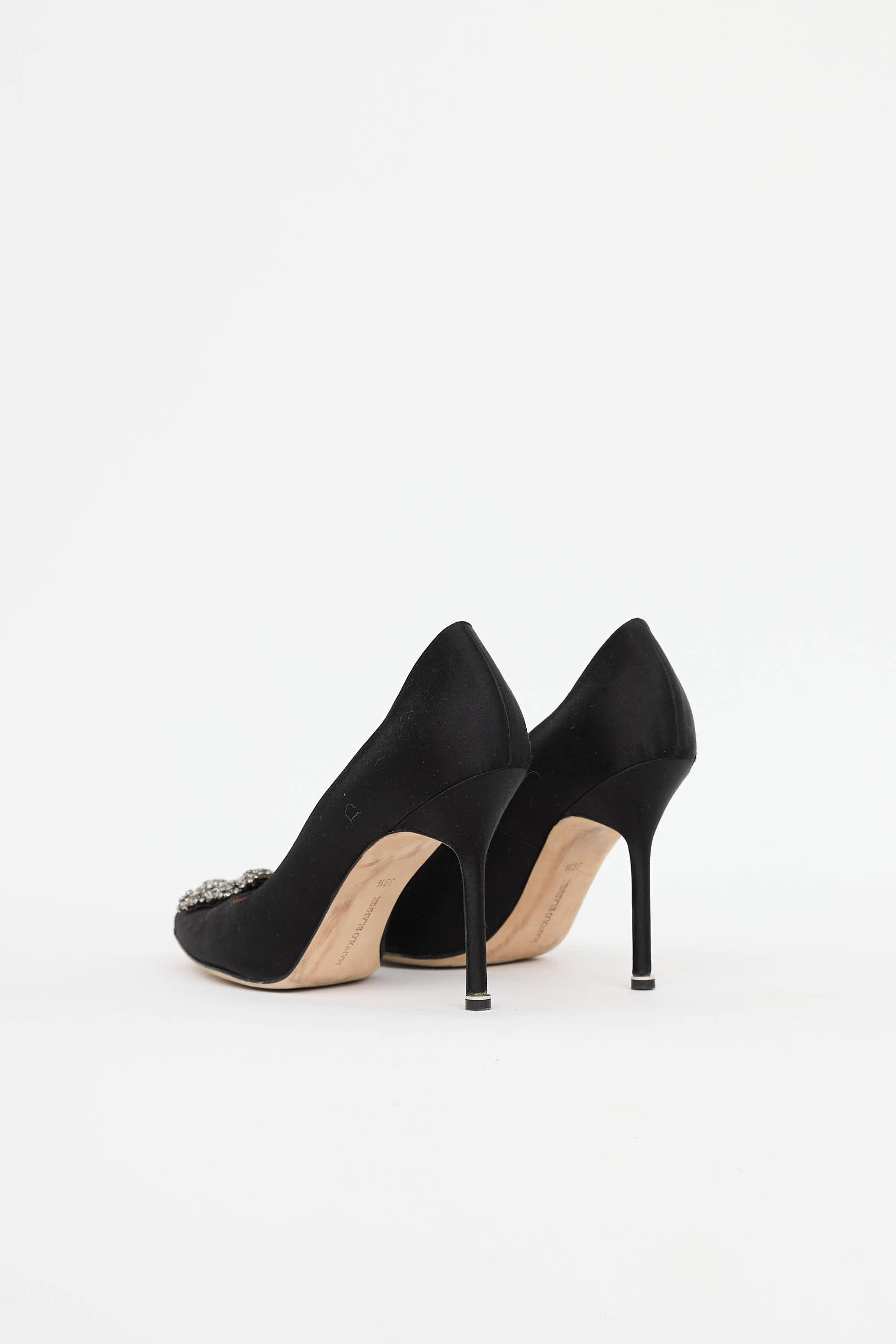 Pre-owned Manolo Blahnik black satin Hangisi pumps featuring pointed toe, satin upper, signature Hangisi embellishment on vamp, and satin wrapped heel.