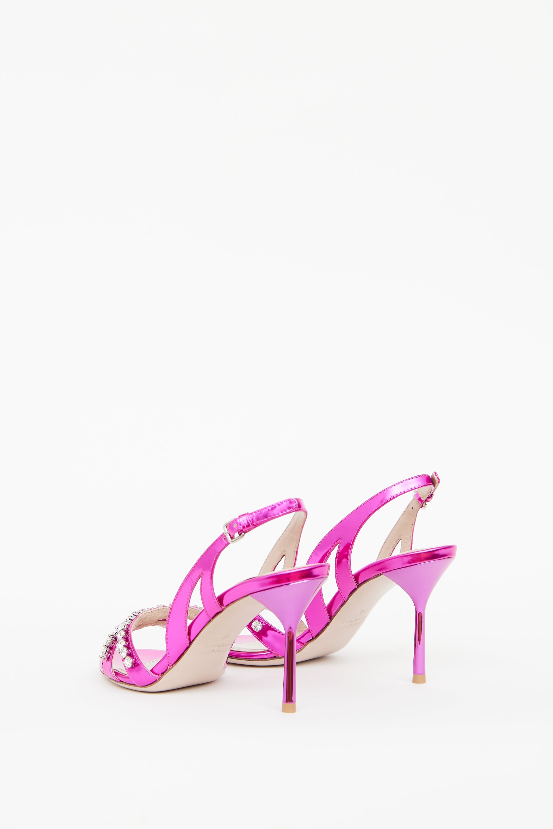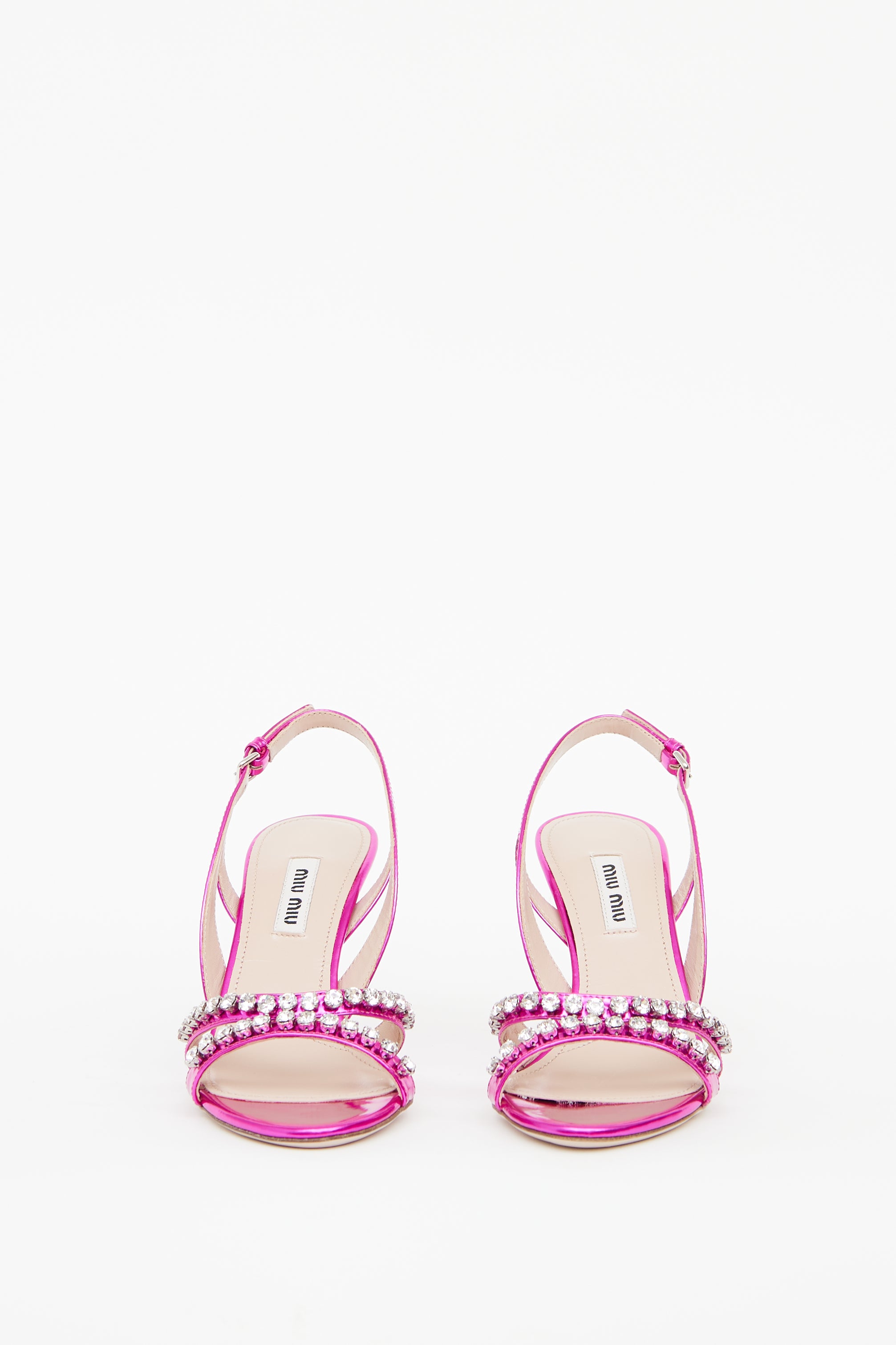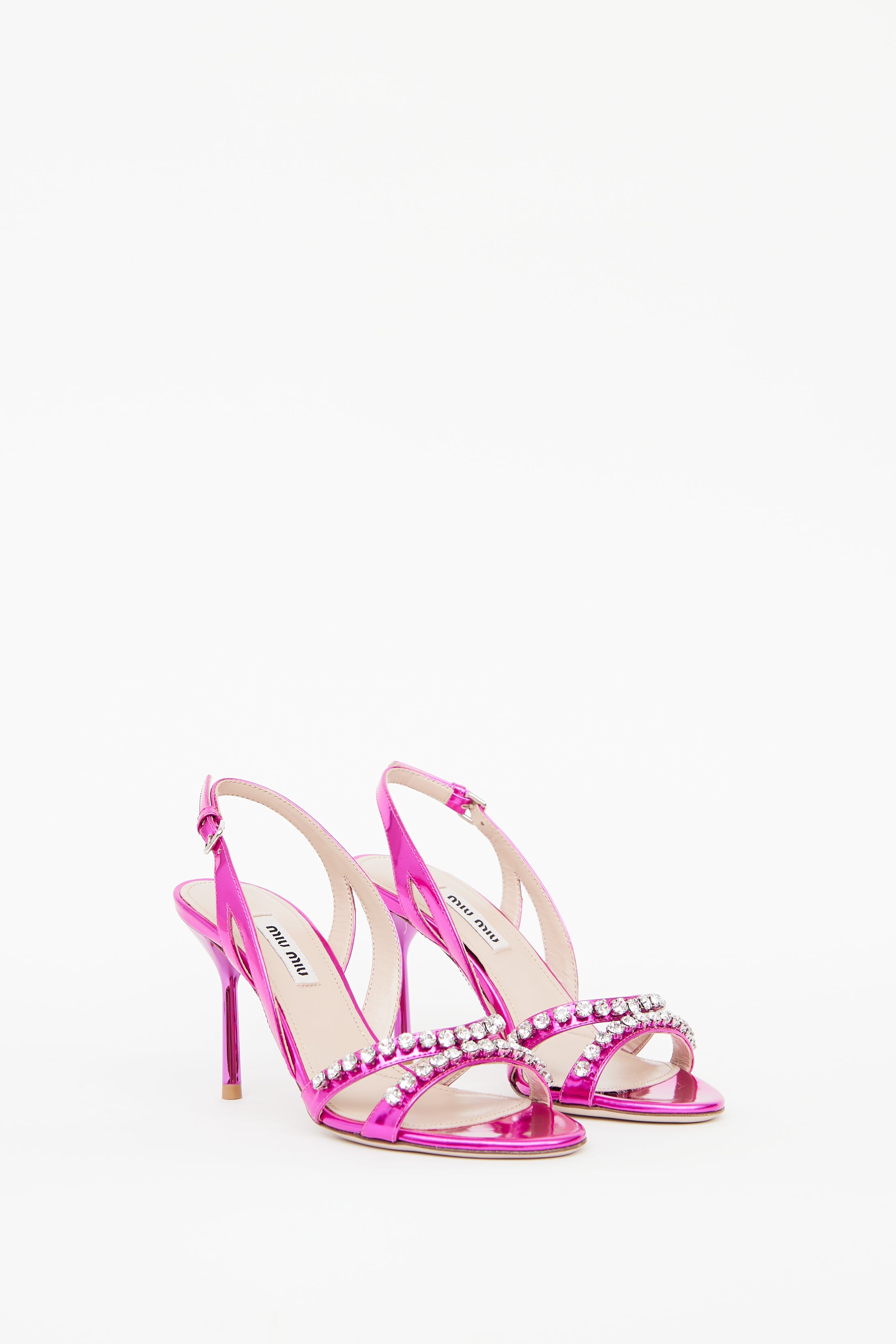 Pre-owned Miu Miu patent pink slingback heels featuring round open toe styling, crystal embellishment at vamp, adjustable ankle strap with cut out detailing.