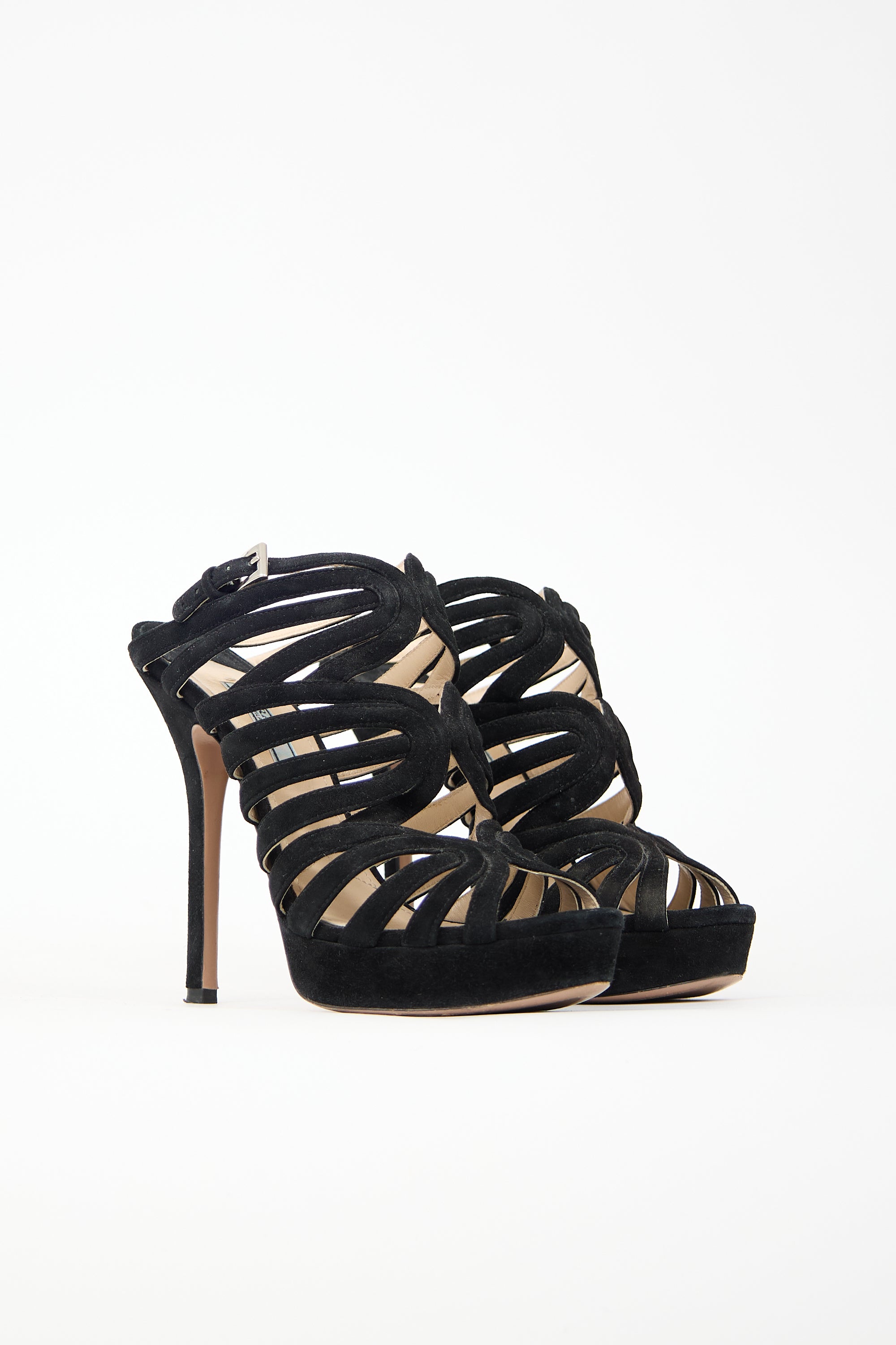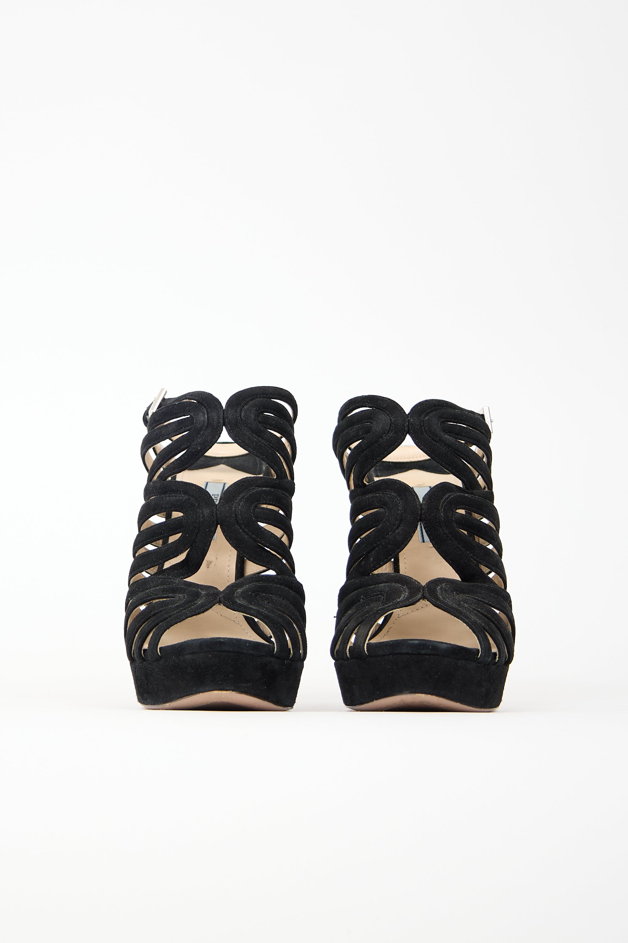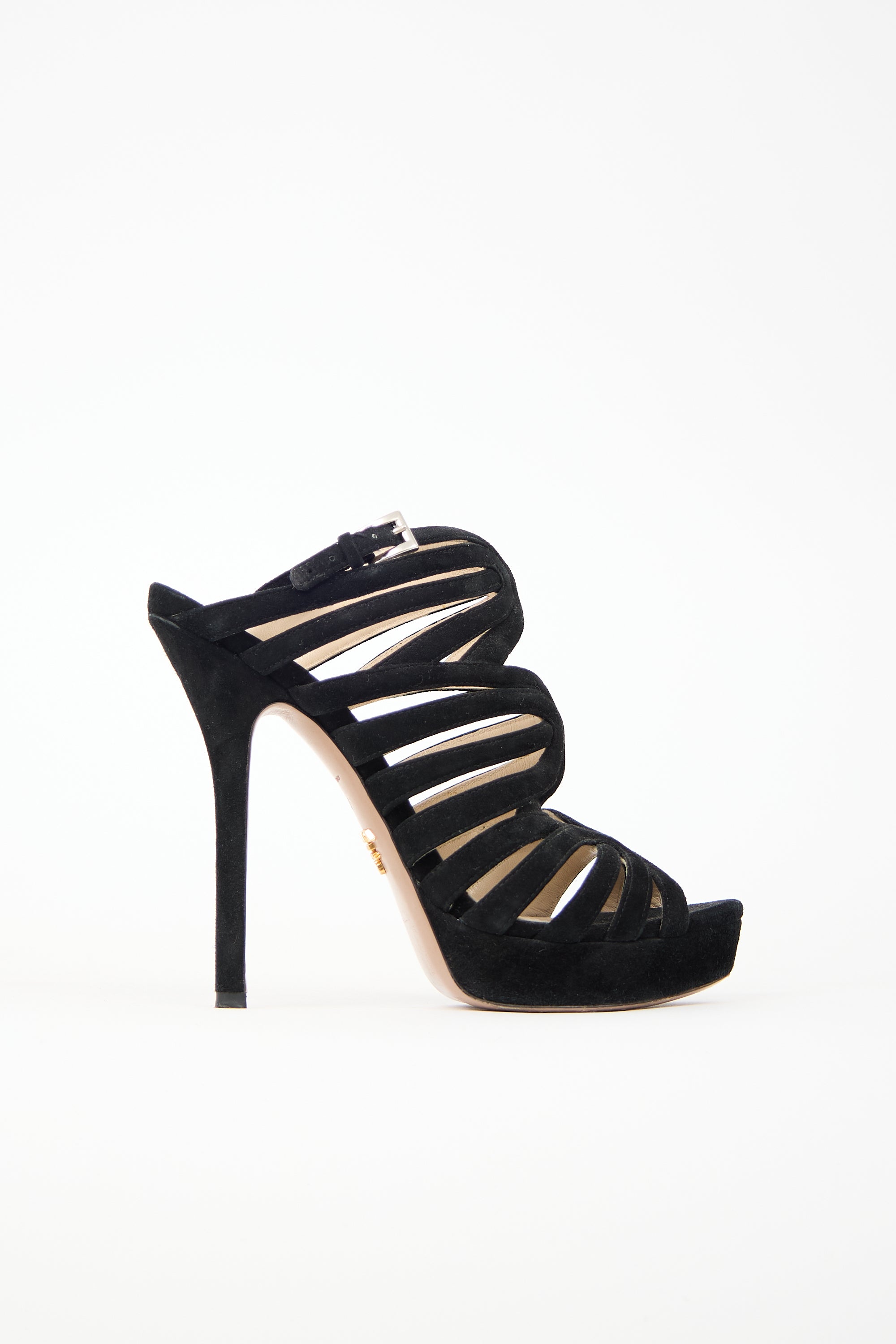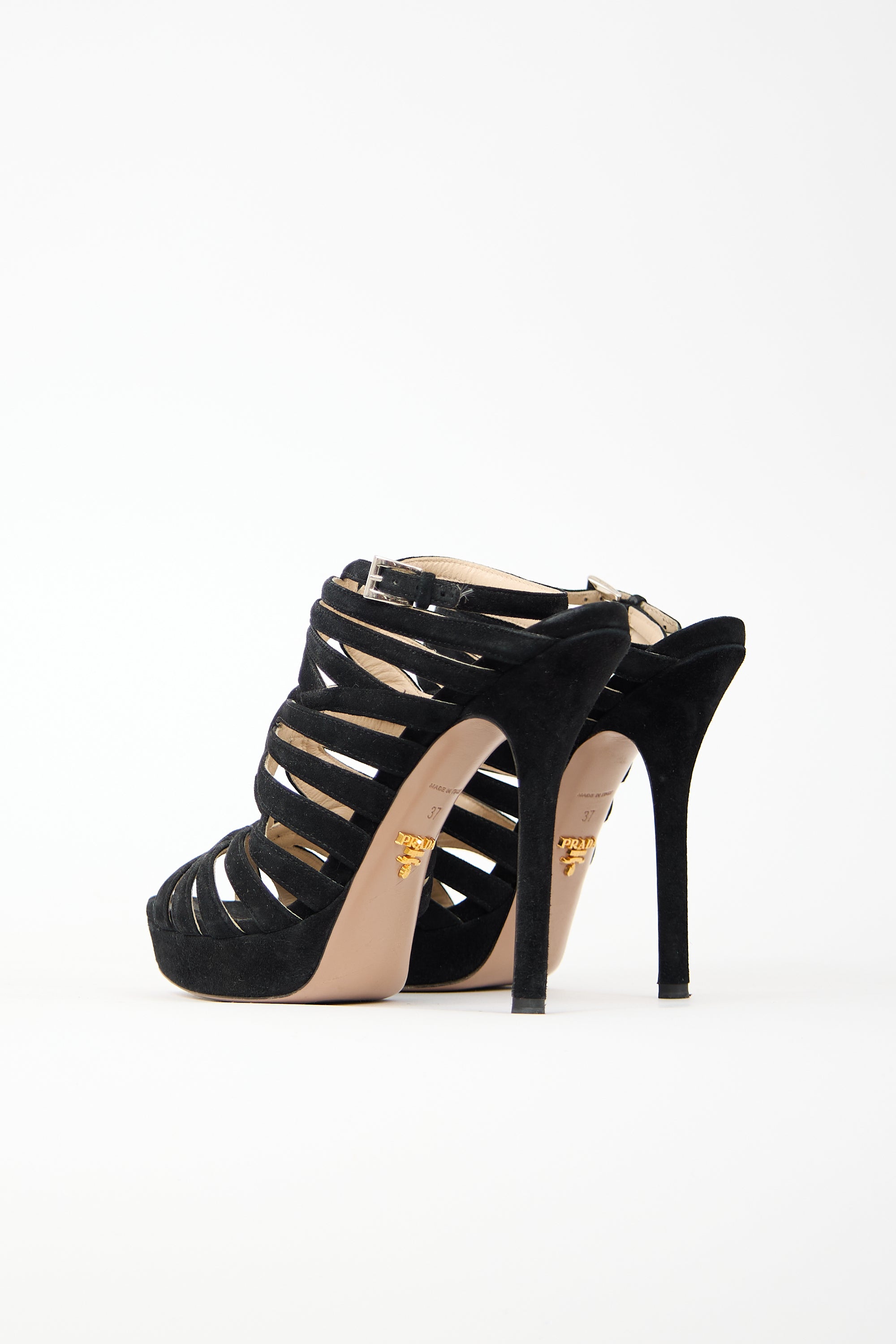 Pre-owned Prada black suede heels featuring almond peep toe, cut out upper, adjustable ankle strap, and covered platform and continental heel.