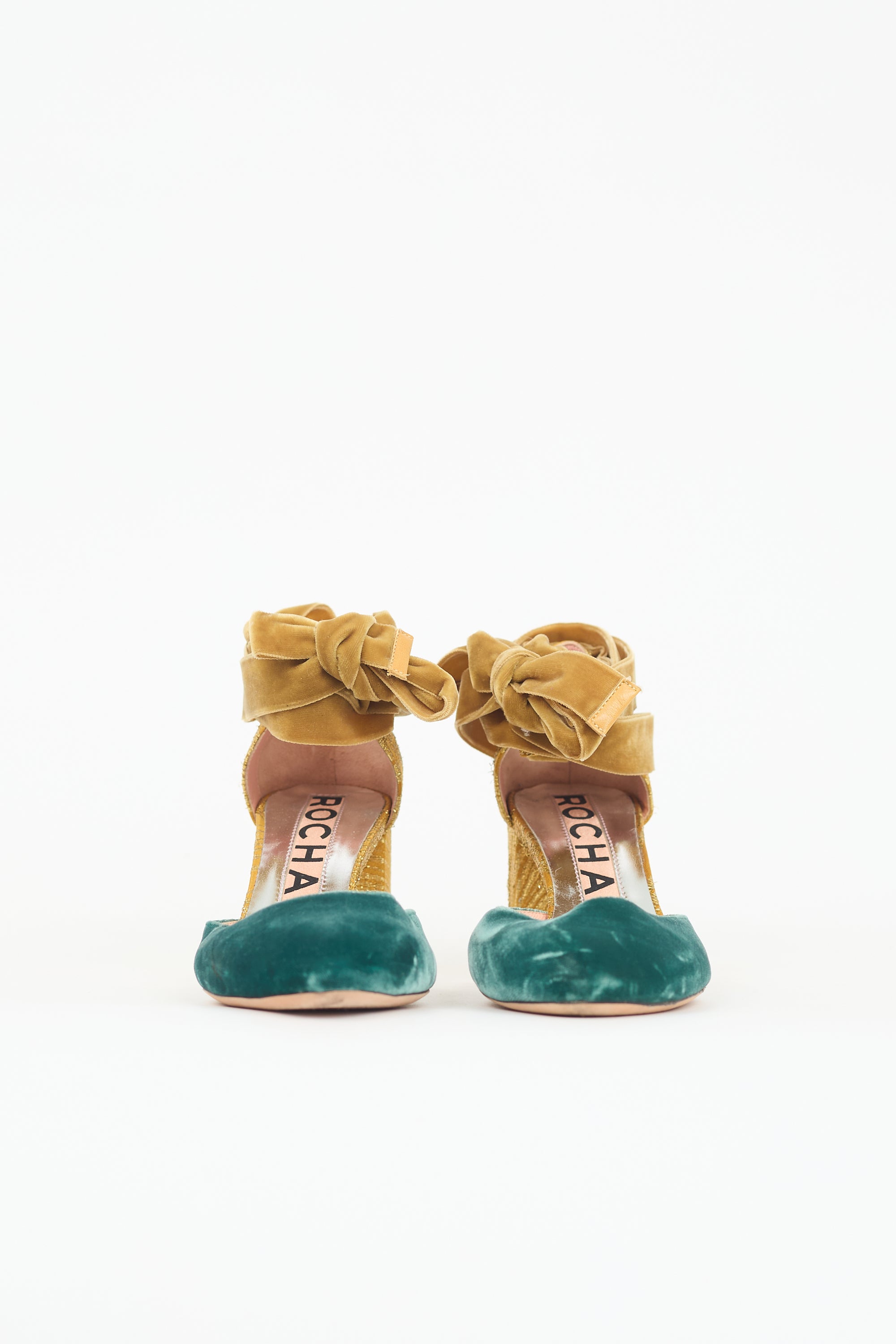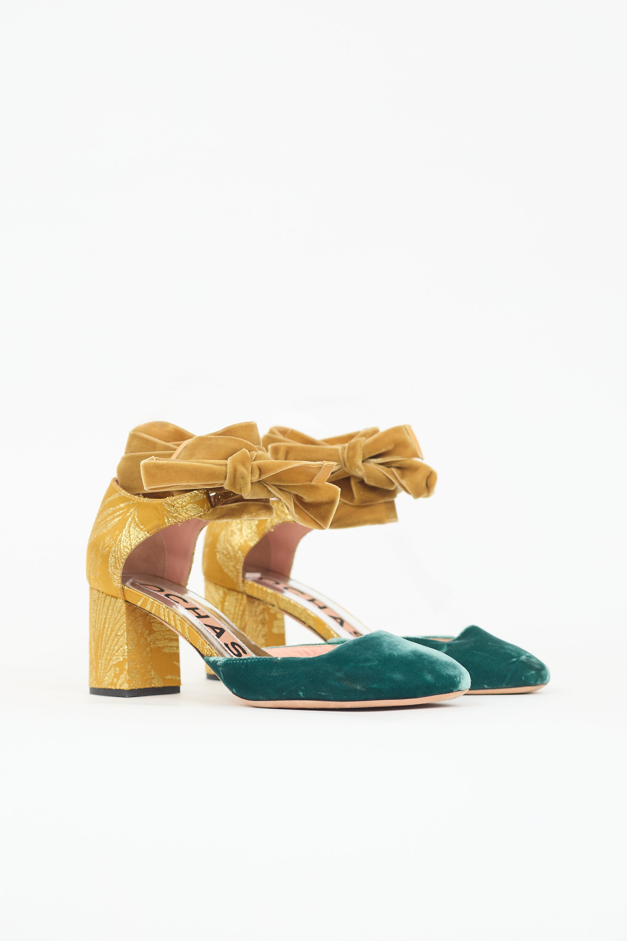Pre-owned Rochas green and gold heels featuring almond toe, ankle wrap tie, and baroque covered block heel and counter.