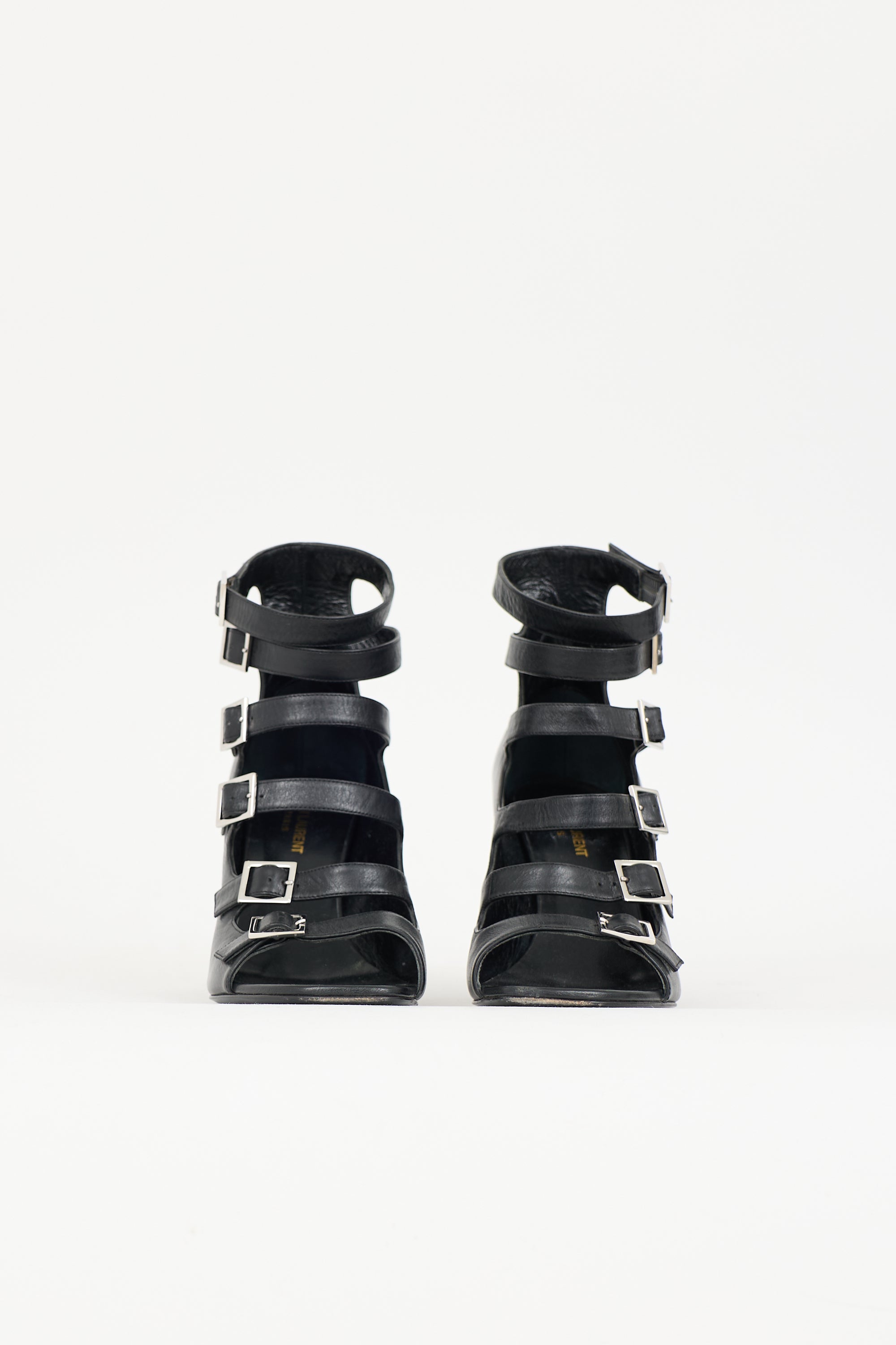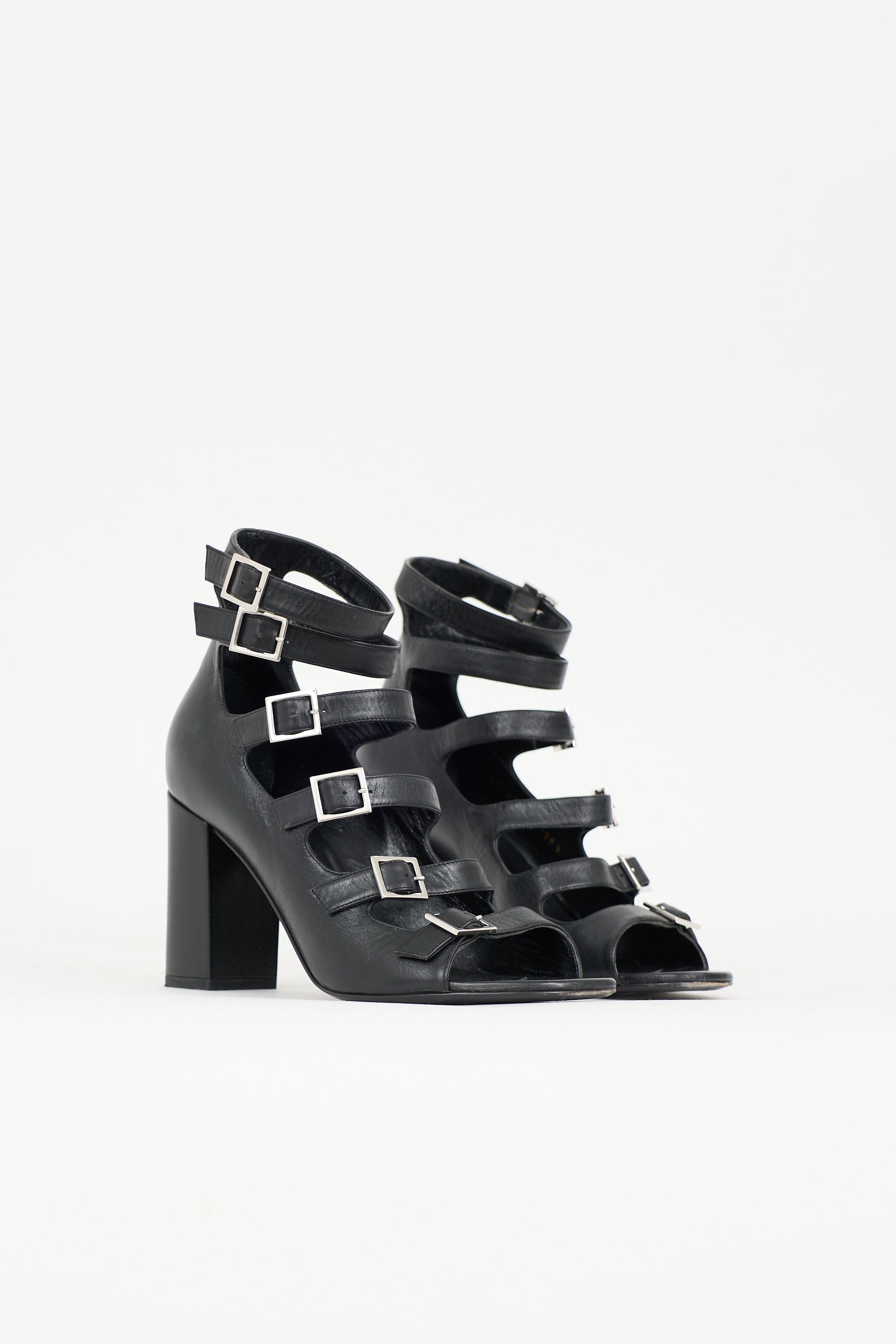 Pre-owned Saint Laurent black Babies leather heels featuring an open rounded toe, adjustable caged upper, and wrapped block heel