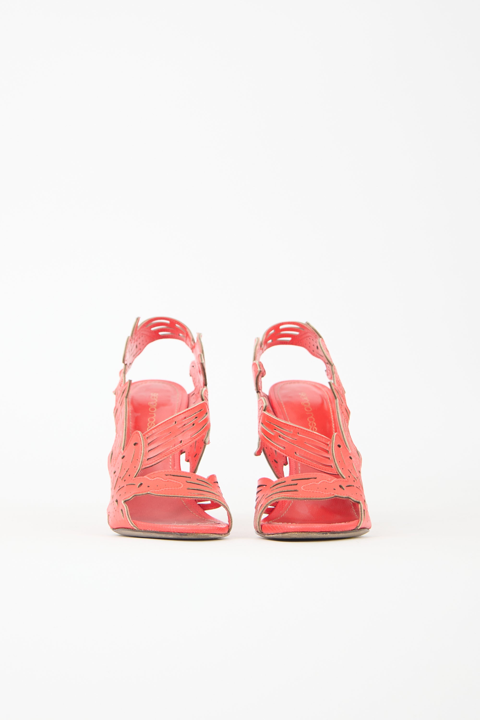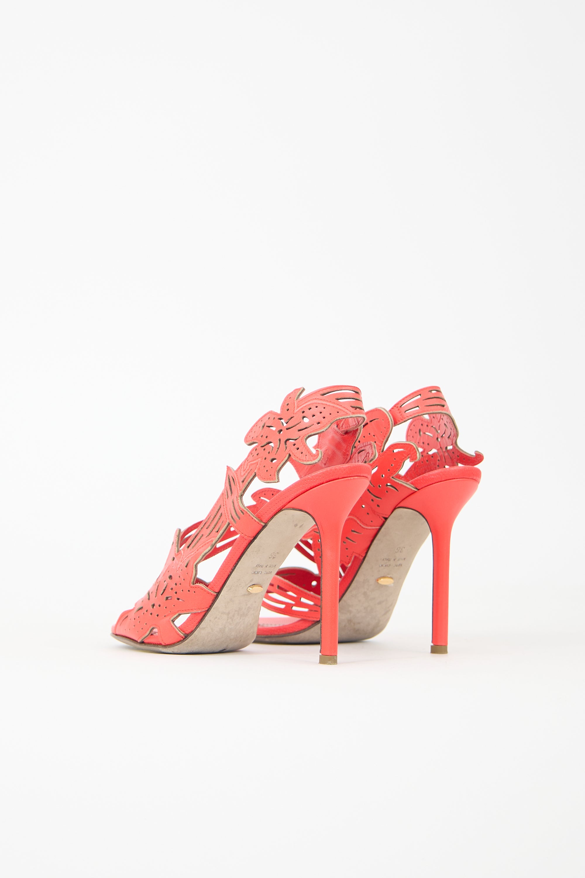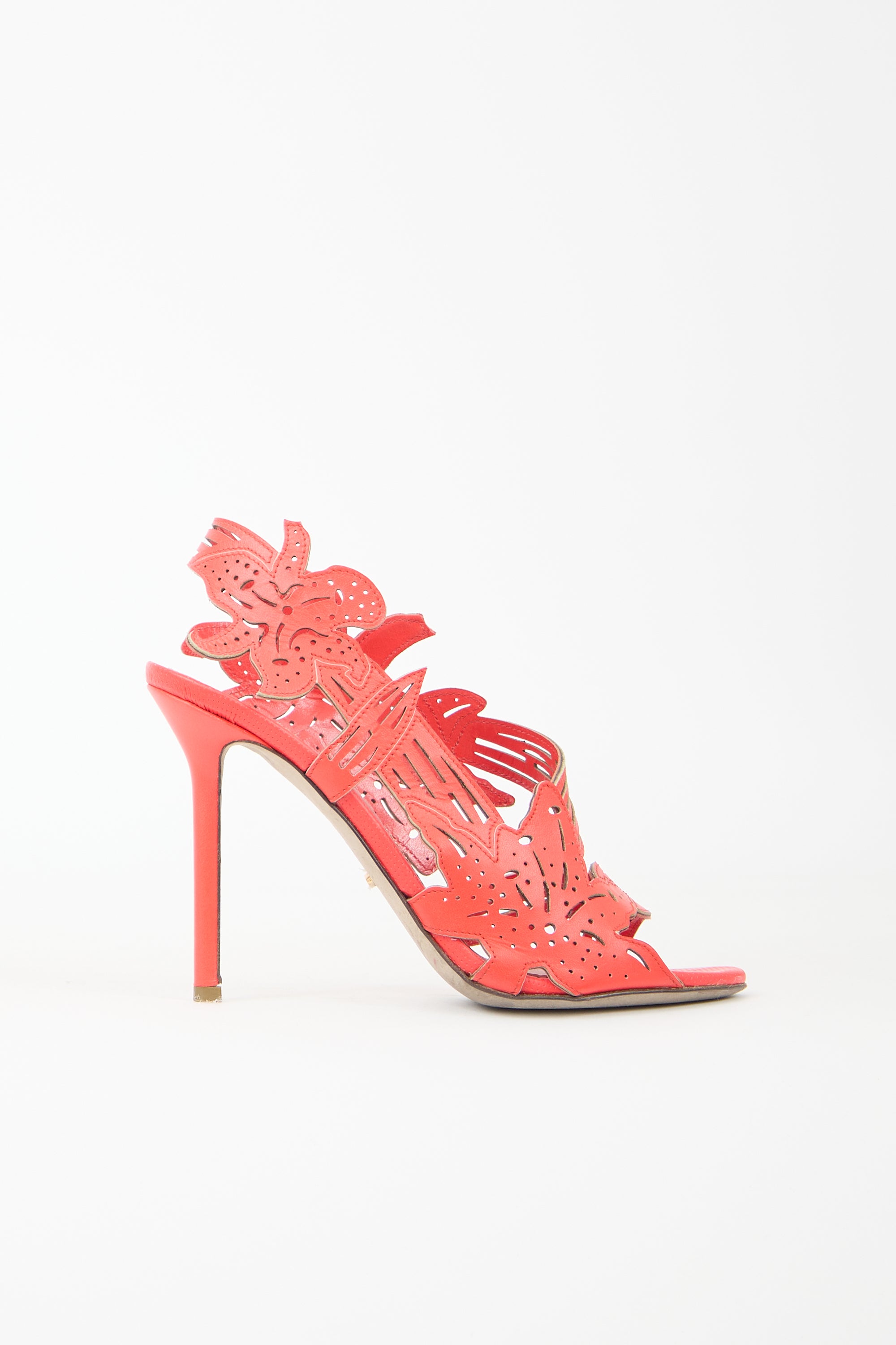 Pre-owned Sergio Rossi red leather heels featuring rounded toe, cut out floral upper, perforated footbed, and covered continental heel. Comes with original box, dust bags, and extra set of heel tips.