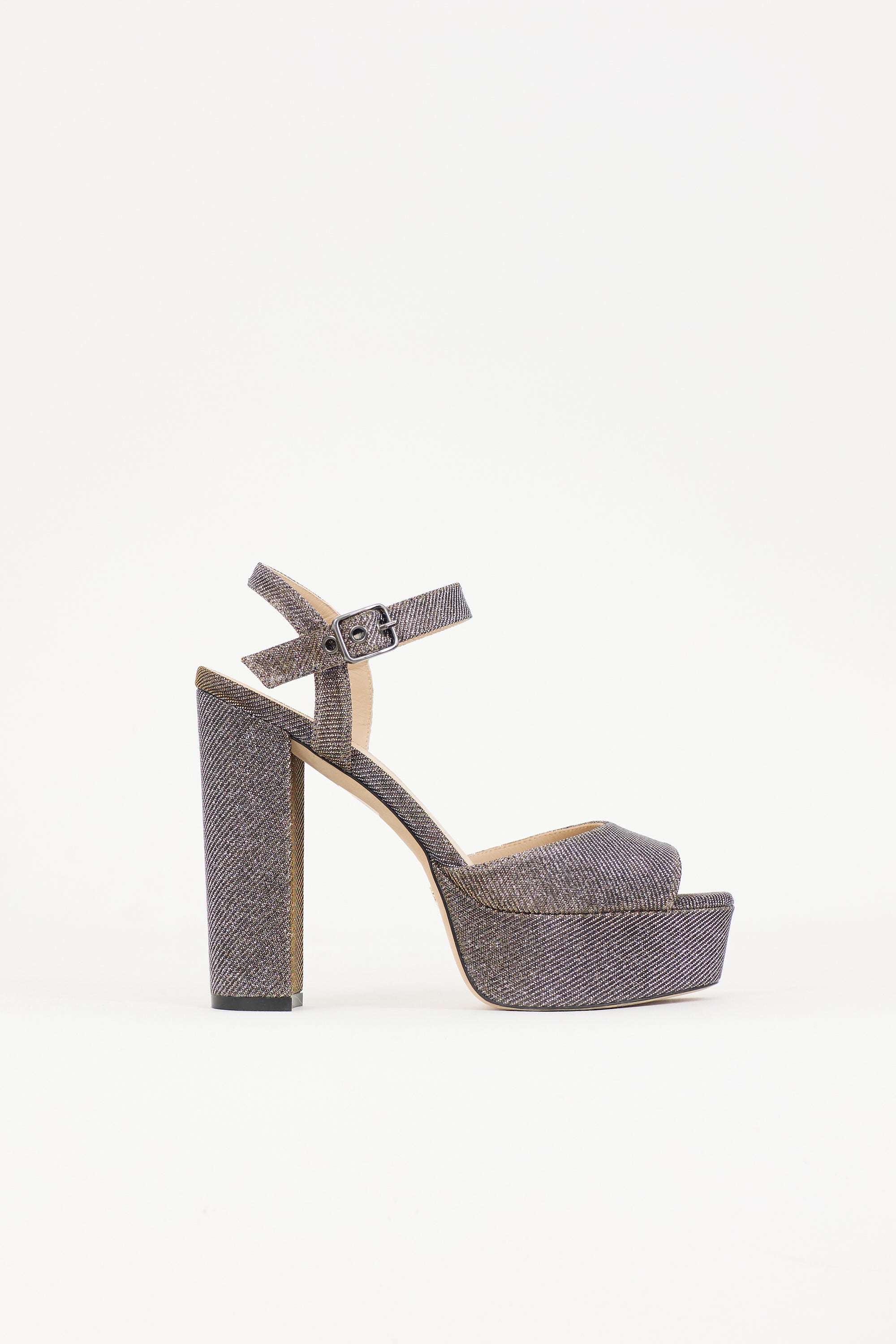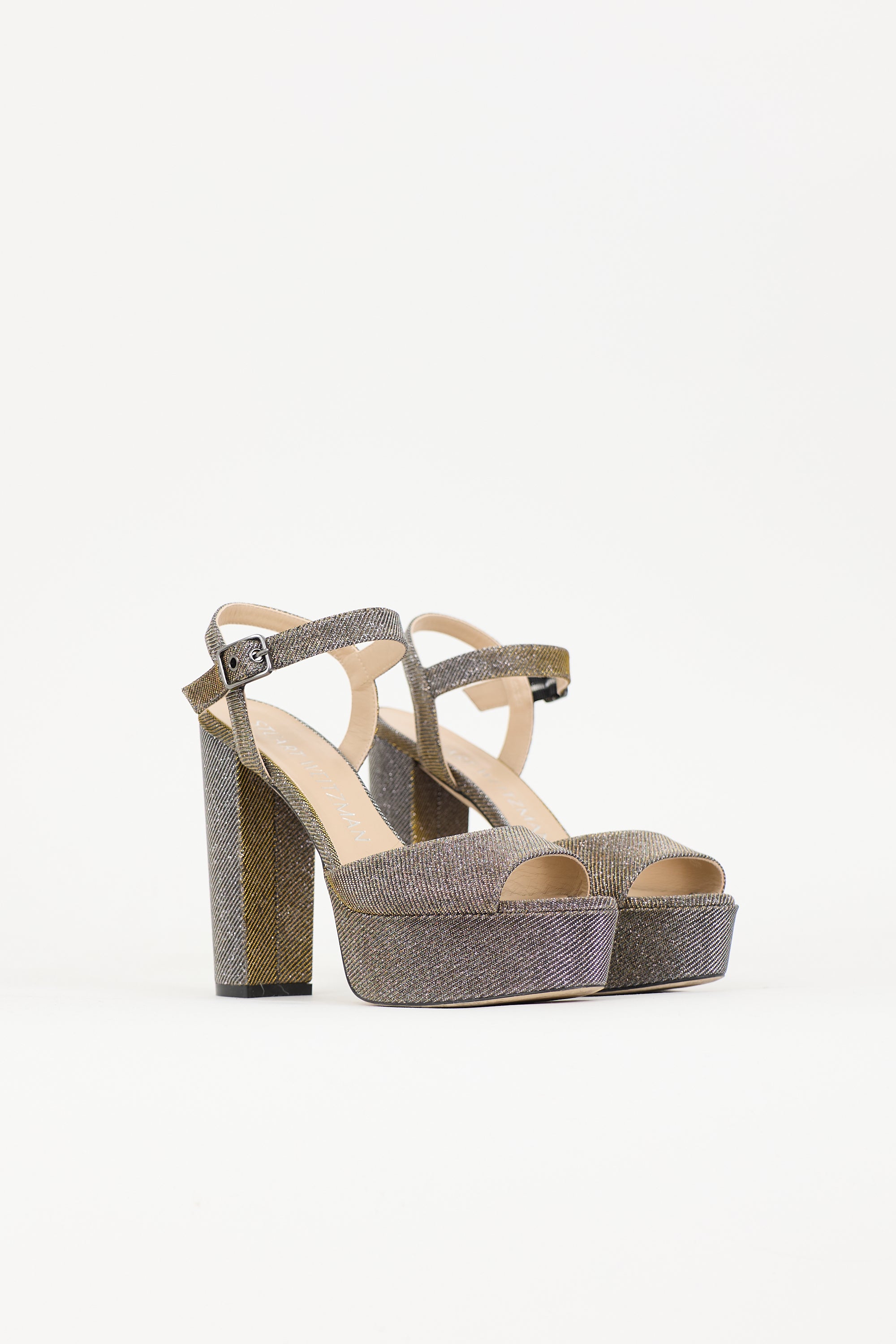 Pre-owned Stuart Weitzman gold and bronze glitter Dayna II heels featuring open almond toe, adjustable ankle strap, platform box, and block heel. Includes original dust bag.