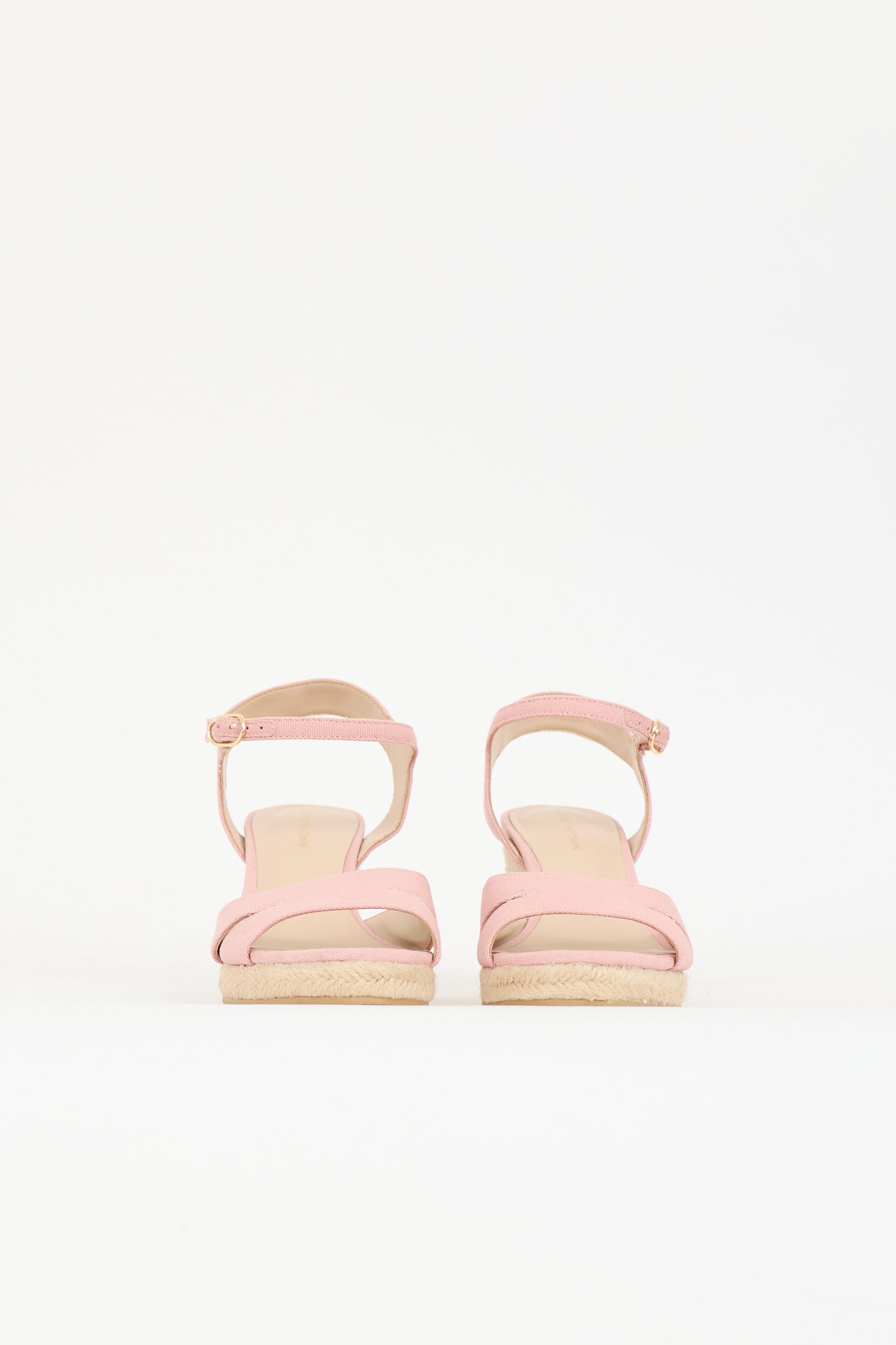Pre-owned Stuart Weitzman pink canvas Mykonos wedge featuring open rounded toe,m adjustable ankle strap, and jute wedge.