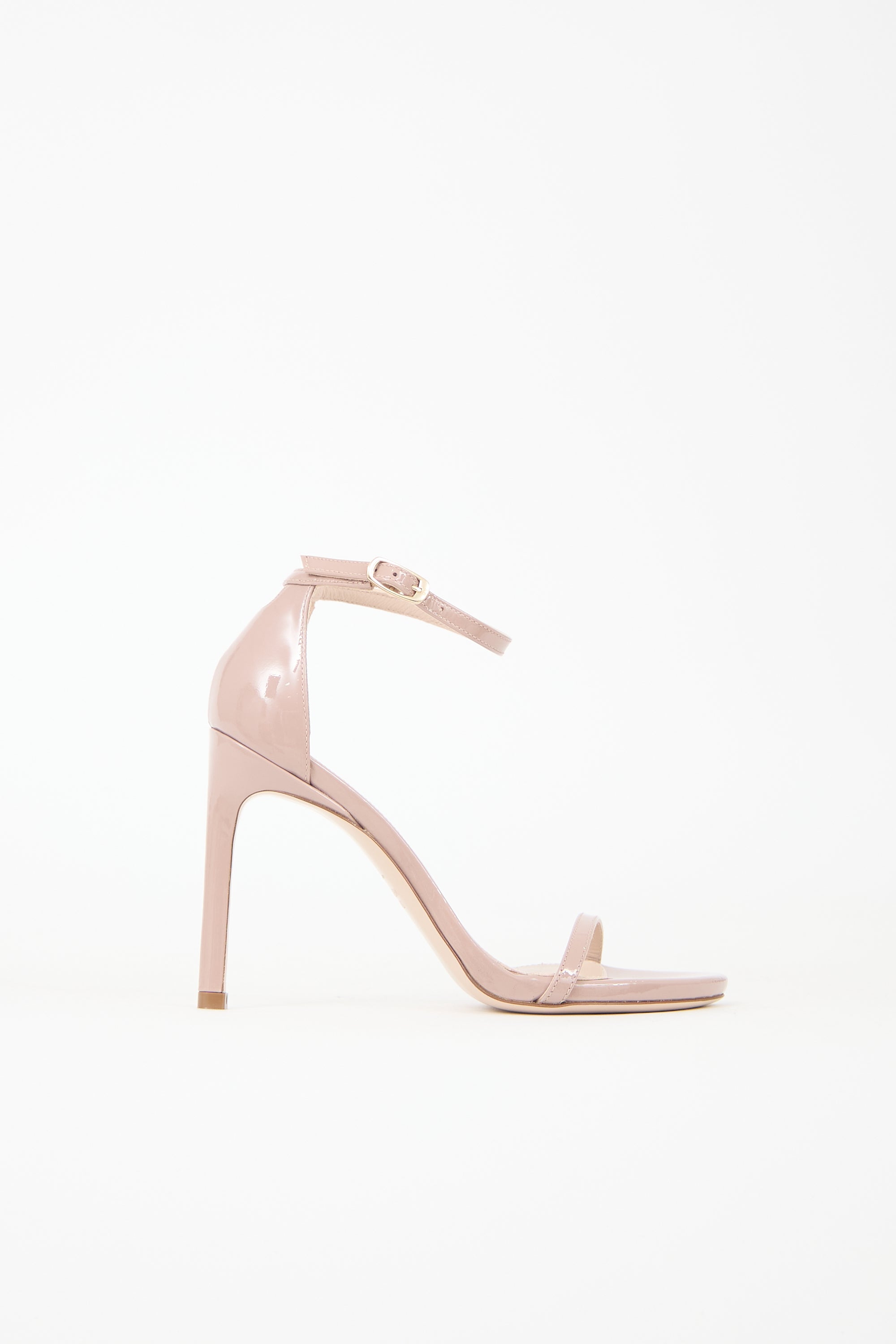 Pre-owned Stuart Weitzman taupe patent leather Nudistsong heels featuring rounded toe, thin strap upper, adjustable ankle strap, and covered stiletto heel.