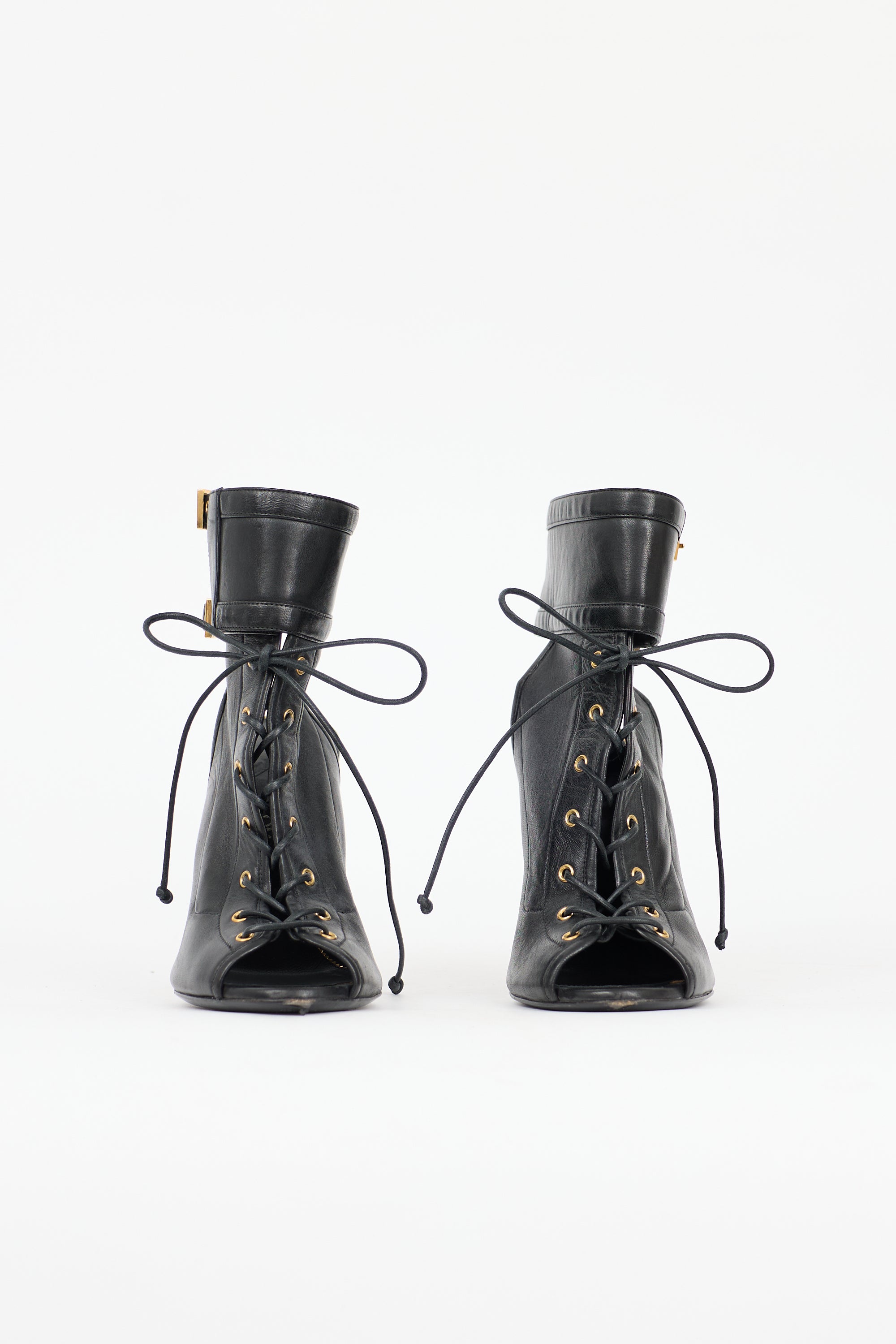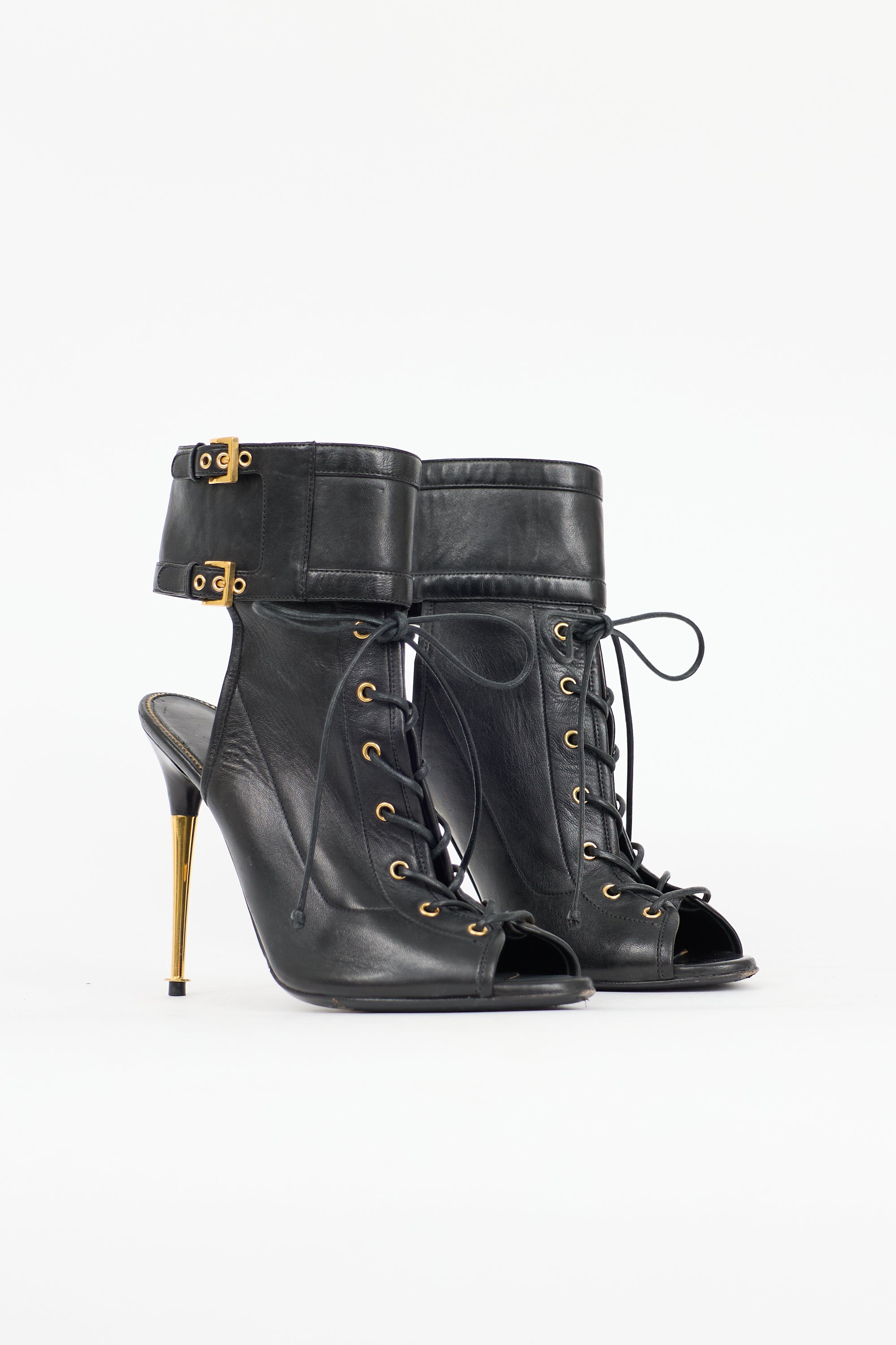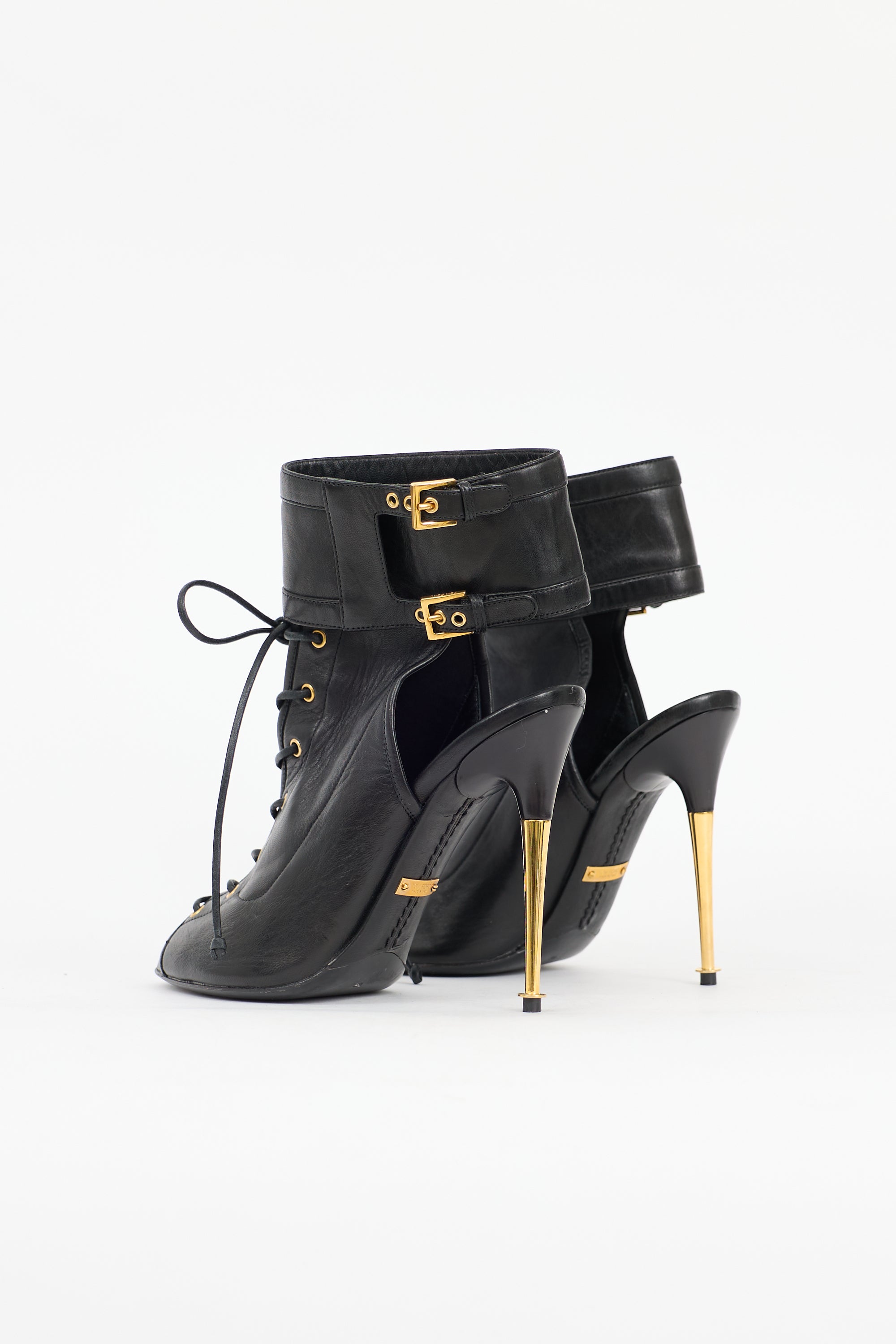 Pre-owned Tom Ford Spring Summer 2014 black leather booties featuring an almond peep toe, gold tone hardware, lace up front, covered ankle with two adjustable straps, cutout at counter heel, and a gold tone metal heel.