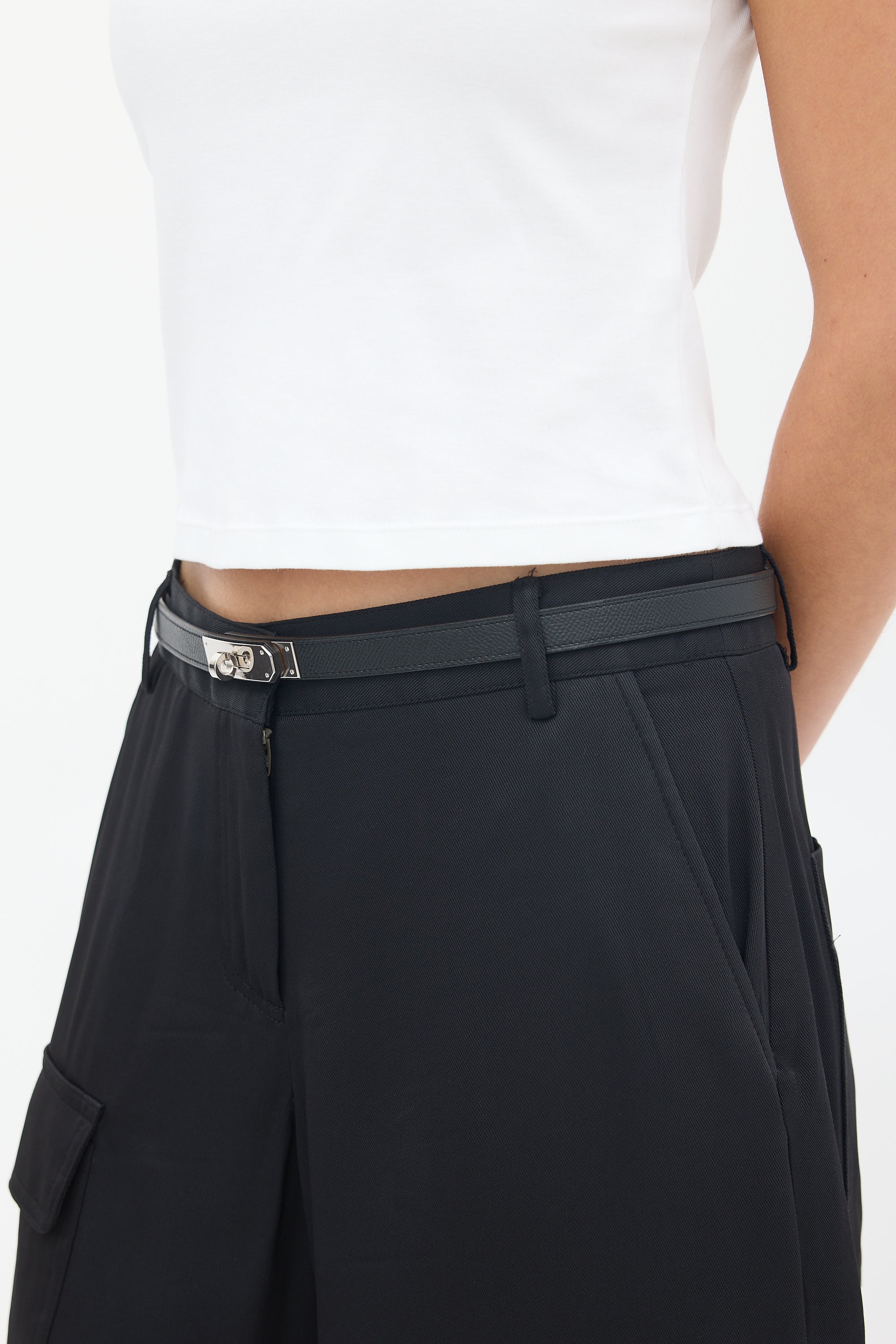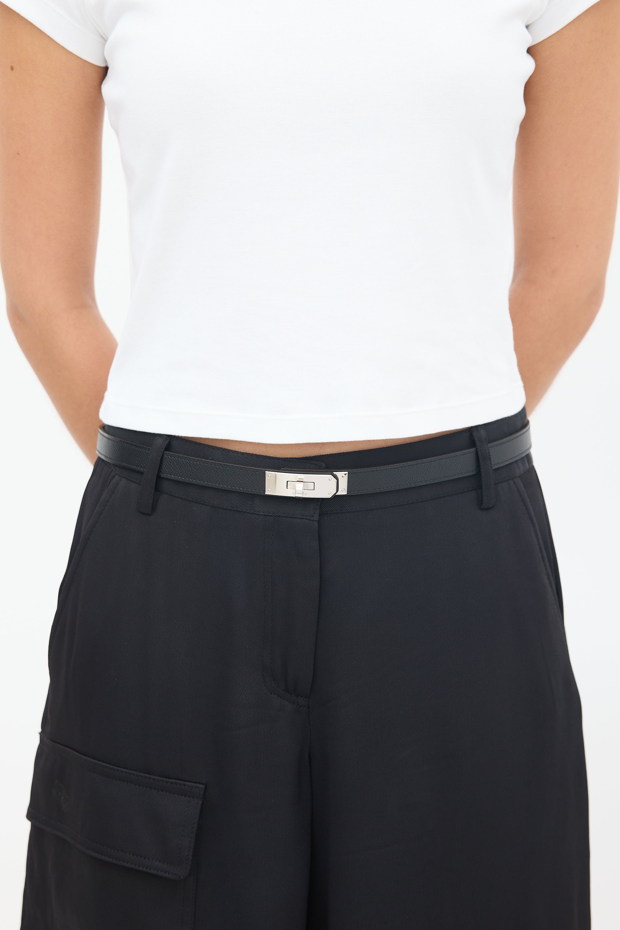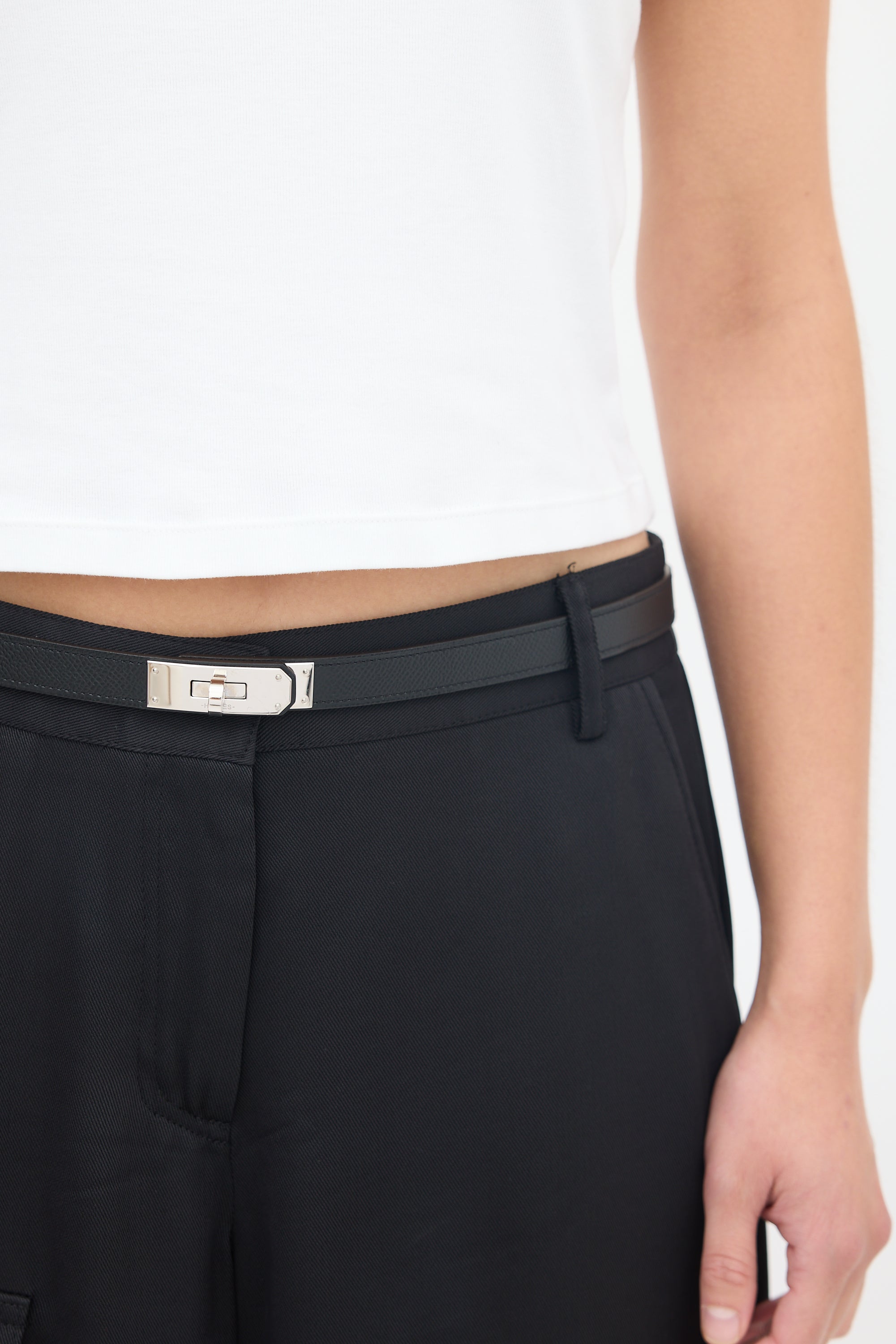 Pre-owned Hermès Kelly 18 belt in Noir Epsom leather featuring tonal stitching, palladium hardware, signature twist lock closure with brand etching, adjustable sliding system design, and stamped logo at interior. Comes with original box and dust bags.