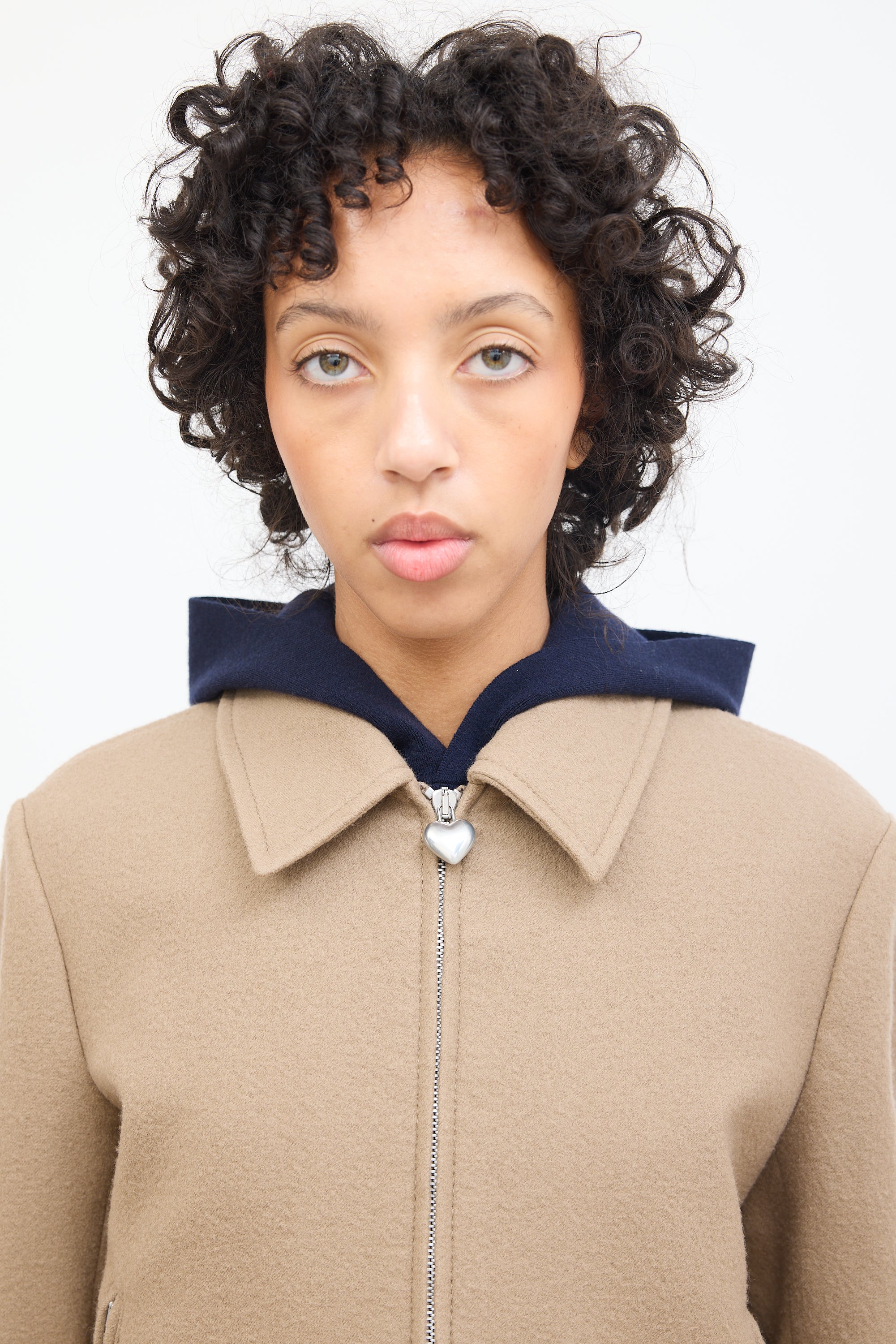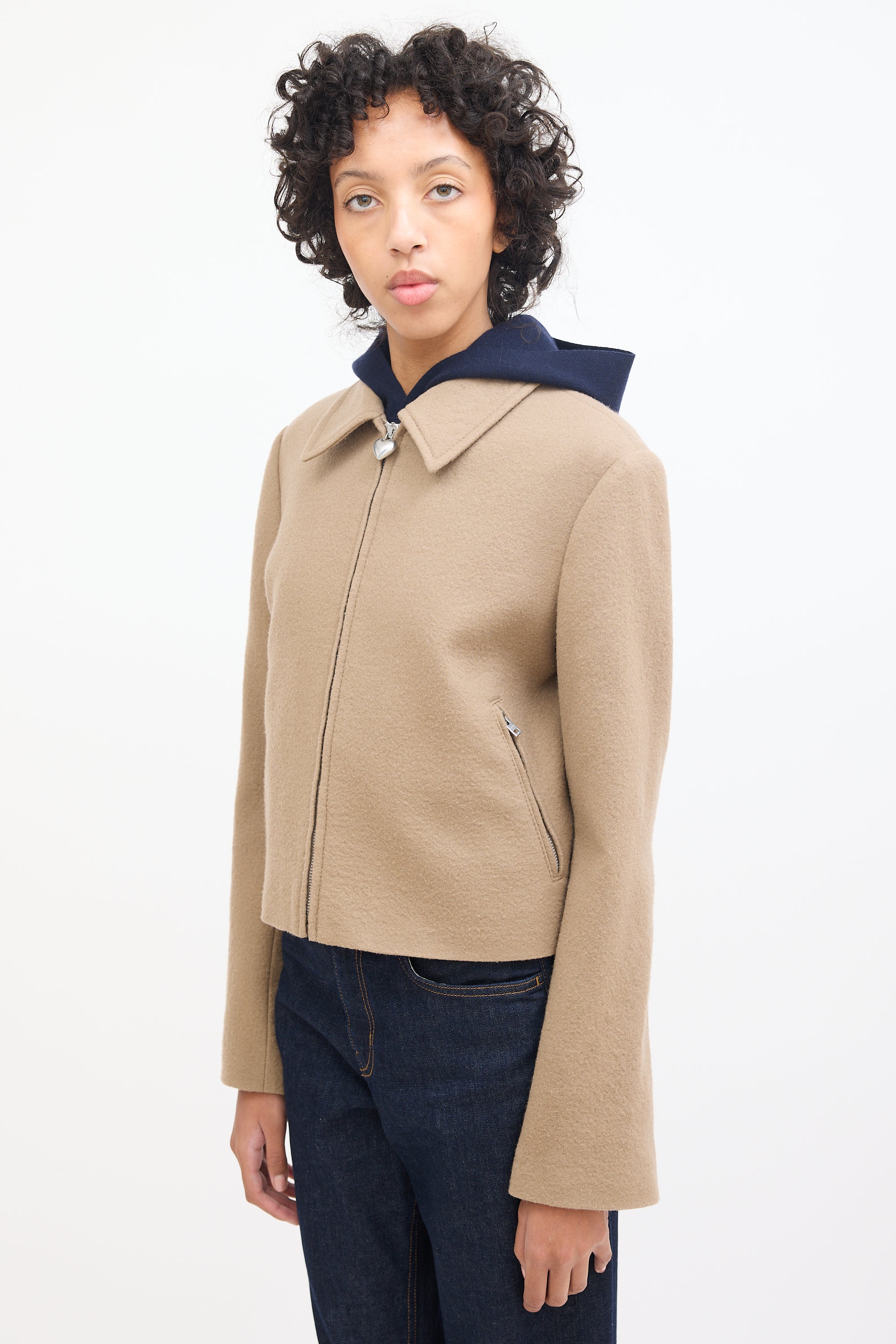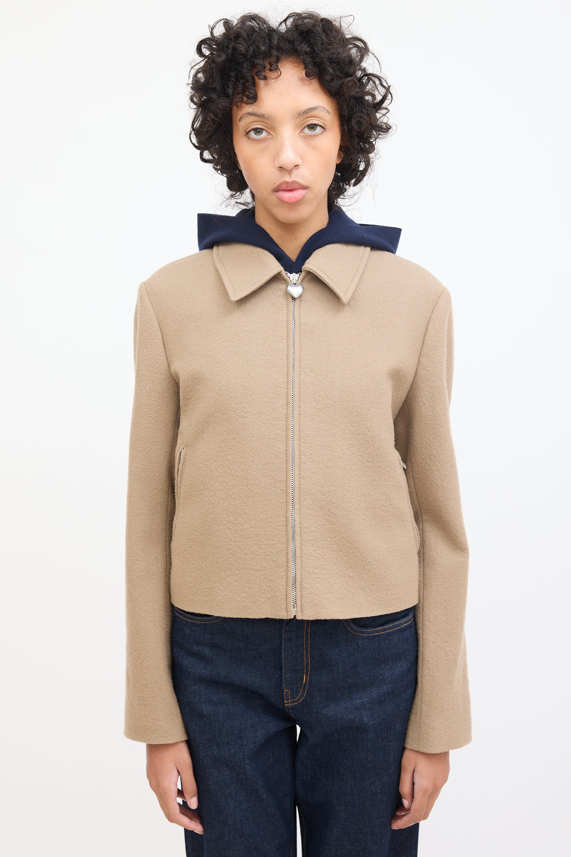 Pre-owned Acne Studios brown wool jacket featuring a spread collar, zip up front closure with heart charm zipper pull, two zip pockets at front waist, and long sleeves. Lined.