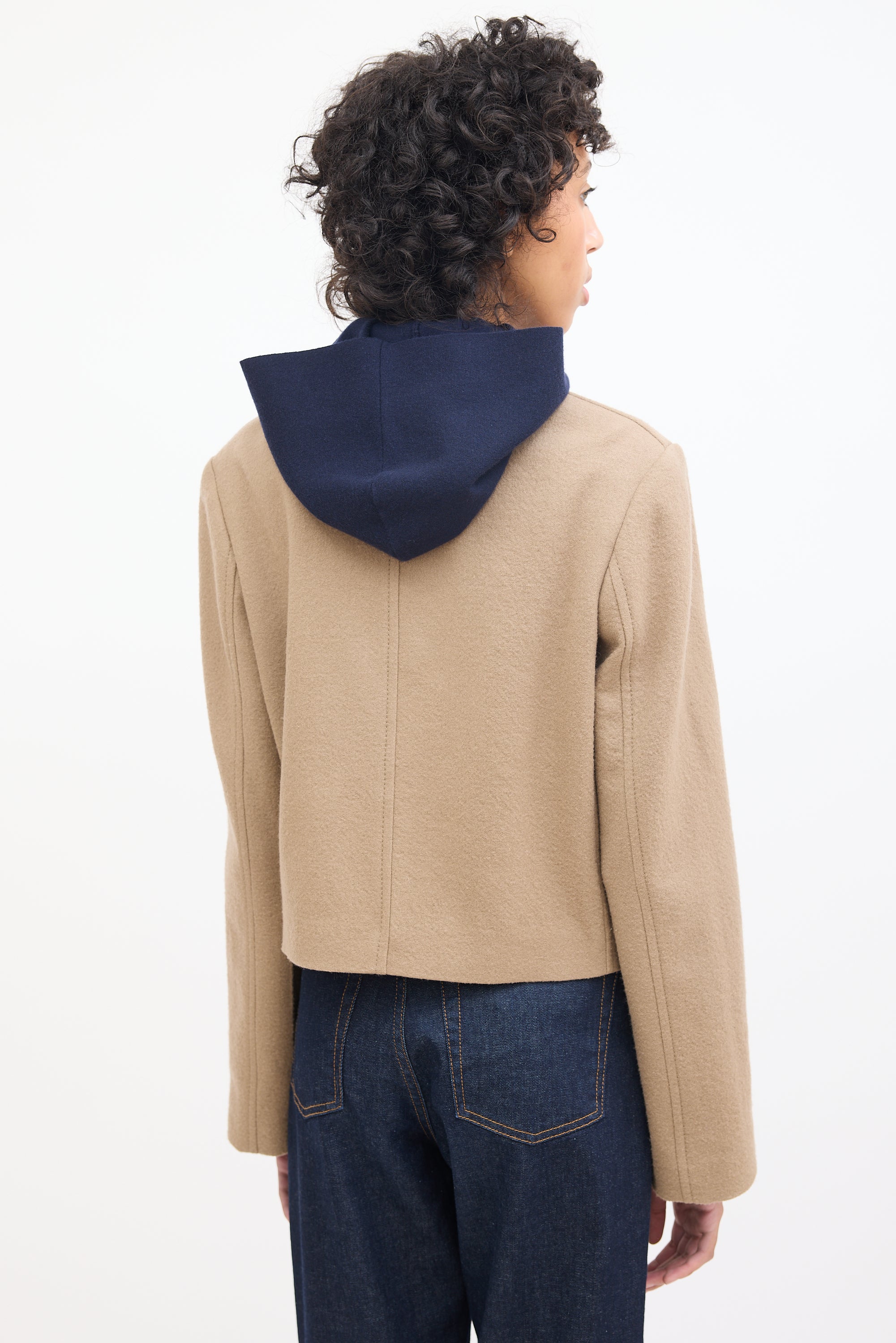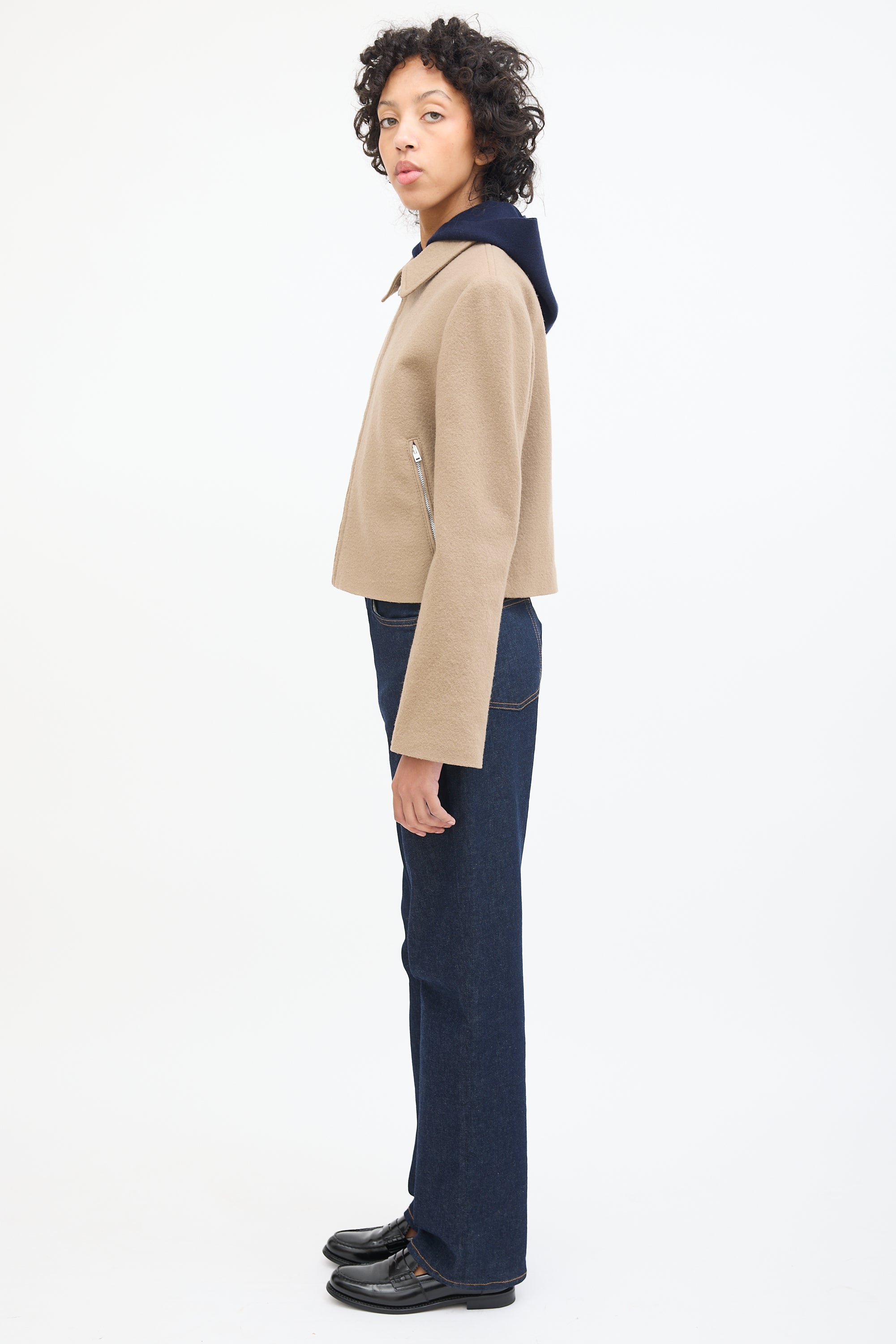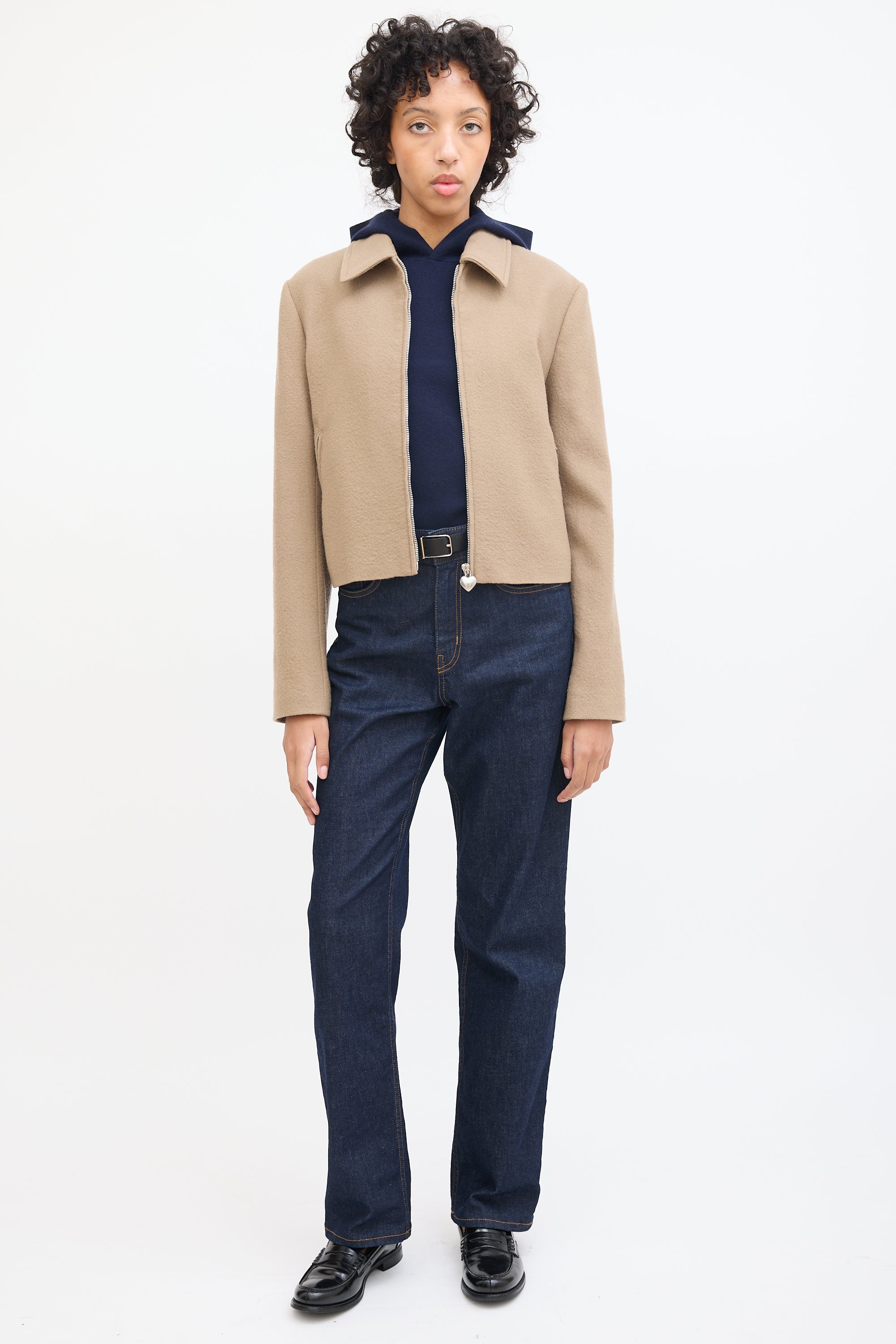 Pre-owned Acne Studios brown wool jacket featuring a spread collar, zip up front closure with heart charm zipper pull, two zip pockets at front waist, and long sleeves. Lined.