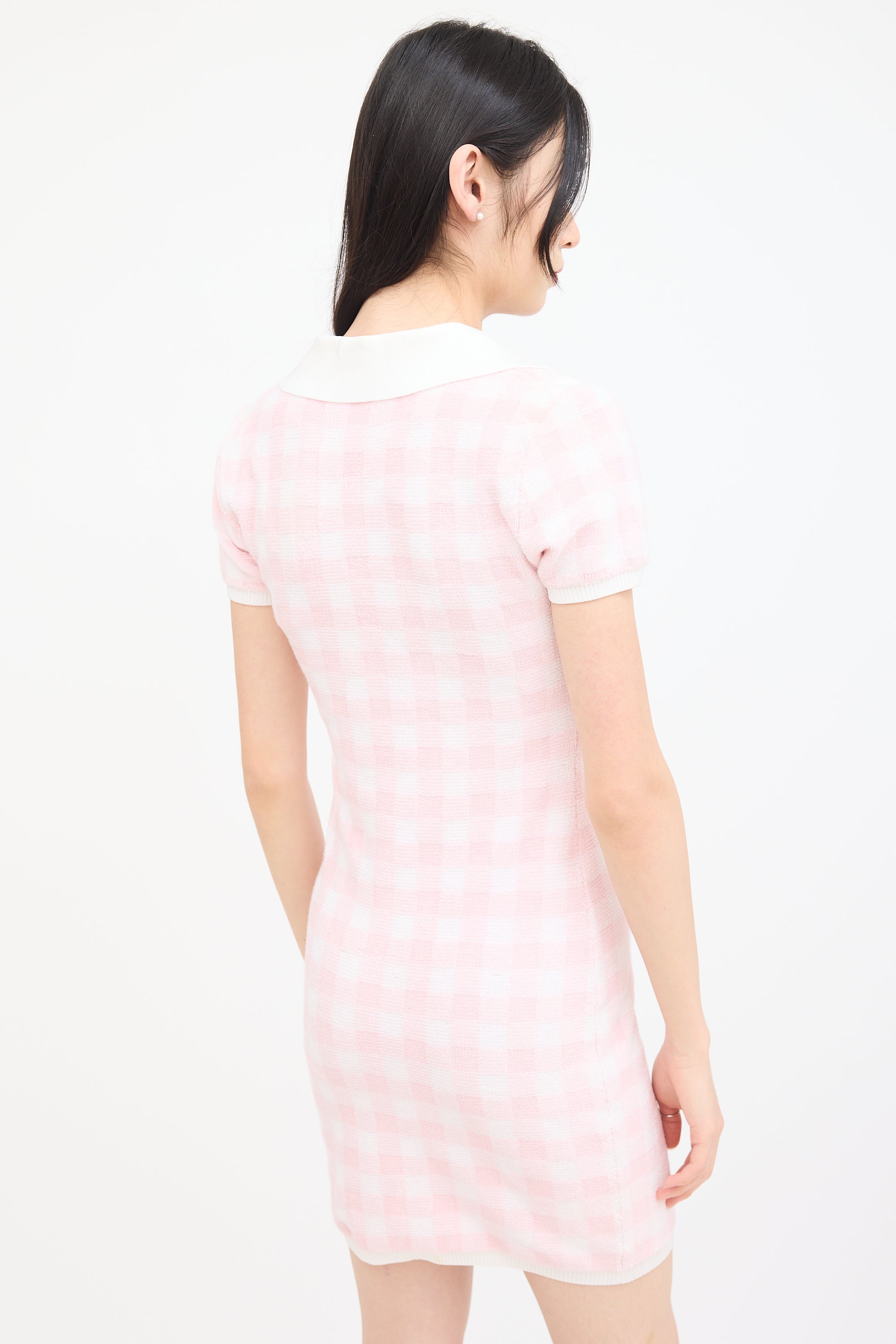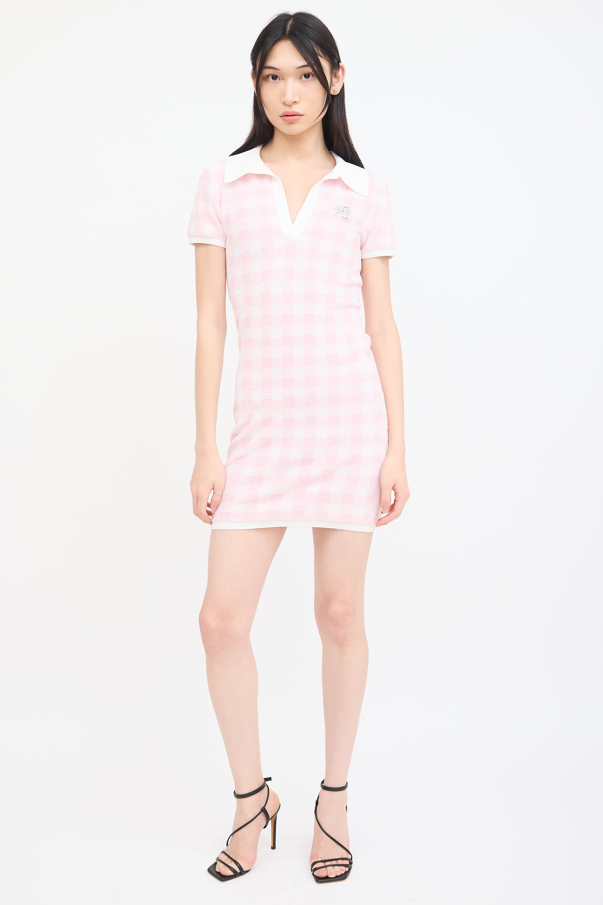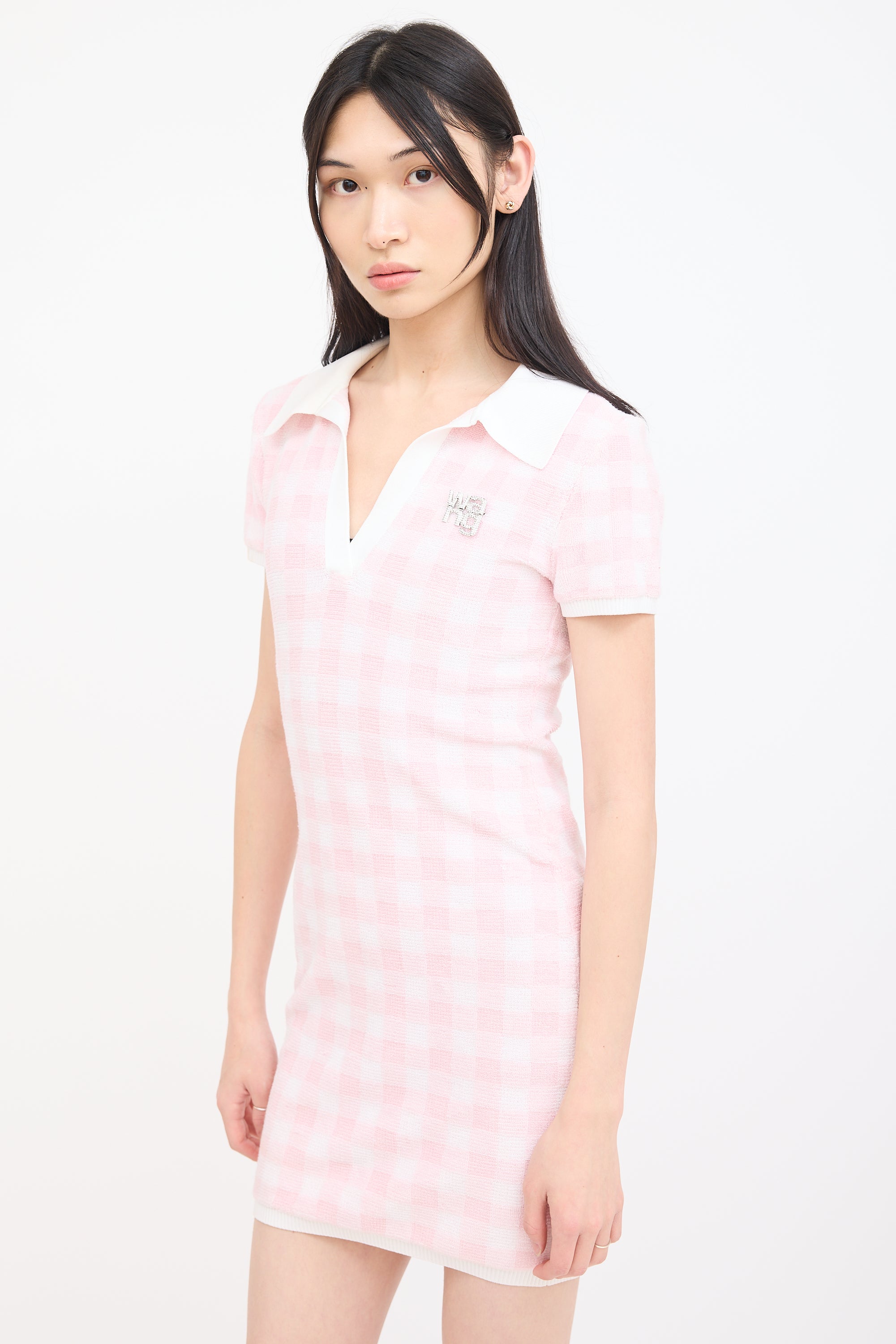 Pre-owned Alexander Wang pink terry gingham dress featuring white V-neckline with spread collar, logo broach at left chest, and ribbed hem.